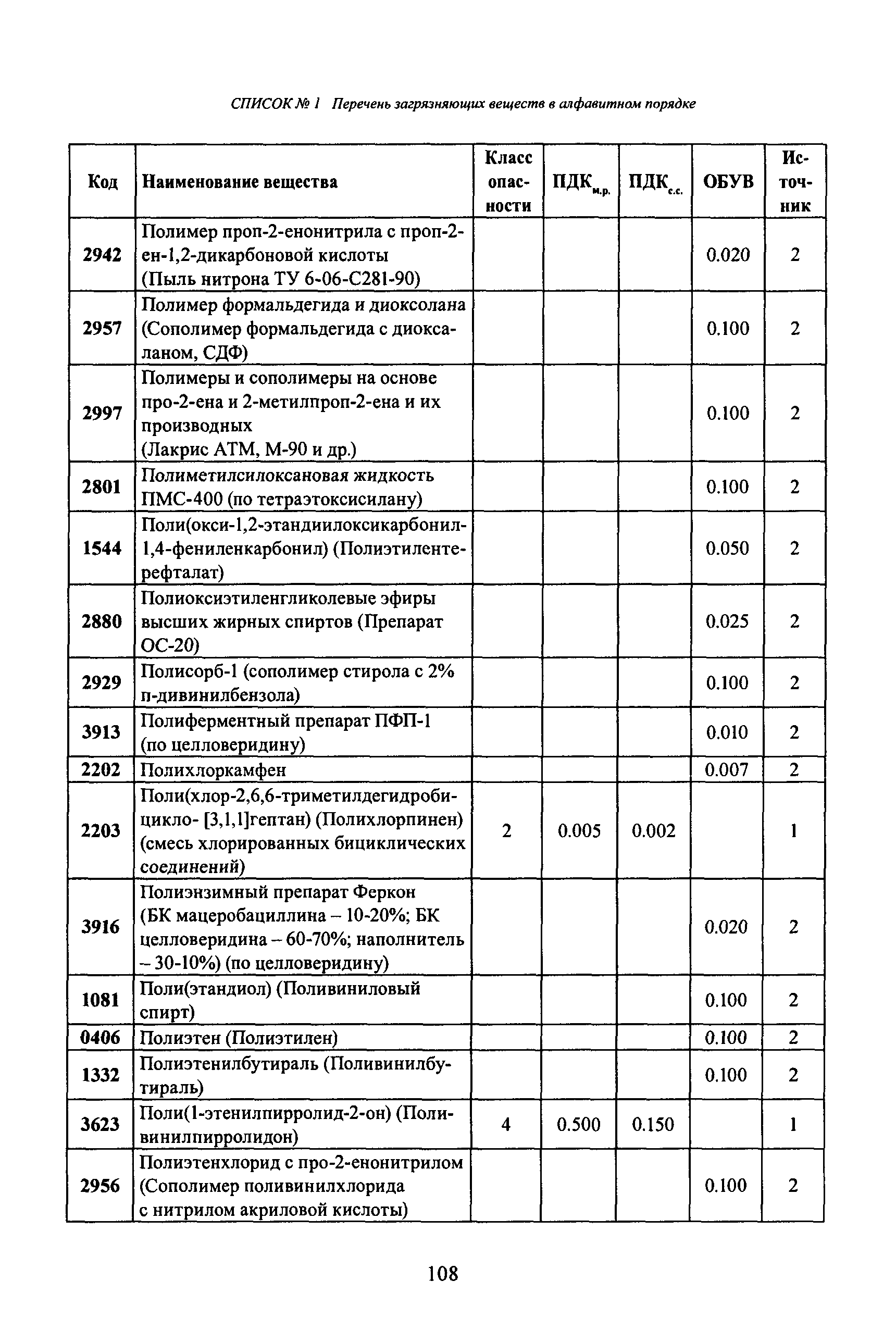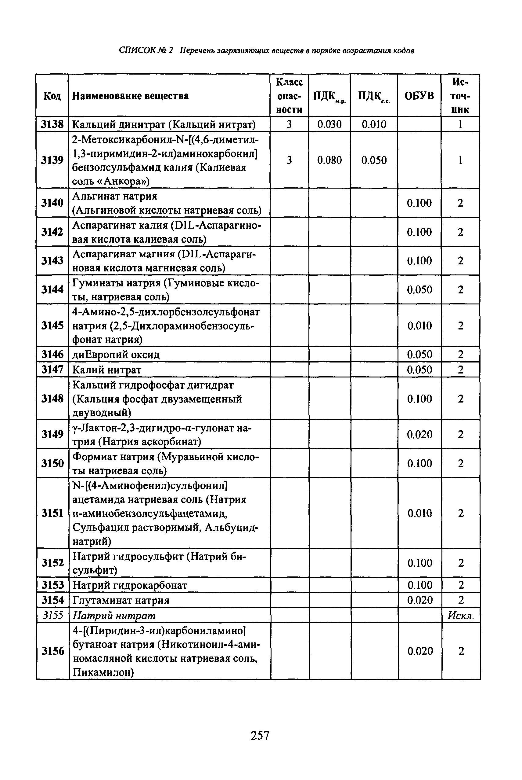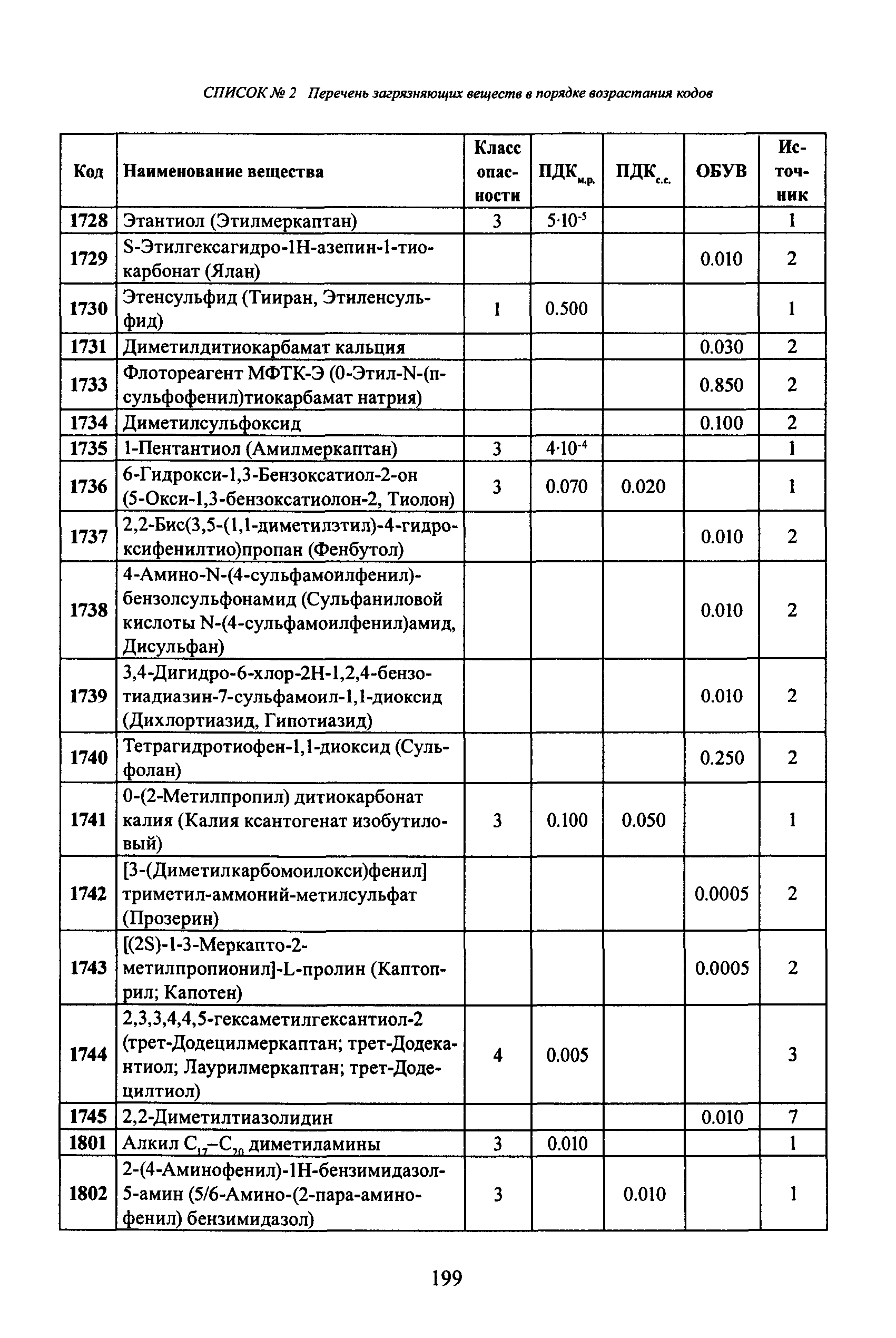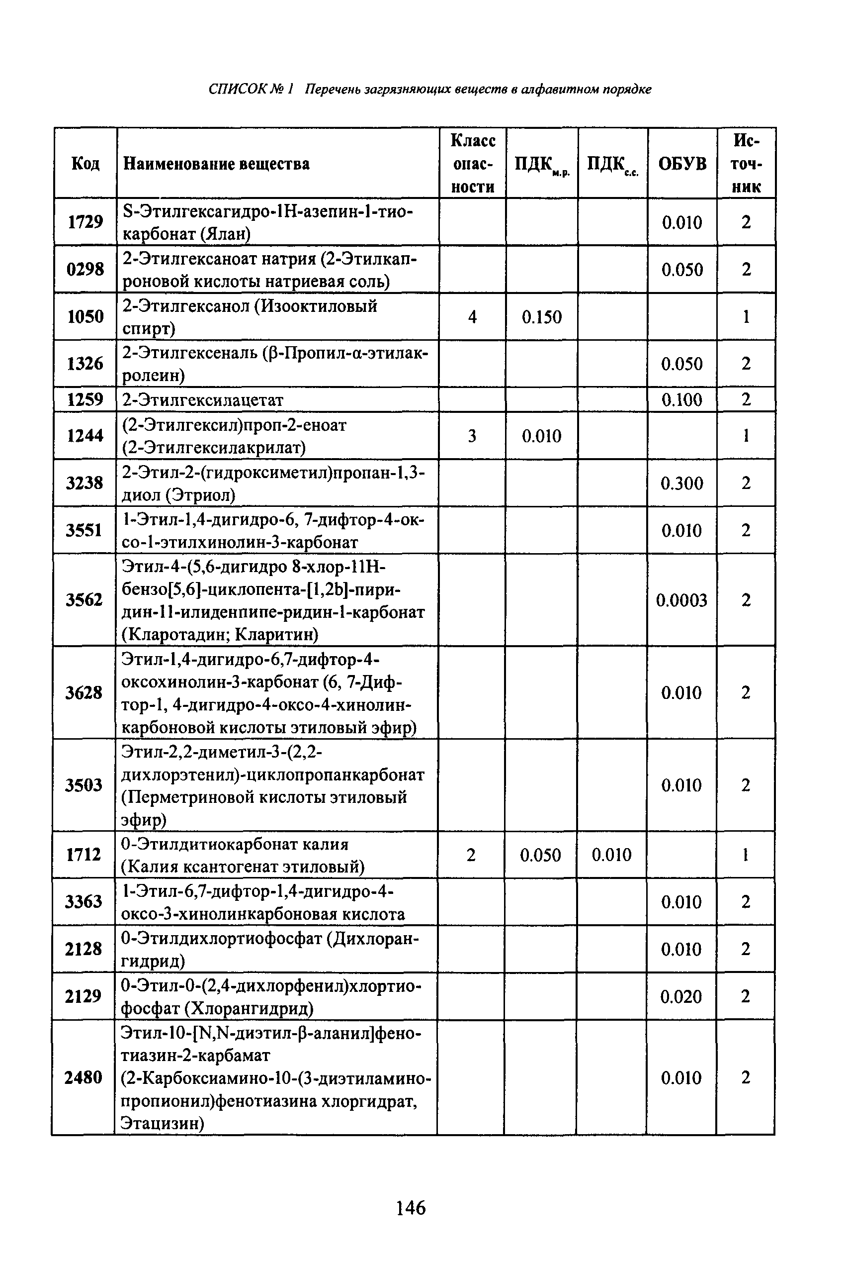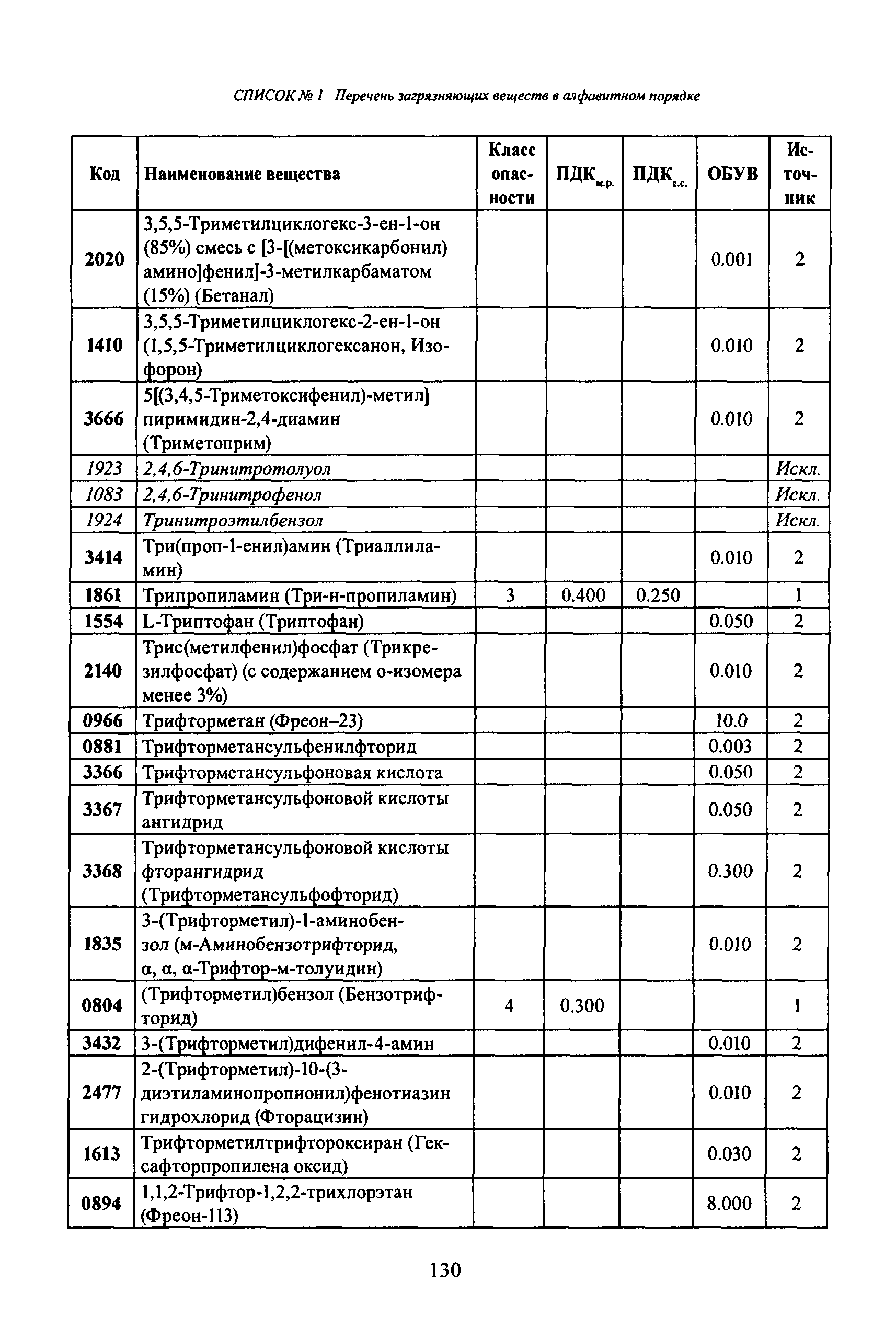 | Оглавление: | Введение Список № 1 Перечень загрязняющих веществ в алфавитном порядке Список № 2 Перечень загрязняющих веществ в порядке возрастания кодов Список № 3 Перечень ЛОС в порядке возрастания кодов Список № 4 Указатель основных синонимов, технических, торговых и фирменных названий веществ в алфавитном порядке А. Для веществ с установленными значениями ПДК Б. Для веществ с установленными значениями ОБУВ Список № 5 Указатель основных синонимов, технических, торговых и фирменных названий веществ в порядке возрастания кодов А. Для веществ с установленными значениями ПДК Б. Для веществ с установленными значениями ОБУВ |