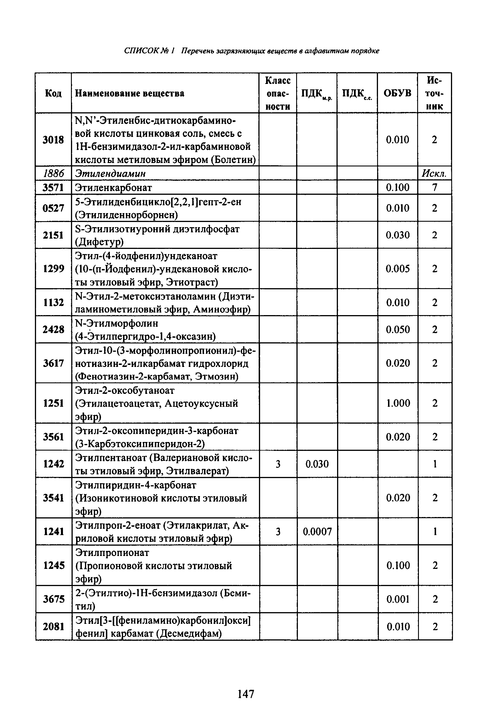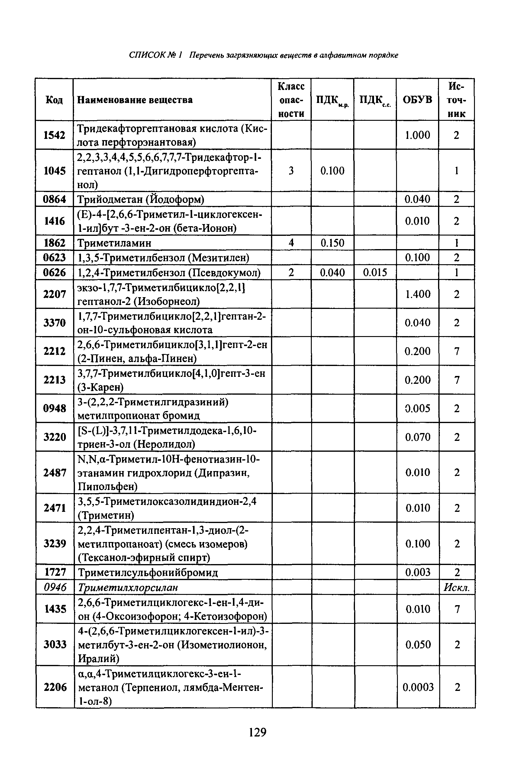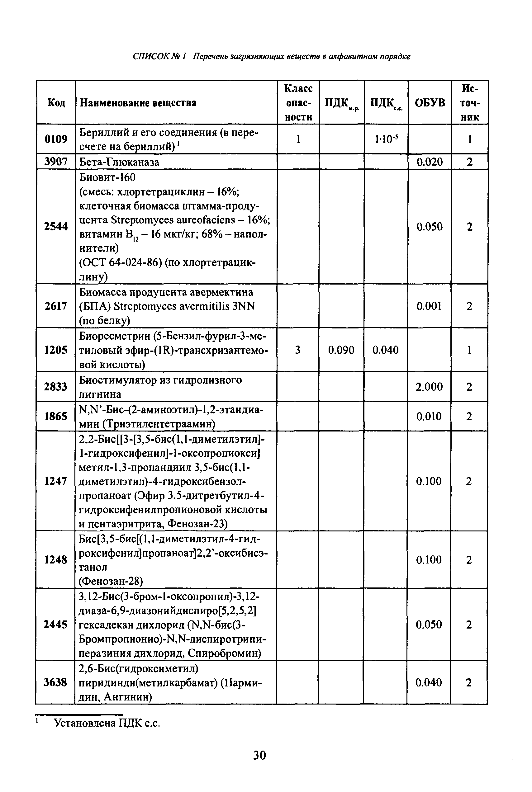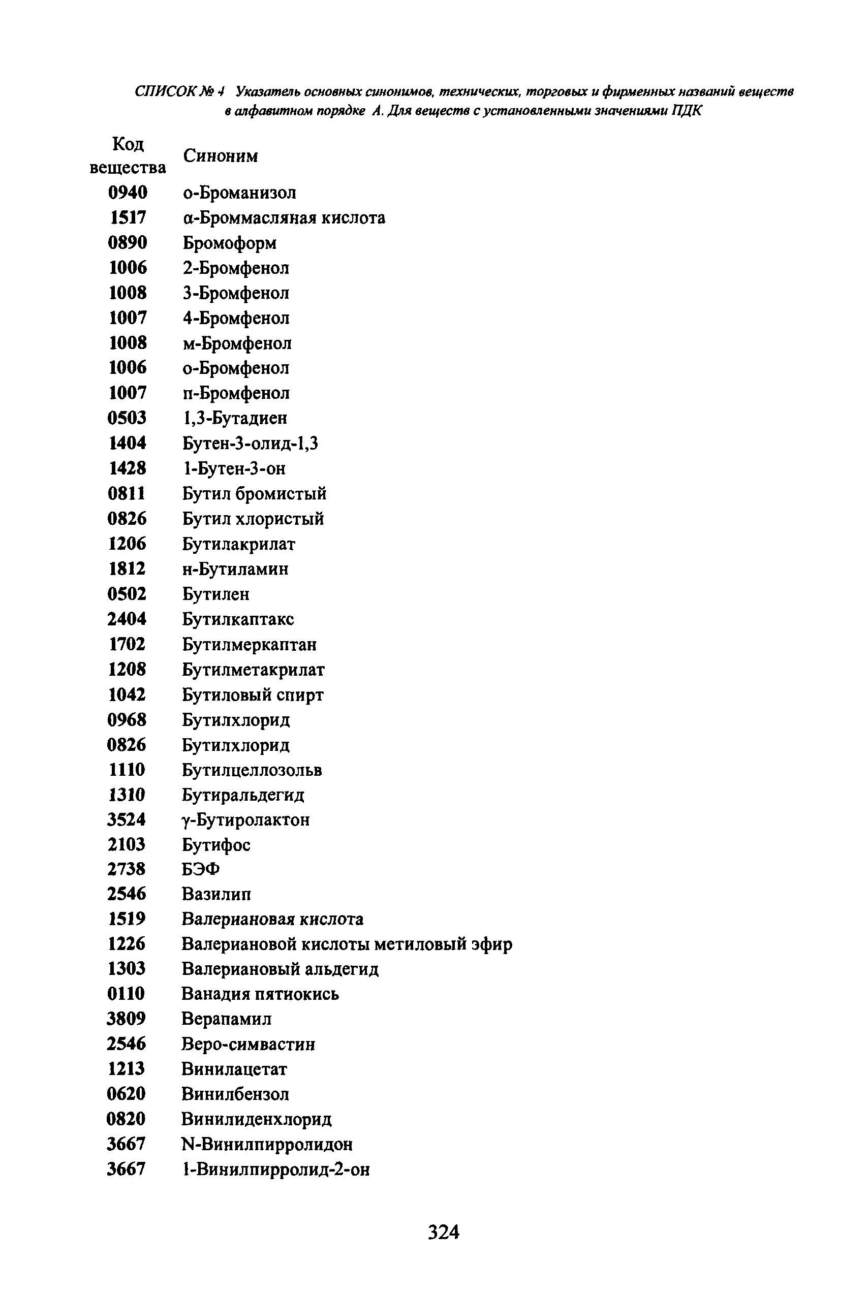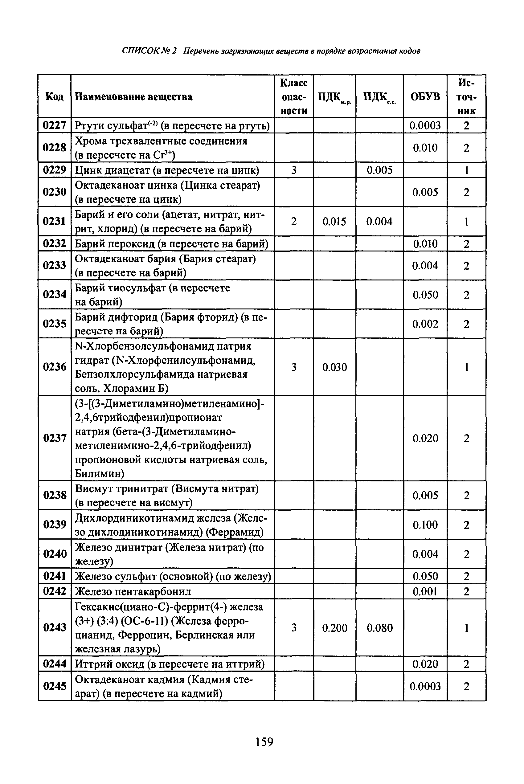 | Оглавление: | Введение Список № 1 Перечень загрязняющих веществ в алфавитном порядке Список № 2 Перечень загрязняющих веществ в порядке возрастания кодов Список № 3 Перечень ЛОС в порядке возрастания кодов Список № 4 Указатель основных синонимов, технических, торговых и фирменных названий веществ в алфавитном порядке А. Для веществ с установленными значениями ПДК Б. Для веществ с установленными значениями ОБУВ Список № 5 Указатель основных синонимов, технических, торговых и фирменных названий веществ в порядке возрастания кодов А. Для веществ с установленными значениями ПДК Б. Для веществ с установленными значениями ОБУВ |