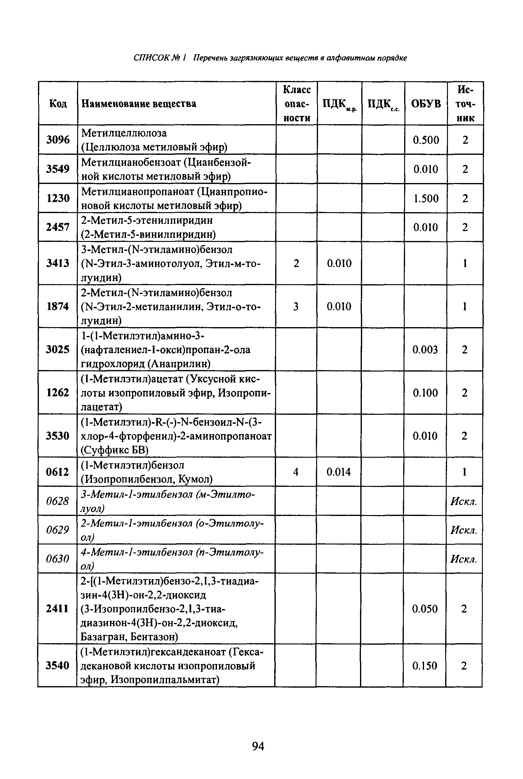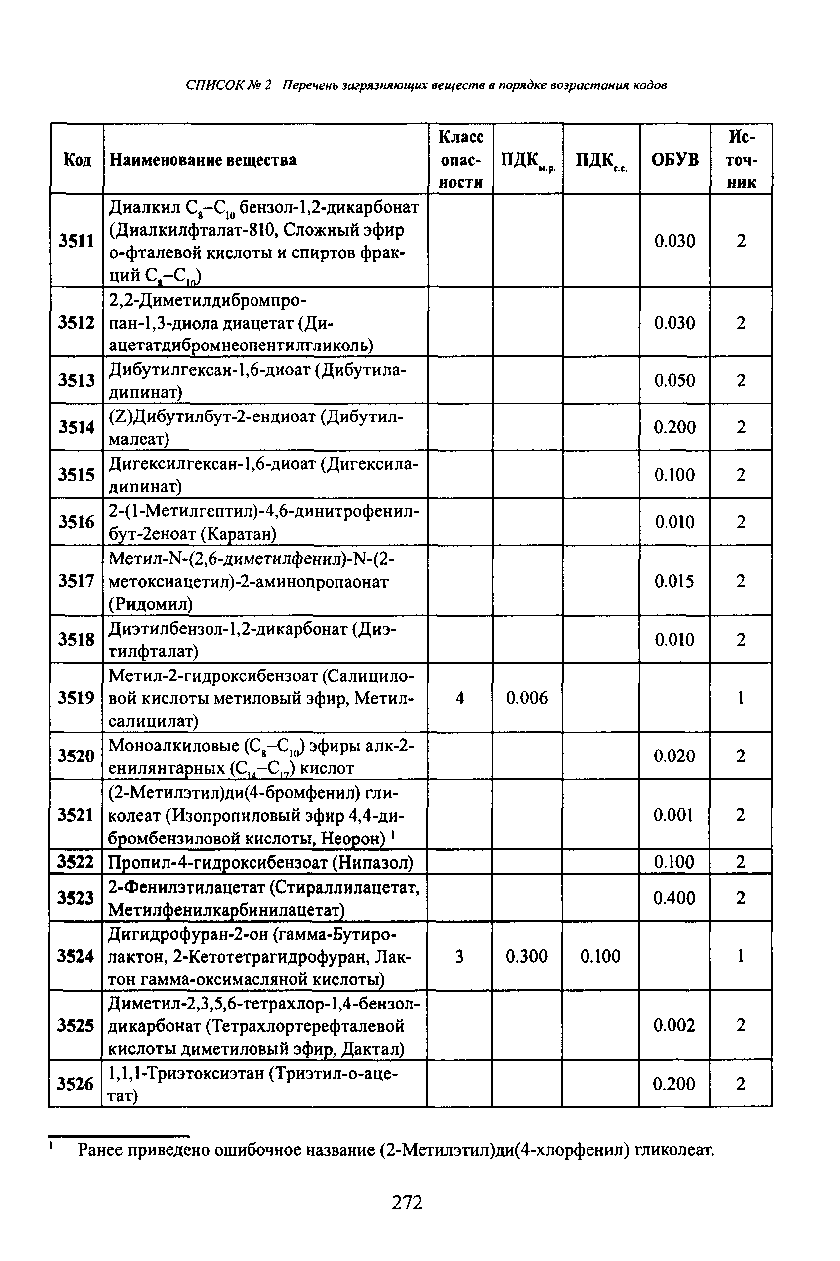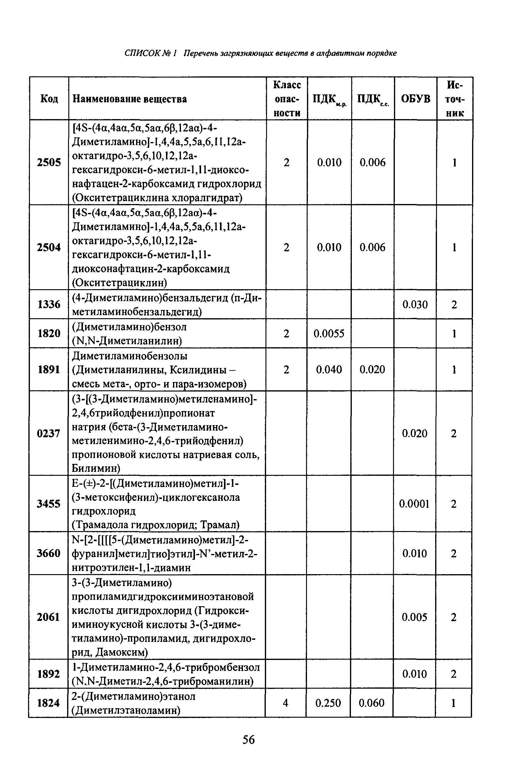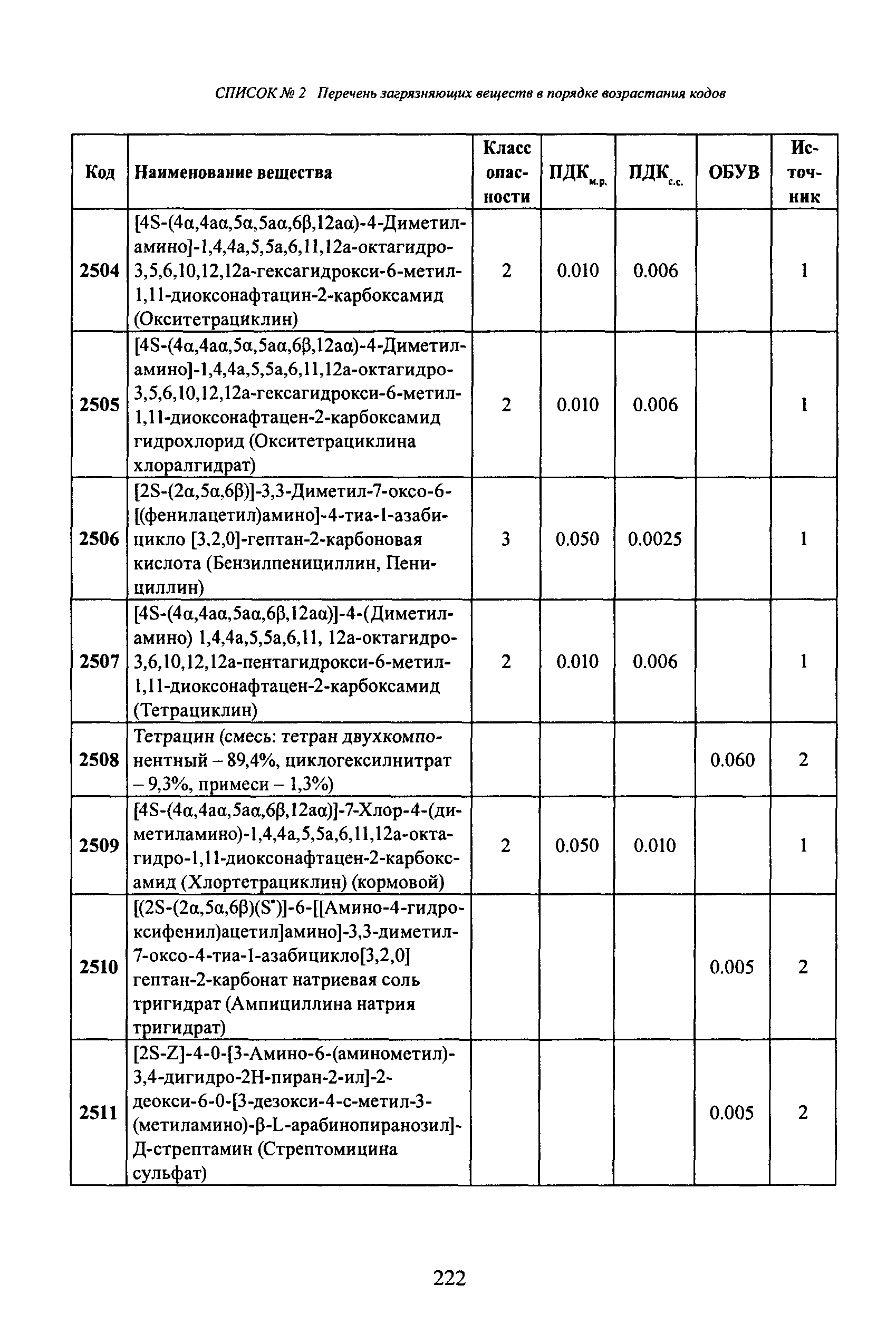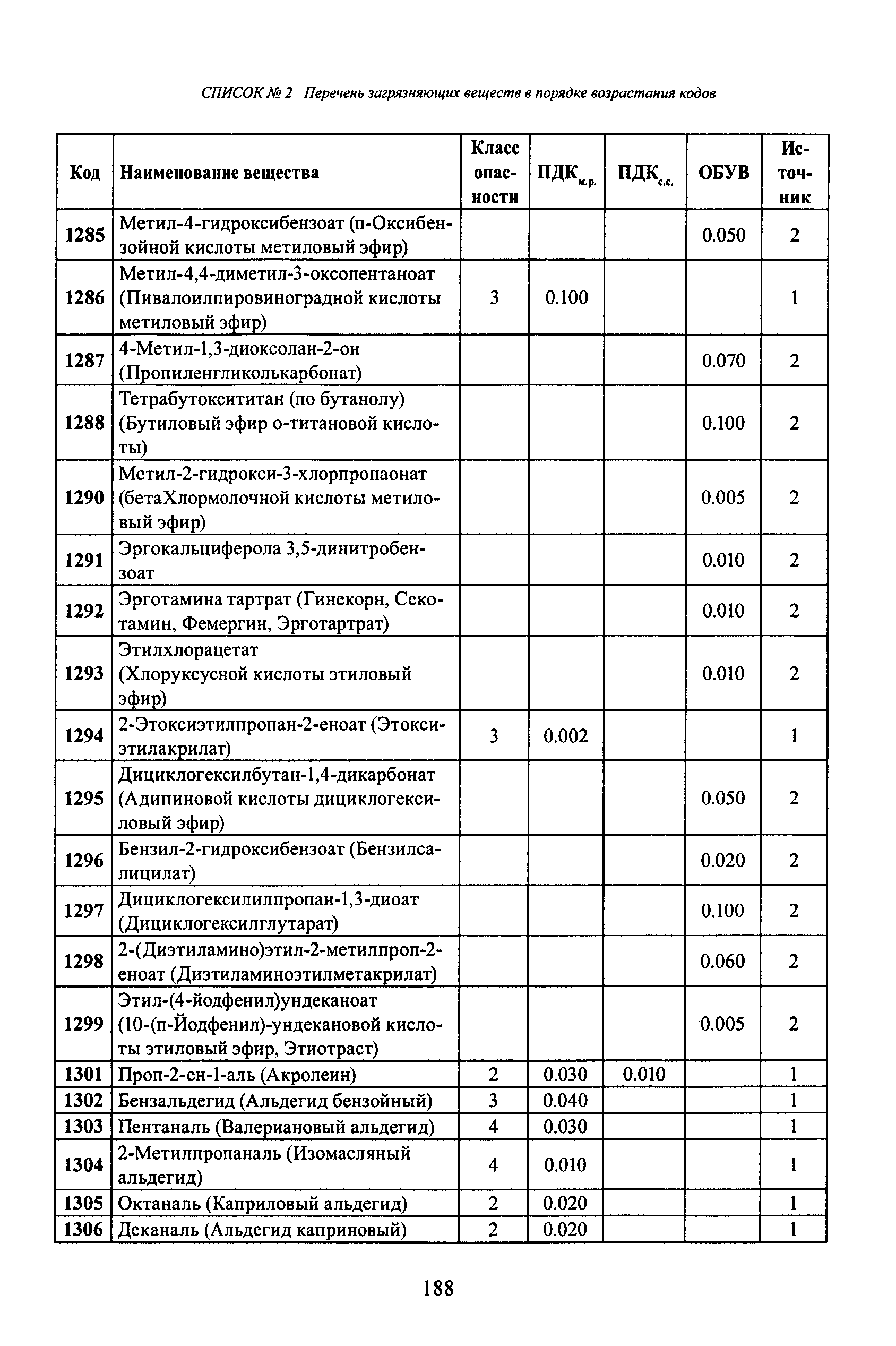 | Оглавление: | Введение Список № 1 Перечень загрязняющих веществ в алфавитном порядке Список № 2 Перечень загрязняющих веществ в порядке возрастания кодов Список № 3 Перечень ЛОС в порядке возрастания кодов Список № 4 Указатель основных синонимов, технических, торговых и фирменных названий веществ в алфавитном порядке А. Для веществ с установленными значениями ПДК Б. Для веществ с установленными значениями ОБУВ Список № 5 Указатель основных синонимов, технических, торговых и фирменных названий веществ в порядке возрастания кодов А. Для веществ с установленными значениями ПДК Б. Для веществ с установленными значениями ОБУВ |