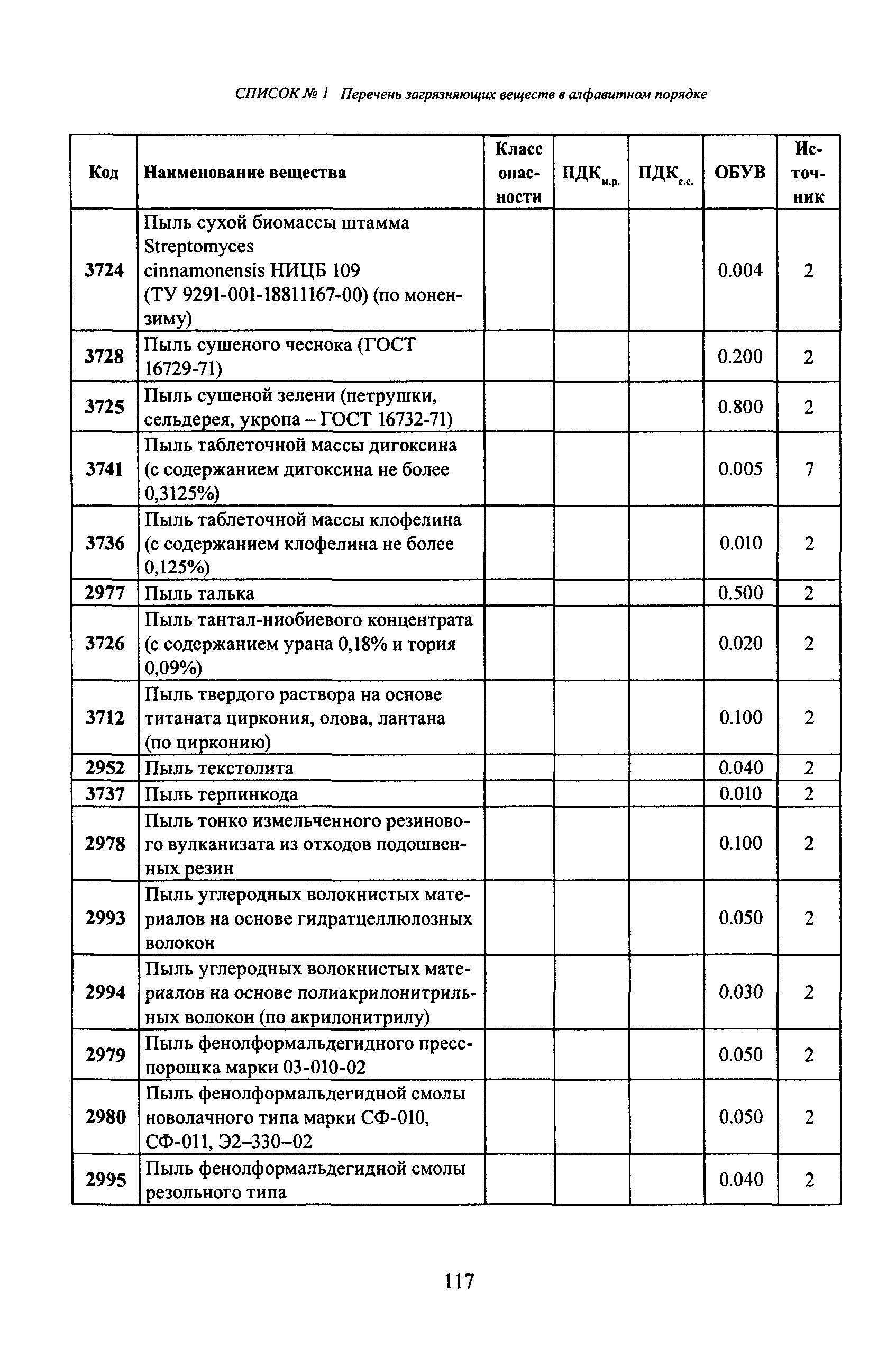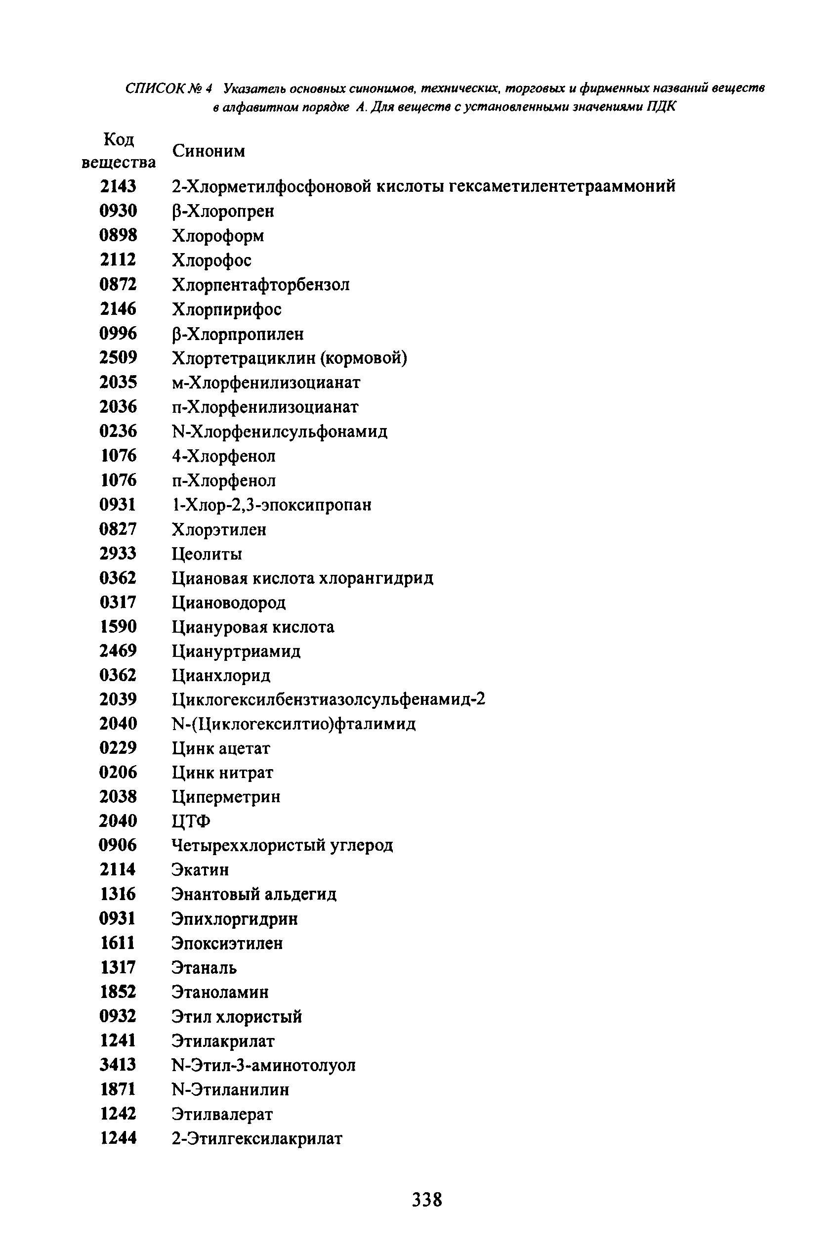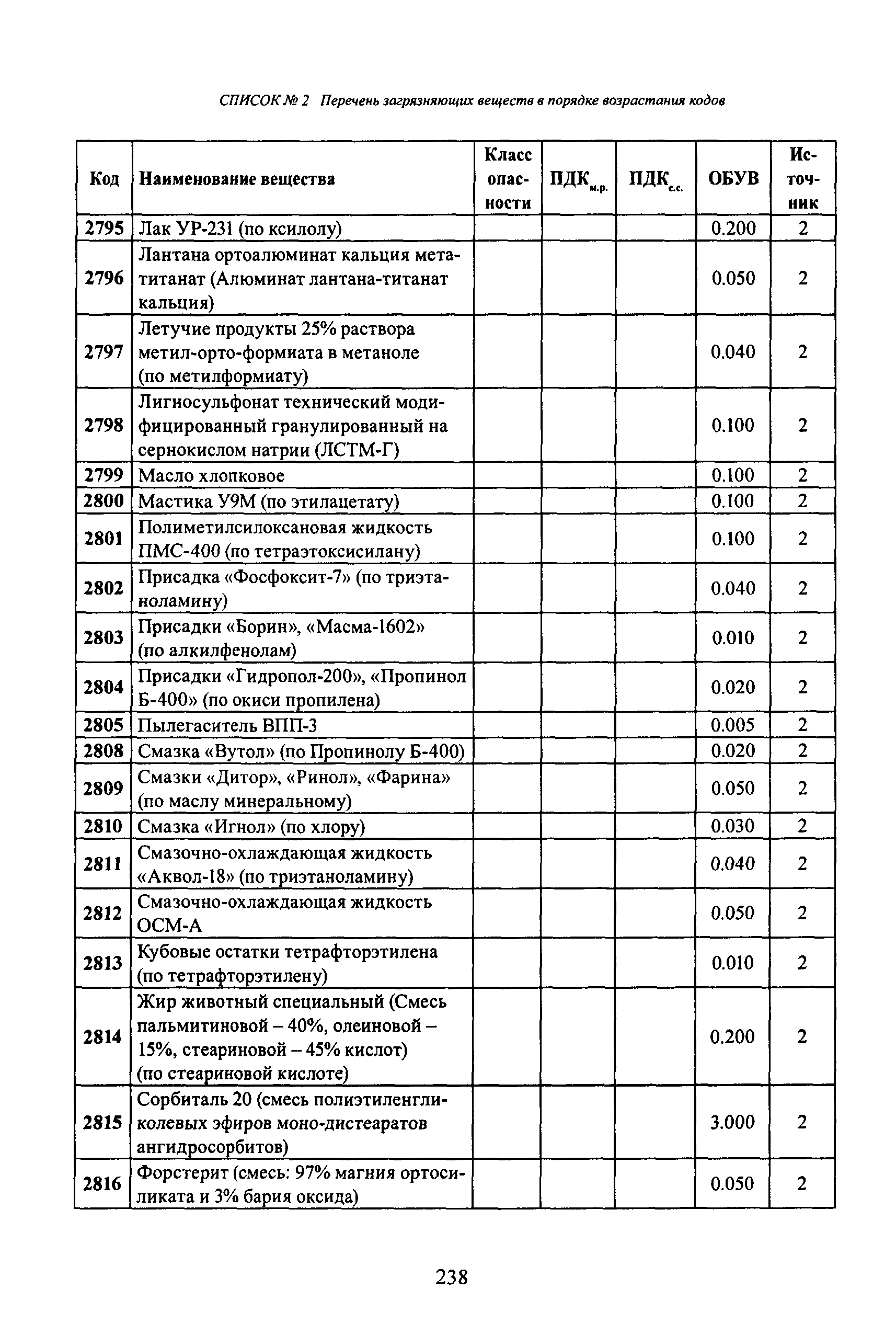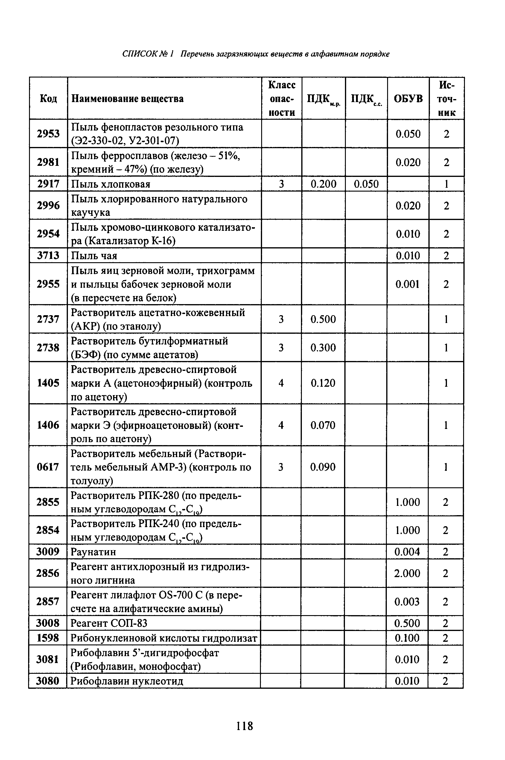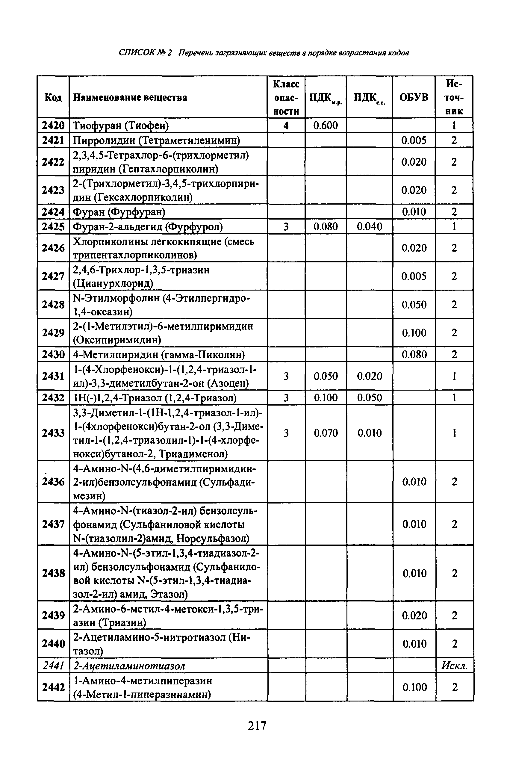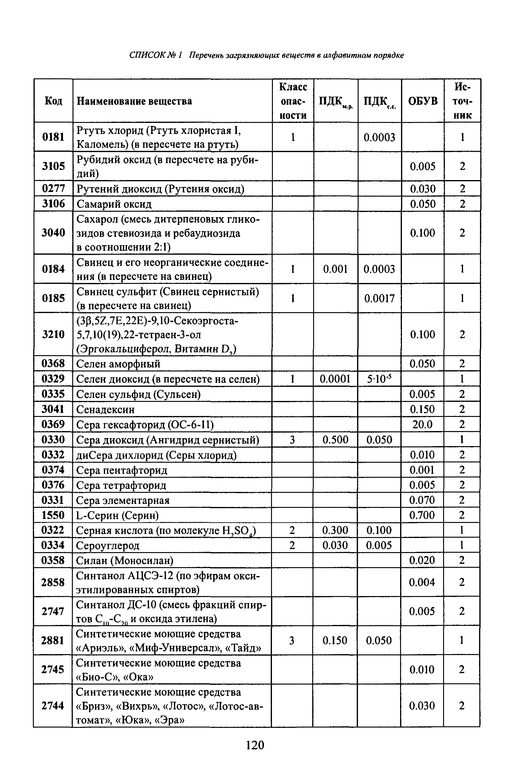 | Оглавление: | Введение Список № 1 Перечень загрязняющих веществ в алфавитном порядке Список № 2 Перечень загрязняющих веществ в порядке возрастания кодов Список № 3 Перечень ЛОС в порядке возрастания кодов Список № 4 Указатель основных синонимов, технических, торговых и фирменных названий веществ в алфавитном порядке А. Для веществ с установленными значениями ПДК Б. Для веществ с установленными значениями ОБУВ Список № 5 Указатель основных синонимов, технических, торговых и фирменных названий веществ в порядке возрастания кодов А. Для веществ с установленными значениями ПДК Б. Для веществ с установленными значениями ОБУВ |
