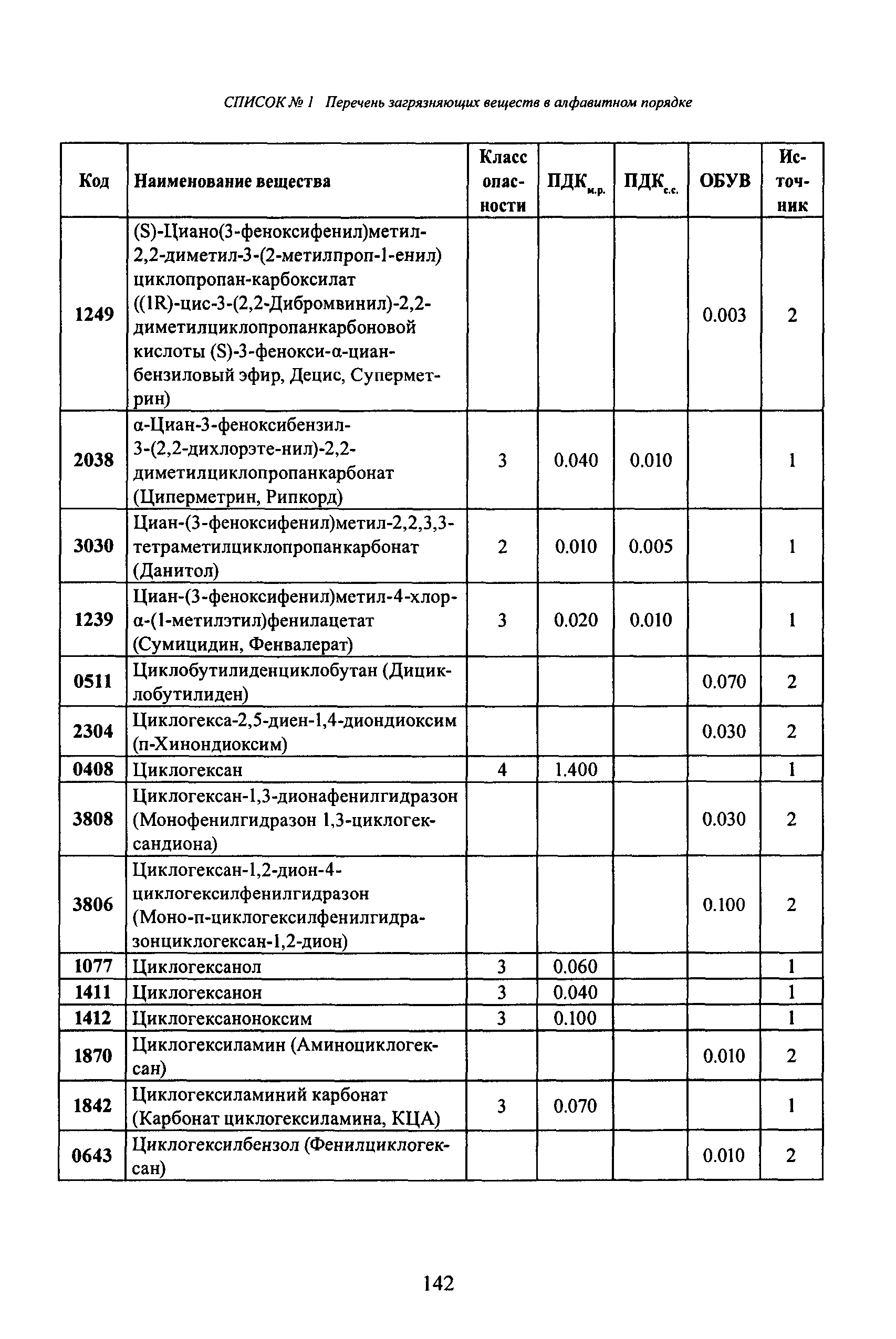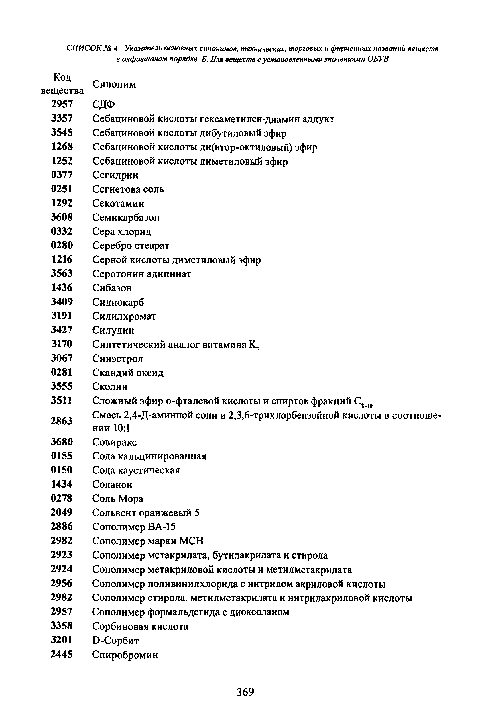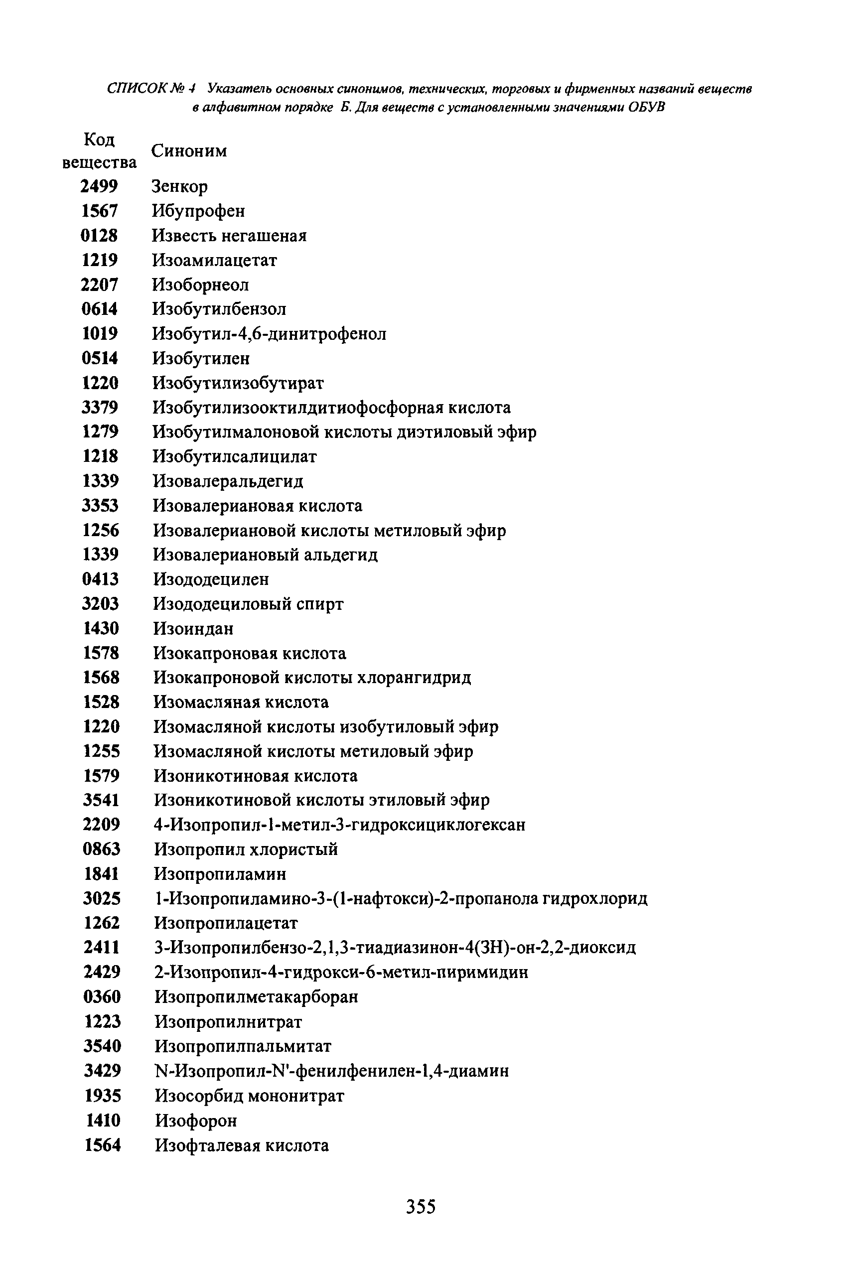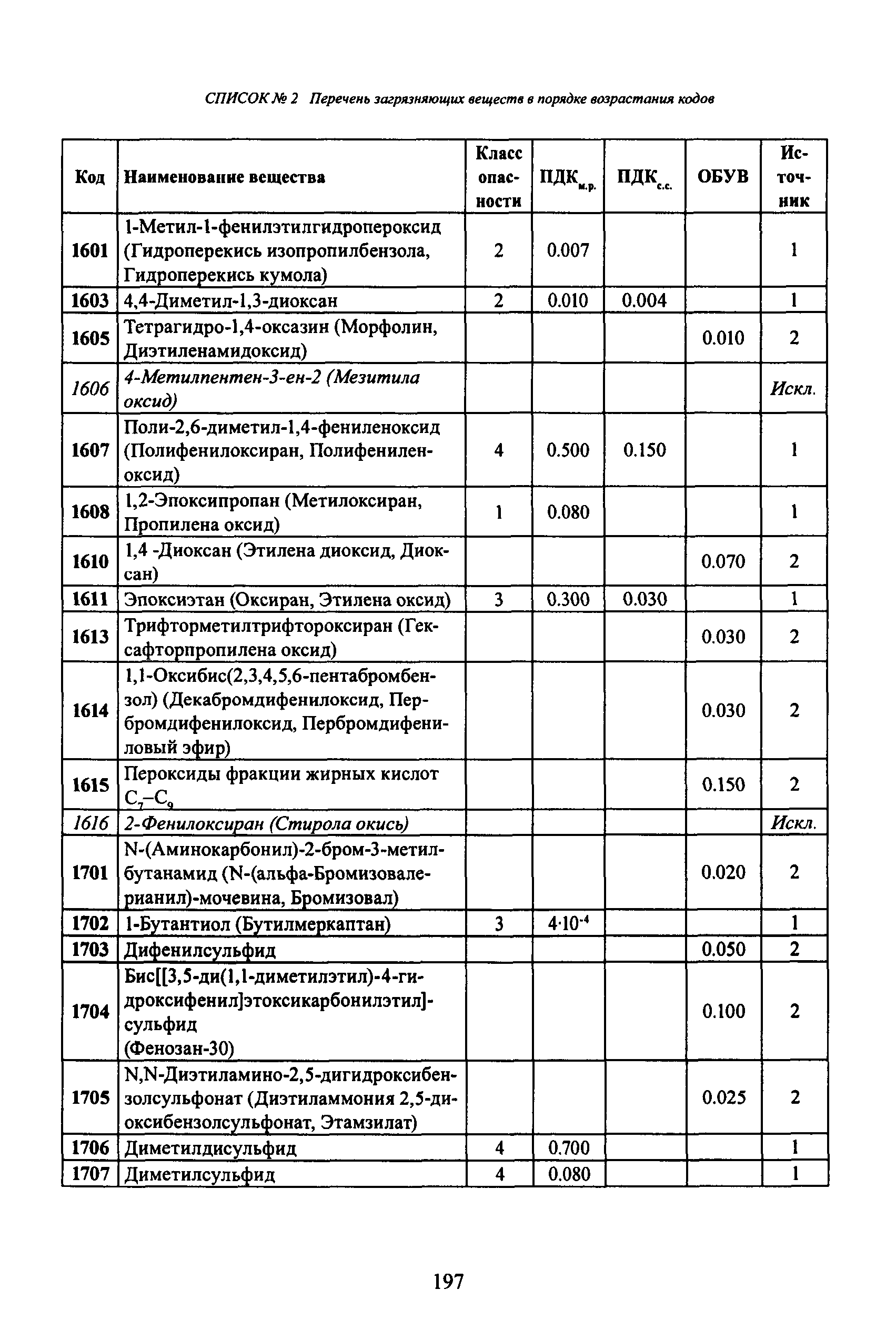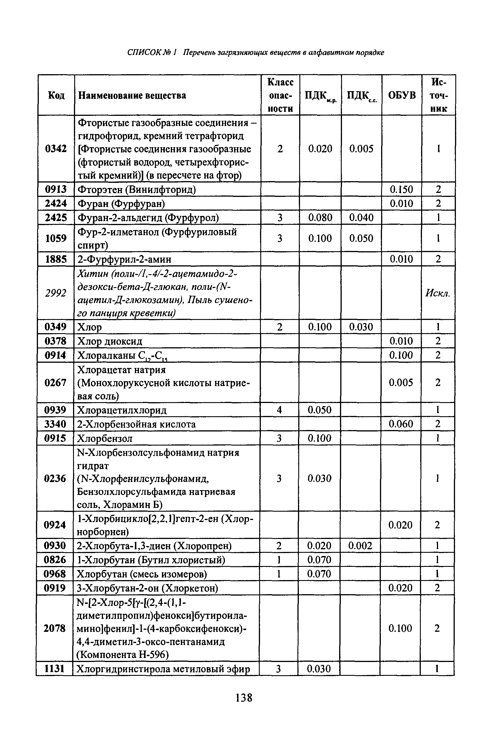 | Оглавление: | Введение Список № 1 Перечень загрязняющих веществ в алфавитном порядке Список № 2 Перечень загрязняющих веществ в порядке возрастания кодов Список № 3 Перечень ЛОС в порядке возрастания кодов Список № 4 Указатель основных синонимов, технических, торговых и фирменных названий веществ в алфавитном порядке А. Для веществ с установленными значениями ПДК Б. Для веществ с установленными значениями ОБУВ Список № 5 Указатель основных синонимов, технических, торговых и фирменных названий веществ в порядке возрастания кодов А. Для веществ с установленными значениями ПДК Б. Для веществ с установленными значениями ОБУВ |