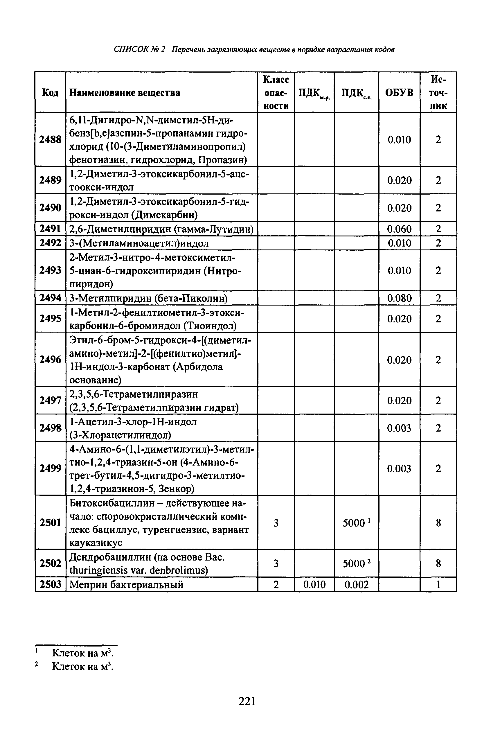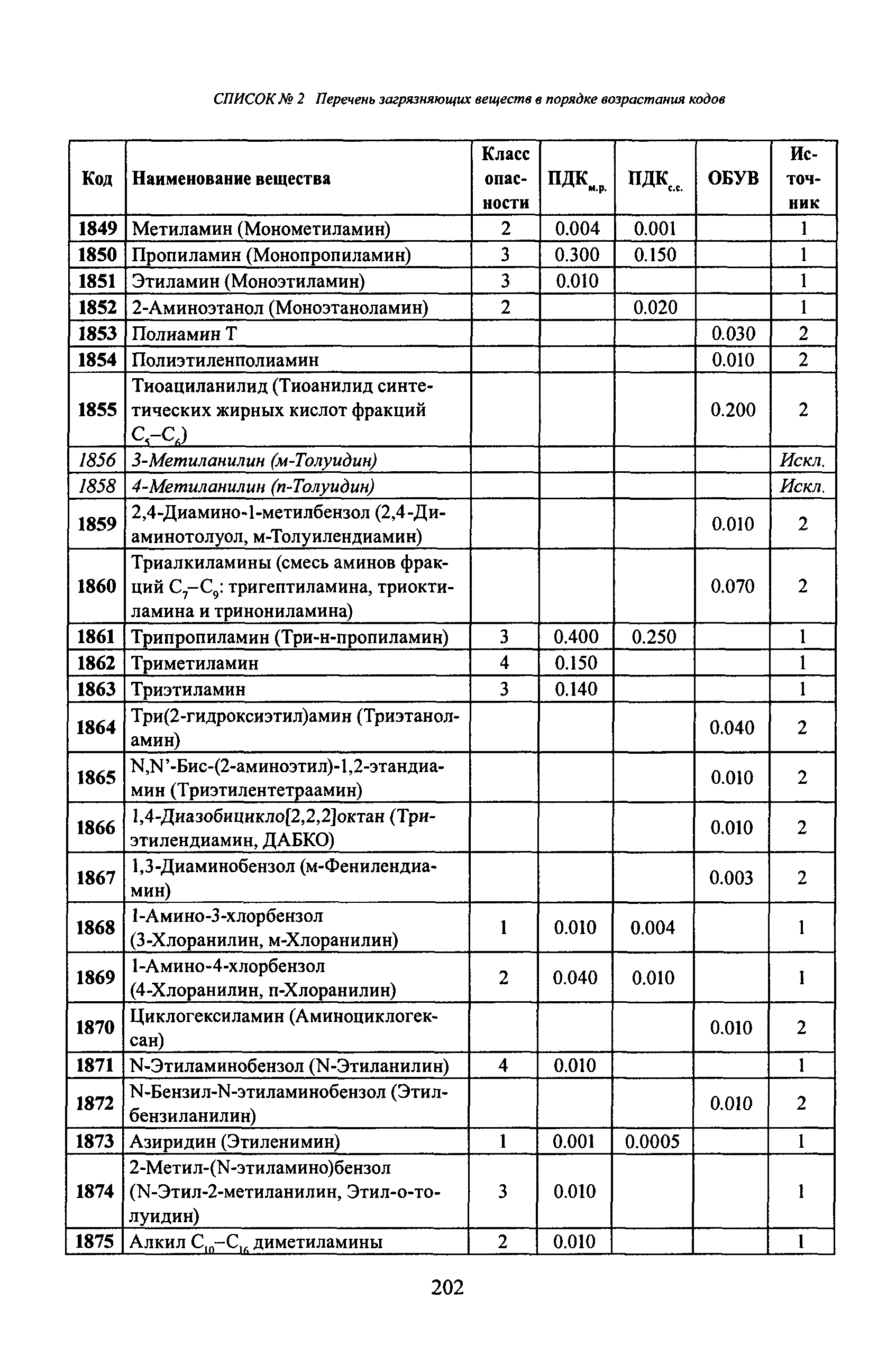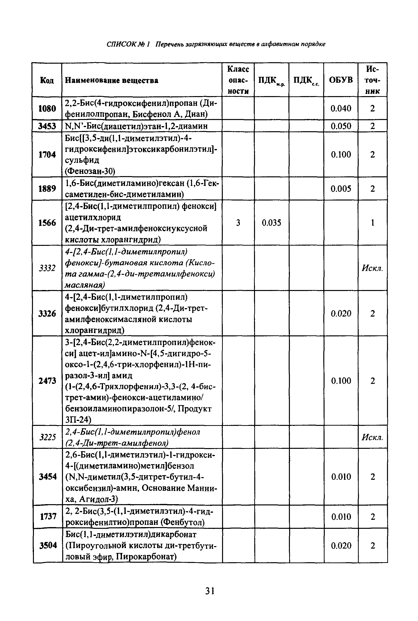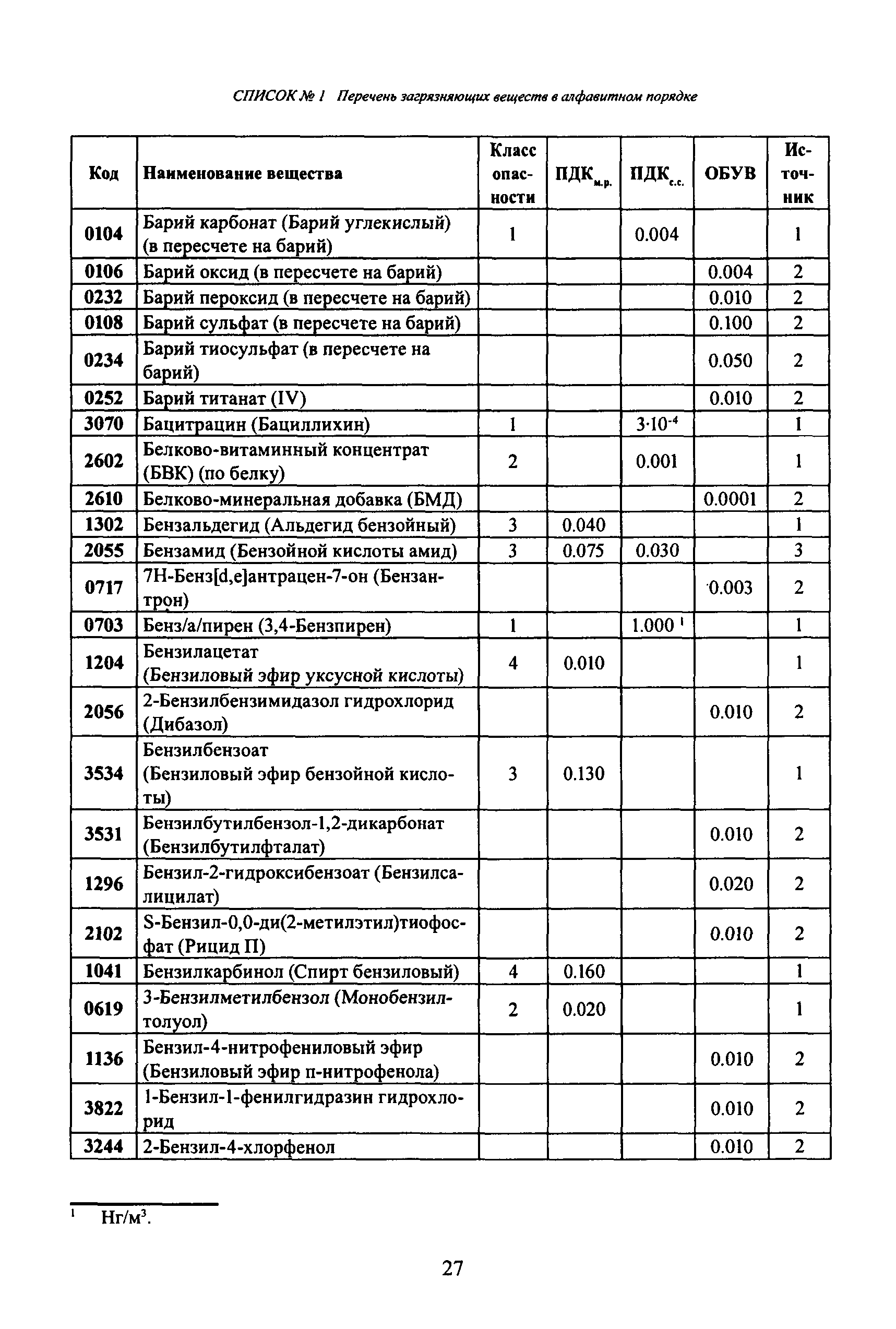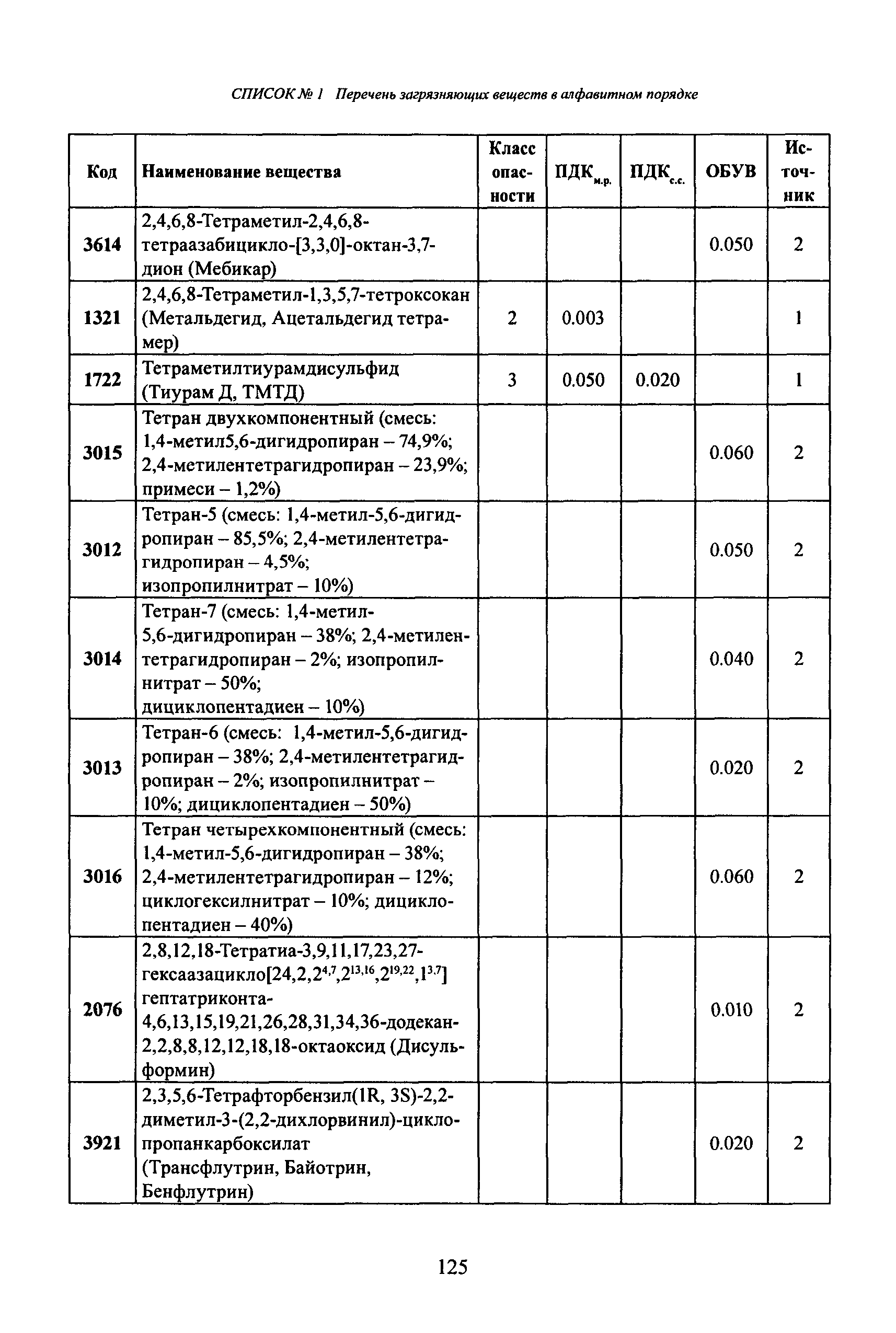 | Оглавление: | Введение Список № 1 Перечень загрязняющих веществ в алфавитном порядке Список № 2 Перечень загрязняющих веществ в порядке возрастания кодов Список № 3 Перечень ЛОС в порядке возрастания кодов Список № 4 Указатель основных синонимов, технических, торговых и фирменных названий веществ в алфавитном порядке А. Для веществ с установленными значениями ПДК Б. Для веществ с установленными значениями ОБУВ Список № 5 Указатель основных синонимов, технических, торговых и фирменных названий веществ в порядке возрастания кодов А. Для веществ с установленными значениями ПДК Б. Для веществ с установленными значениями ОБУВ |