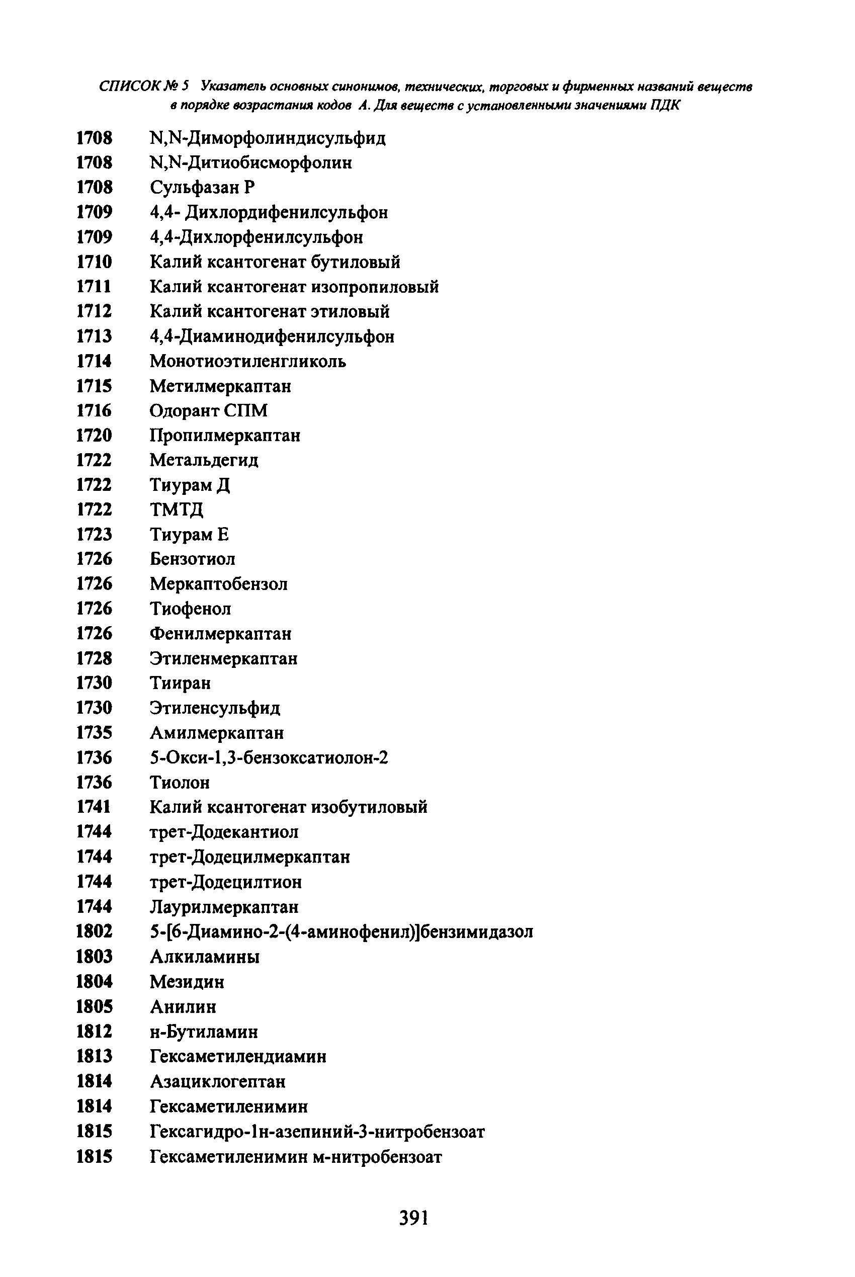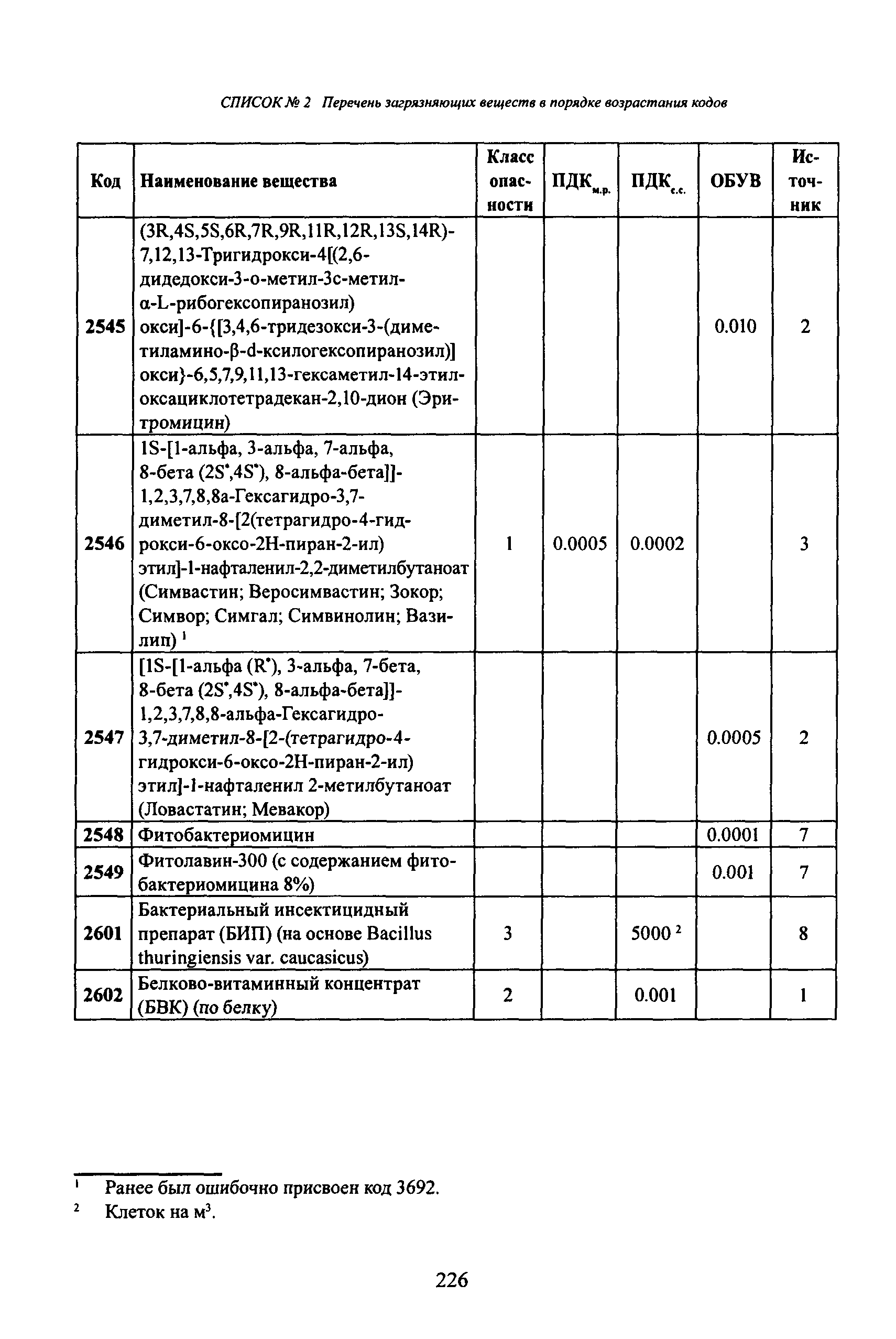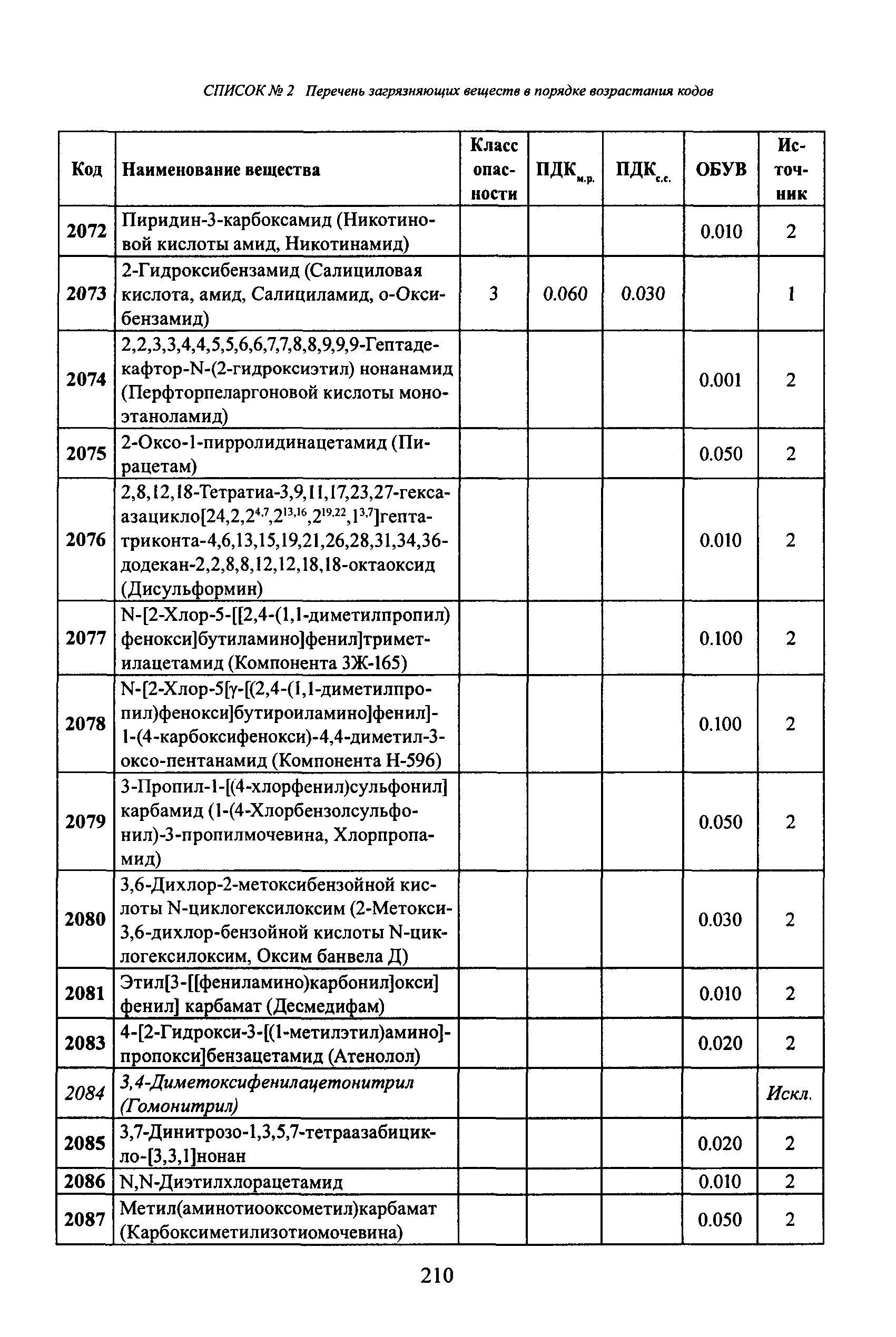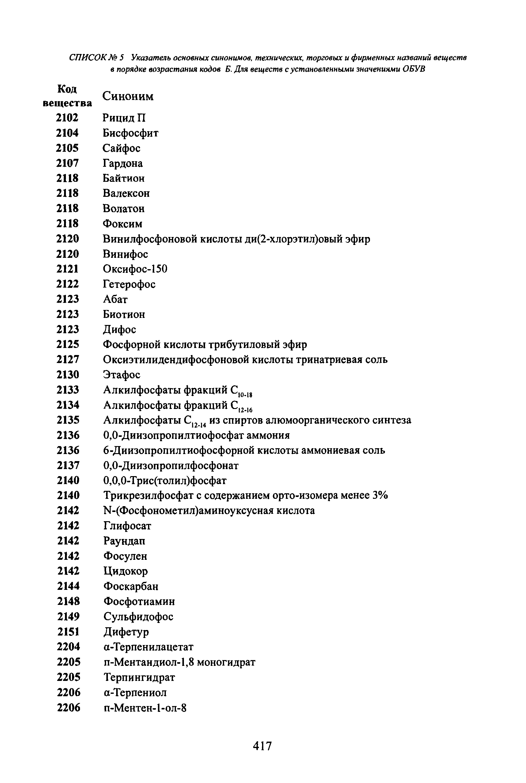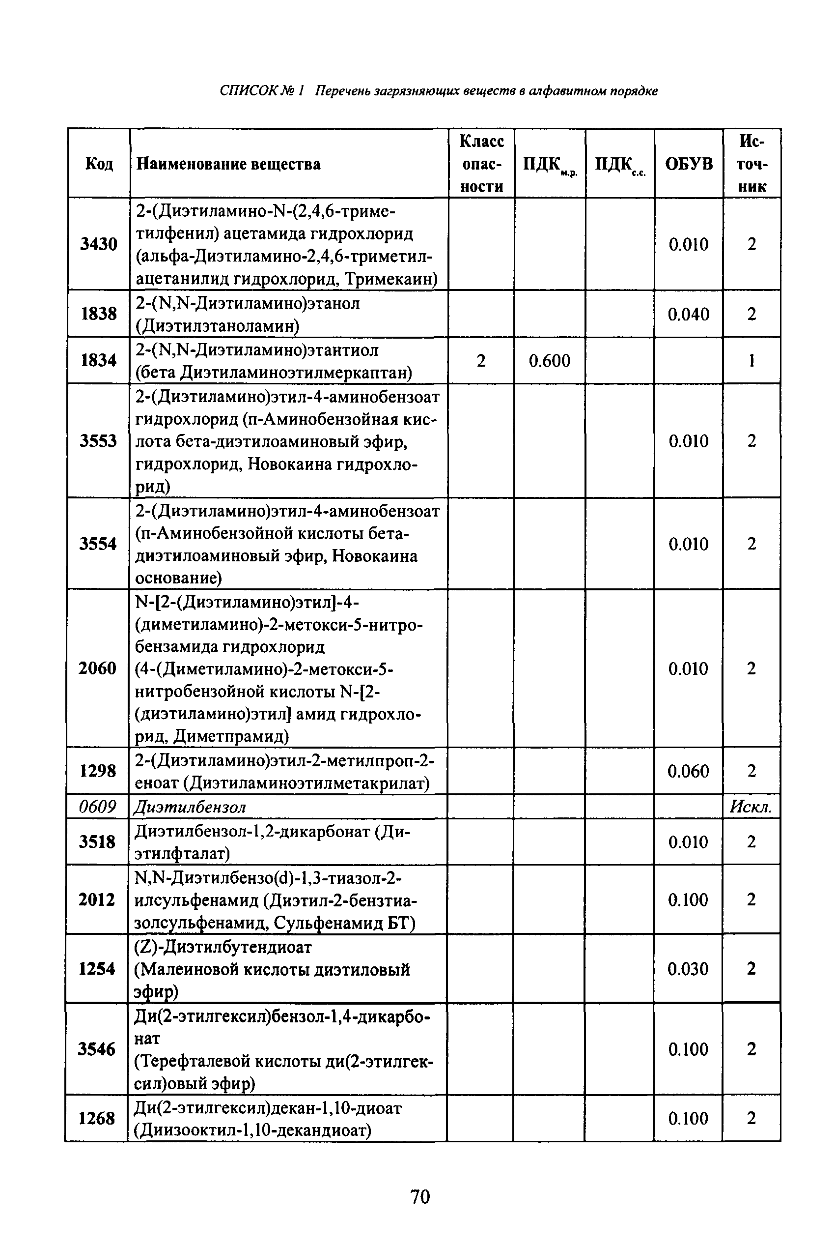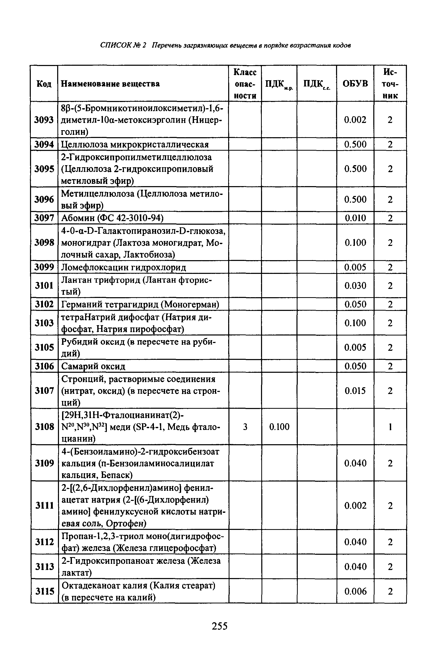 | Оглавление: | Введение Список № 1 Перечень загрязняющих веществ в алфавитном порядке Список № 2 Перечень загрязняющих веществ в порядке возрастания кодов Список № 3 Перечень ЛОС в порядке возрастания кодов Список № 4 Указатель основных синонимов, технических, торговых и фирменных названий веществ в алфавитном порядке А. Для веществ с установленными значениями ПДК Б. Для веществ с установленными значениями ОБУВ Список № 5 Указатель основных синонимов, технических, торговых и фирменных названий веществ в порядке возрастания кодов А. Для веществ с установленными значениями ПДК Б. Для веществ с установленными значениями ОБУВ |