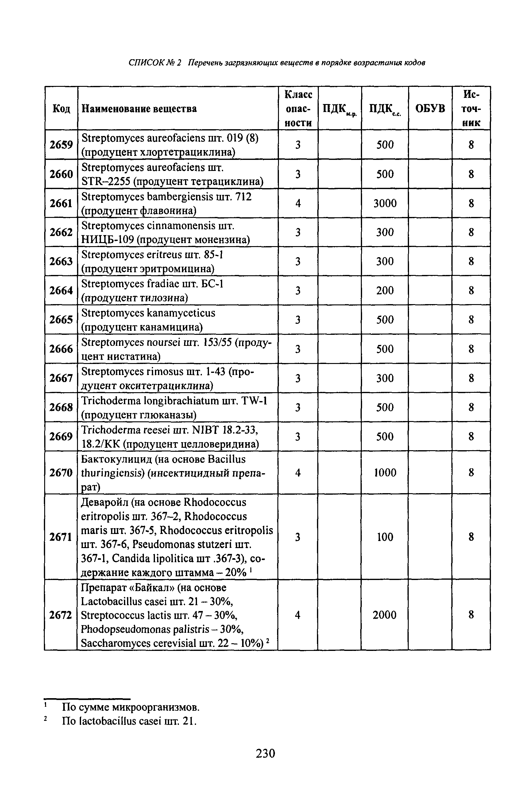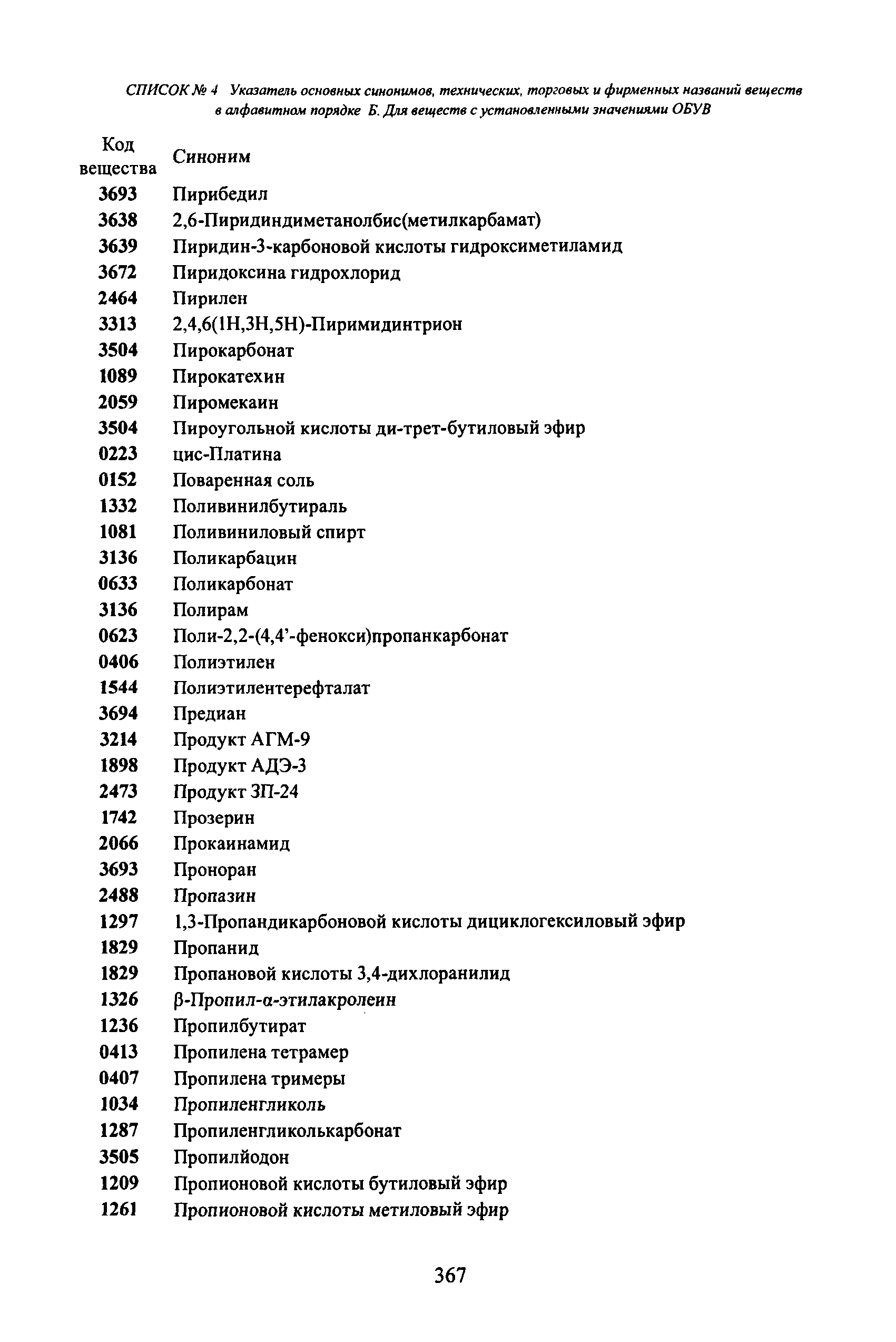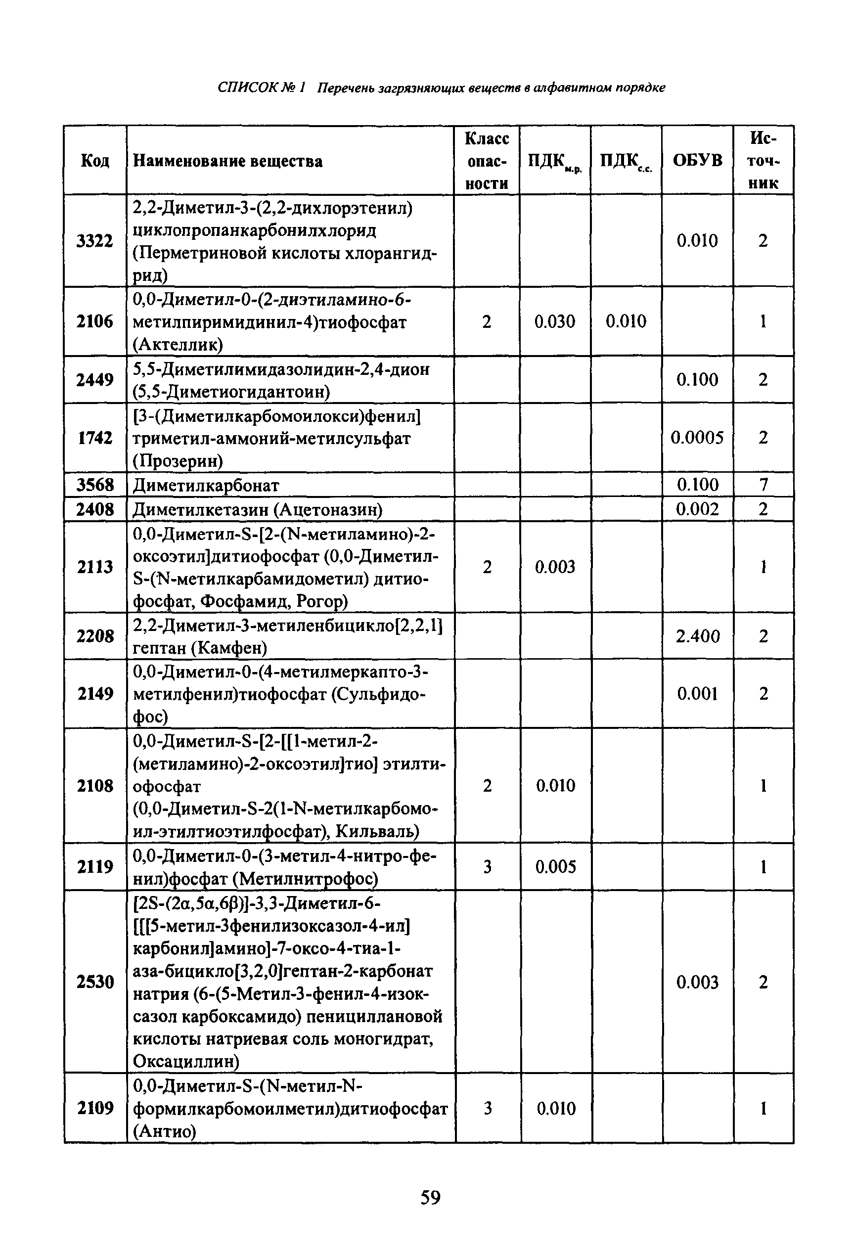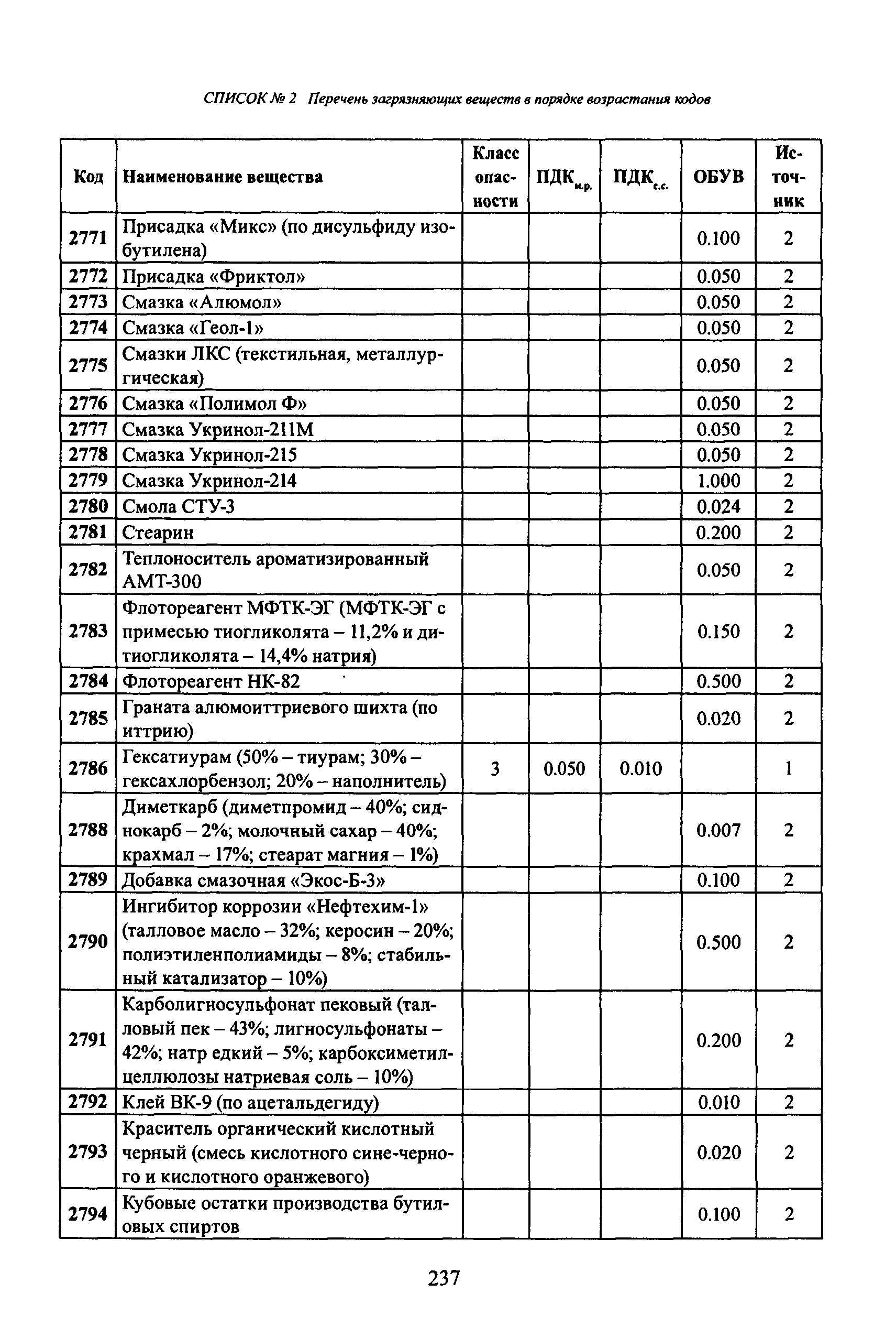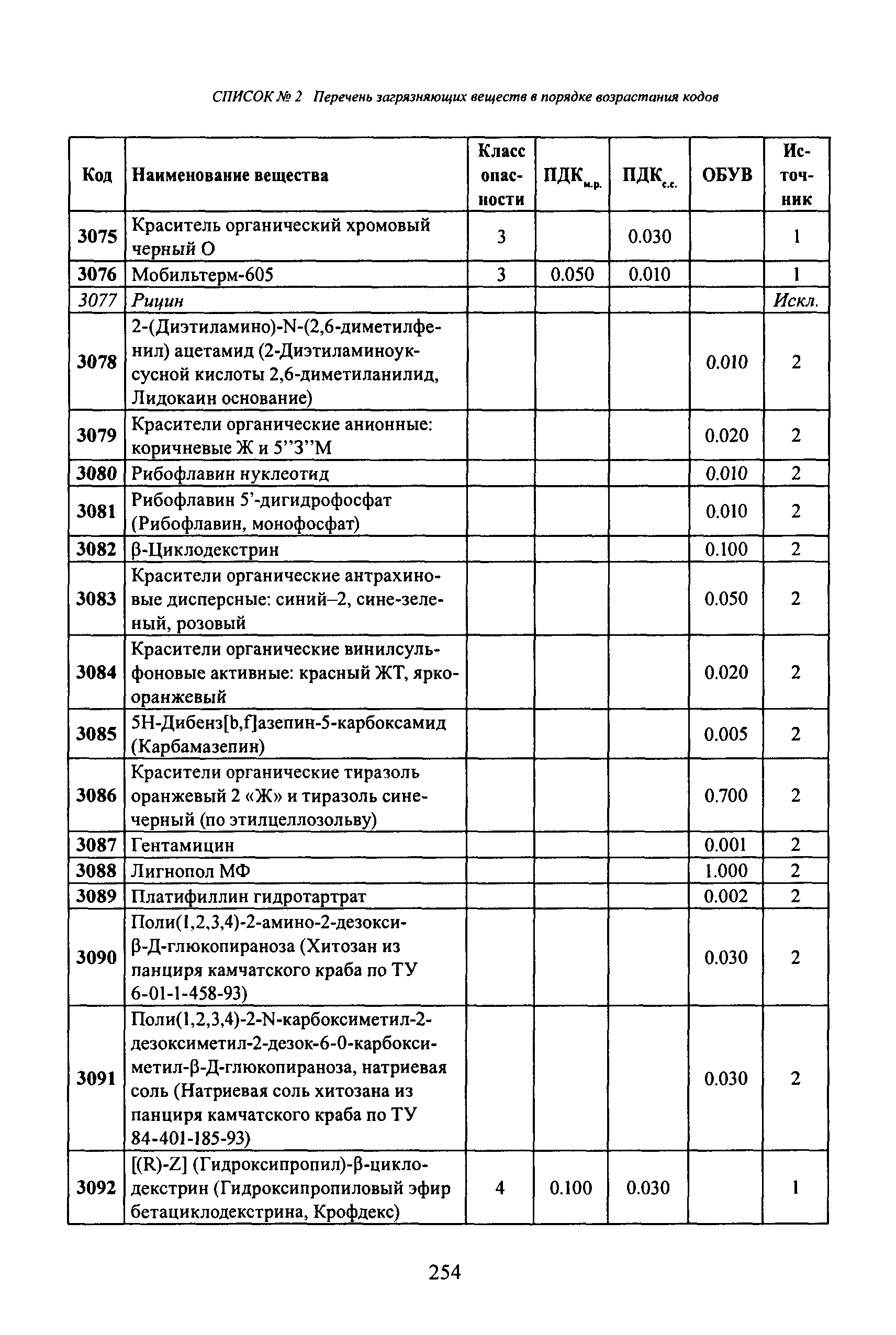 | Оглавление: | Введение Список № 1 Перечень загрязняющих веществ в алфавитном порядке Список № 2 Перечень загрязняющих веществ в порядке возрастания кодов Список № 3 Перечень ЛОС в порядке возрастания кодов Список № 4 Указатель основных синонимов, технических, торговых и фирменных названий веществ в алфавитном порядке А. Для веществ с установленными значениями ПДК Б. Для веществ с установленными значениями ОБУВ Список № 5 Указатель основных синонимов, технических, торговых и фирменных названий веществ в порядке возрастания кодов А. Для веществ с установленными значениями ПДК Б. Для веществ с установленными значениями ОБУВ |