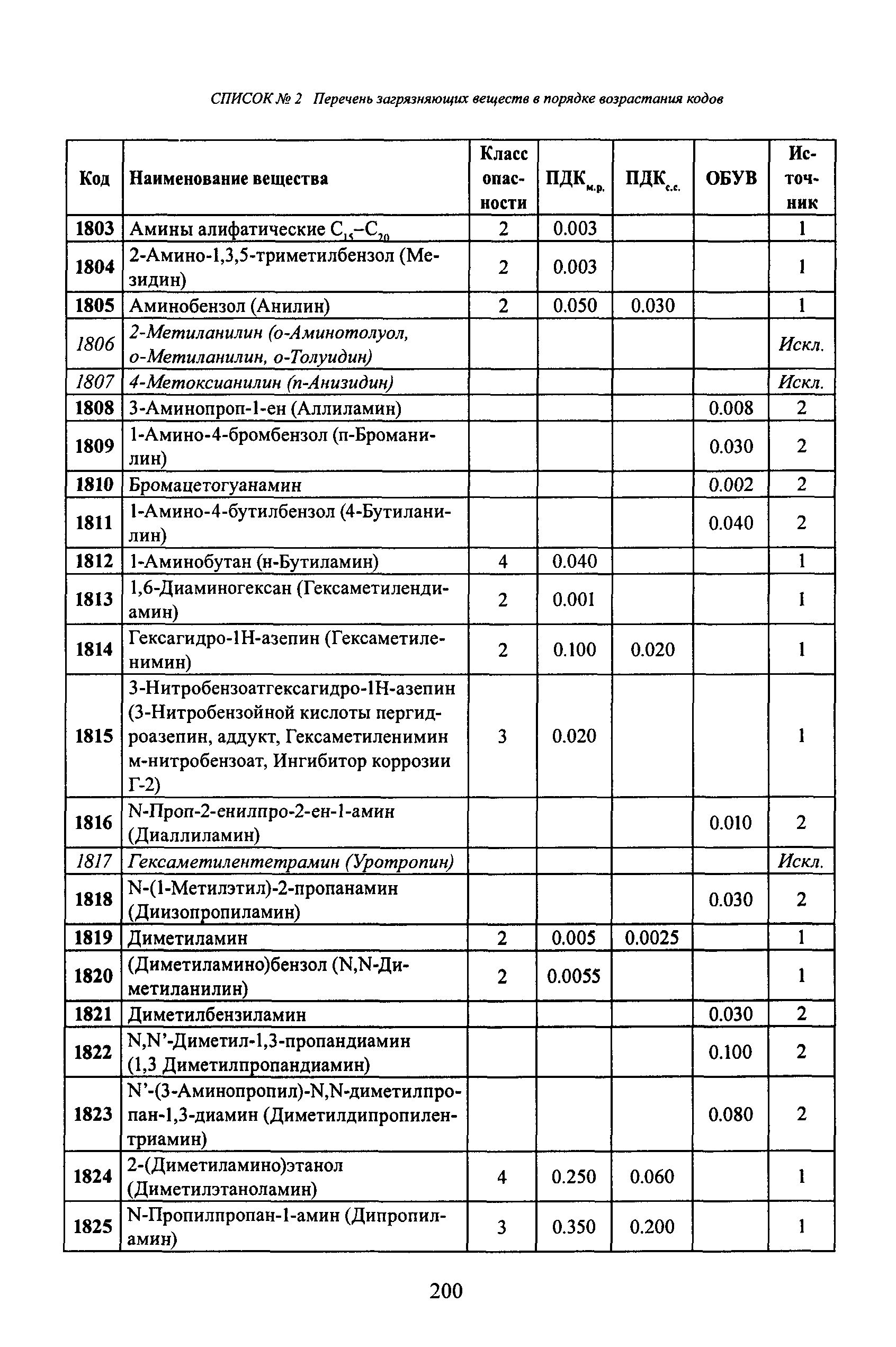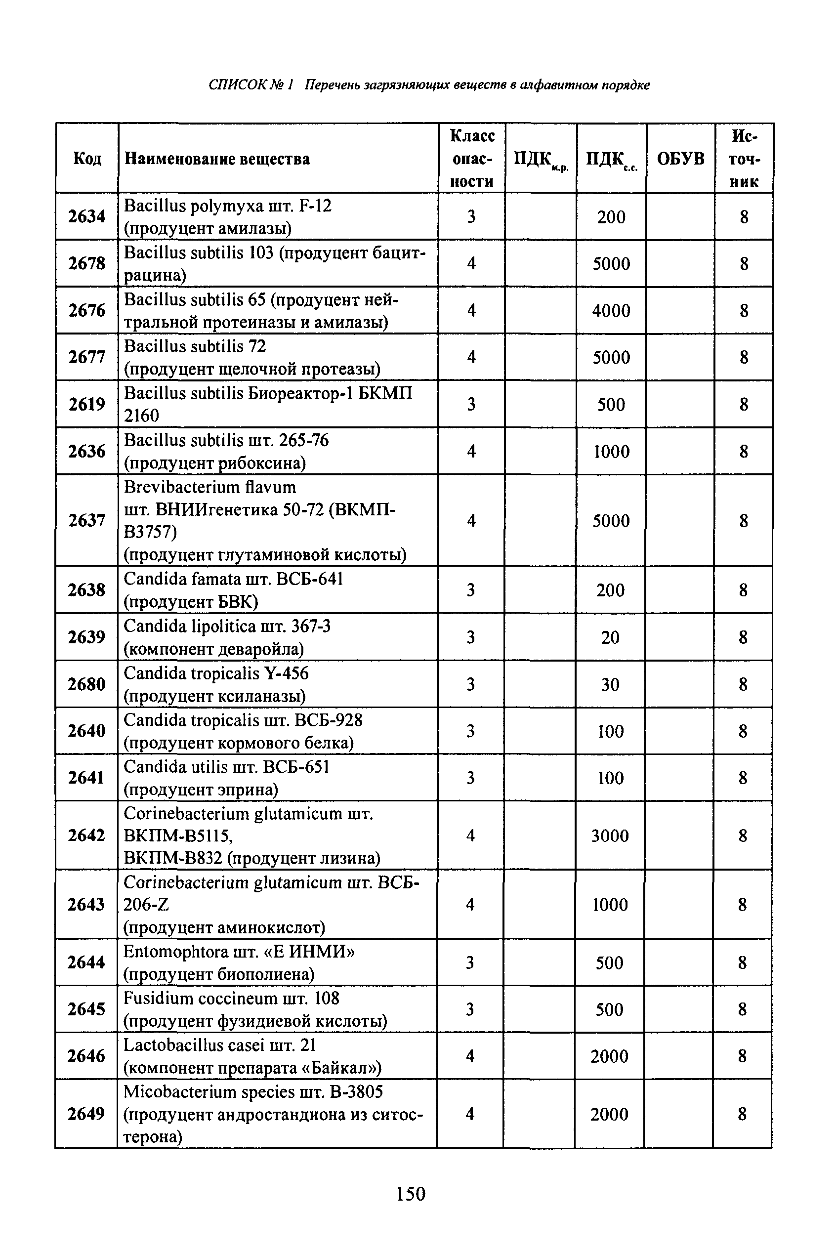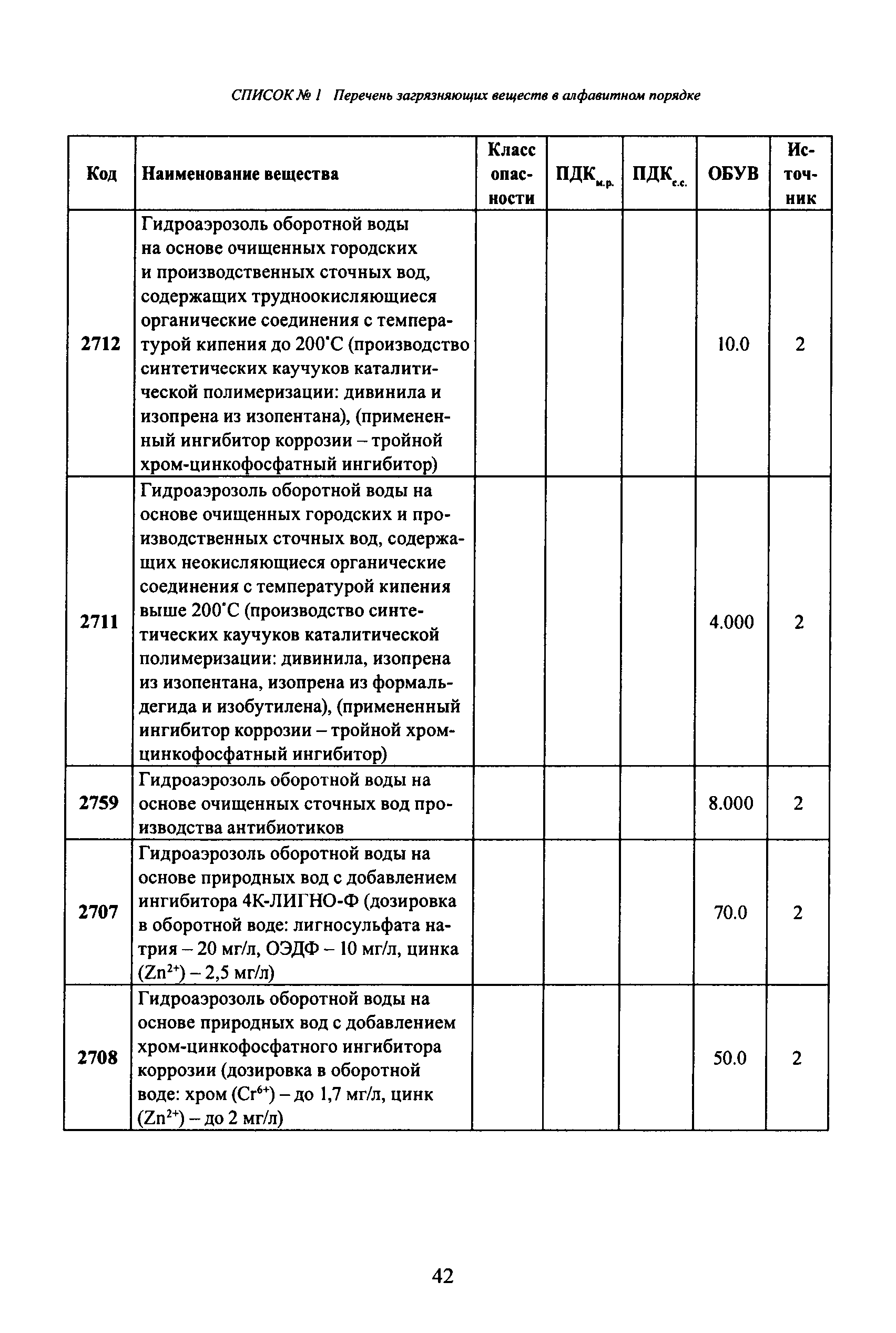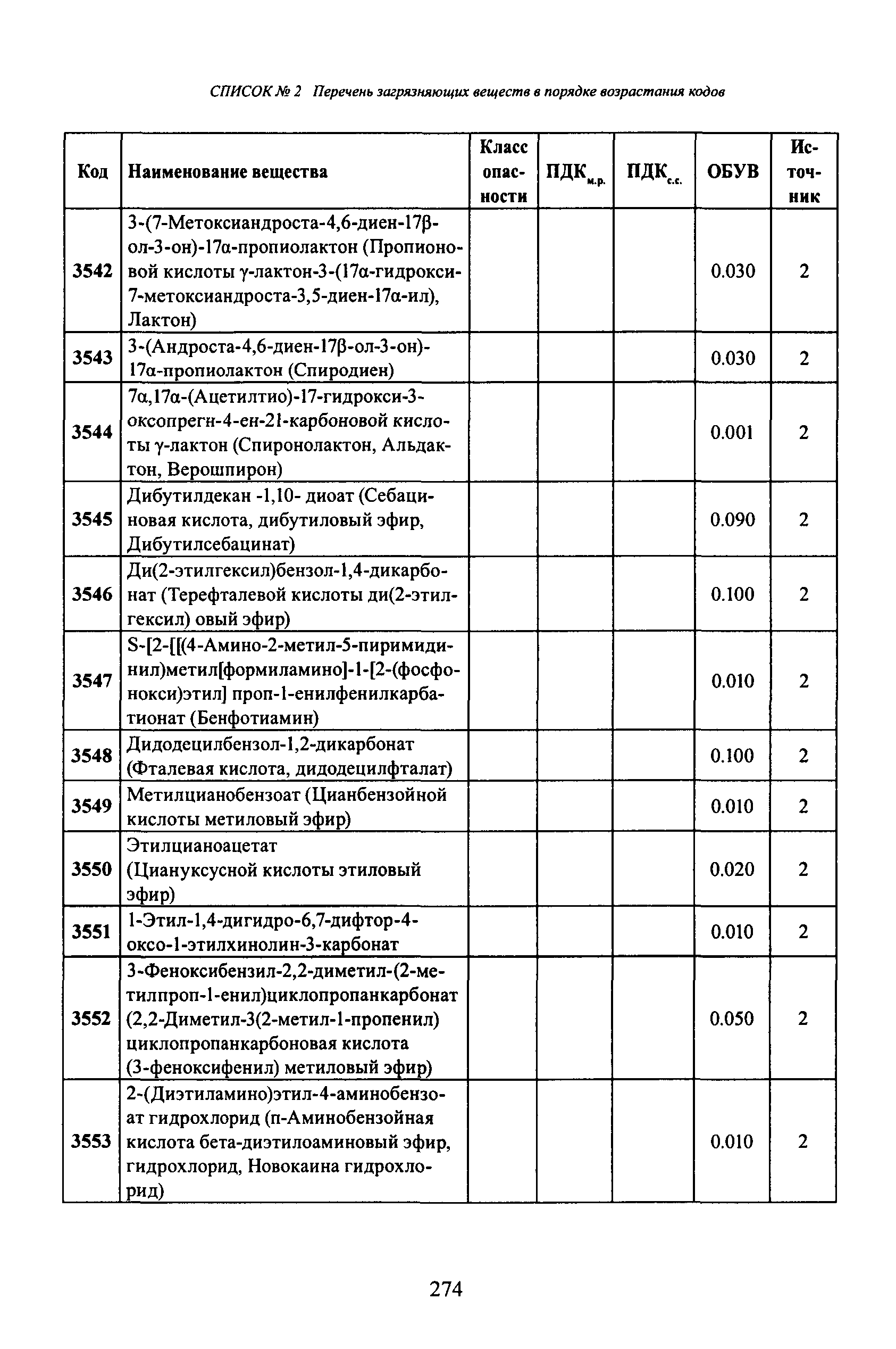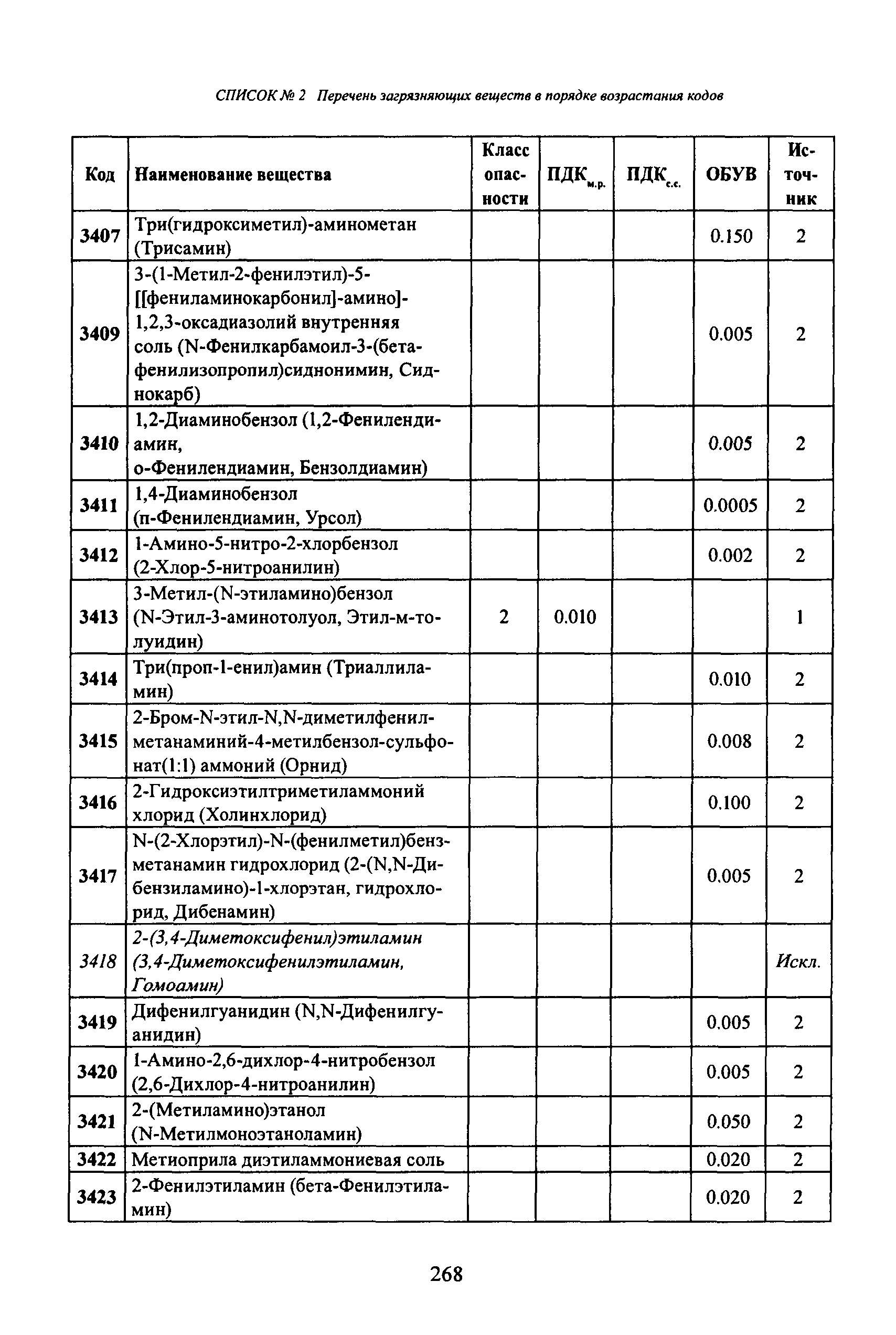 | Оглавление: | Введение Список № 1 Перечень загрязняющих веществ в алфавитном порядке Список № 2 Перечень загрязняющих веществ в порядке возрастания кодов Список № 3 Перечень ЛОС в порядке возрастания кодов Список № 4 Указатель основных синонимов, технических, торговых и фирменных названий веществ в алфавитном порядке А. Для веществ с установленными значениями ПДК Б. Для веществ с установленными значениями ОБУВ Список № 5 Указатель основных синонимов, технических, торговых и фирменных названий веществ в порядке возрастания кодов А. Для веществ с установленными значениями ПДК Б. Для веществ с установленными значениями ОБУВ |