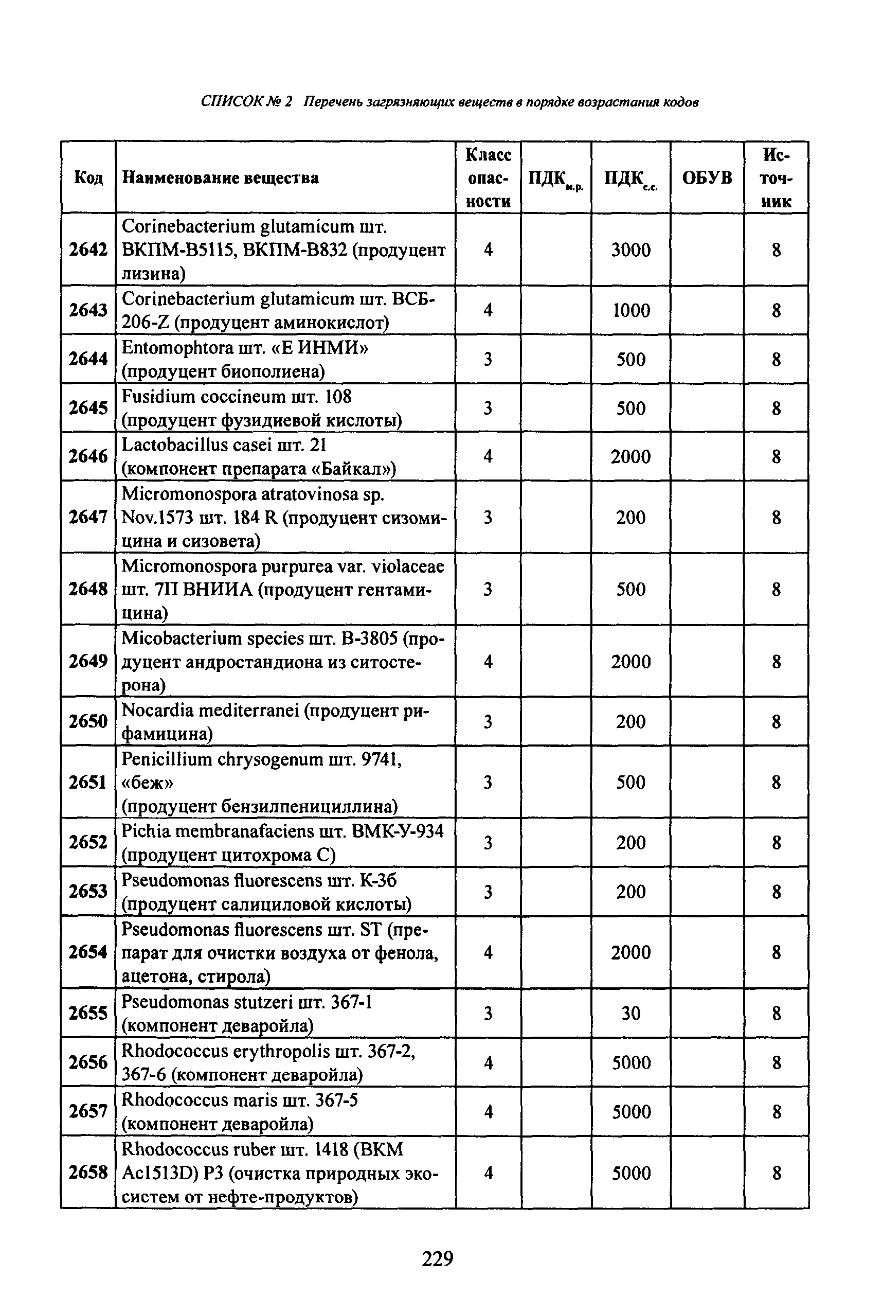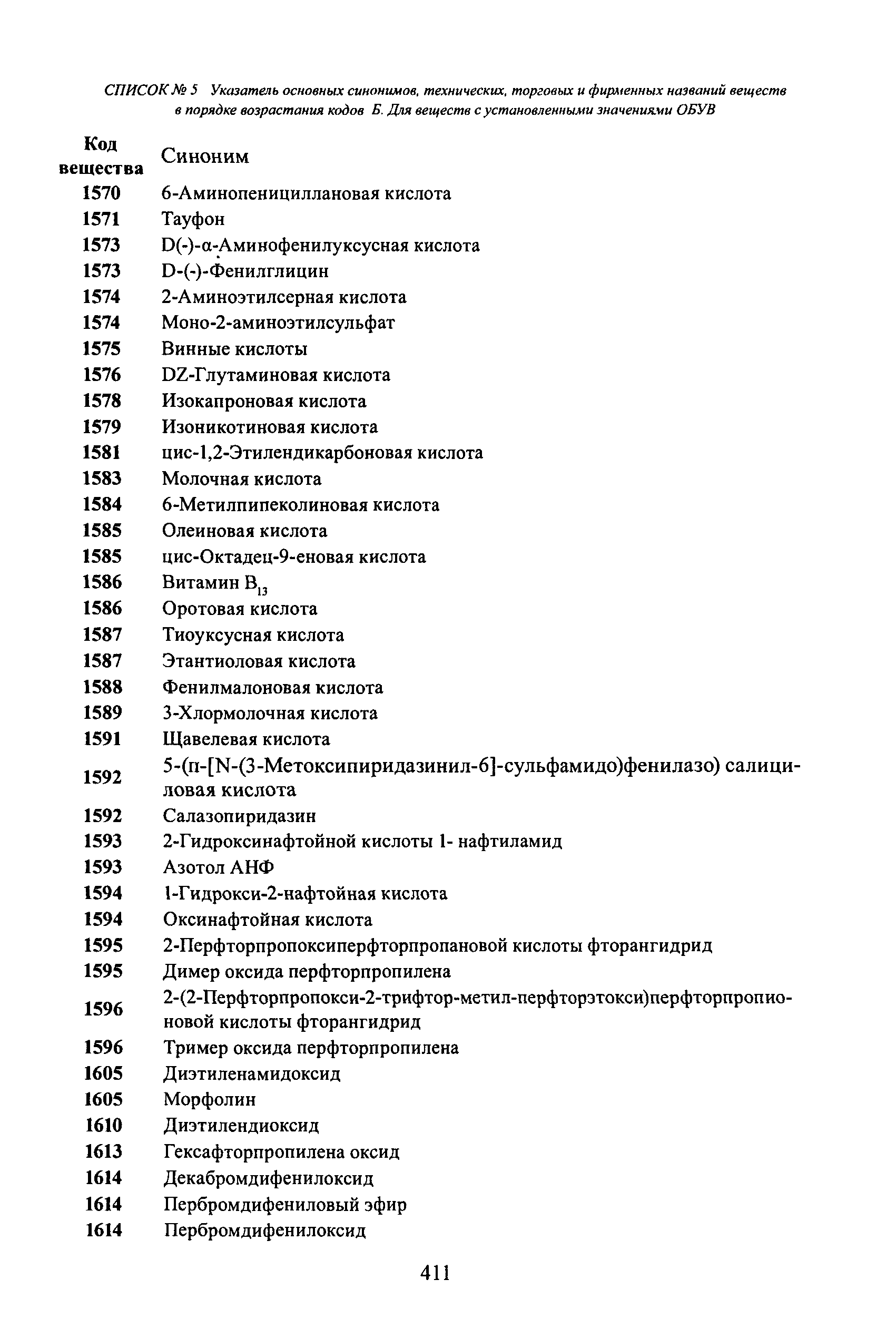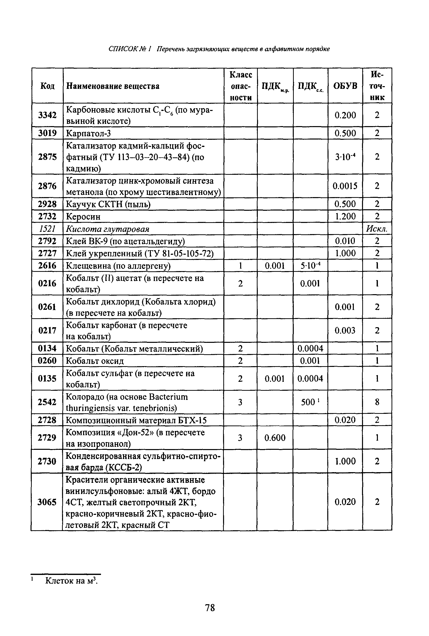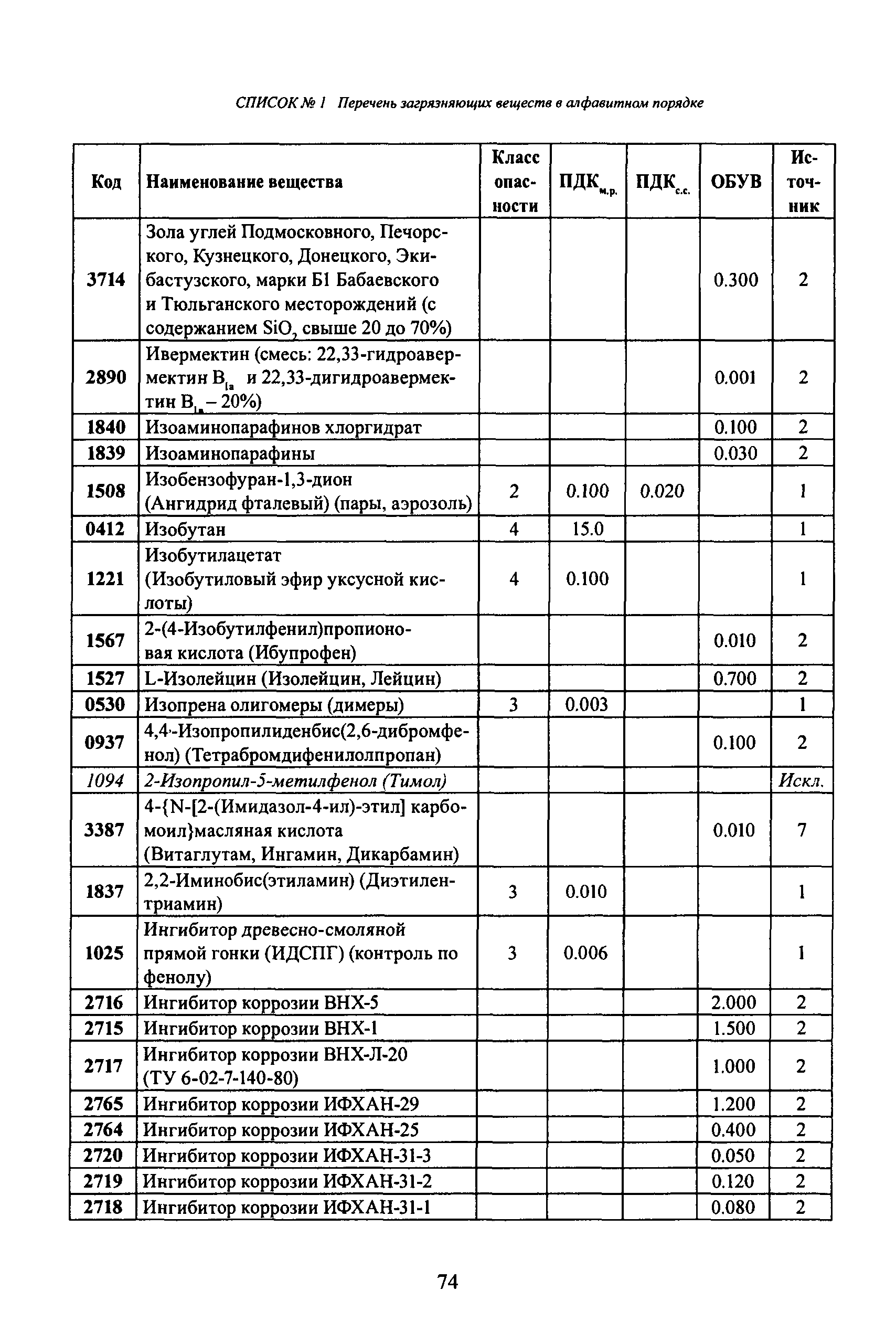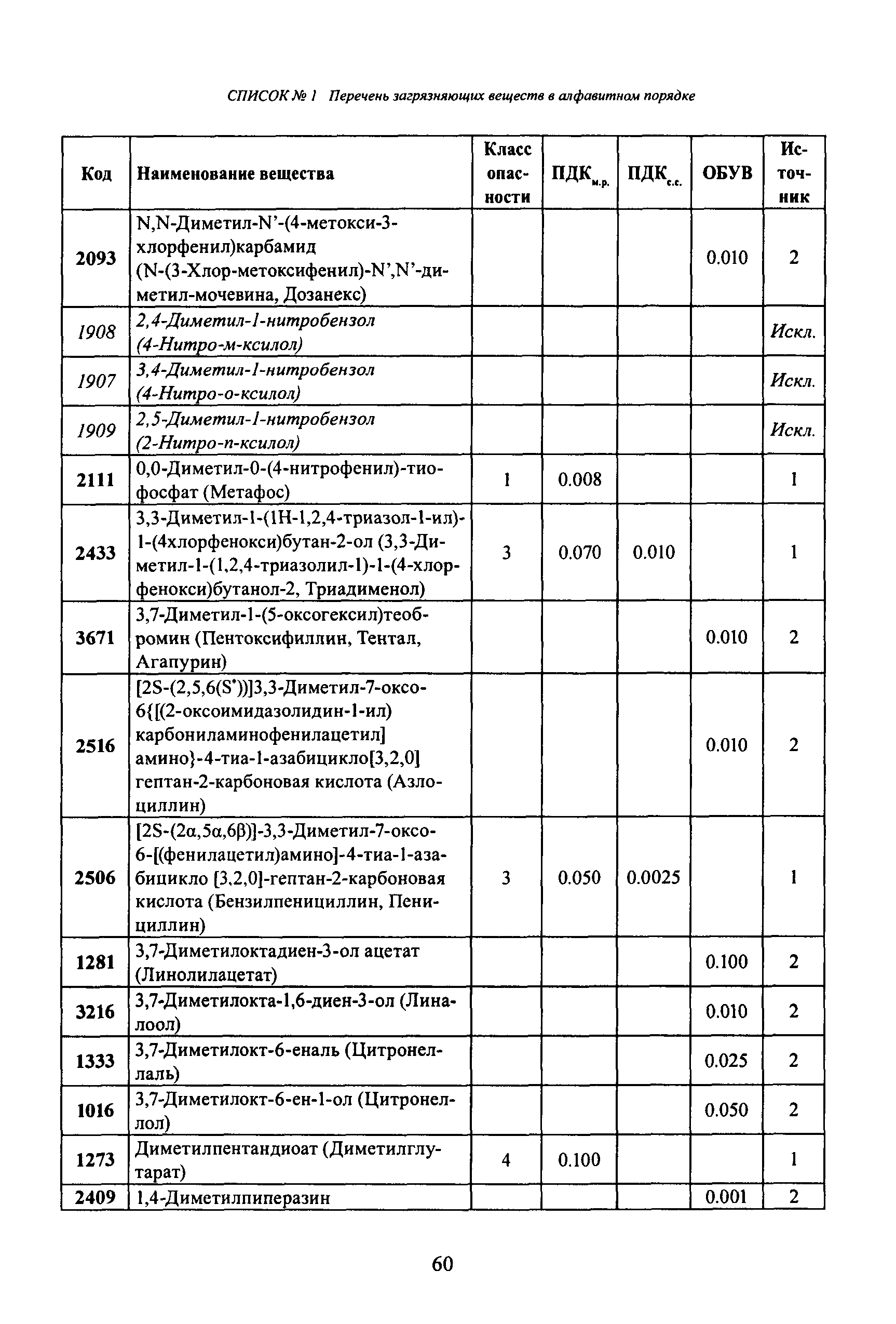 | Оглавление: | Введение Список № 1 Перечень загрязняющих веществ в алфавитном порядке Список № 2 Перечень загрязняющих веществ в порядке возрастания кодов Список № 3 Перечень ЛОС в порядке возрастания кодов Список № 4 Указатель основных синонимов, технических, торговых и фирменных названий веществ в алфавитном порядке А. Для веществ с установленными значениями ПДК Б. Для веществ с установленными значениями ОБУВ Список № 5 Указатель основных синонимов, технических, торговых и фирменных названий веществ в порядке возрастания кодов А. Для веществ с установленными значениями ПДК Б. Для веществ с установленными значениями ОБУВ |