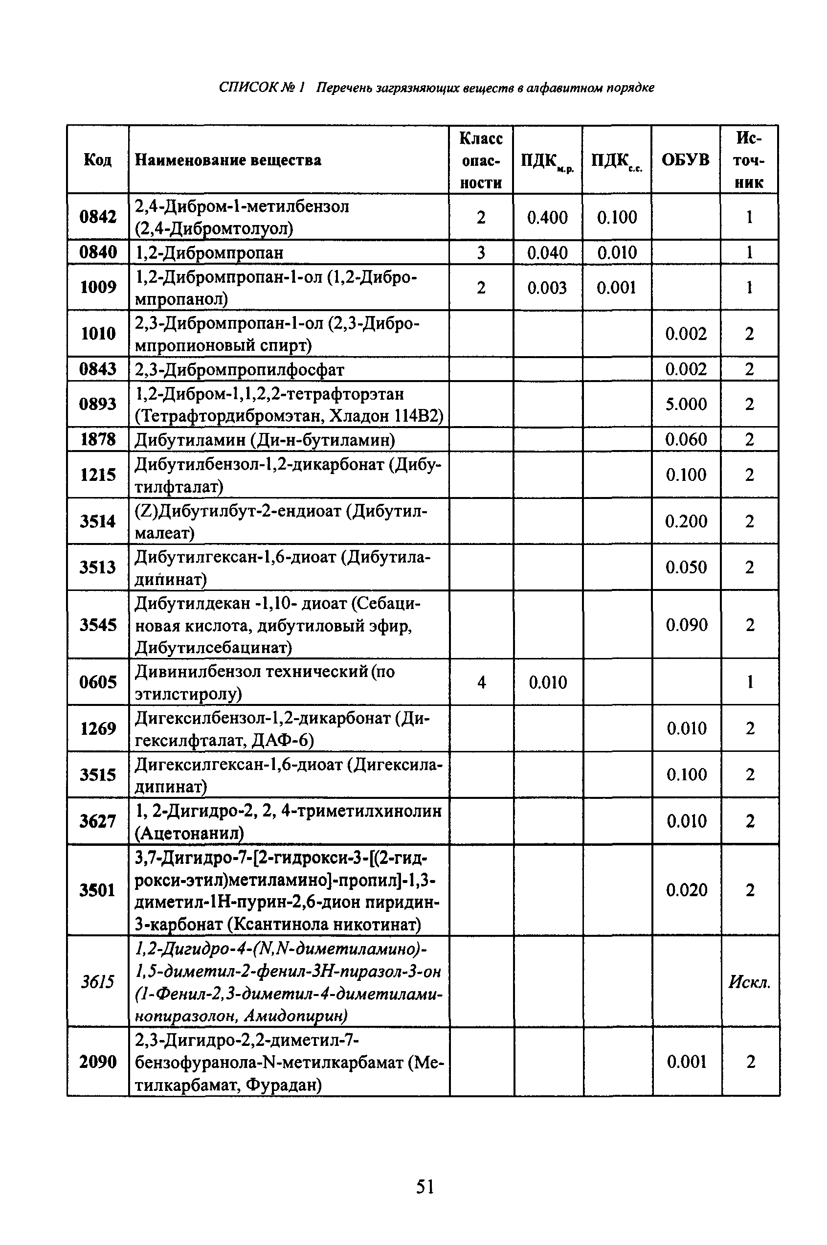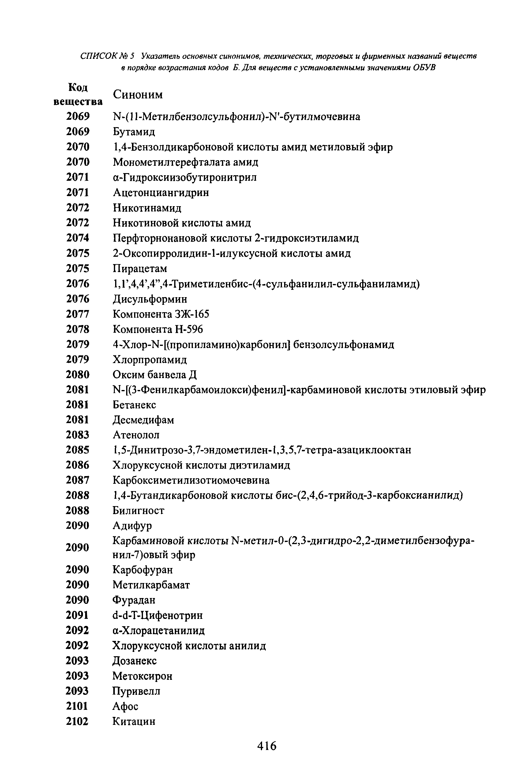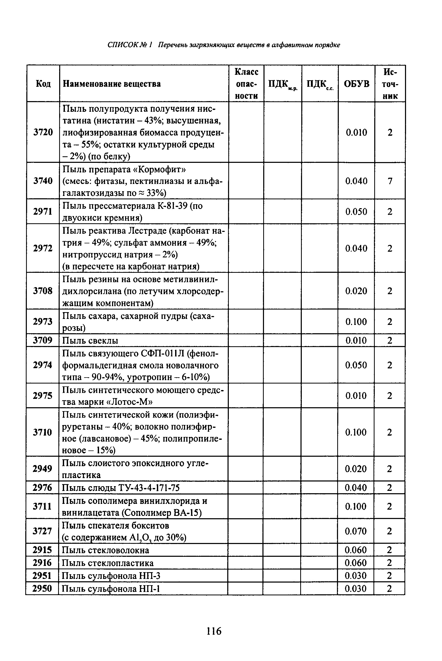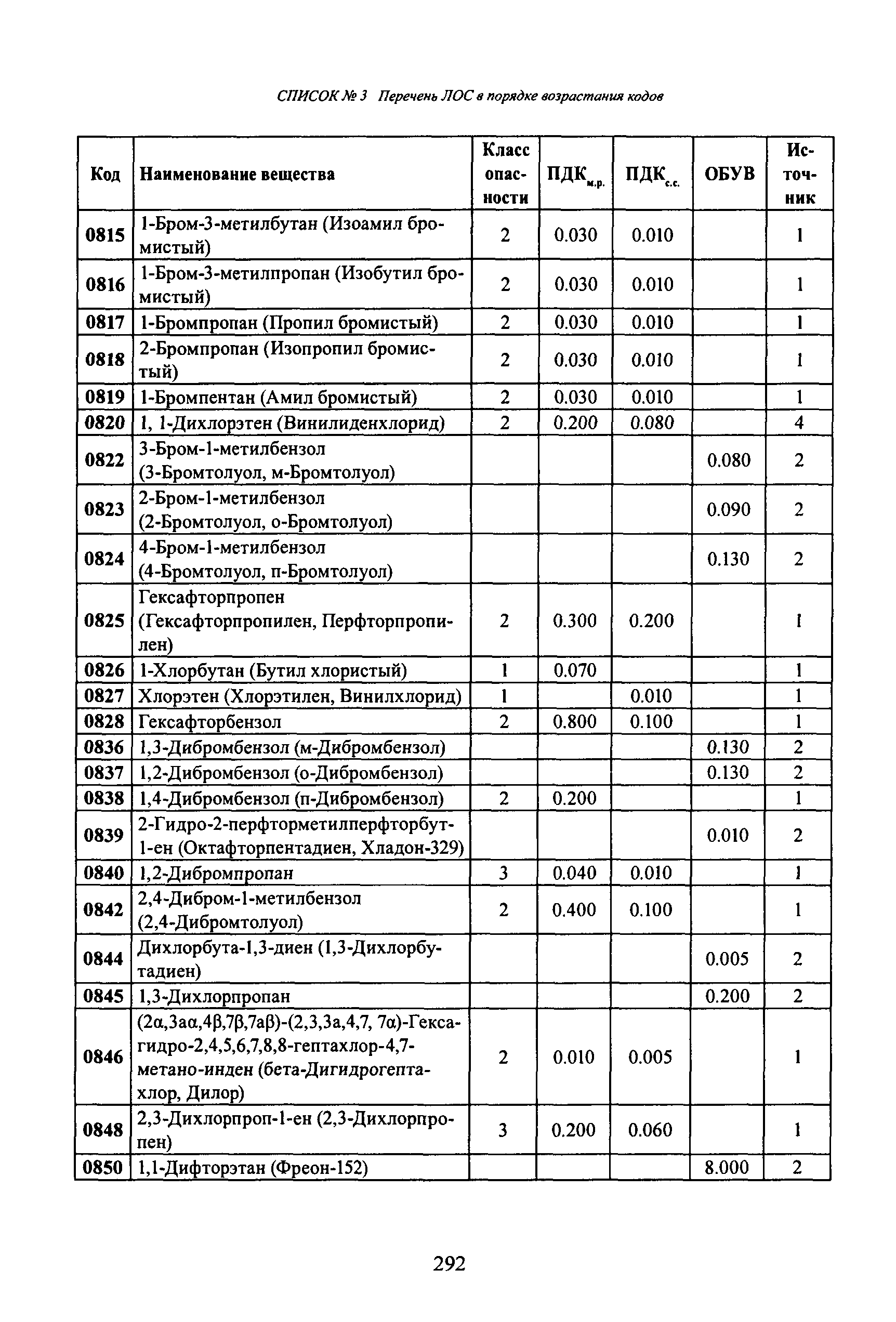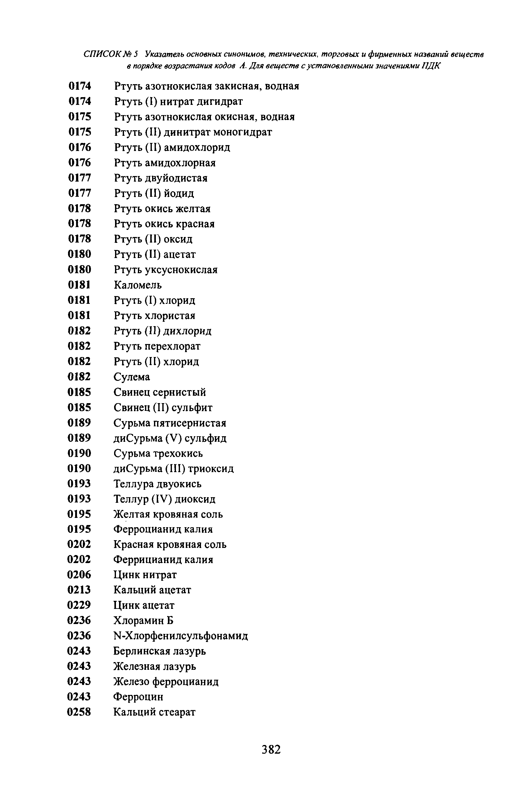 | Оглавление: | Введение Список № 1 Перечень загрязняющих веществ в алфавитном порядке Список № 2 Перечень загрязняющих веществ в порядке возрастания кодов Список № 3 Перечень ЛОС в порядке возрастания кодов Список № 4 Указатель основных синонимов, технических, торговых и фирменных названий веществ в алфавитном порядке А. Для веществ с установленными значениями ПДК Б. Для веществ с установленными значениями ОБУВ Список № 5 Указатель основных синонимов, технических, торговых и фирменных названий веществ в порядке возрастания кодов А. Для веществ с установленными значениями ПДК Б. Для веществ с установленными значениями ОБУВ |
