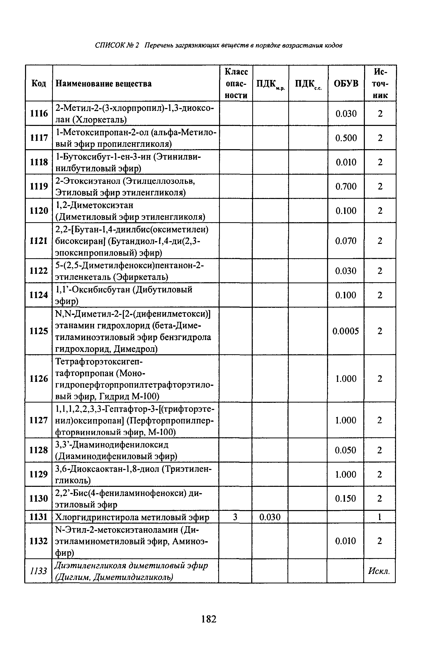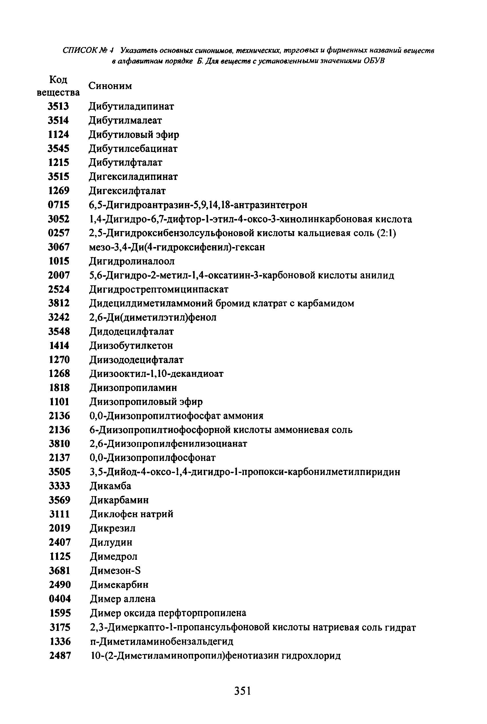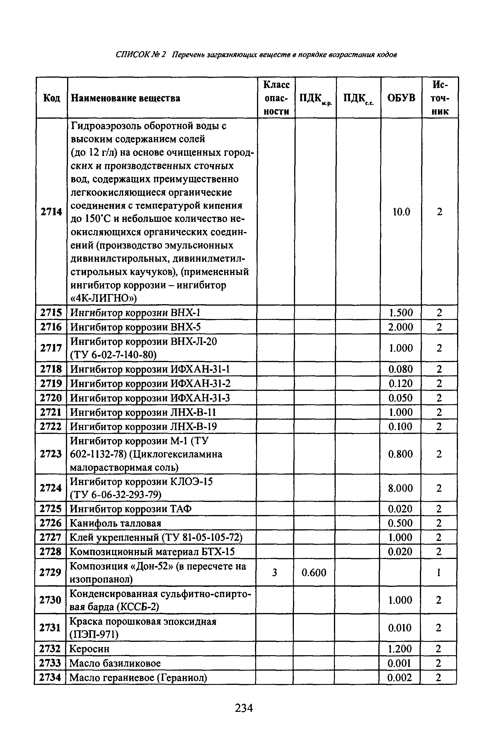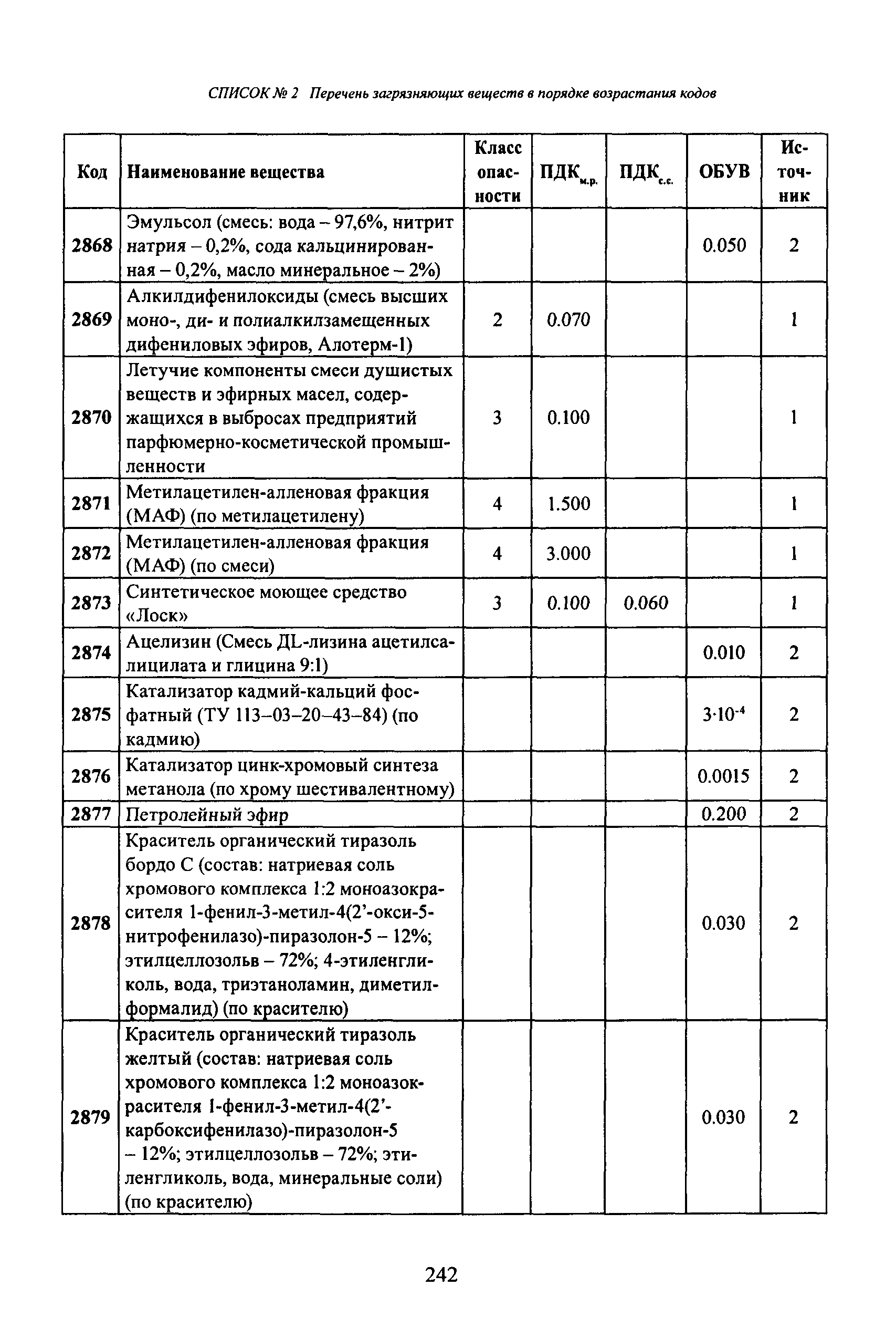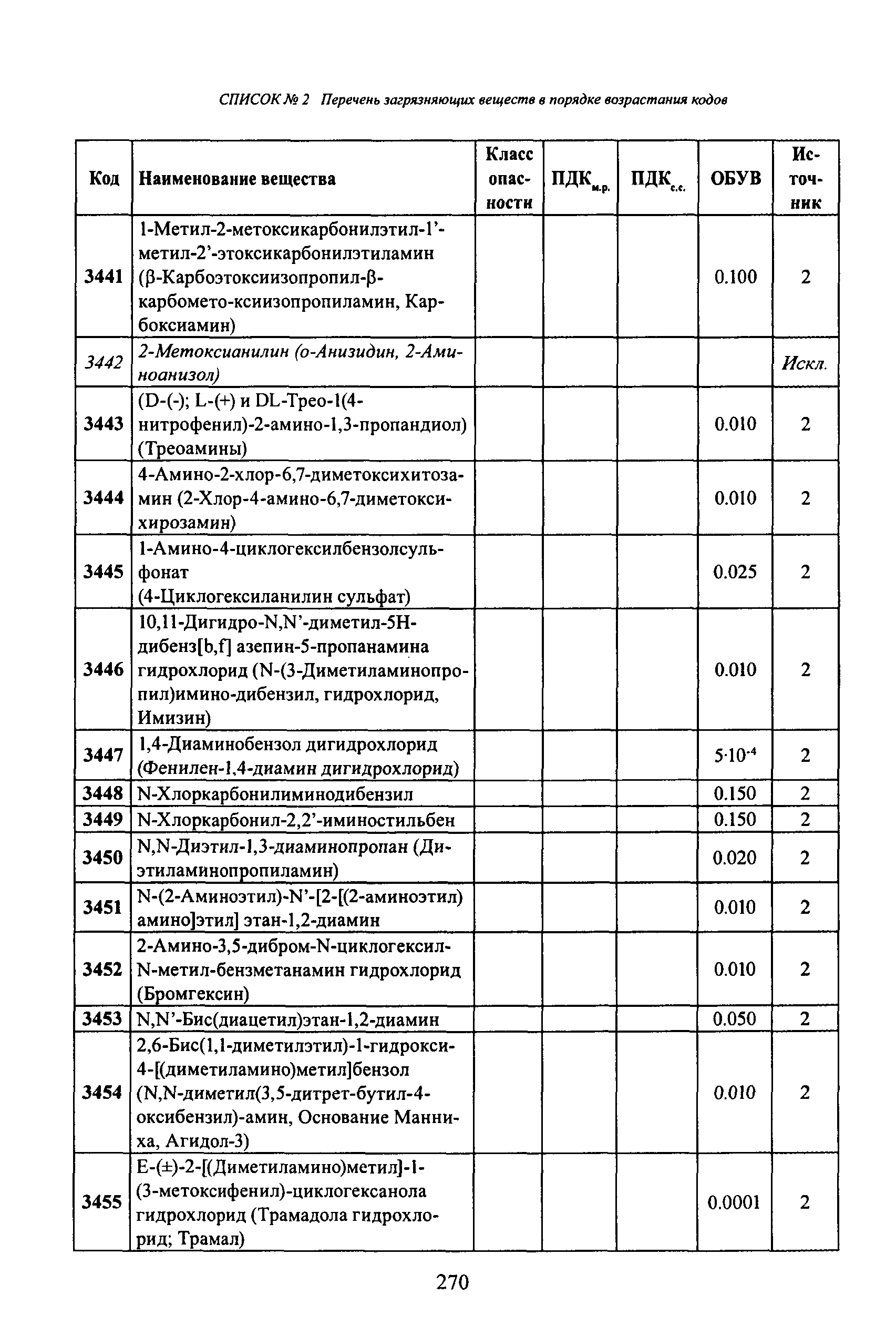 | Оглавление: | Введение Список № 1 Перечень загрязняющих веществ в алфавитном порядке Список № 2 Перечень загрязняющих веществ в порядке возрастания кодов Список № 3 Перечень ЛОС в порядке возрастания кодов Список № 4 Указатель основных синонимов, технических, торговых и фирменных названий веществ в алфавитном порядке А. Для веществ с установленными значениями ПДК Б. Для веществ с установленными значениями ОБУВ Список № 5 Указатель основных синонимов, технических, торговых и фирменных названий веществ в порядке возрастания кодов А. Для веществ с установленными значениями ПДК Б. Для веществ с установленными значениями ОБУВ |