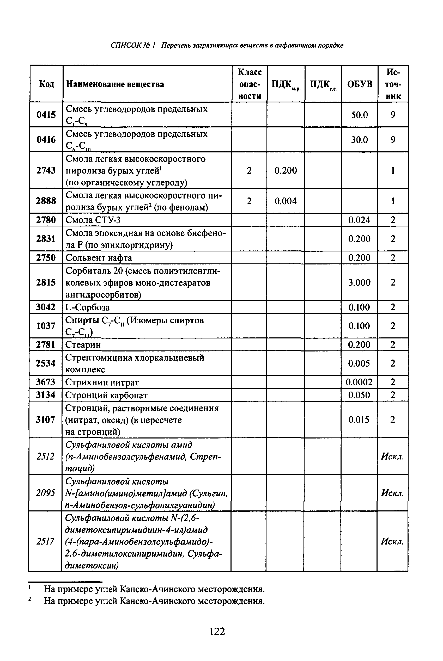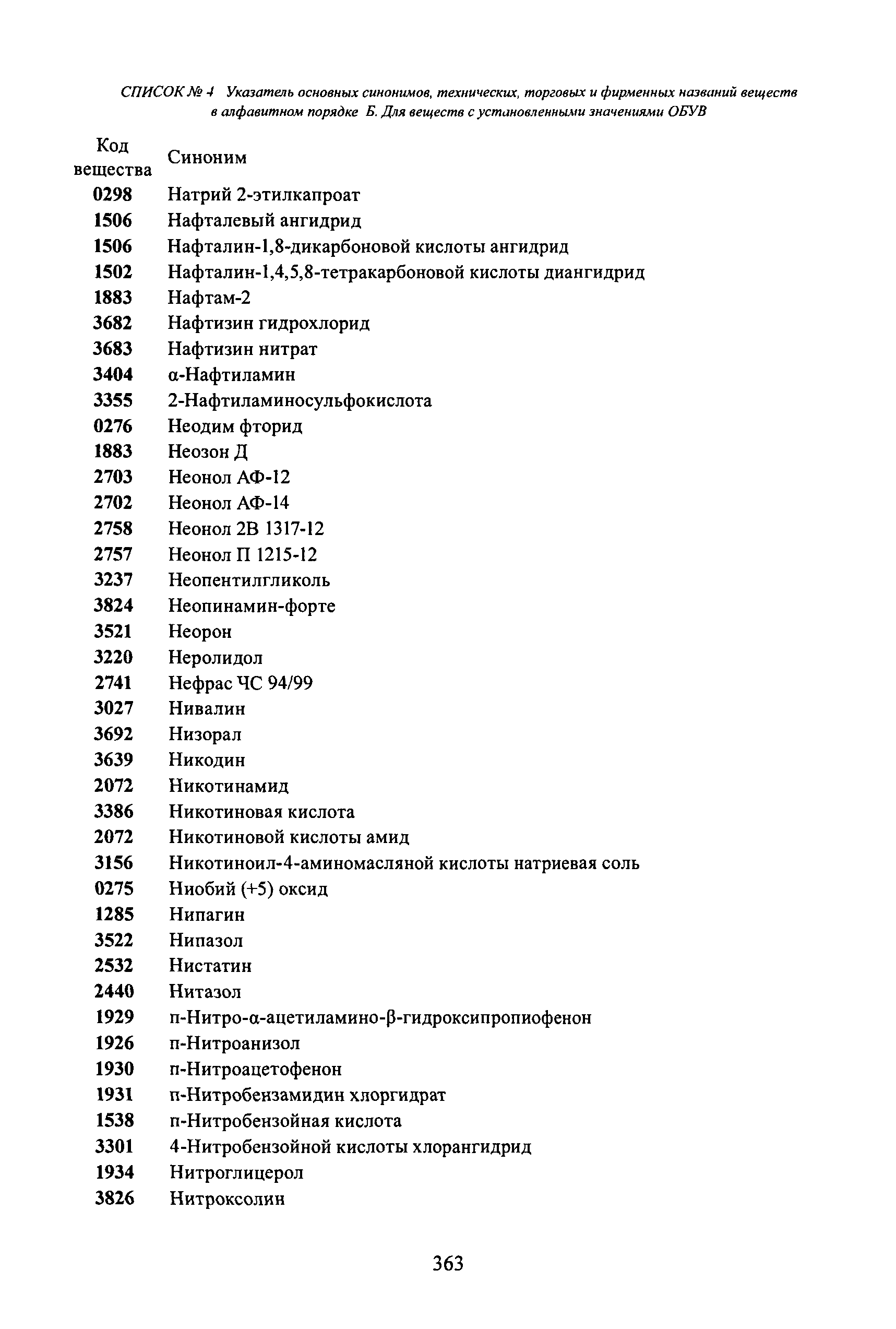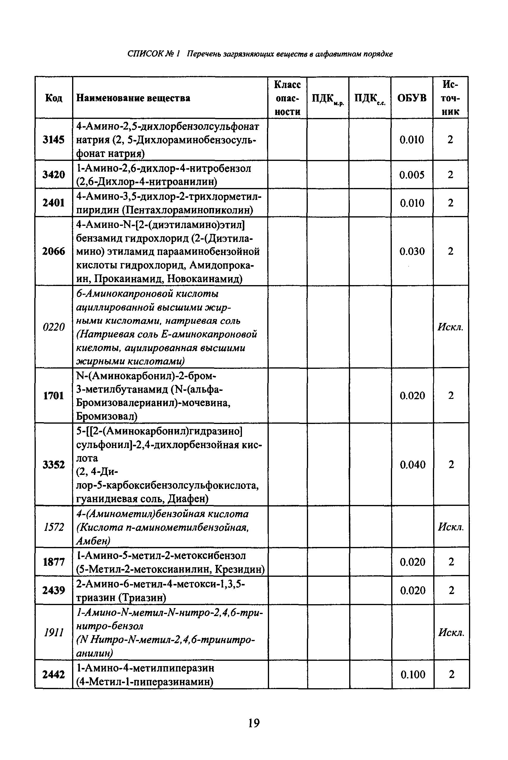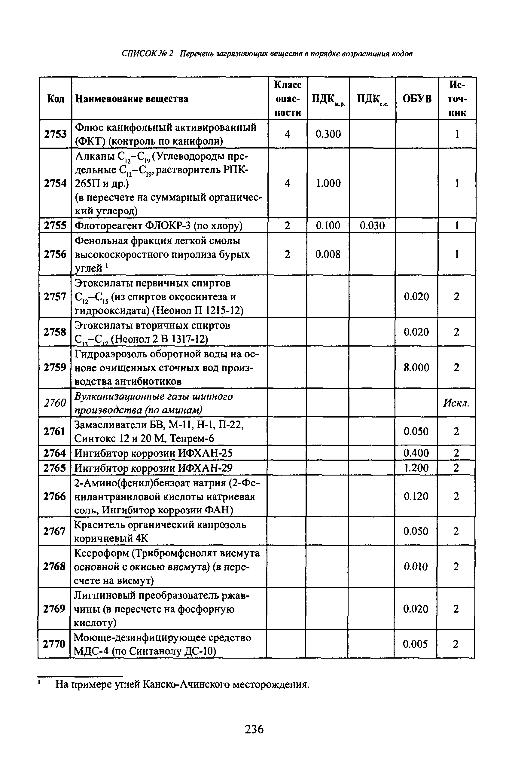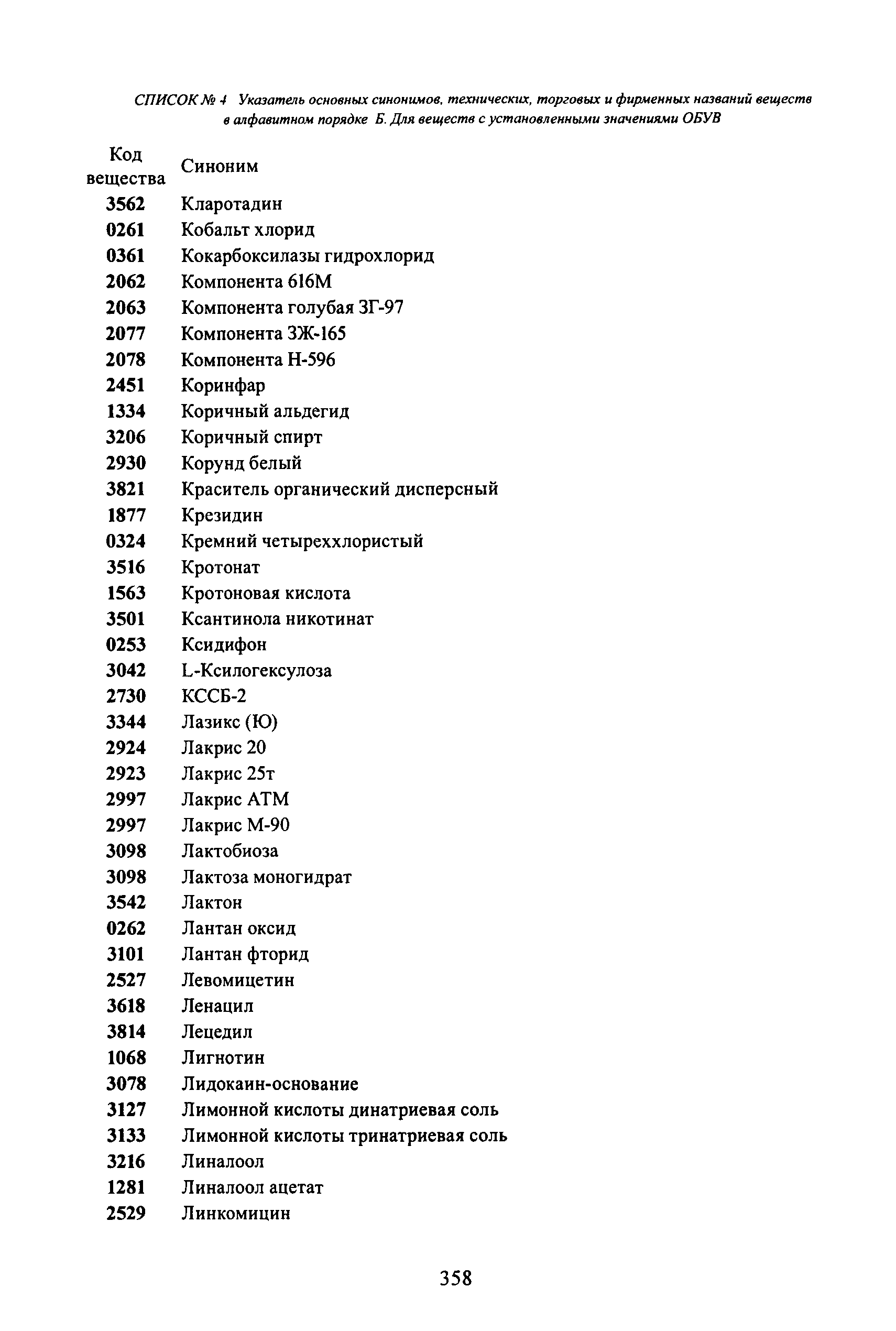 | Оглавление: | Введение Список № 1 Перечень загрязняющих веществ в алфавитном порядке Список № 2 Перечень загрязняющих веществ в порядке возрастания кодов Список № 3 Перечень ЛОС в порядке возрастания кодов Список № 4 Указатель основных синонимов, технических, торговых и фирменных названий веществ в алфавитном порядке А. Для веществ с установленными значениями ПДК Б. Для веществ с установленными значениями ОБУВ Список № 5 Указатель основных синонимов, технических, торговых и фирменных названий веществ в порядке возрастания кодов А. Для веществ с установленными значениями ПДК Б. Для веществ с установленными значениями ОБУВ |