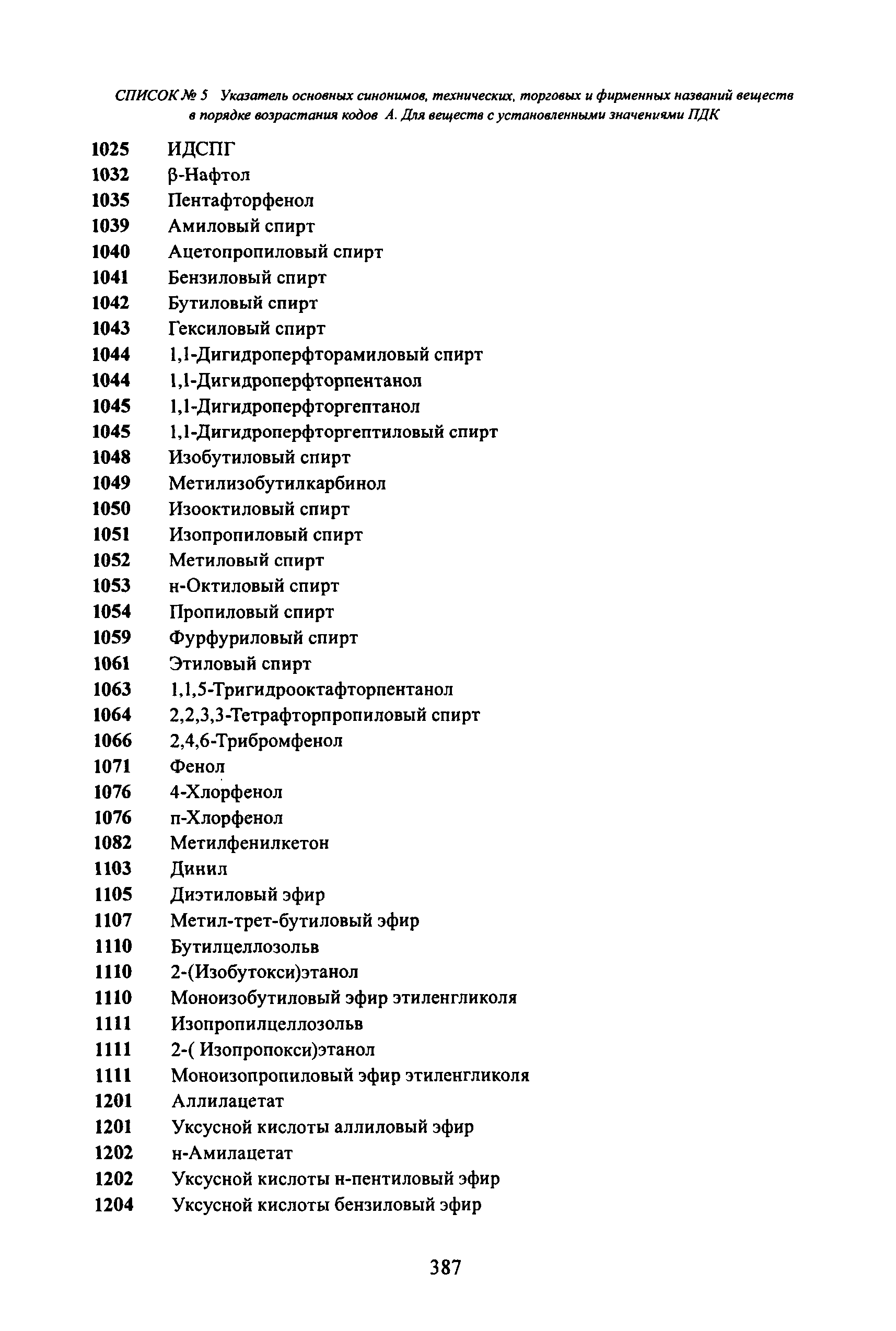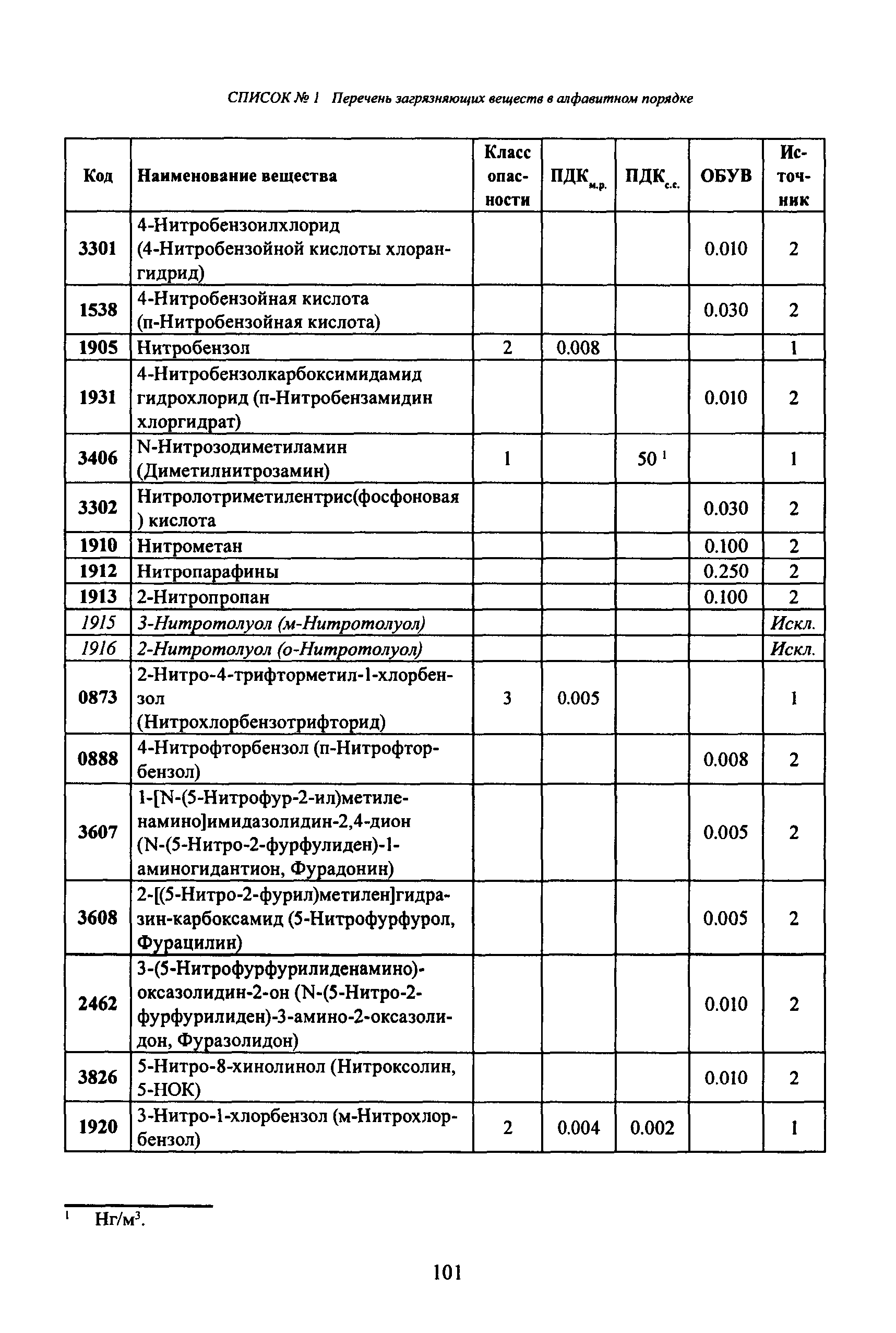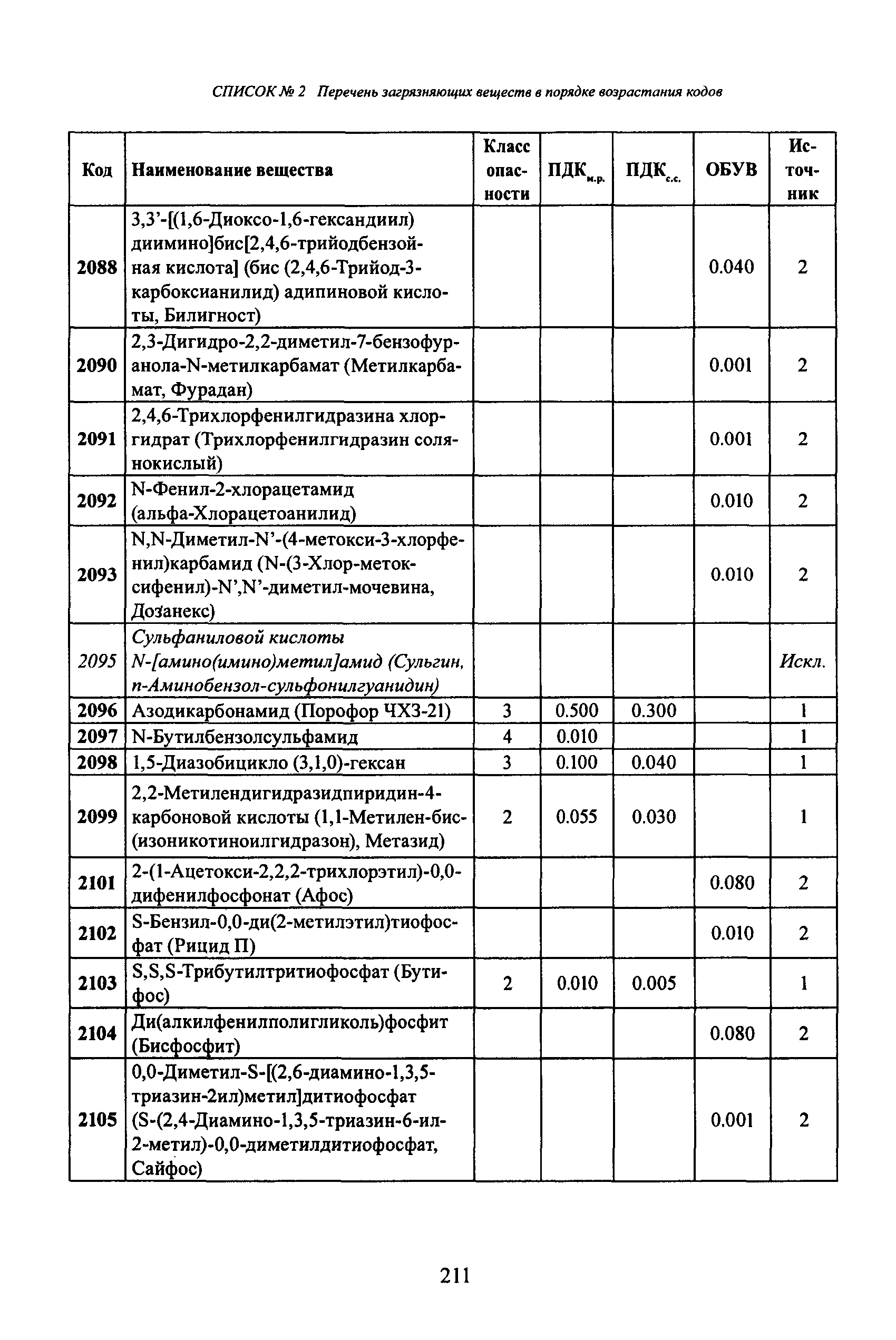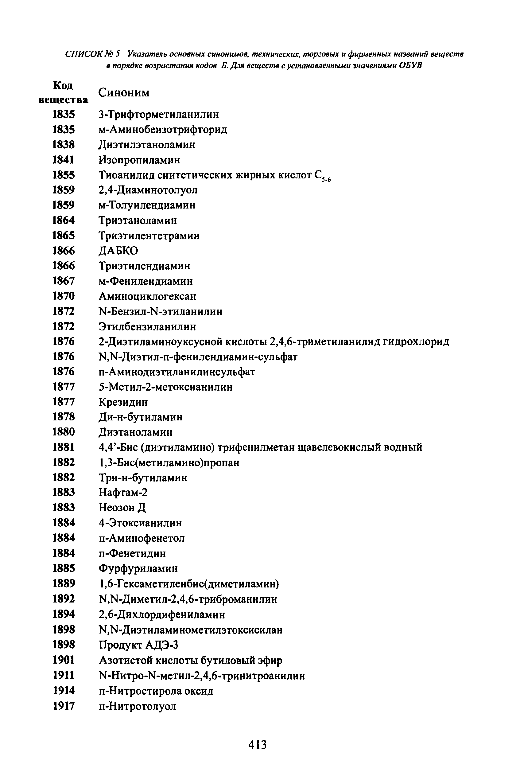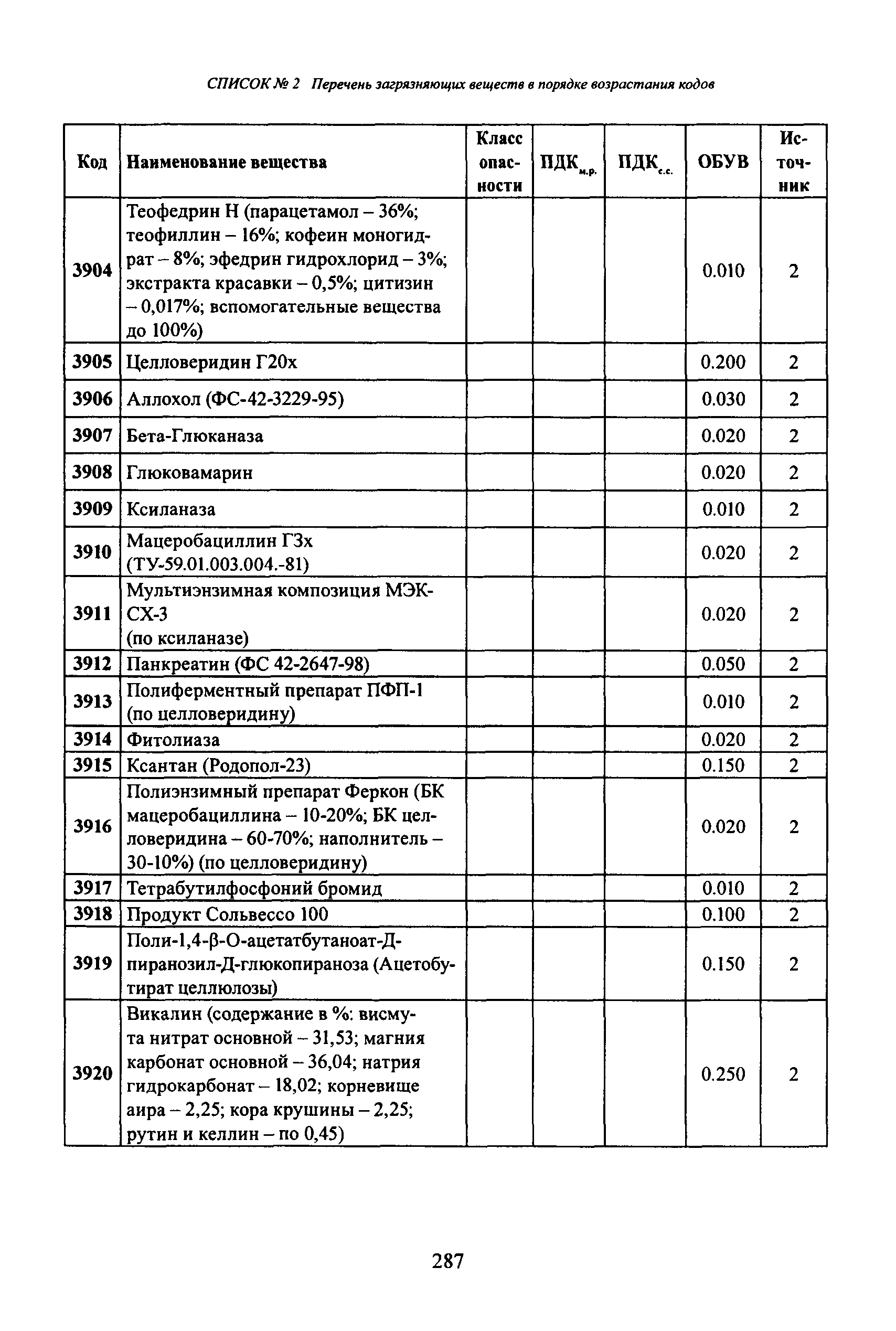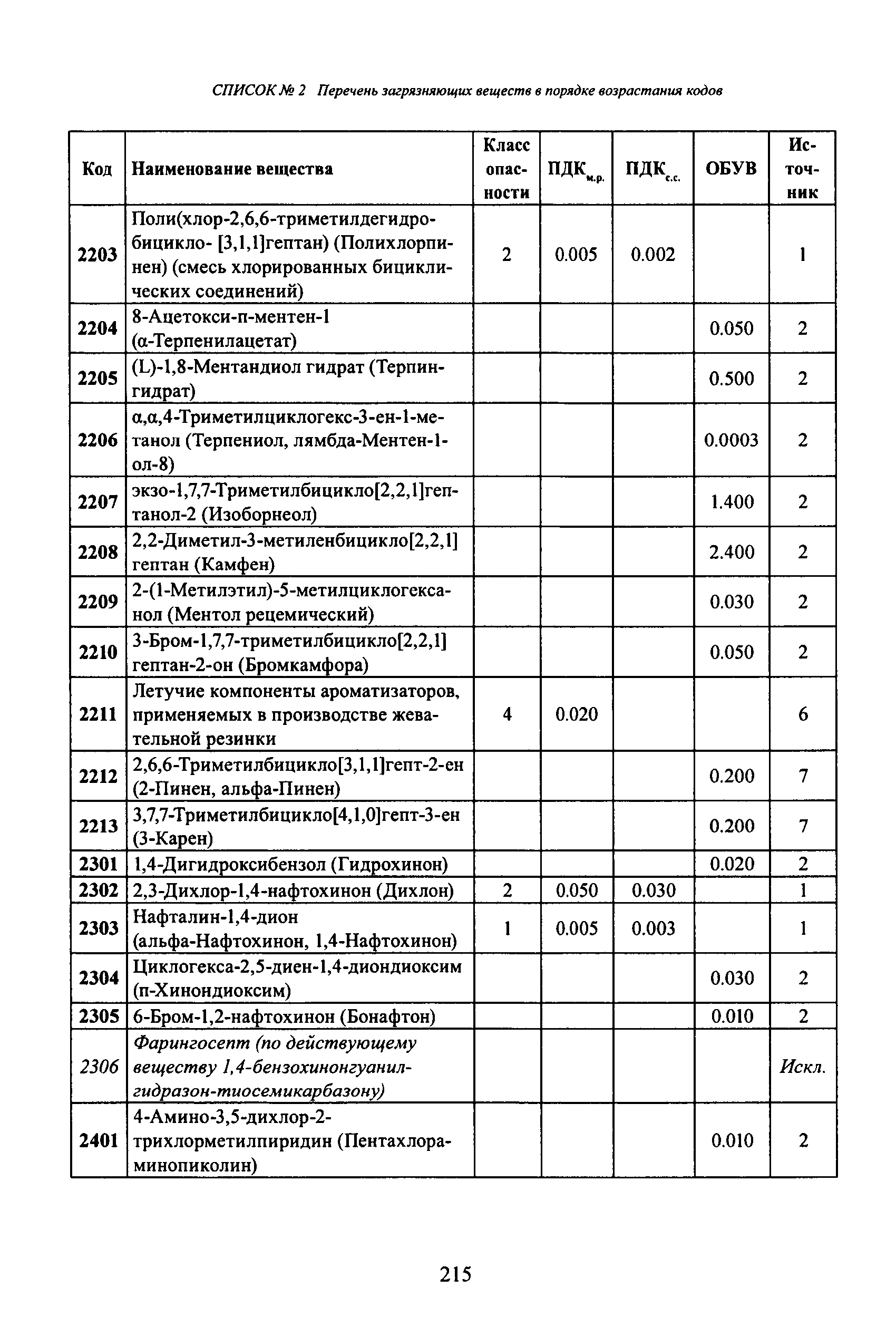 | Оглавление: | Введение Список № 1 Перечень загрязняющих веществ в алфавитном порядке Список № 2 Перечень загрязняющих веществ в порядке возрастания кодов Список № 3 Перечень ЛОС в порядке возрастания кодов Список № 4 Указатель основных синонимов, технических, торговых и фирменных названий веществ в алфавитном порядке А. Для веществ с установленными значениями ПДК Б. Для веществ с установленными значениями ОБУВ Список № 5 Указатель основных синонимов, технических, торговых и фирменных названий веществ в порядке возрастания кодов А. Для веществ с установленными значениями ПДК Б. Для веществ с установленными значениями ОБУВ |