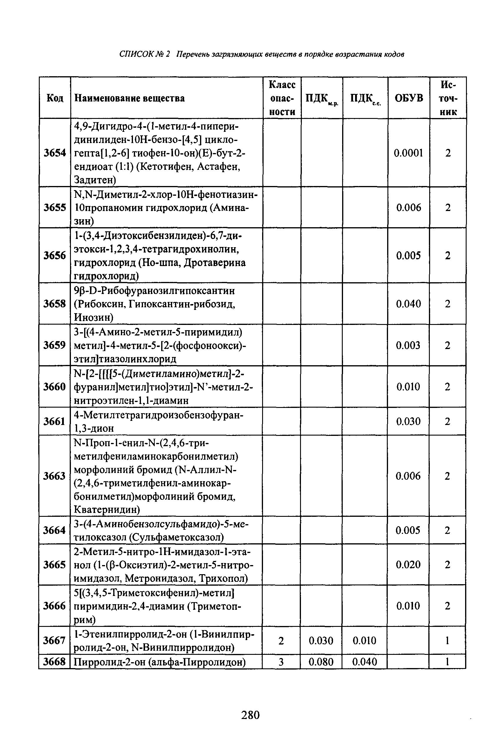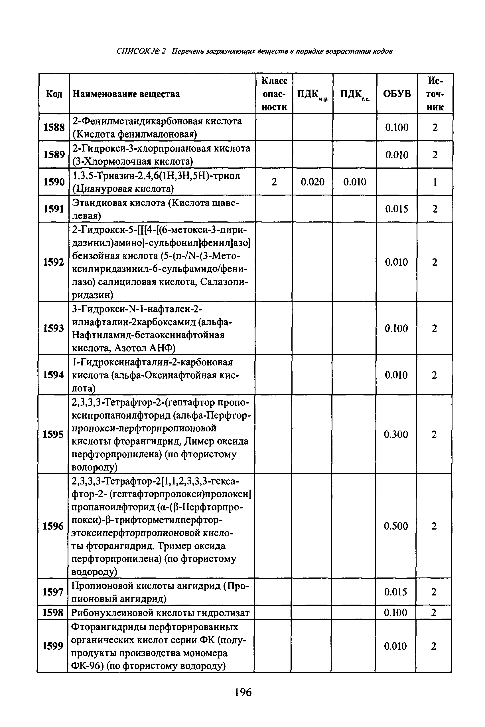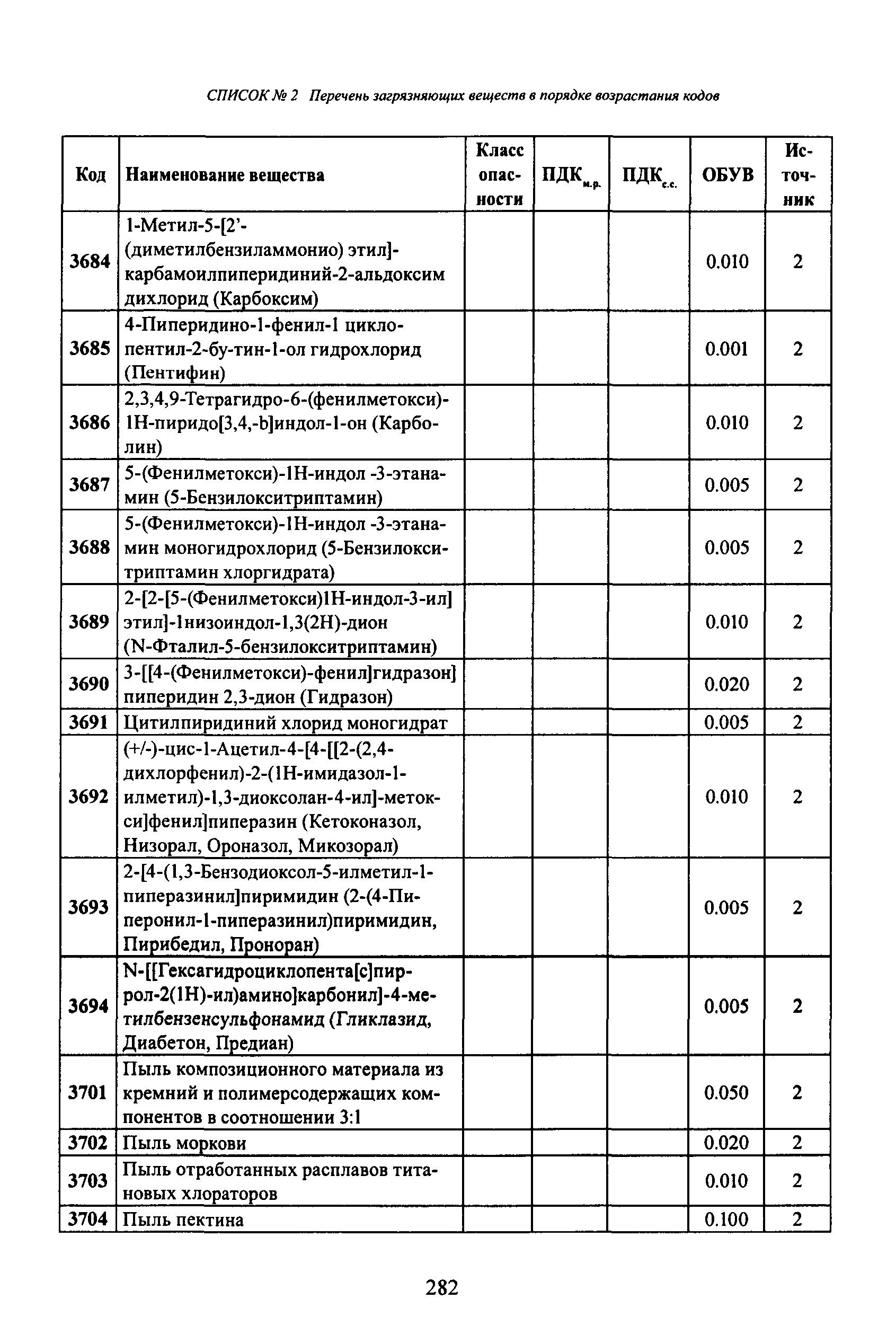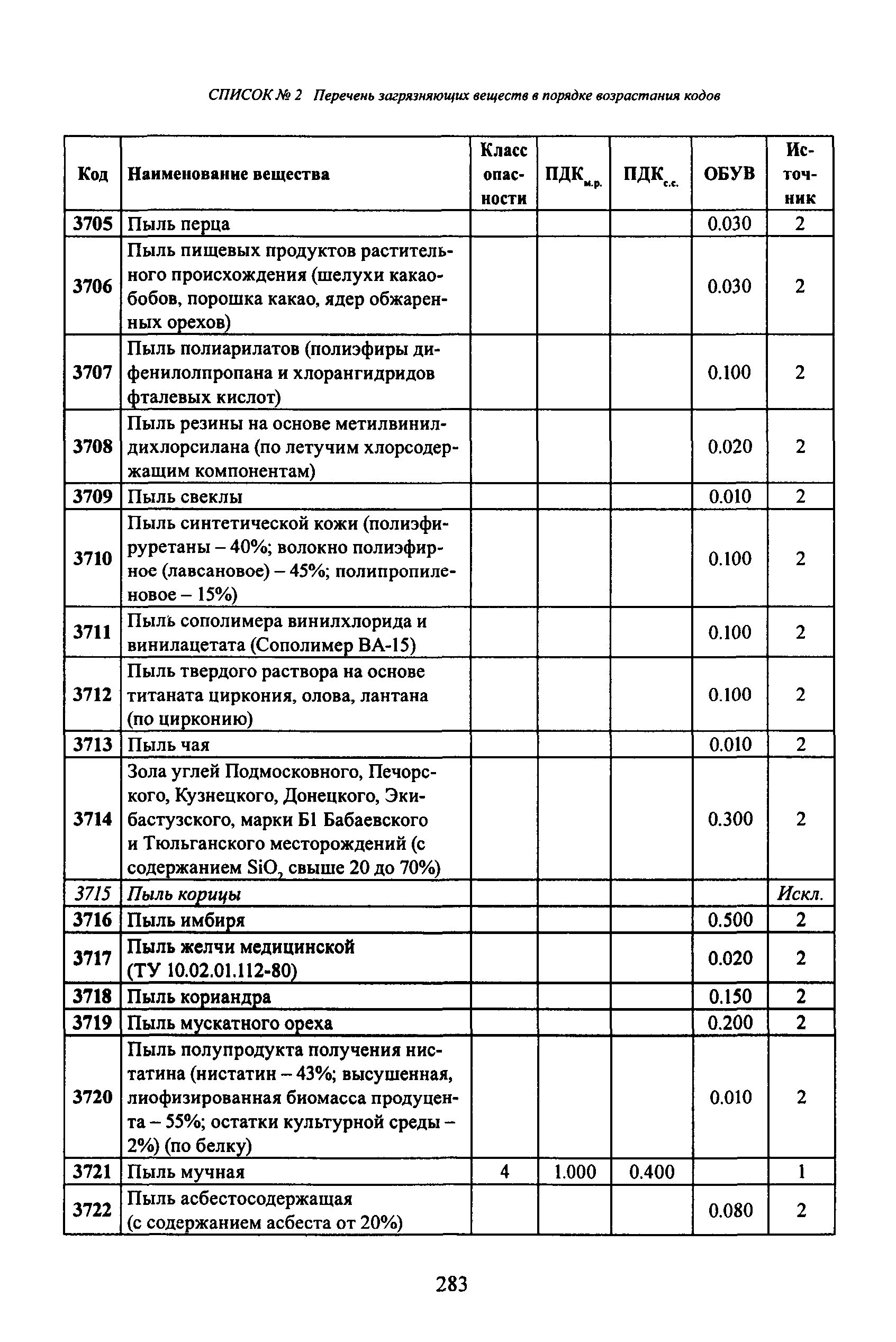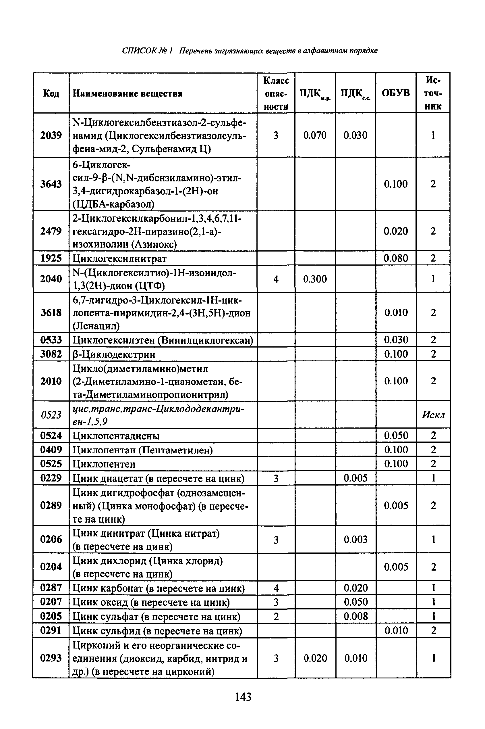 | Оглавление: | Введение Список № 1 Перечень загрязняющих веществ в алфавитном порядке Список № 2 Перечень загрязняющих веществ в порядке возрастания кодов Список № 3 Перечень ЛОС в порядке возрастания кодов Список № 4 Указатель основных синонимов, технических, торговых и фирменных названий веществ в алфавитном порядке А. Для веществ с установленными значениями ПДК Б. Для веществ с установленными значениями ОБУВ Список № 5 Указатель основных синонимов, технических, торговых и фирменных названий веществ в порядке возрастания кодов А. Для веществ с установленными значениями ПДК Б. Для веществ с установленными значениями ОБУВ |