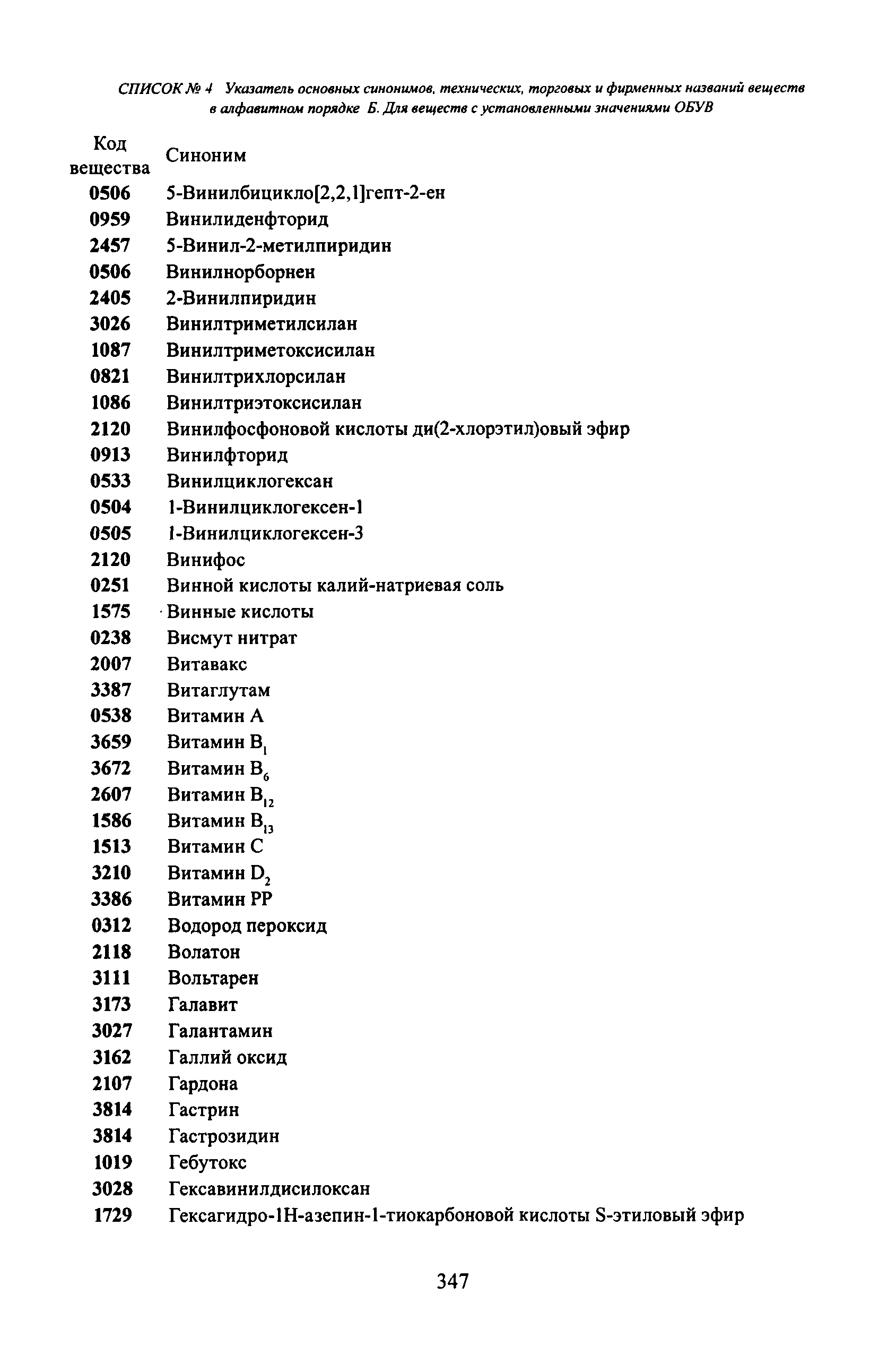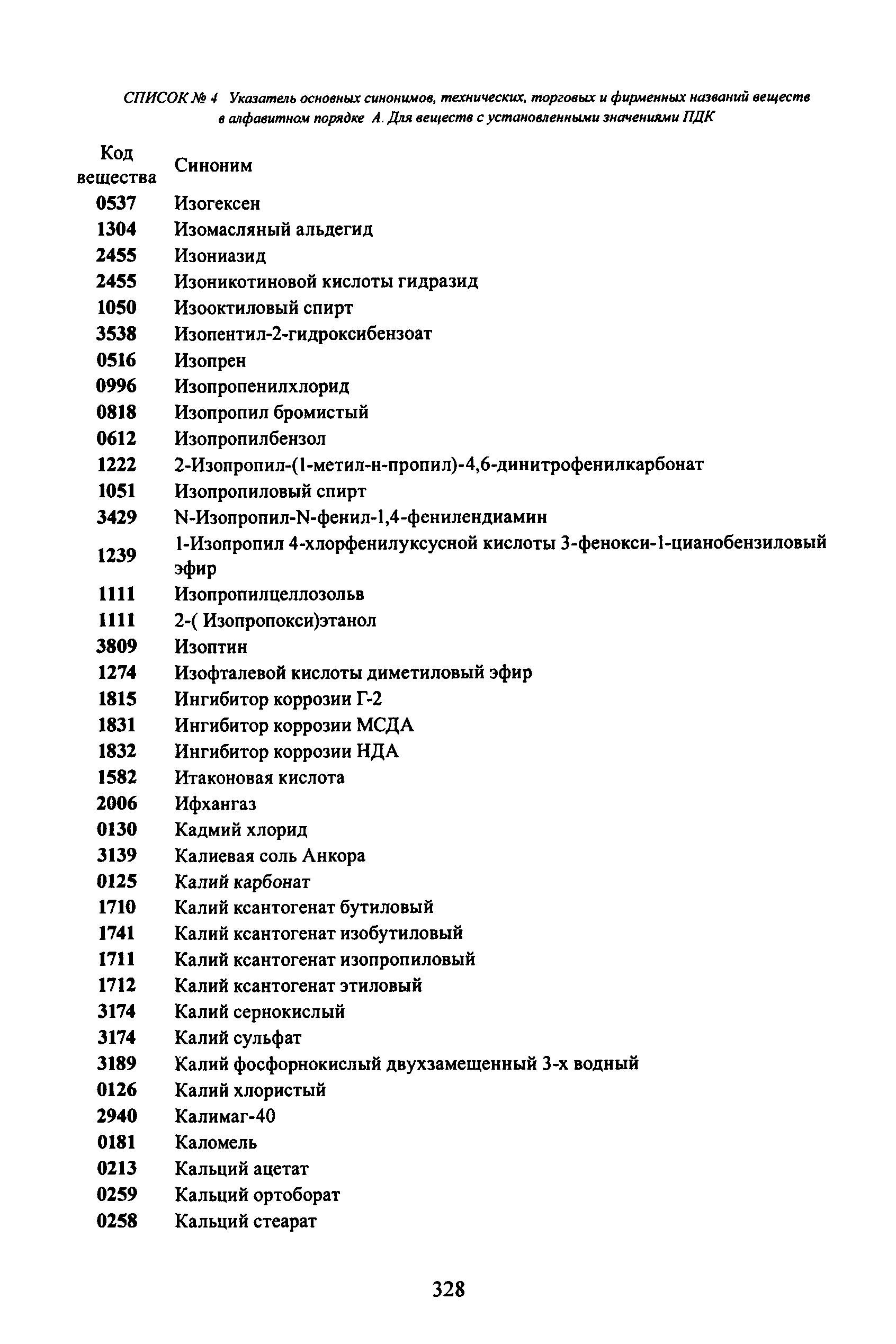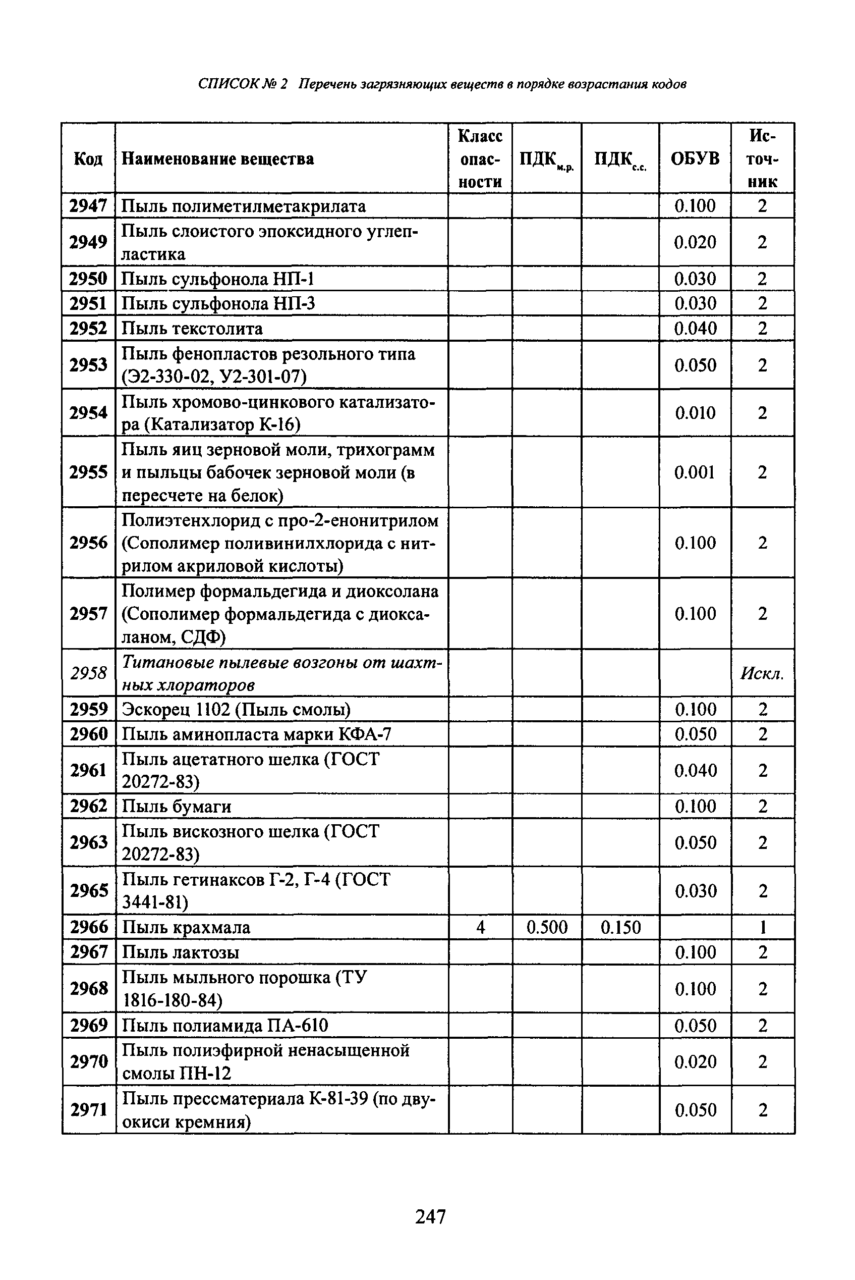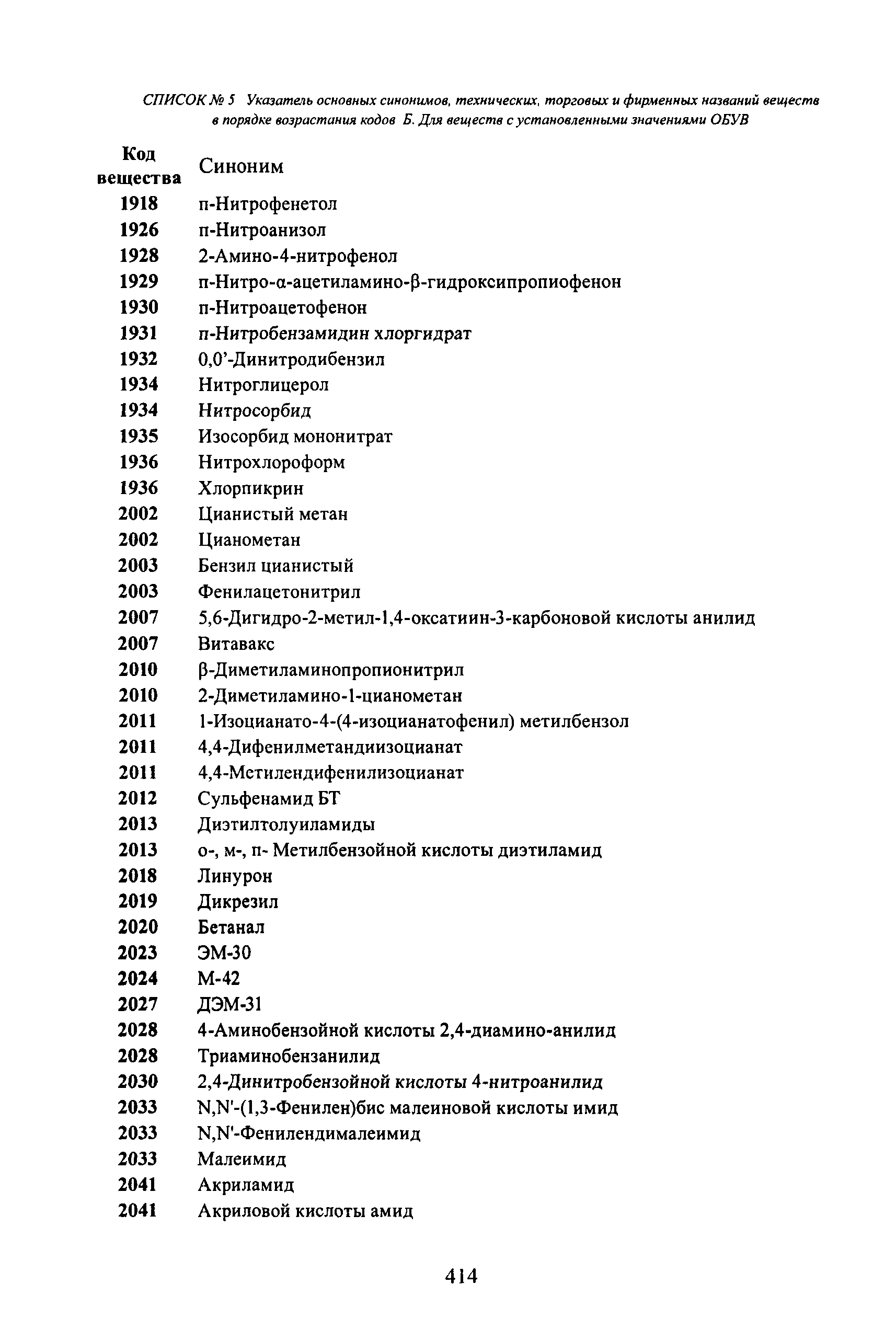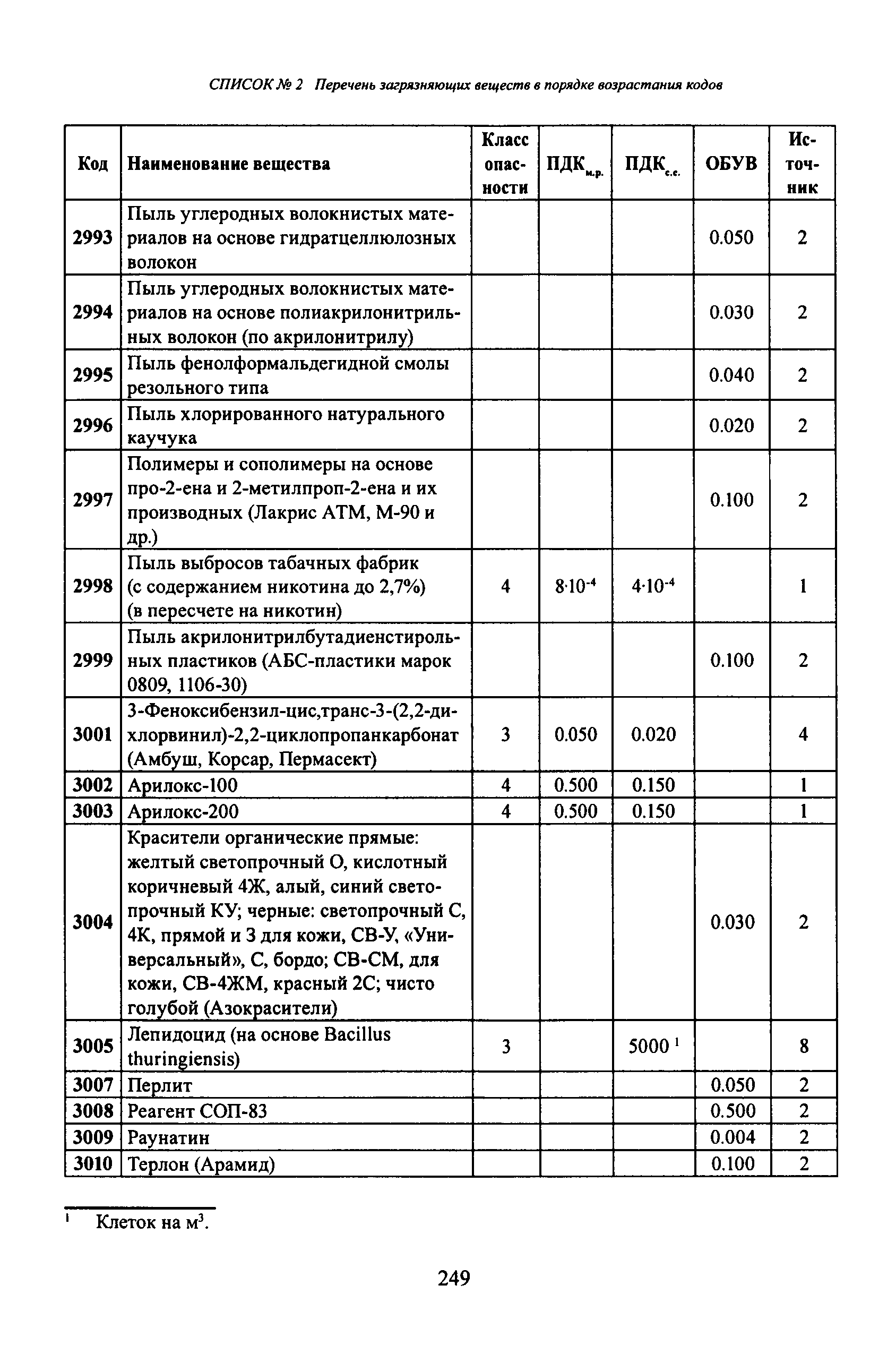 | Оглавление: | Введение Список № 1 Перечень загрязняющих веществ в алфавитном порядке Список № 2 Перечень загрязняющих веществ в порядке возрастания кодов Список № 3 Перечень ЛОС в порядке возрастания кодов Список № 4 Указатель основных синонимов, технических, торговых и фирменных названий веществ в алфавитном порядке А. Для веществ с установленными значениями ПДК Б. Для веществ с установленными значениями ОБУВ Список № 5 Указатель основных синонимов, технических, торговых и фирменных названий веществ в порядке возрастания кодов А. Для веществ с установленными значениями ПДК Б. Для веществ с установленными значениями ОБУВ |
