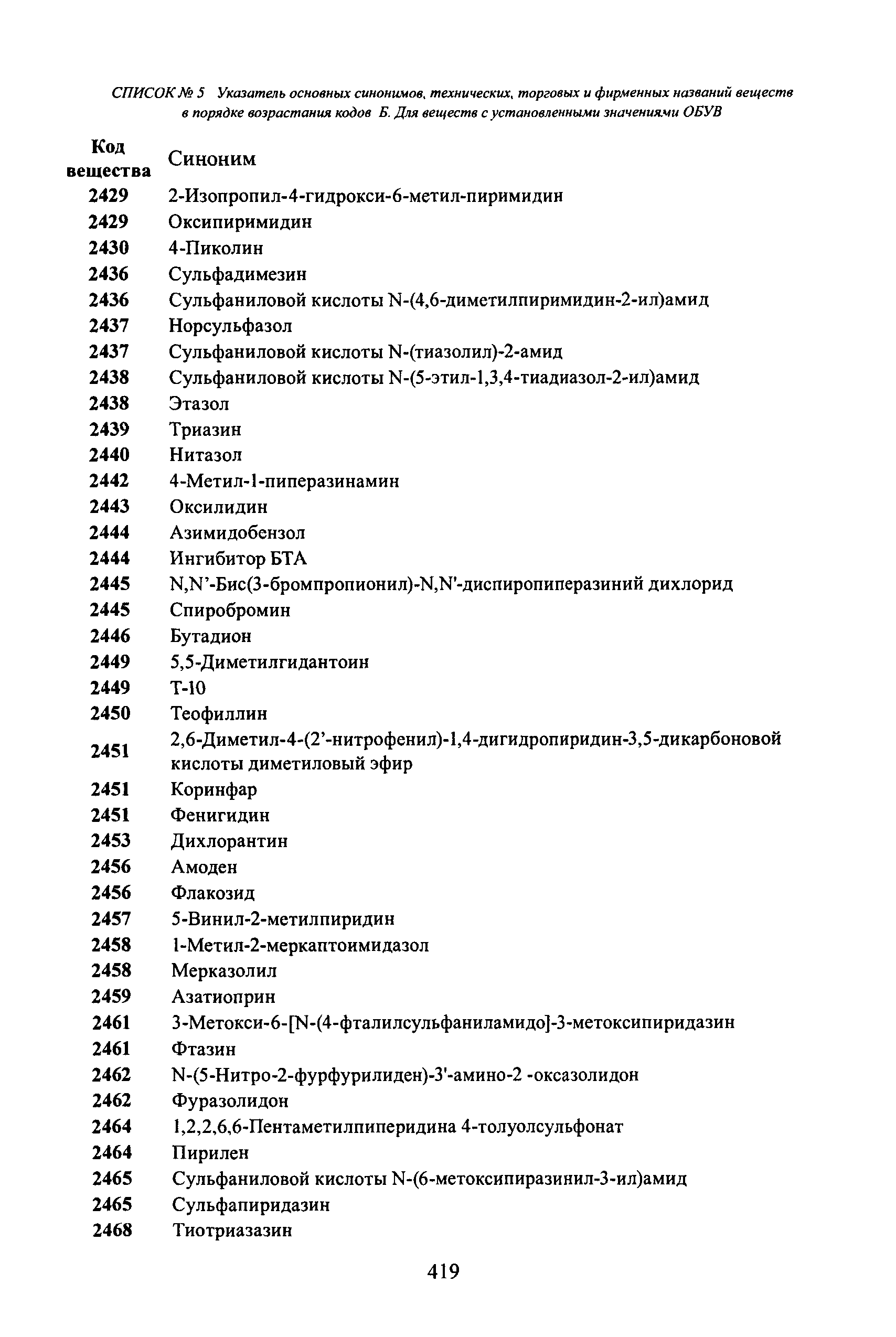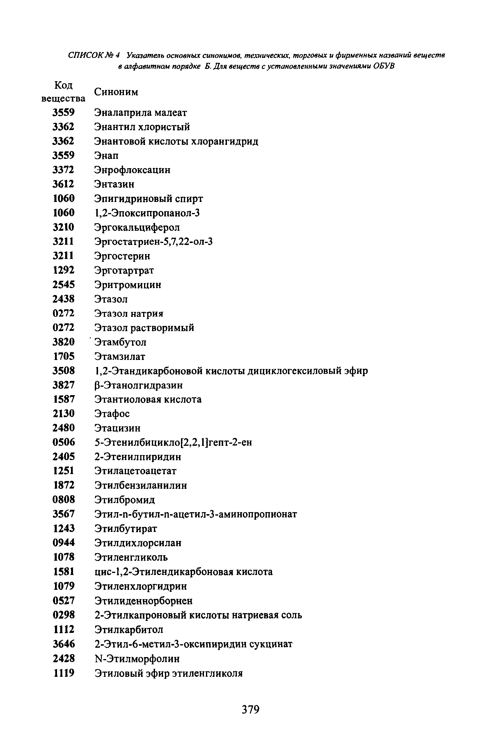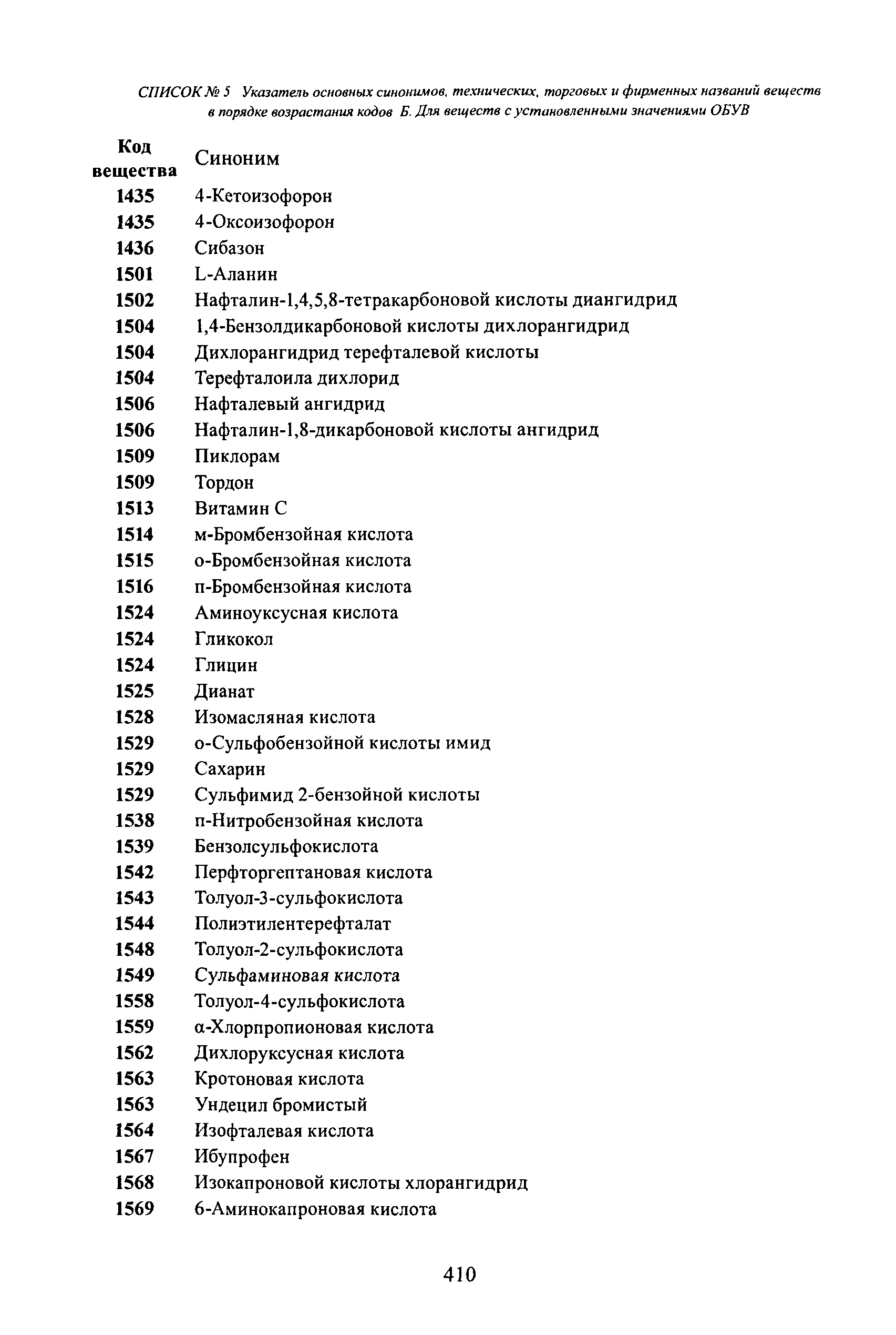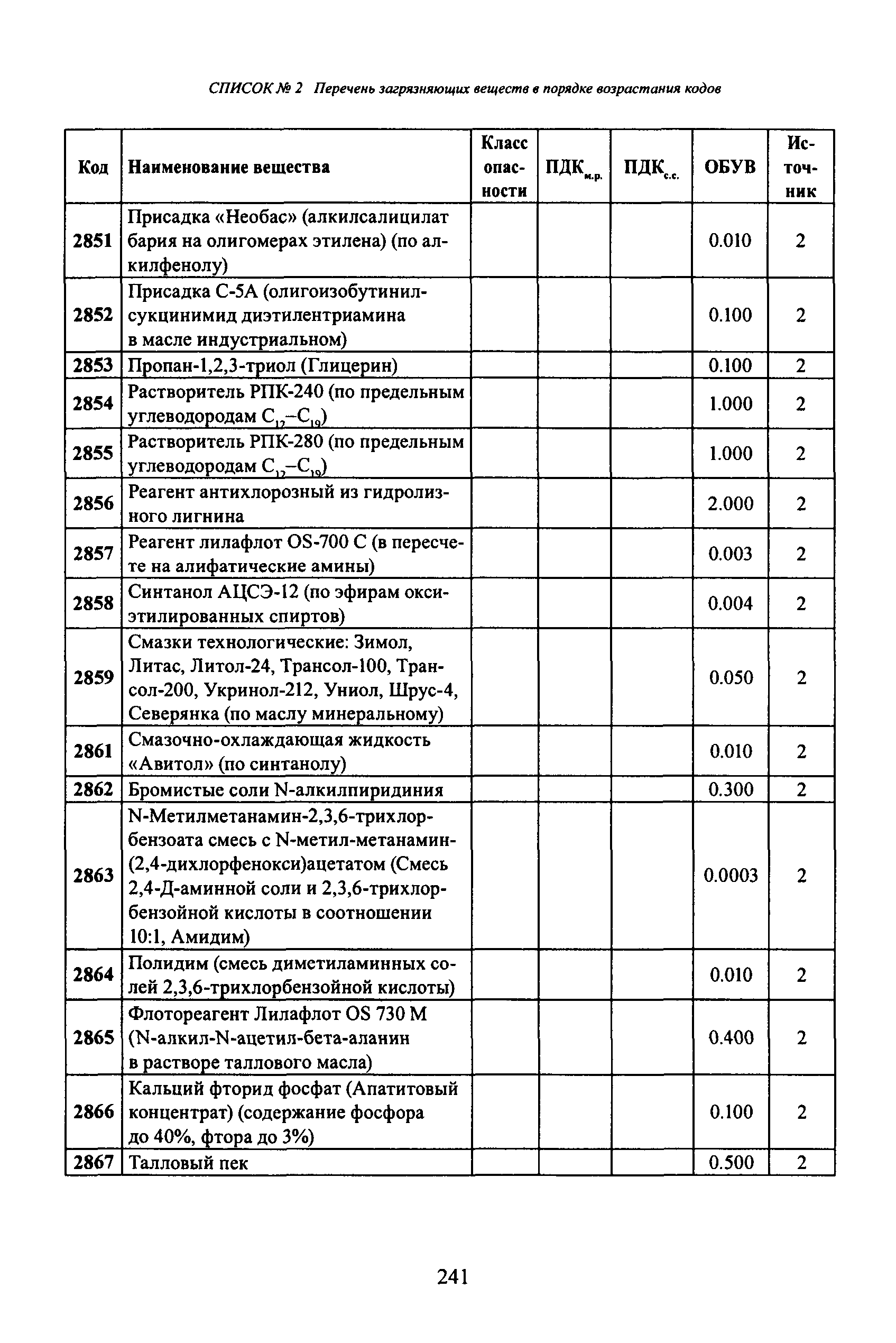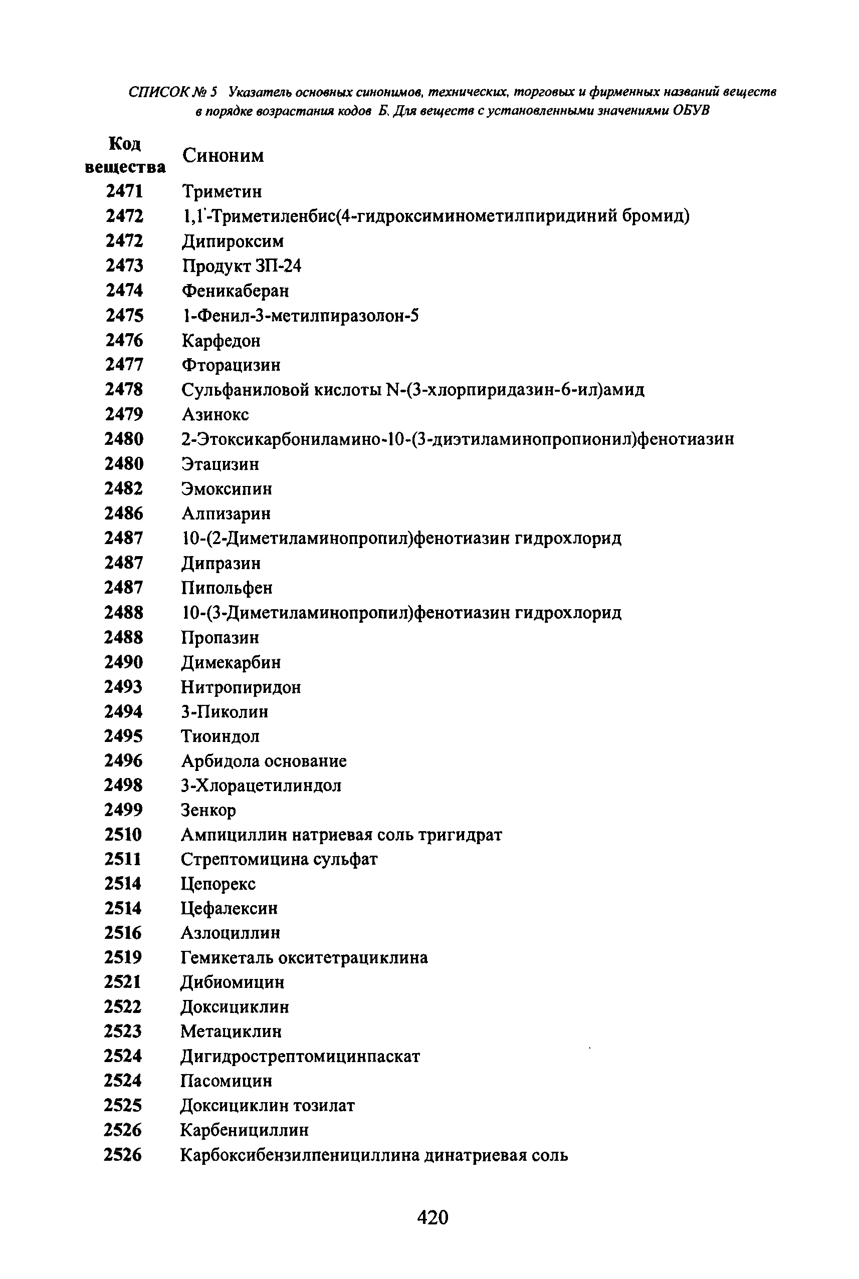 | Оглавление: | Введение Список № 1 Перечень загрязняющих веществ в алфавитном порядке Список № 2 Перечень загрязняющих веществ в порядке возрастания кодов Список № 3 Перечень ЛОС в порядке возрастания кодов Список № 4 Указатель основных синонимов, технических, торговых и фирменных названий веществ в алфавитном порядке А. Для веществ с установленными значениями ПДК Б. Для веществ с установленными значениями ОБУВ Список № 5 Указатель основных синонимов, технических, торговых и фирменных названий веществ в порядке возрастания кодов А. Для веществ с установленными значениями ПДК Б. Для веществ с установленными значениями ОБУВ |