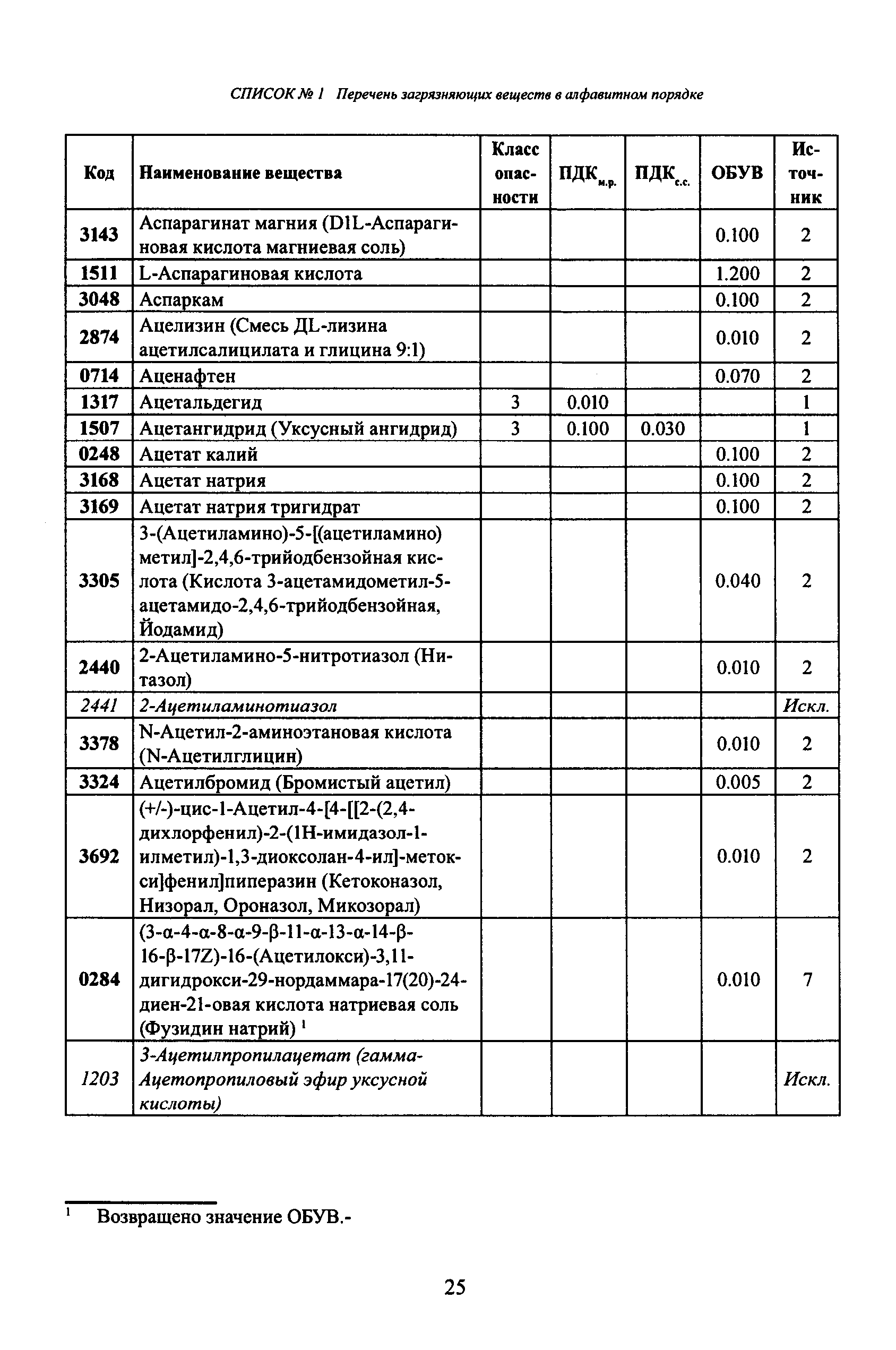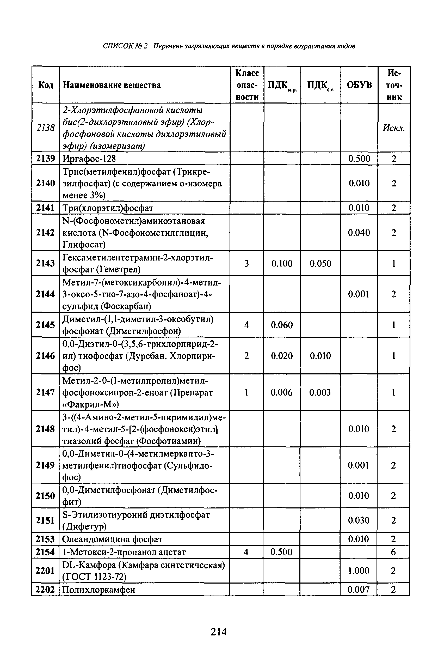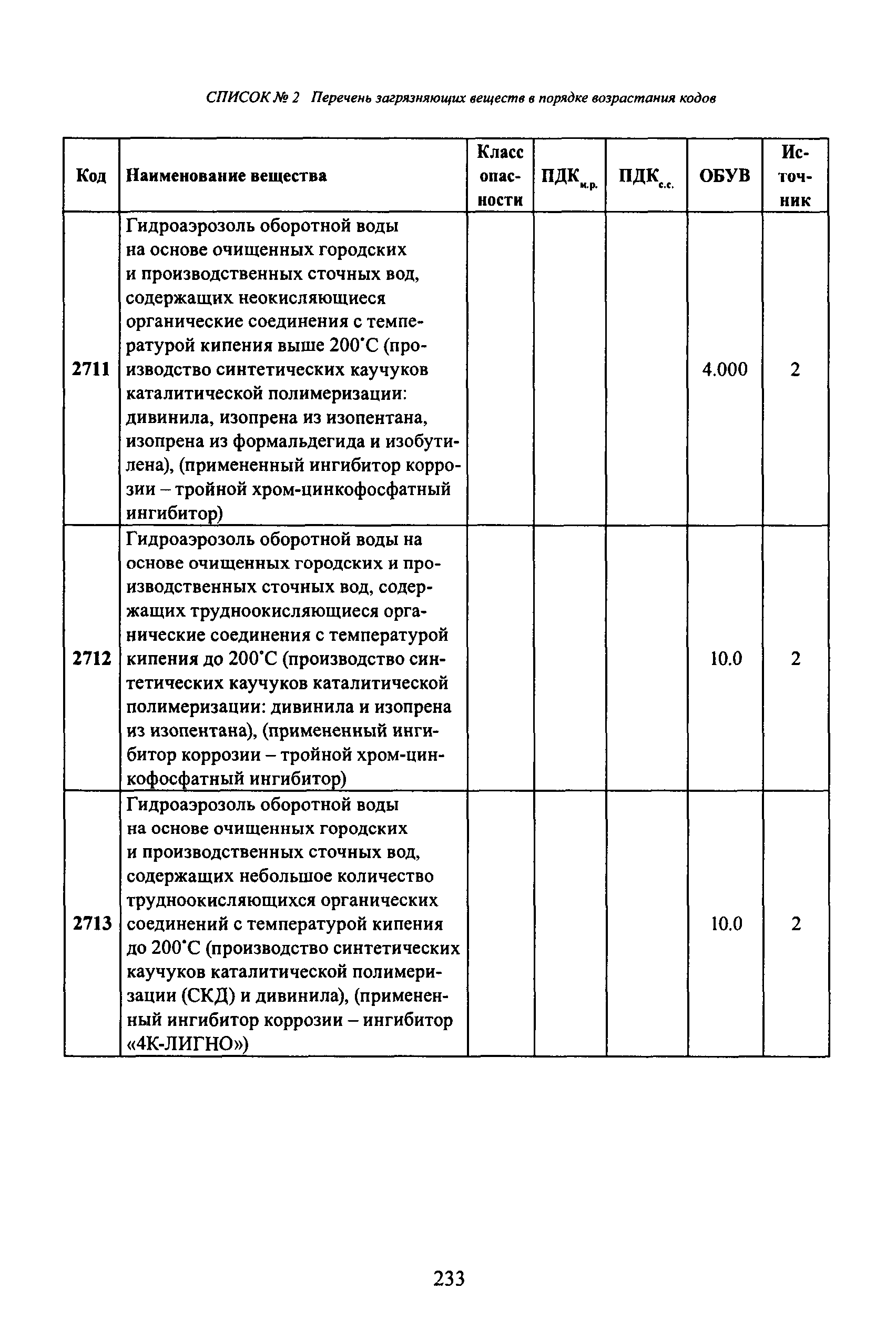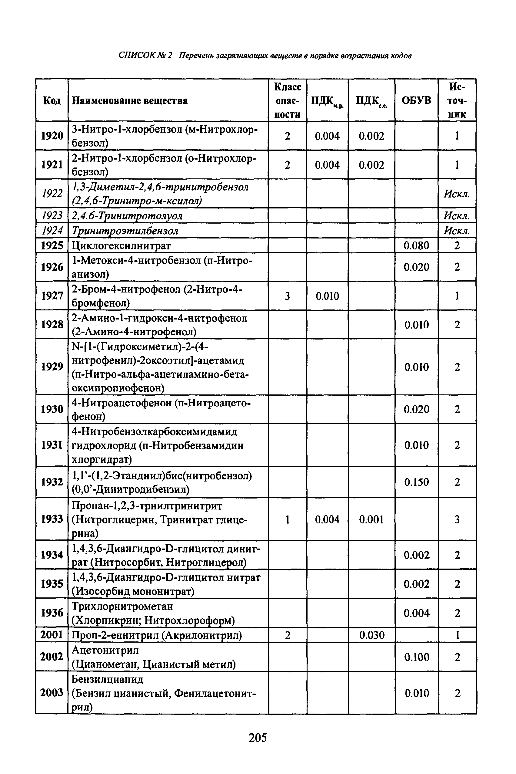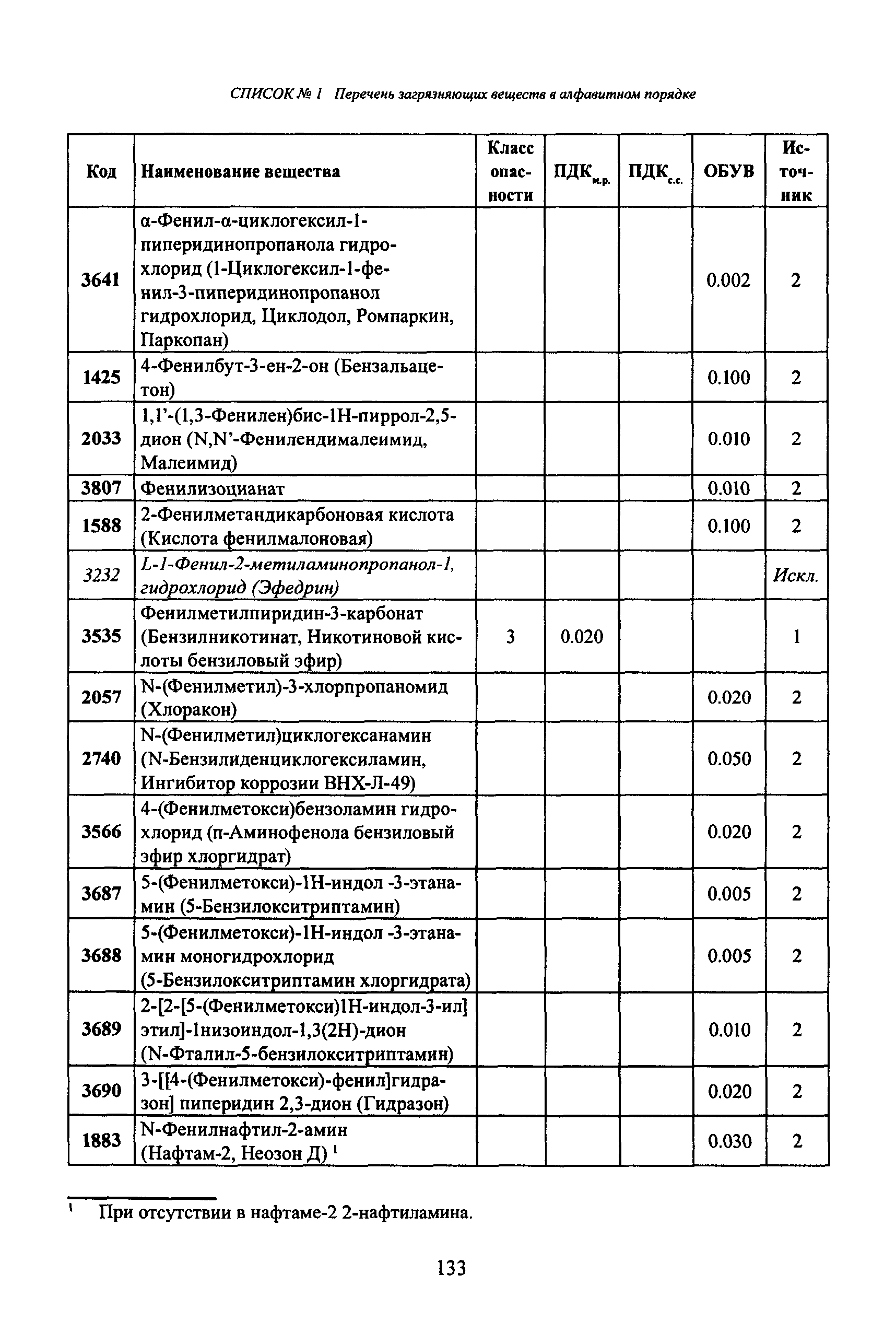 | Оглавление: | Введение Список № 1 Перечень загрязняющих веществ в алфавитном порядке Список № 2 Перечень загрязняющих веществ в порядке возрастания кодов Список № 3 Перечень ЛОС в порядке возрастания кодов Список № 4 Указатель основных синонимов, технических, торговых и фирменных названий веществ в алфавитном порядке А. Для веществ с установленными значениями ПДК Б. Для веществ с установленными значениями ОБУВ Список № 5 Указатель основных синонимов, технических, торговых и фирменных названий веществ в порядке возрастания кодов А. Для веществ с установленными значениями ПДК Б. Для веществ с установленными значениями ОБУВ |