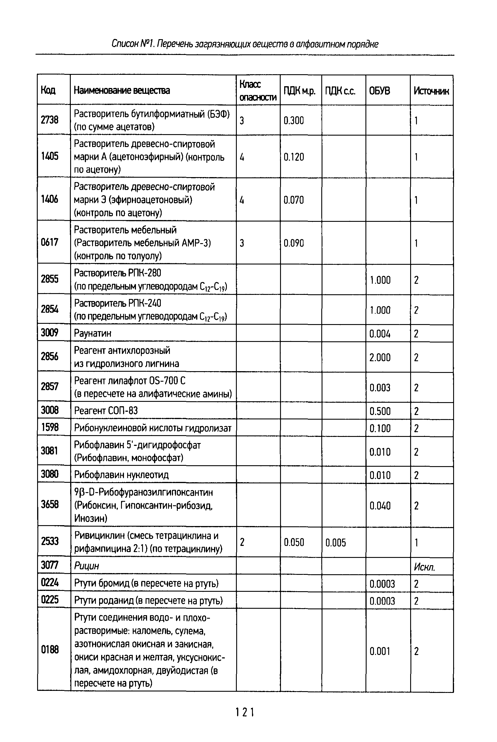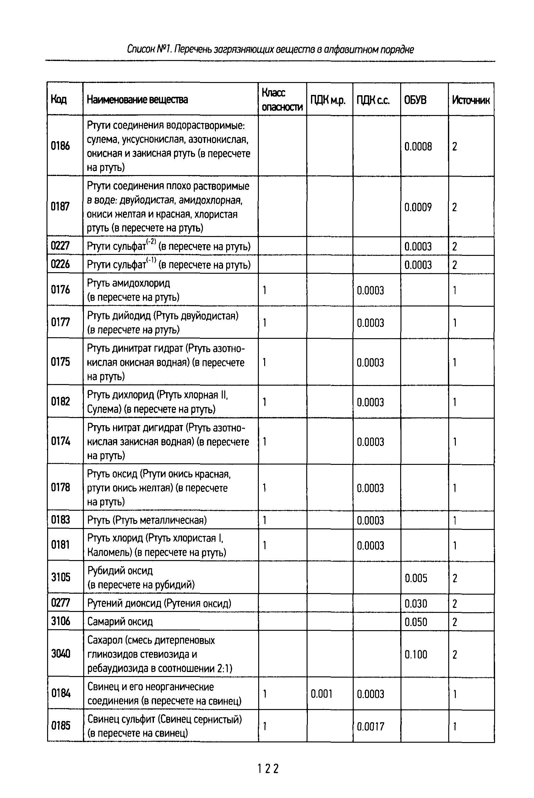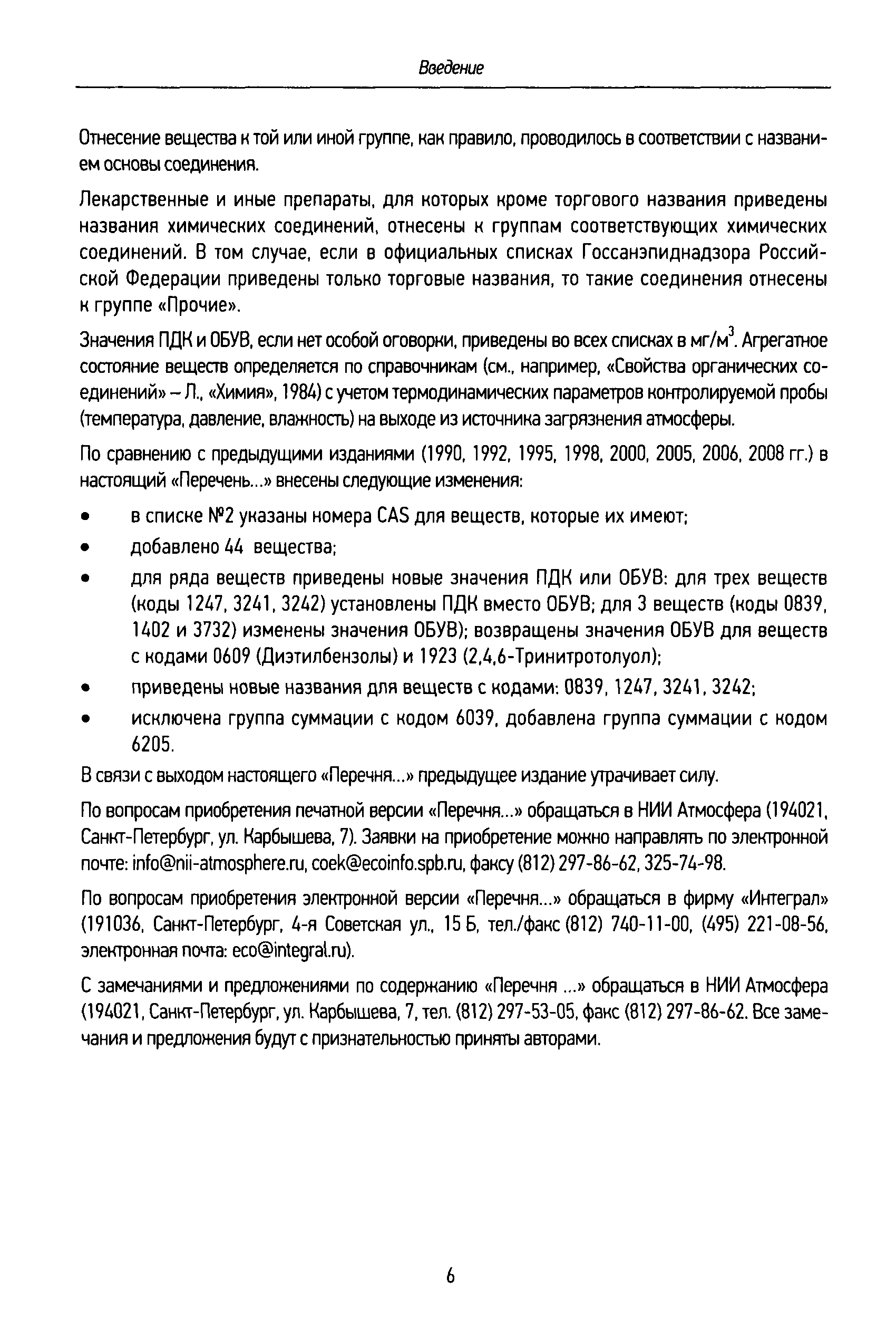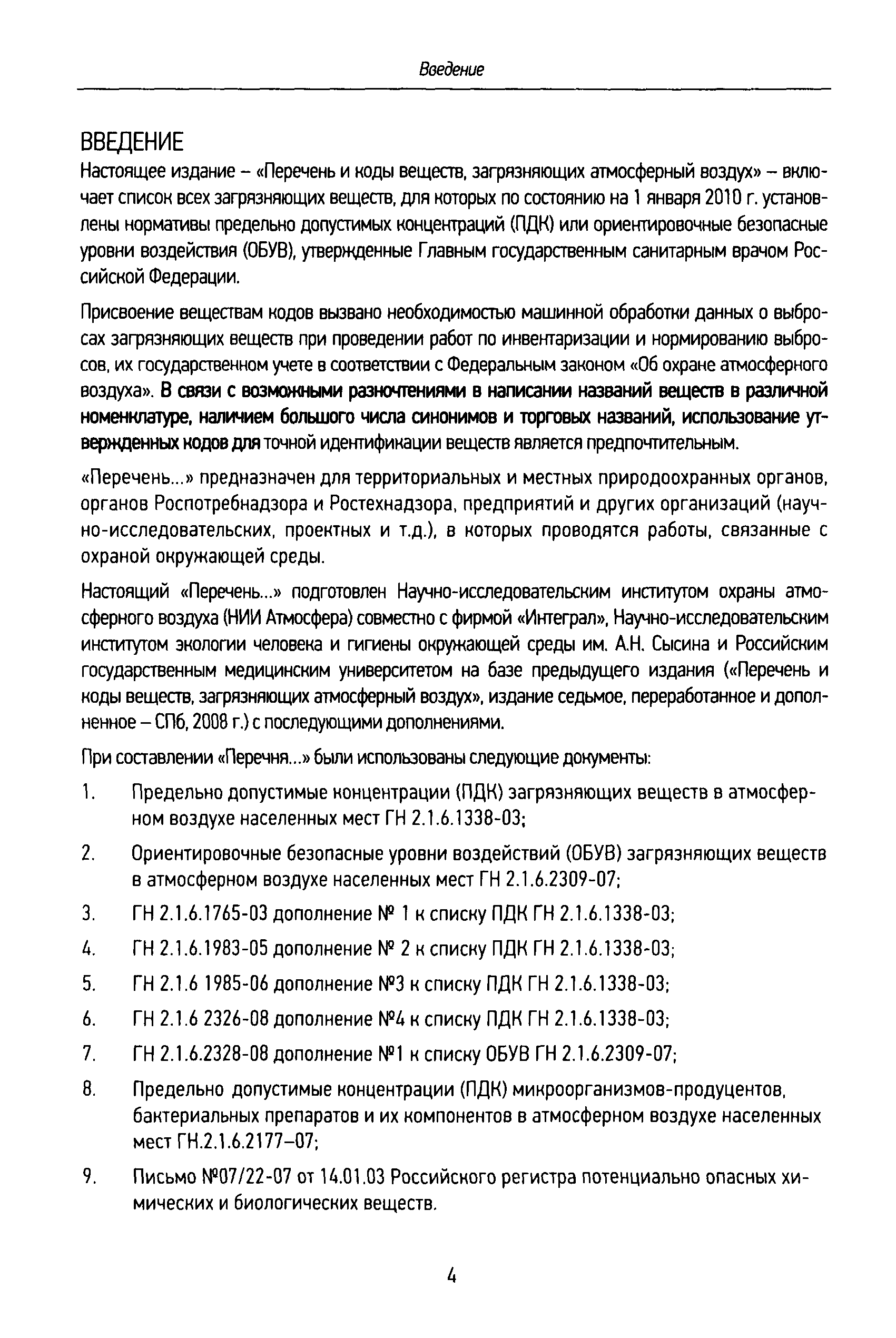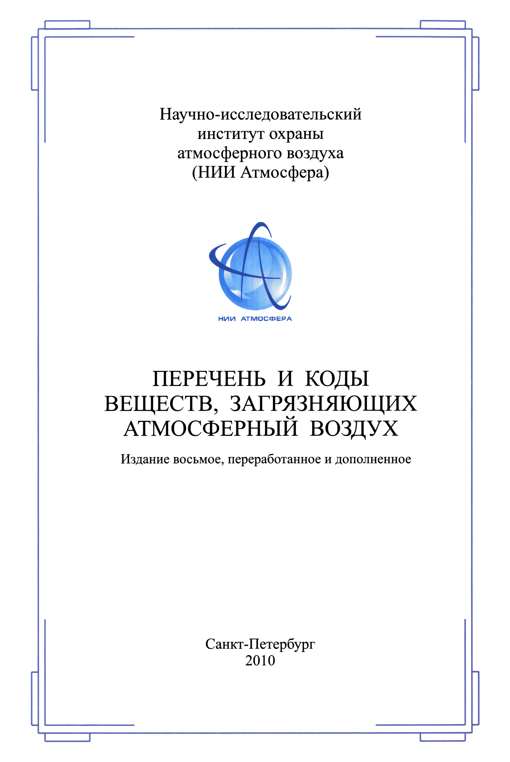 Перечень и коды веществ, загрязняющих атмосферный воздух (8 издание)| Статус: | заменен | | Название рус.: | Перечень и коды веществ, загрязняющих атмосферный воздух (8 издание) | | Дата добавления в базу: | 01.09.2013 | | Дата актуализации: | 01.01.2021 | | Область применения: | Перечень предназначен для территориальных и местных природоохранных органов, органов Роспотребнадзора и Ростехнадзора, предприятий и других организаций, в которых проводятся работы, связанные с охраной окружающей среды | | Оглавление: | 1. Введение 2. Список №1. Перечень загрязняющих веществ в алфавитном порядке 3. Список №2. Перечень загрязняющих веществ в порядке возрастания кодов 4. Список №3. Перечень ЛОС в порядке возрастания кодов 5. Список №4 Указатель основных синонимов, технических, торговых и фирменных названий веществ в алфавитном порядке A. Для веществ с установленными значениями ПДК B. Для веществ с установленными значениями ОБУВ 6. Список №5. Указатель основных синонимов, технических, торговых и фирменных названий веществ в порядке возрастания кодов A. Для веществ с установленными значениями ПДК B. Для веществ с установленными значениями ОБУВ | | Разработан: | НИИ Атмосфера Фирма Интеграл Научно-исследовательский институт экологии человека и окружающей среды им. А.И. Сысина