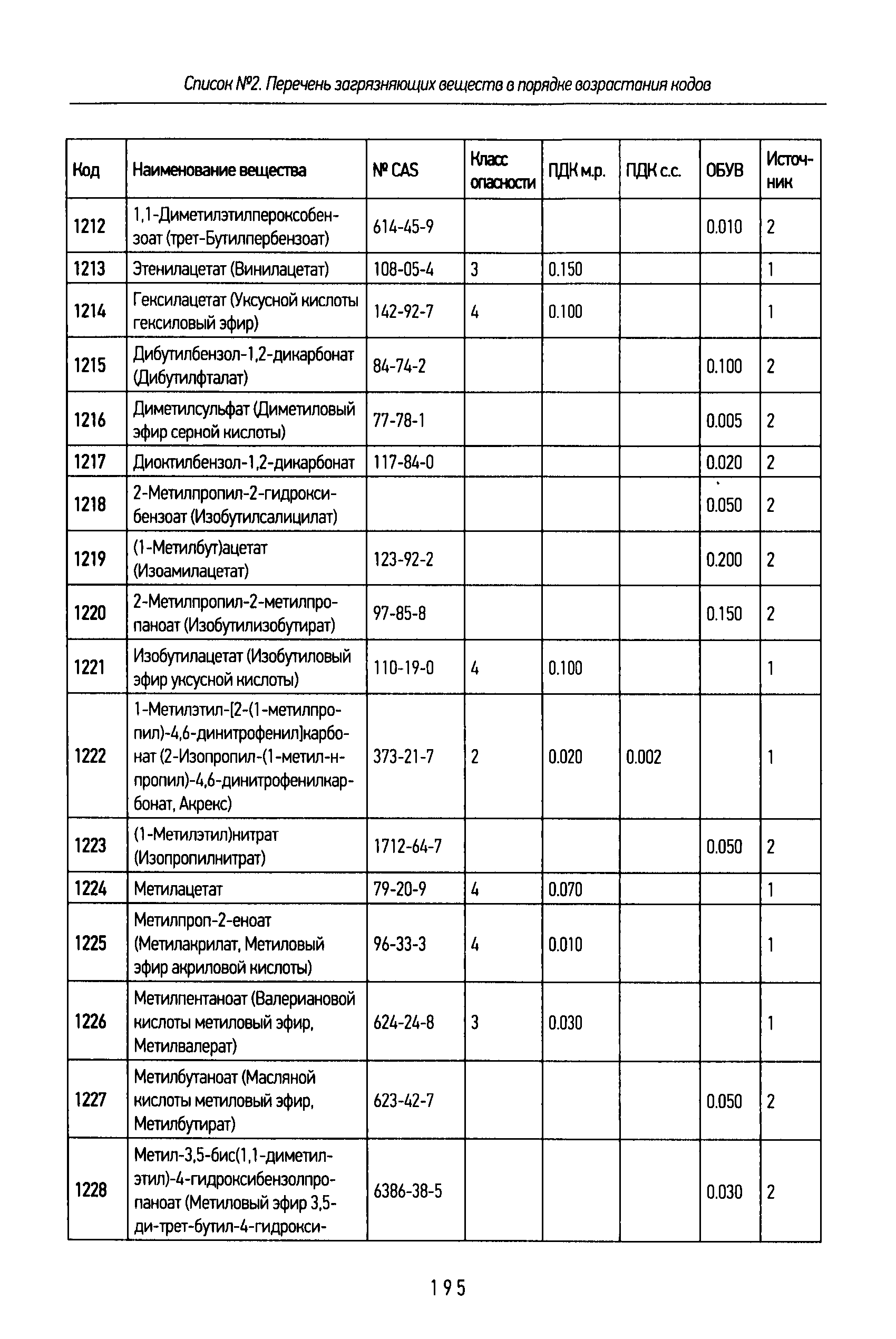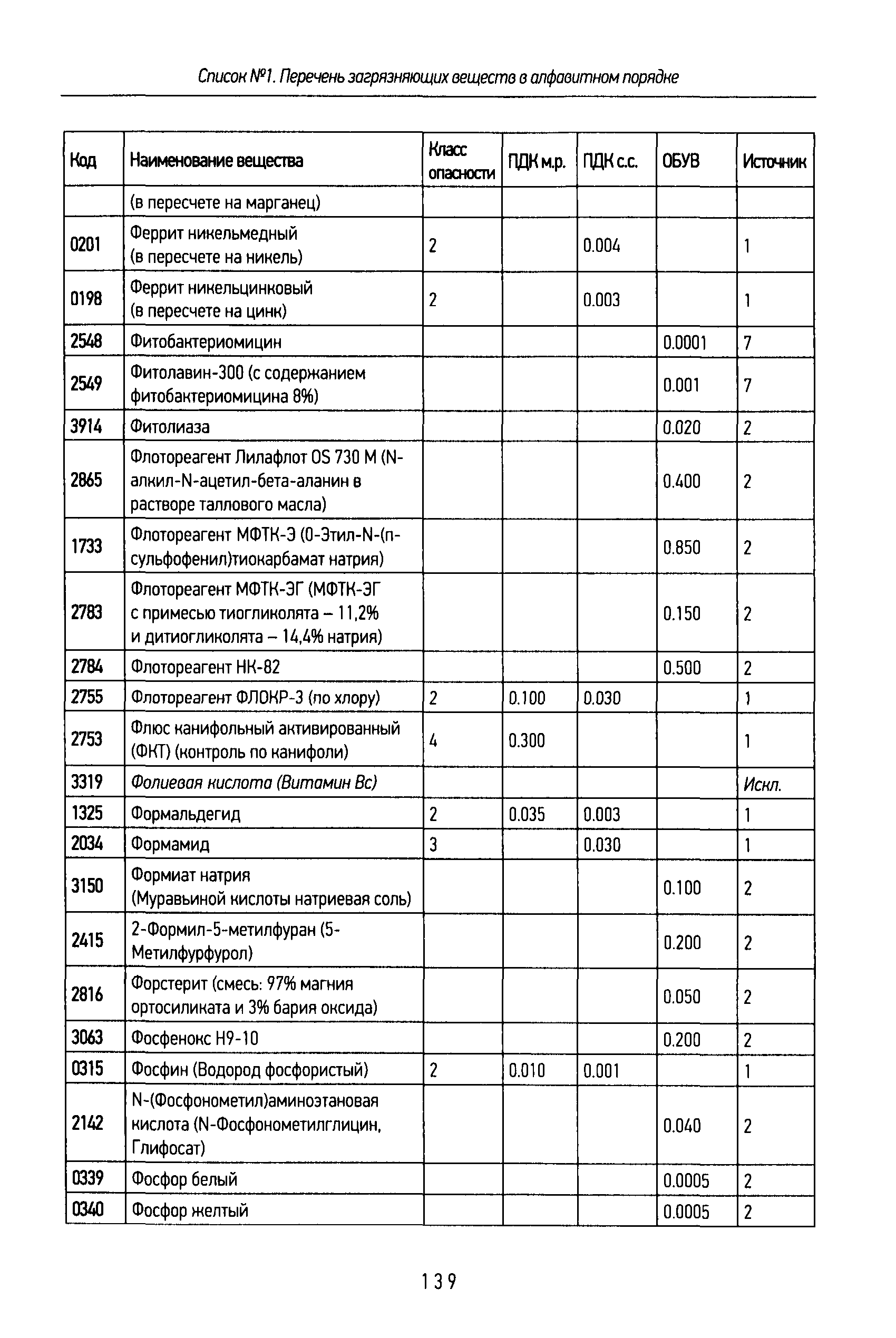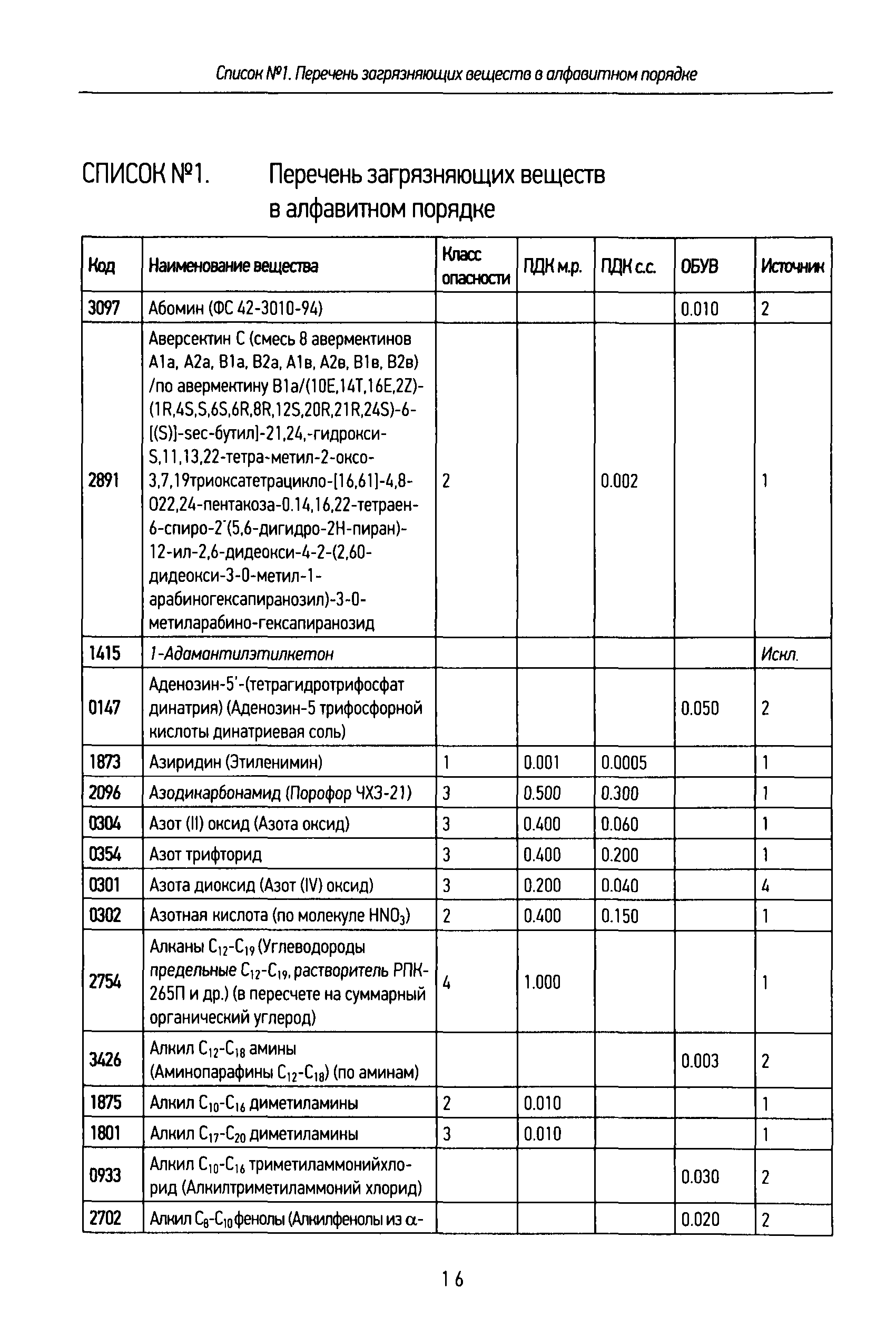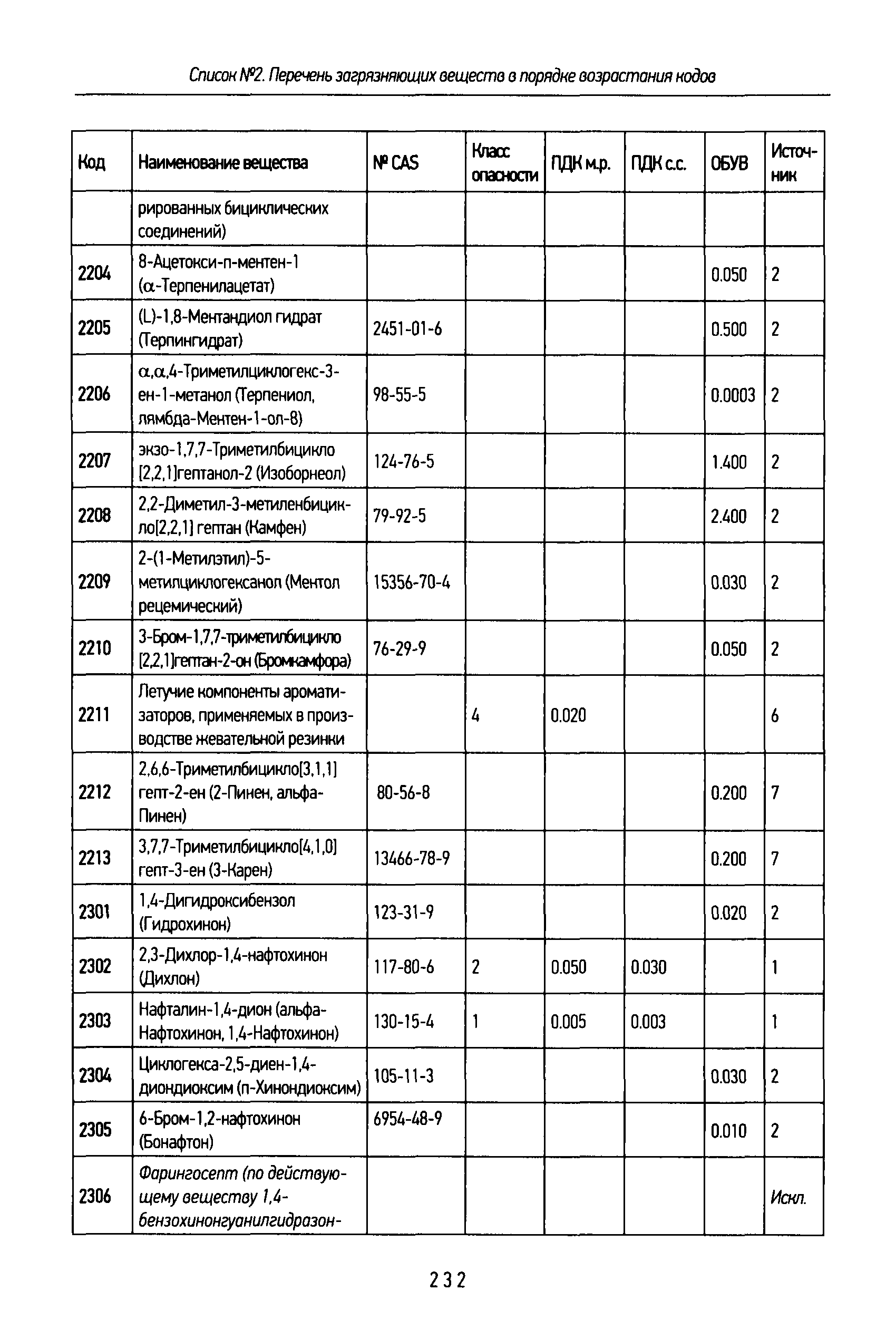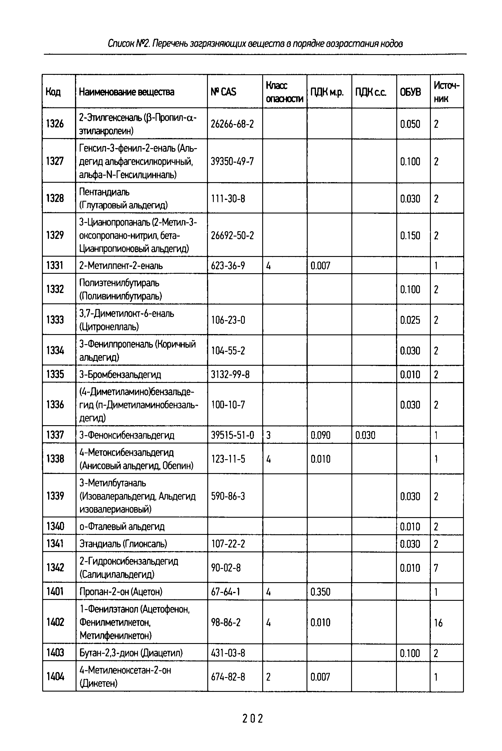Перечень и коды веществ, загрязняющих атмосферный воздух (8 издание)| Статус: | заменен | | Название рус.: | Перечень и коды веществ, загрязняющих атмосферный воздух (8 издание) | | Дата добавления в базу: | 01.09.2013 | | Дата актуализации: | 01.01.2021 | | Область применения: | Перечень предназначен для территориальных и местных природоохранных органов, органов Роспотребнадзора и Ростехнадзора, предприятий и других организаций, в которых проводятся работы, связанные с охраной окружающей среды | | Оглавление: | 1. Введение 2. Список №1. Перечень загрязняющих веществ в алфавитном порядке 3. Список №2. Перечень загрязняющих веществ в порядке возрастания кодов 4. Список №3. Перечень ЛОС в порядке возрастания кодов 5. Список №4 Указатель основных синонимов, технических, торговых и фирменных названий веществ в алфавитном порядке A. Для веществ с установленными значениями ПДК B. Для веществ с установленными значениями ОБУВ 6. Список №5. Указатель основных синонимов, технических, торговых и фирменных названий веществ в порядке возрастания кодов A. Для веществ с установленными значениями ПДК B. Для веществ с установленными значениями ОБУВ | | Разработан: | НИИ Атмосфера Фирма Интеграл Научно-исследовательский институт экологии человека и окружающей среды им. А.И. Сысина