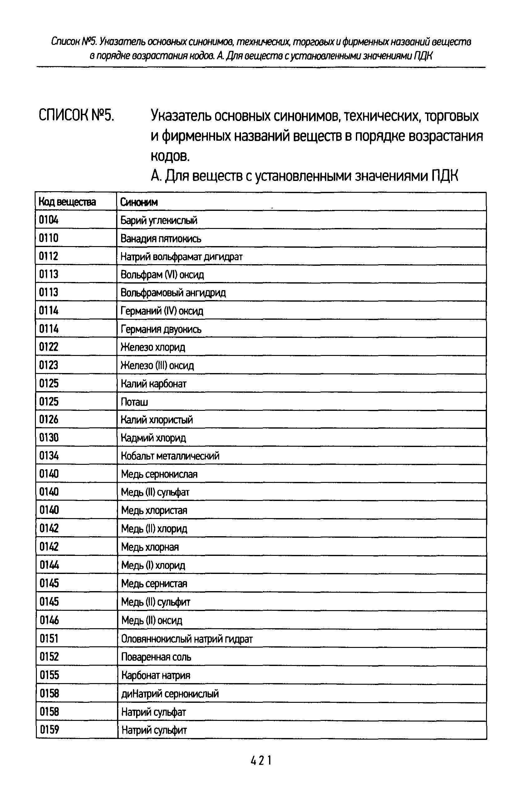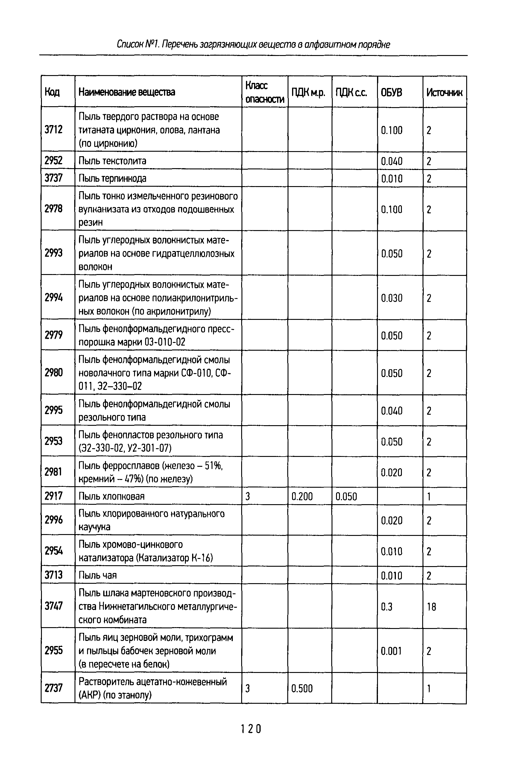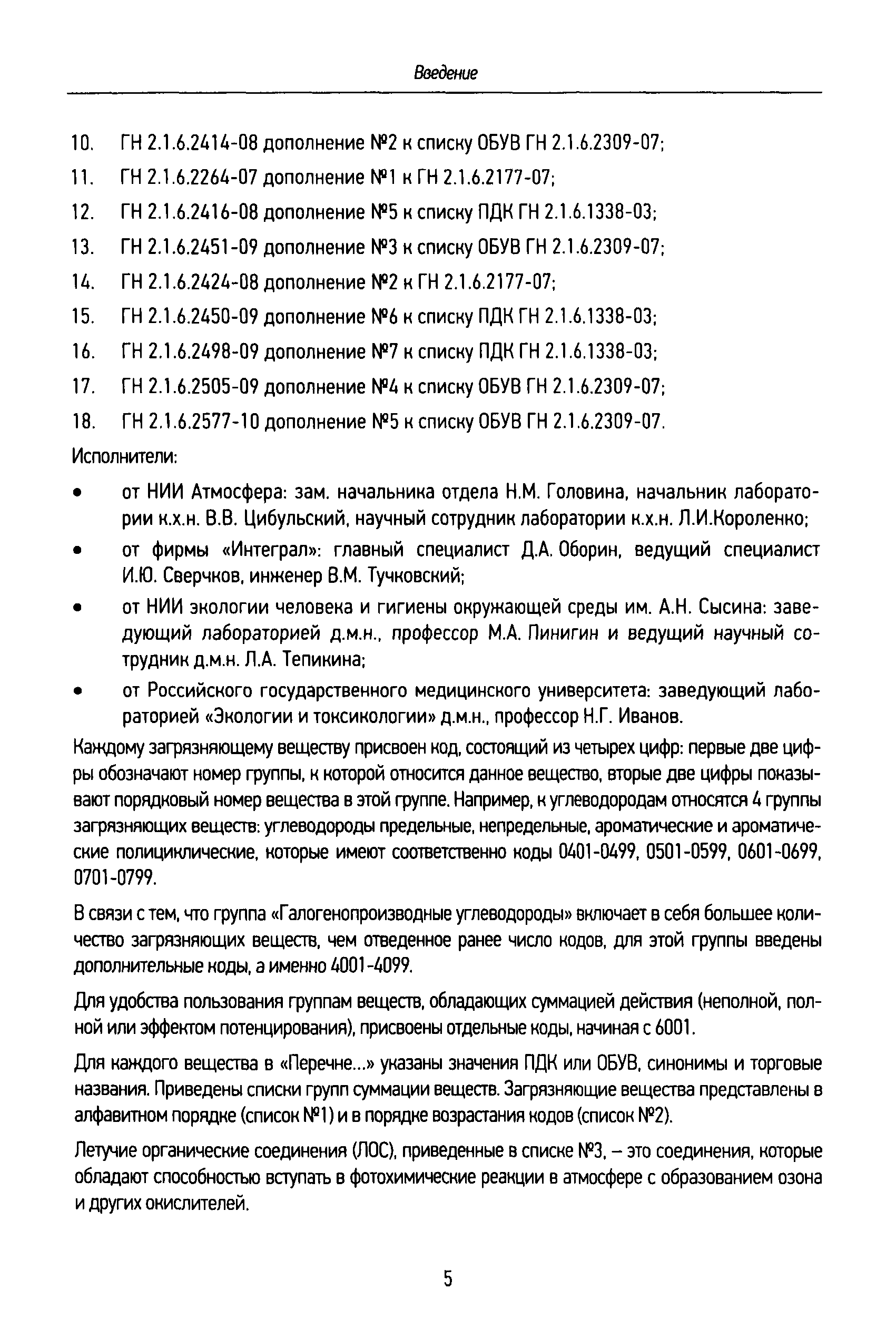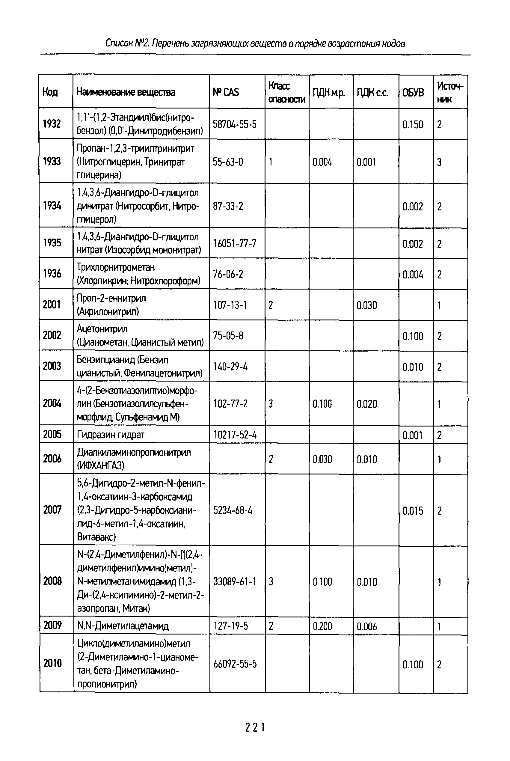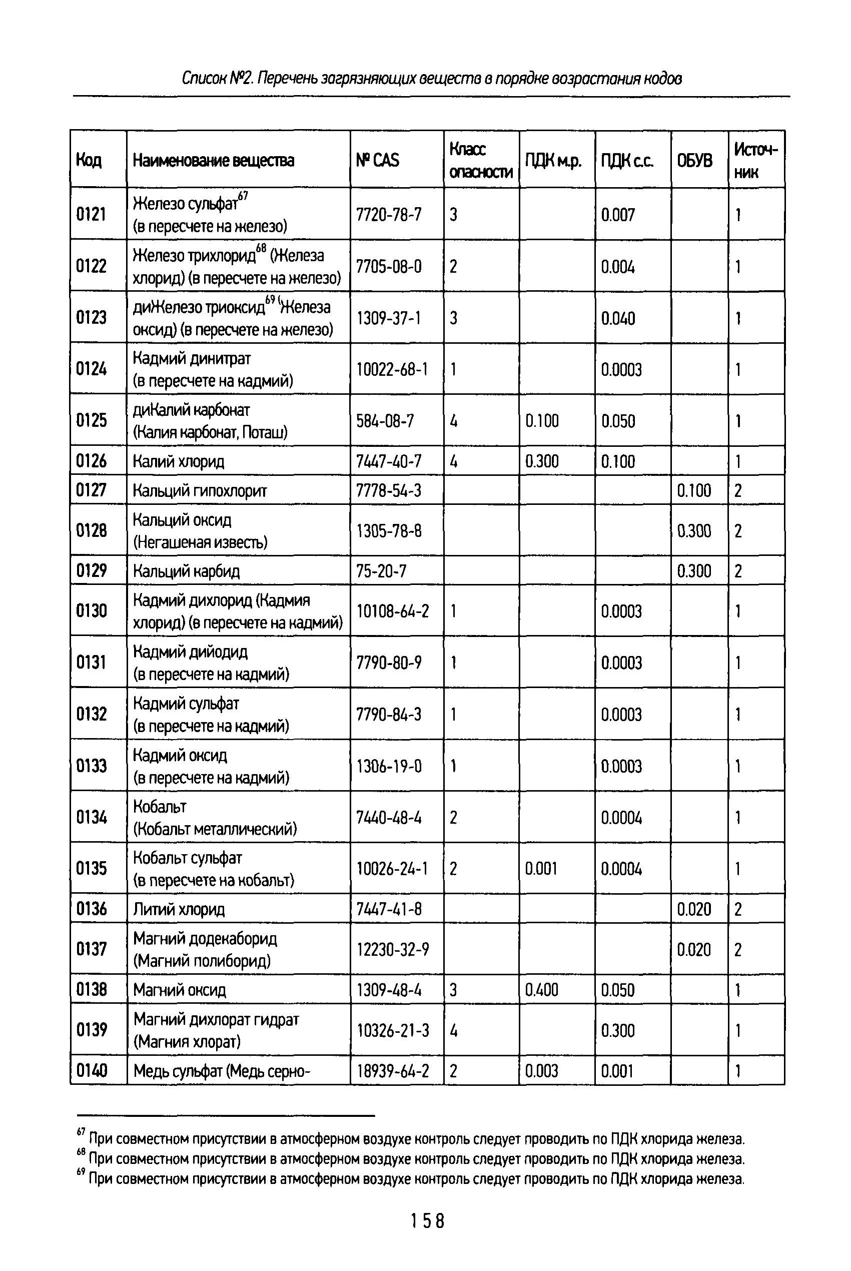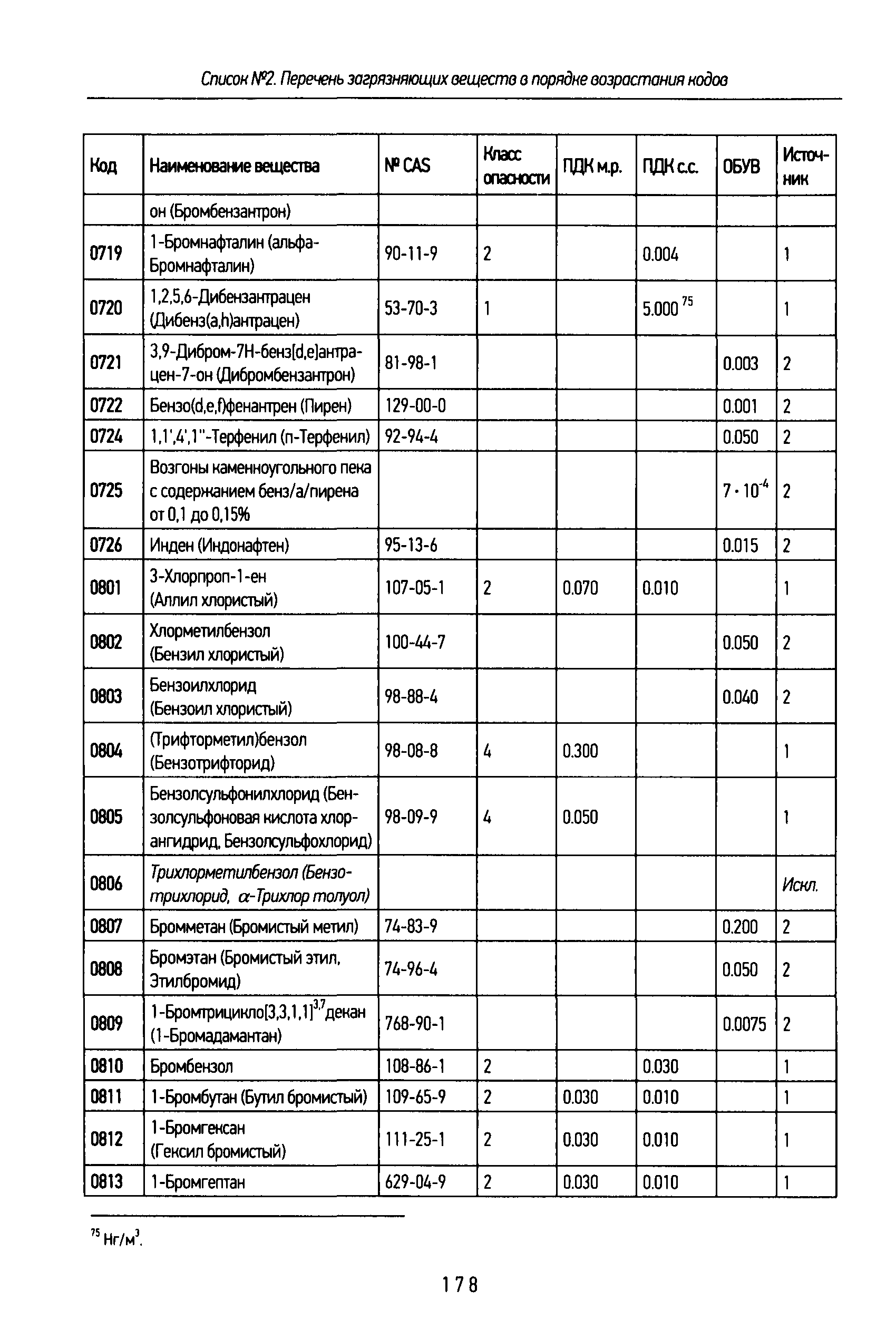Перечень и коды веществ, загрязняющих атмосферный воздух (8 издание)| Статус: | заменен | | Название рус.: | Перечень и коды веществ, загрязняющих атмосферный воздух (8 издание) | | Дата добавления в базу: | 01.09.2013 | | Дата актуализации: | 01.01.2021 | | Область применения: | Перечень предназначен для территориальных и местных природоохранных органов, органов Роспотребнадзора и Ростехнадзора, предприятий и других организаций, в которых проводятся работы, связанные с охраной окружающей среды | | Оглавление: | 1. Введение 2. Список №1. Перечень загрязняющих веществ в алфавитном порядке 3. Список №2. Перечень загрязняющих веществ в порядке возрастания кодов 4. Список №3. Перечень ЛОС в порядке возрастания кодов 5. Список №4 Указатель основных синонимов, технических, торговых и фирменных названий веществ в алфавитном порядке A. Для веществ с установленными значениями ПДК B. Для веществ с установленными значениями ОБУВ 6. Список №5. Указатель основных синонимов, технических, торговых и фирменных названий веществ в порядке возрастания кодов A. Для веществ с установленными значениями ПДК B. Для веществ с установленными значениями ОБУВ | | Разработан: | НИИ Атмосфера Фирма Интеграл Научно-исследовательский институт экологии человека и окружающей среды им. А.И. Сысина