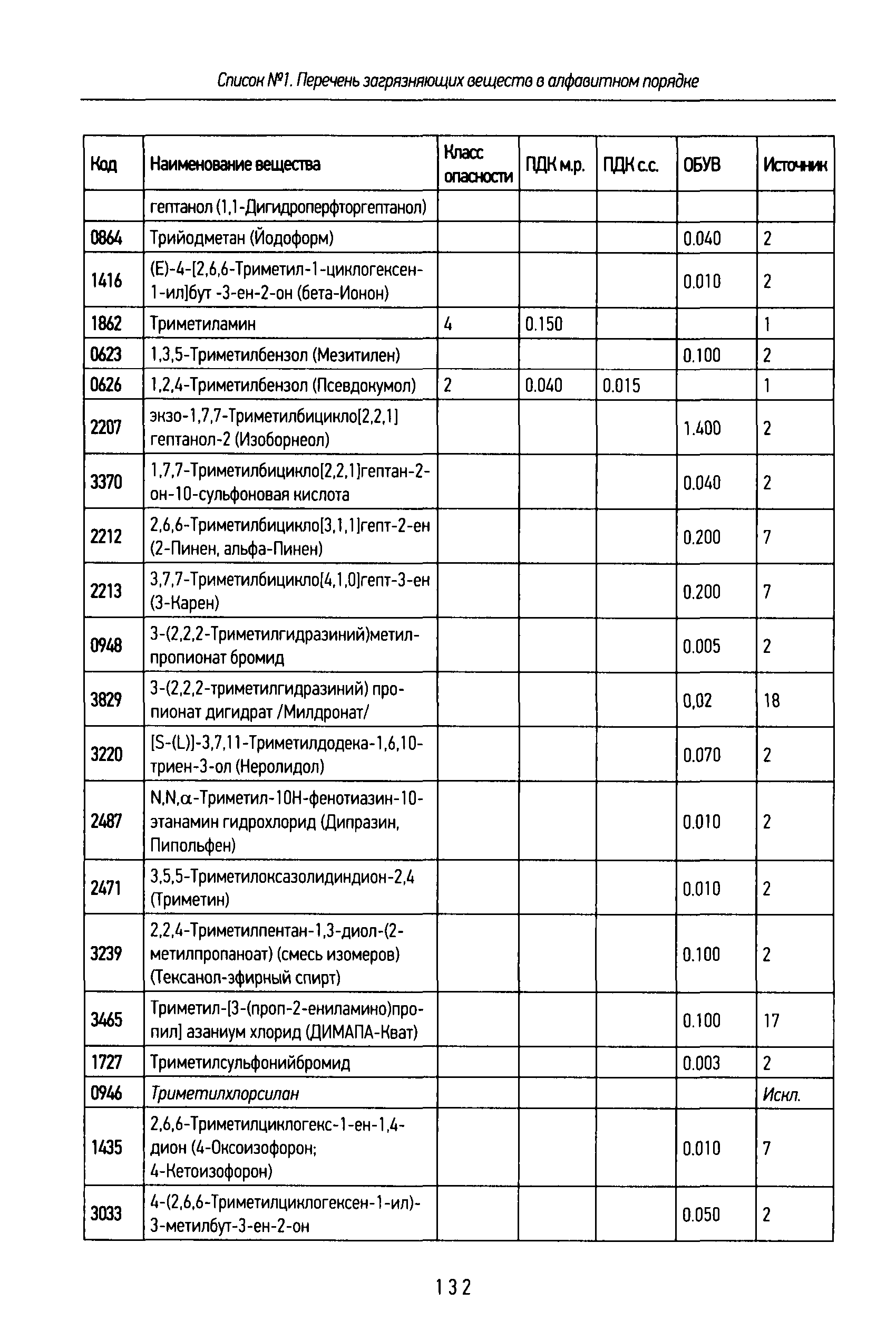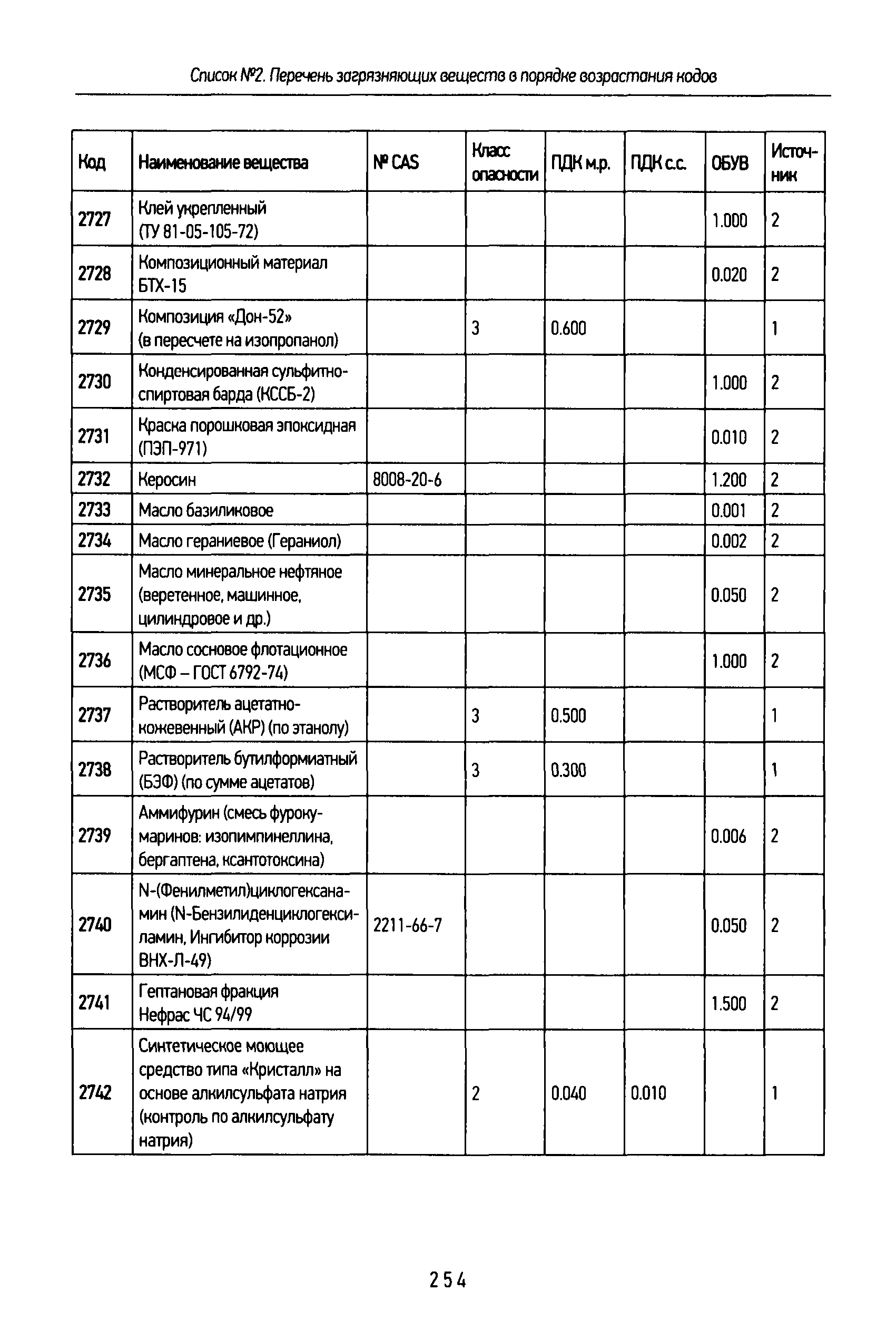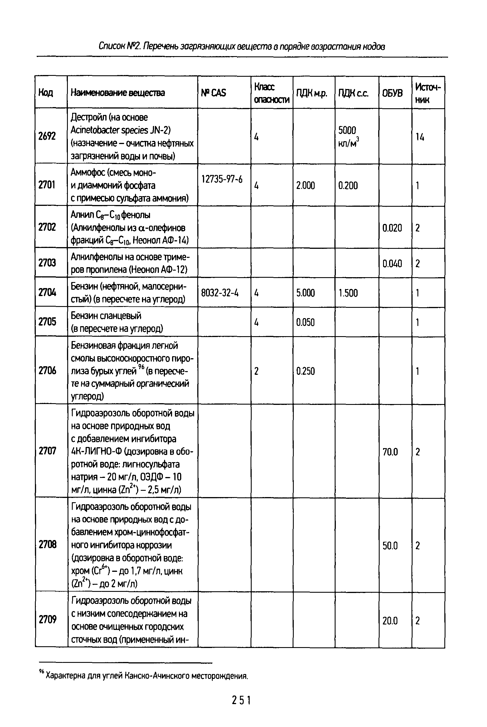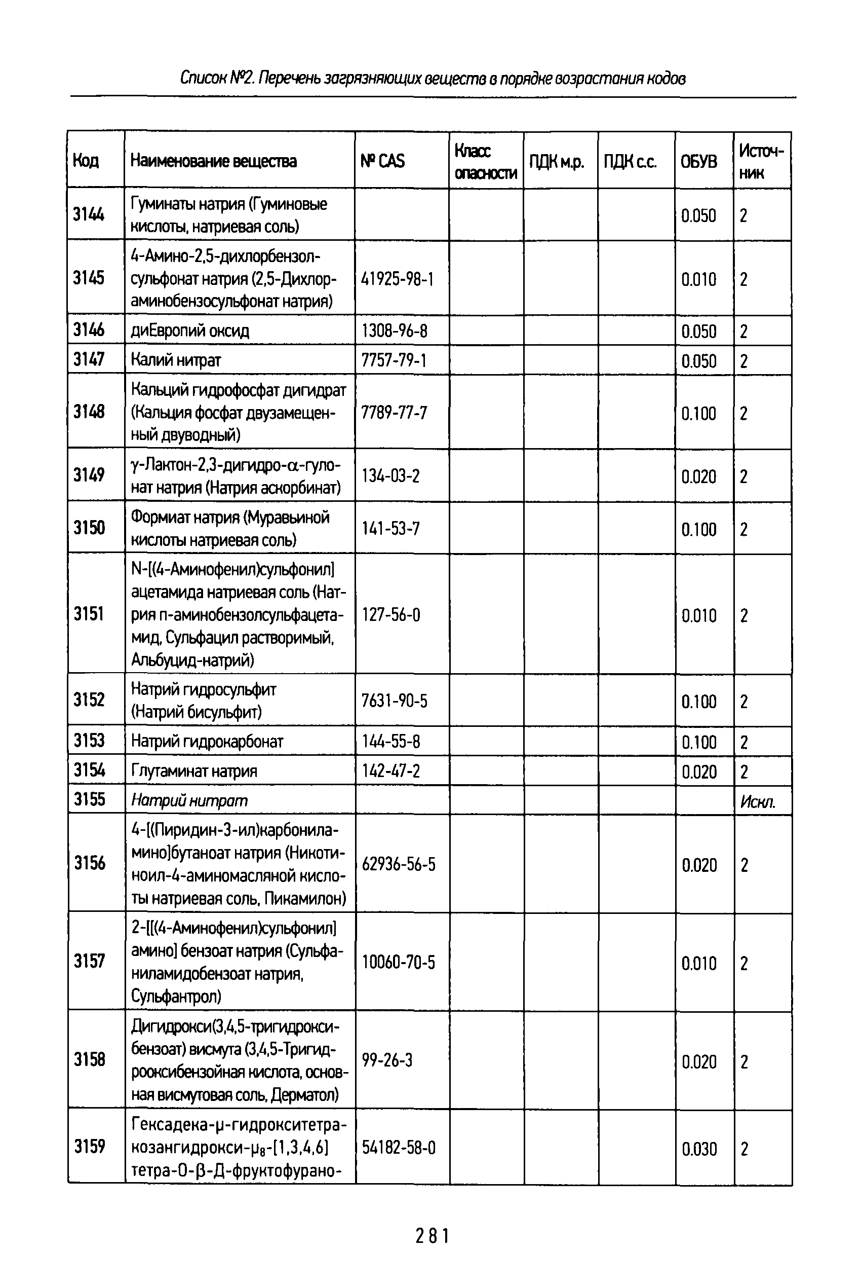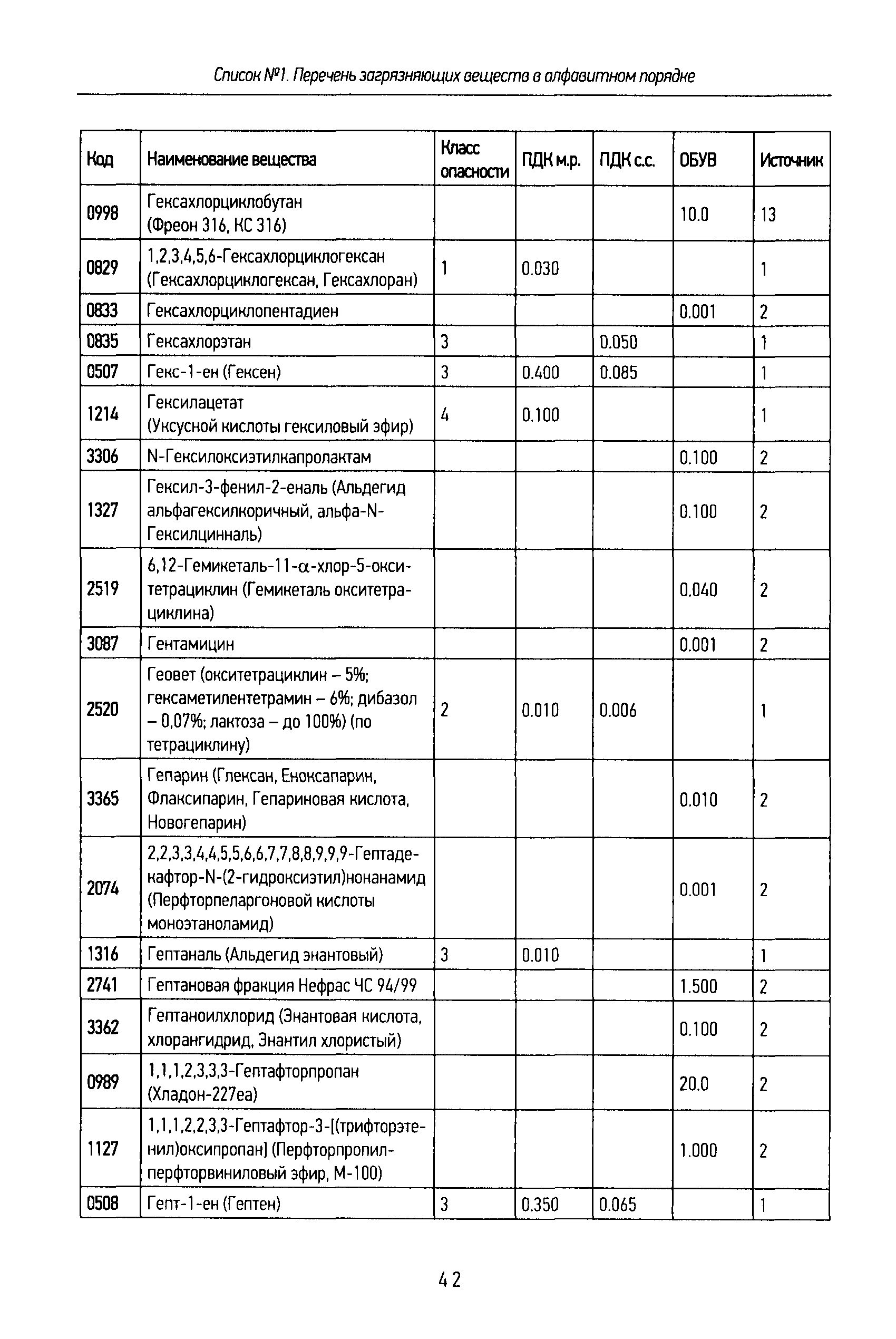 Перечень и коды веществ, загрязняющих атмосферный воздух (8 издание)| Статус: | заменен | | Название рус.: | Перечень и коды веществ, загрязняющих атмосферный воздух (8 издание) | | Дата добавления в базу: | 01.09.2013 | | Дата актуализации: | 01.01.2021 | | Область применения: | Перечень предназначен для территориальных и местных природоохранных органов, органов Роспотребнадзора и Ростехнадзора, предприятий и других организаций, в которых проводятся работы, связанные с охраной окружающей среды | | Оглавление: | 1. Введение 2. Список №1. Перечень загрязняющих веществ в алфавитном порядке 3. Список №2. Перечень загрязняющих веществ в порядке возрастания кодов 4. Список №3. Перечень ЛОС в порядке возрастания кодов 5. Список №4 Указатель основных синонимов, технических, торговых и фирменных названий веществ в алфавитном порядке A. Для веществ с установленными значениями ПДК B. Для веществ с установленными значениями ОБУВ 6. Список №5. Указатель основных синонимов, технических, торговых и фирменных названий веществ в порядке возрастания кодов A. Для веществ с установленными значениями ПДК B. Для веществ с установленными значениями ОБУВ | | Разработан: | НИИ Атмосфера Фирма Интеграл Научно-исследовательский институт экологии человека и окружающей среды им. А.И. Сысина
