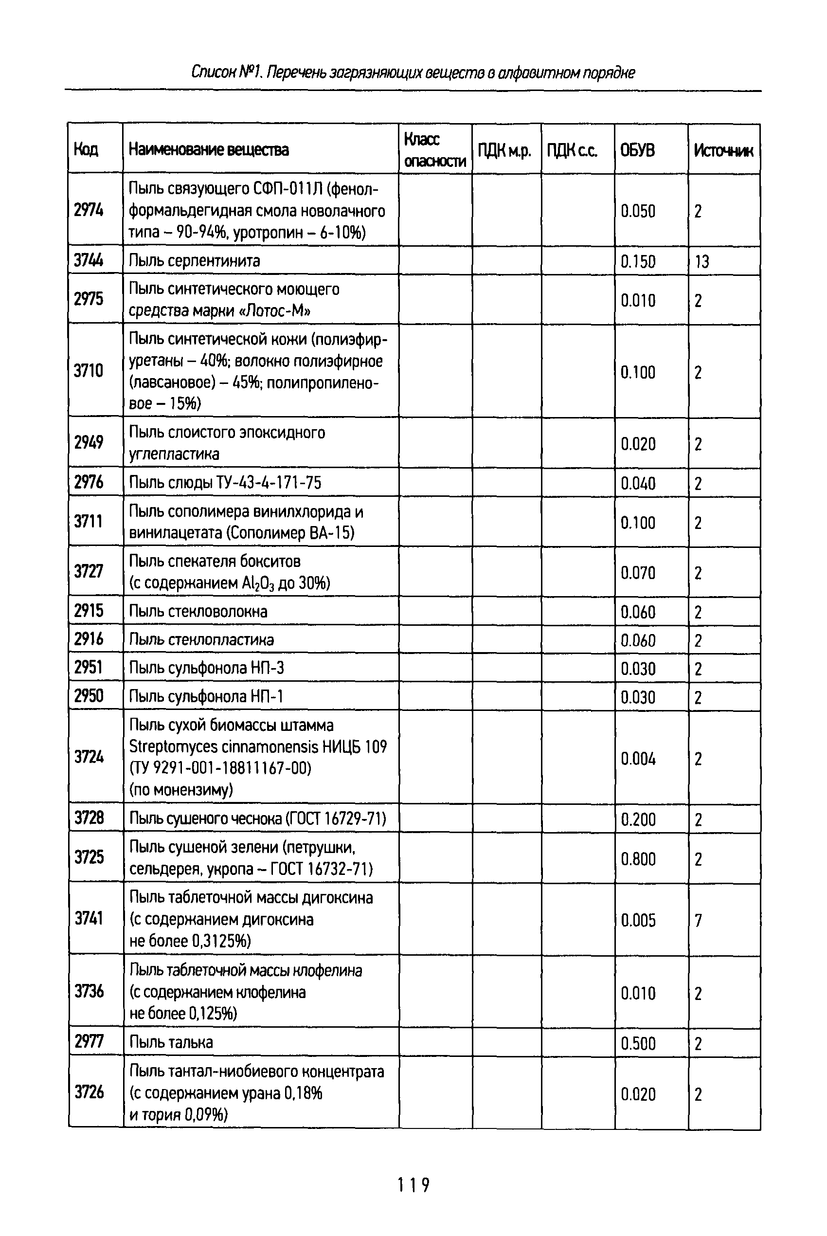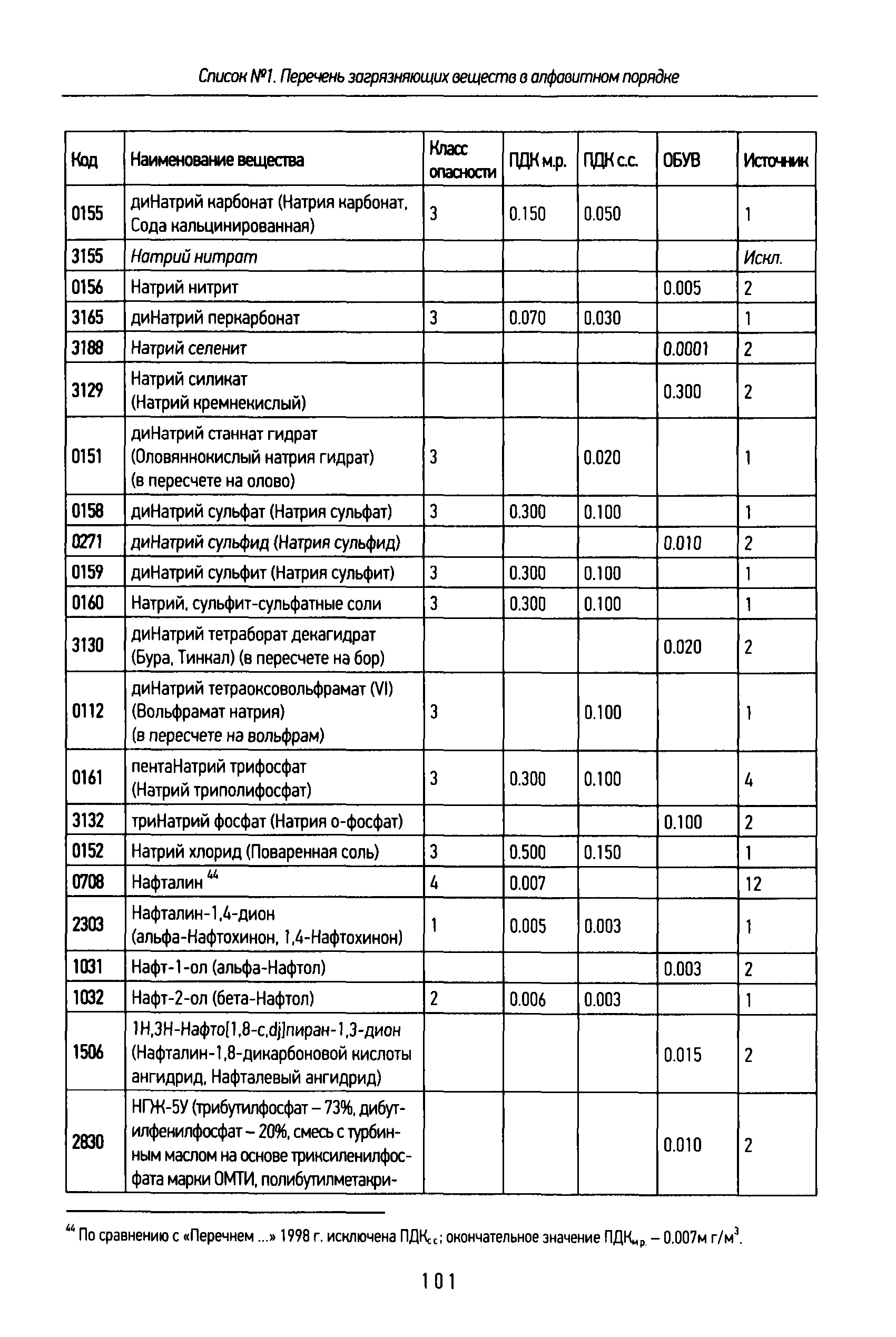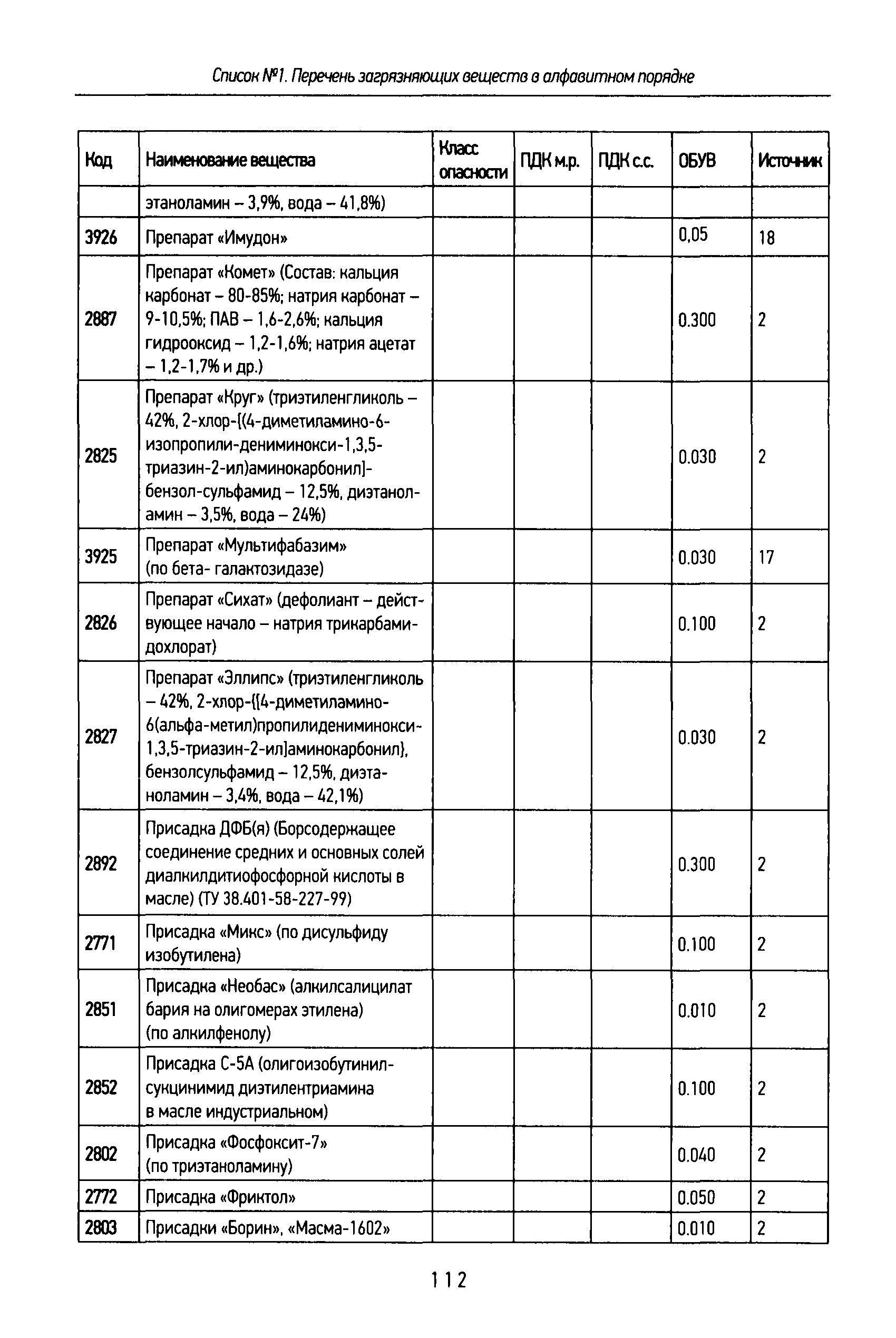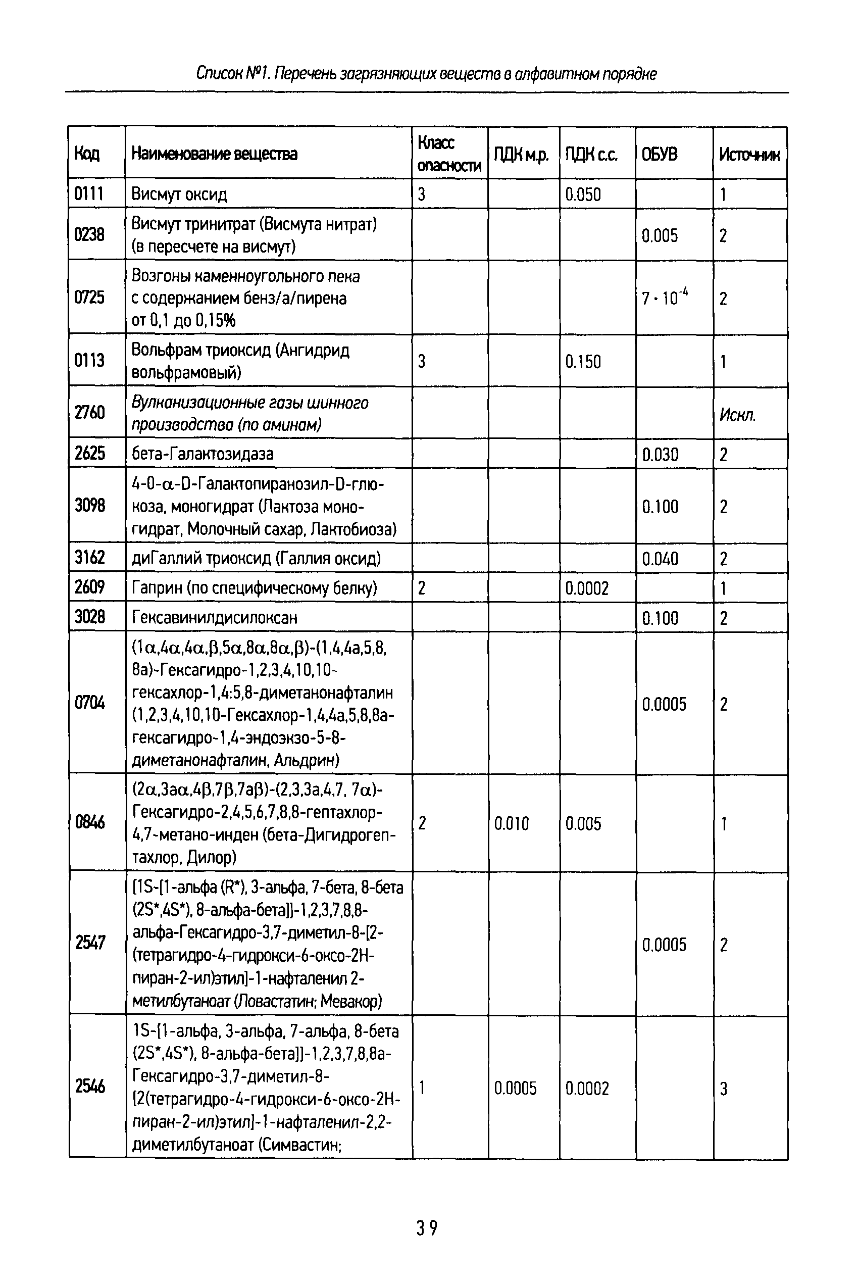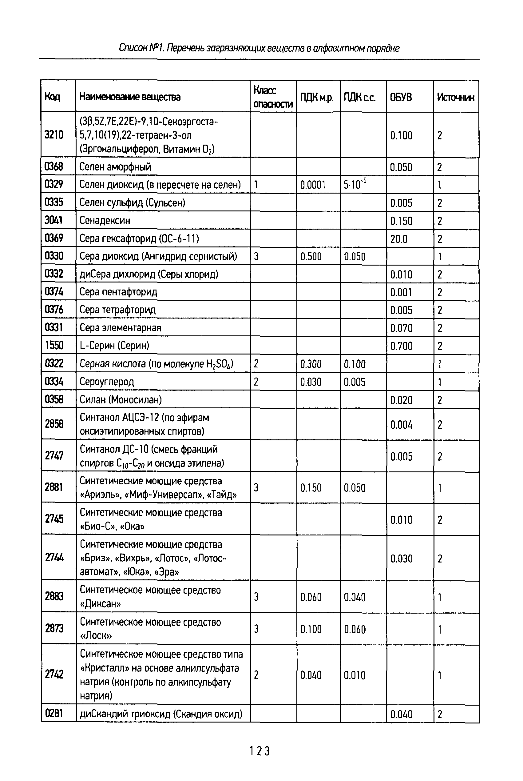 Перечень и коды веществ, загрязняющих атмосферный воздух (8 издание)| Статус: | заменен | | Название рус.: | Перечень и коды веществ, загрязняющих атмосферный воздух (8 издание) | | Дата добавления в базу: | 01.09.2013 | | Дата актуализации: | 01.01.2021 | | Область применения: | Перечень предназначен для территориальных и местных природоохранных органов, органов Роспотребнадзора и Ростехнадзора, предприятий и других организаций, в которых проводятся работы, связанные с охраной окружающей среды | | Оглавление: | 1. Введение 2. Список №1. Перечень загрязняющих веществ в алфавитном порядке 3. Список №2. Перечень загрязняющих веществ в порядке возрастания кодов 4. Список №3. Перечень ЛОС в порядке возрастания кодов 5. Список №4 Указатель основных синонимов, технических, торговых и фирменных названий веществ в алфавитном порядке A. Для веществ с установленными значениями ПДК B. Для веществ с установленными значениями ОБУВ 6. Список №5. Указатель основных синонимов, технических, торговых и фирменных названий веществ в порядке возрастания кодов A. Для веществ с установленными значениями ПДК B. Для веществ с установленными значениями ОБУВ | | Разработан: | НИИ Атмосфера Фирма Интеграл Научно-исследовательский институт экологии человека и окружающей среды им. А.И. Сысина
