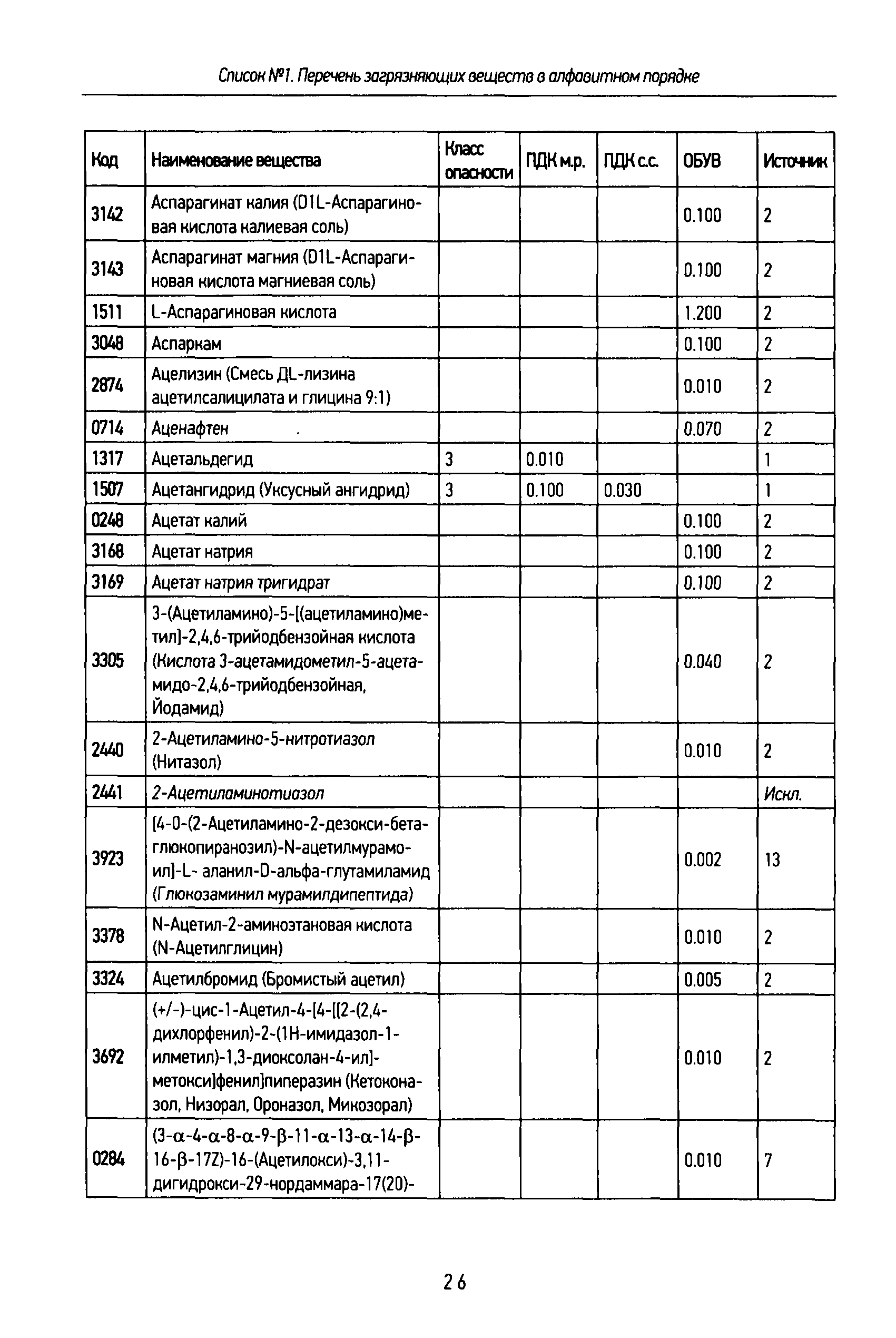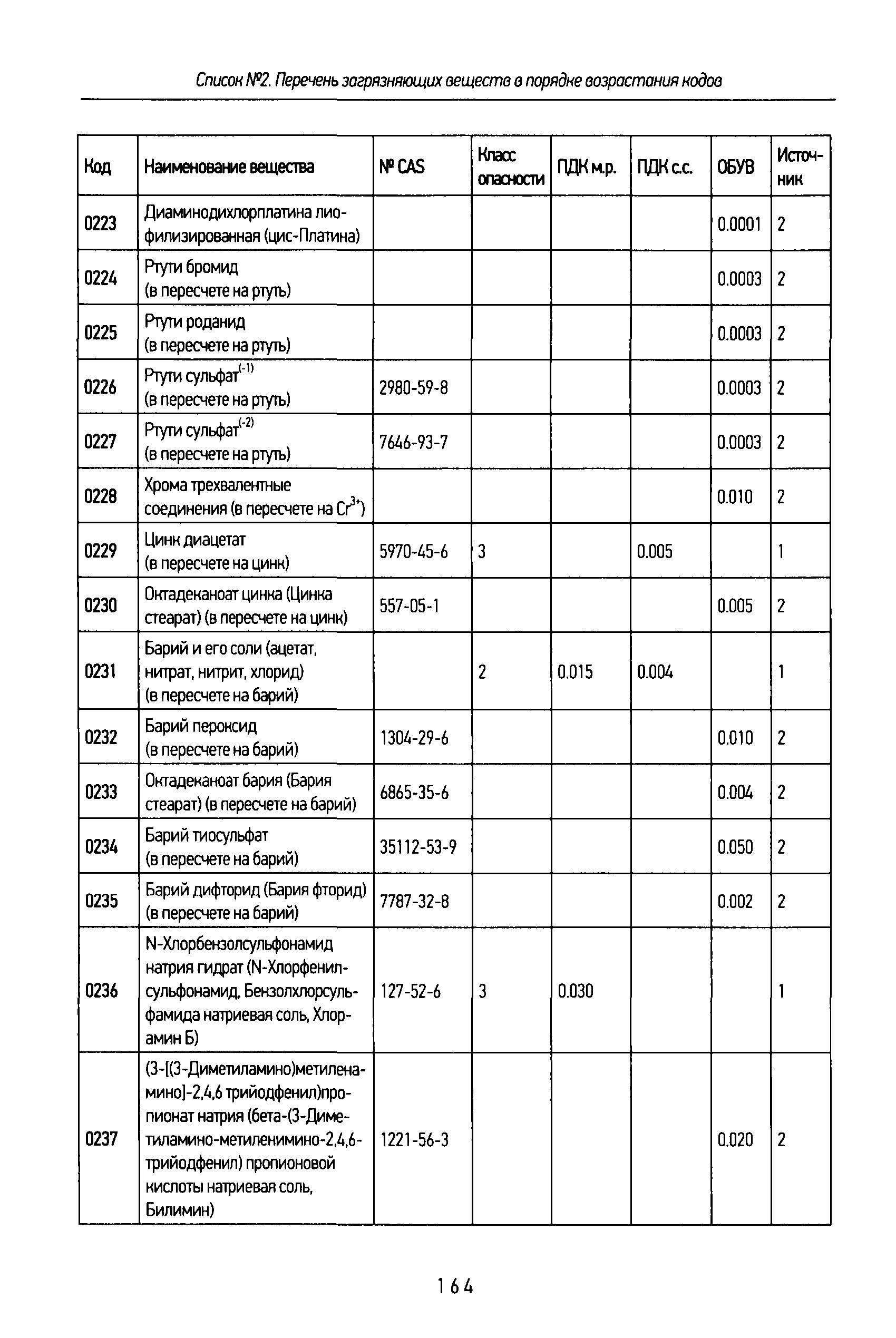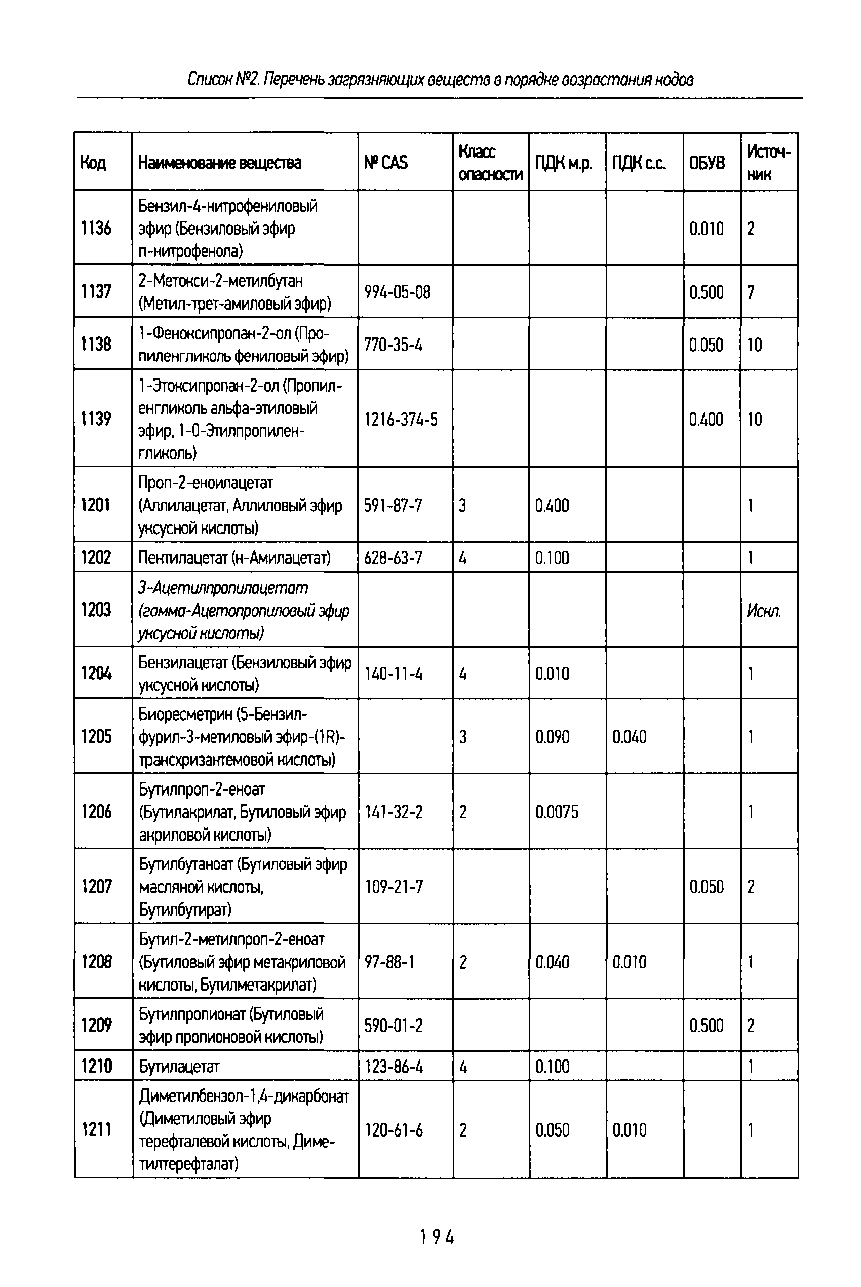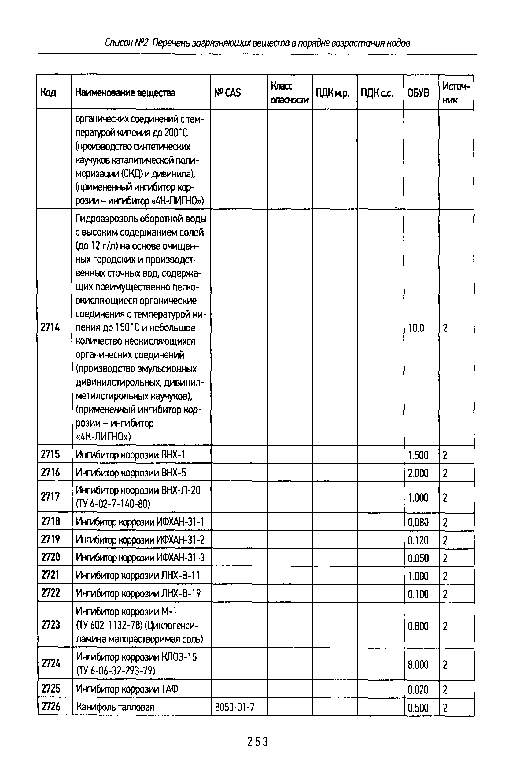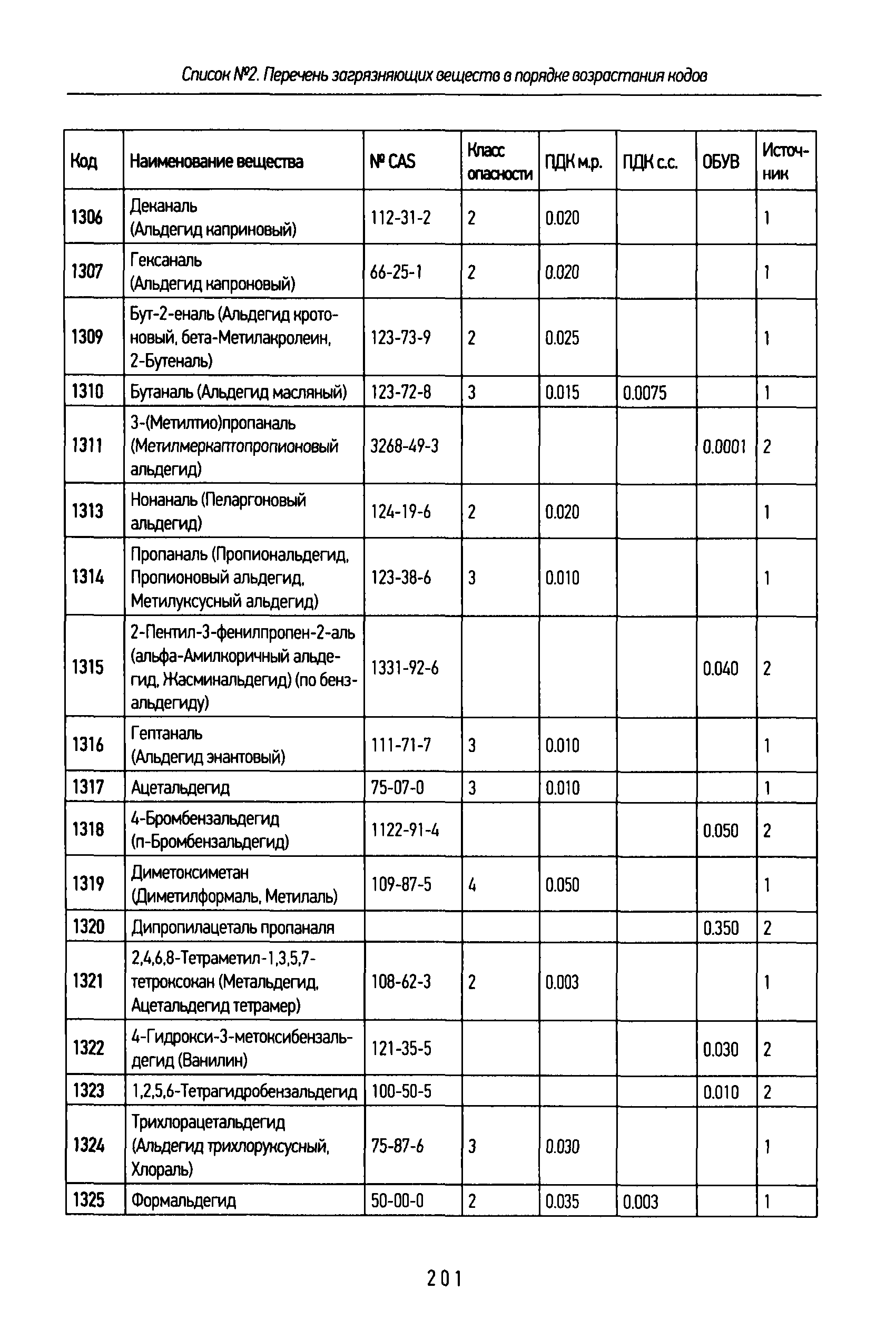 Перечень и коды веществ, загрязняющих атмосферный воздух (8 издание)| Статус: | заменен | | Название рус.: | Перечень и коды веществ, загрязняющих атмосферный воздух (8 издание) | | Дата добавления в базу: | 01.09.2013 | | Дата актуализации: | 01.01.2021 | | Область применения: | Перечень предназначен для территориальных и местных природоохранных органов, органов Роспотребнадзора и Ростехнадзора, предприятий и других организаций, в которых проводятся работы, связанные с охраной окружающей среды | | Оглавление: | 1. Введение 2. Список №1. Перечень загрязняющих веществ в алфавитном порядке 3. Список №2. Перечень загрязняющих веществ в порядке возрастания кодов 4. Список №3. Перечень ЛОС в порядке возрастания кодов 5. Список №4 Указатель основных синонимов, технических, торговых и фирменных названий веществ в алфавитном порядке A. Для веществ с установленными значениями ПДК B. Для веществ с установленными значениями ОБУВ 6. Список №5. Указатель основных синонимов, технических, торговых и фирменных названий веществ в порядке возрастания кодов A. Для веществ с установленными значениями ПДК B. Для веществ с установленными значениями ОБУВ | | Разработан: | НИИ Атмосфера Фирма Интеграл Научно-исследовательский институт экологии человека и окружающей среды им. А.И. Сысина