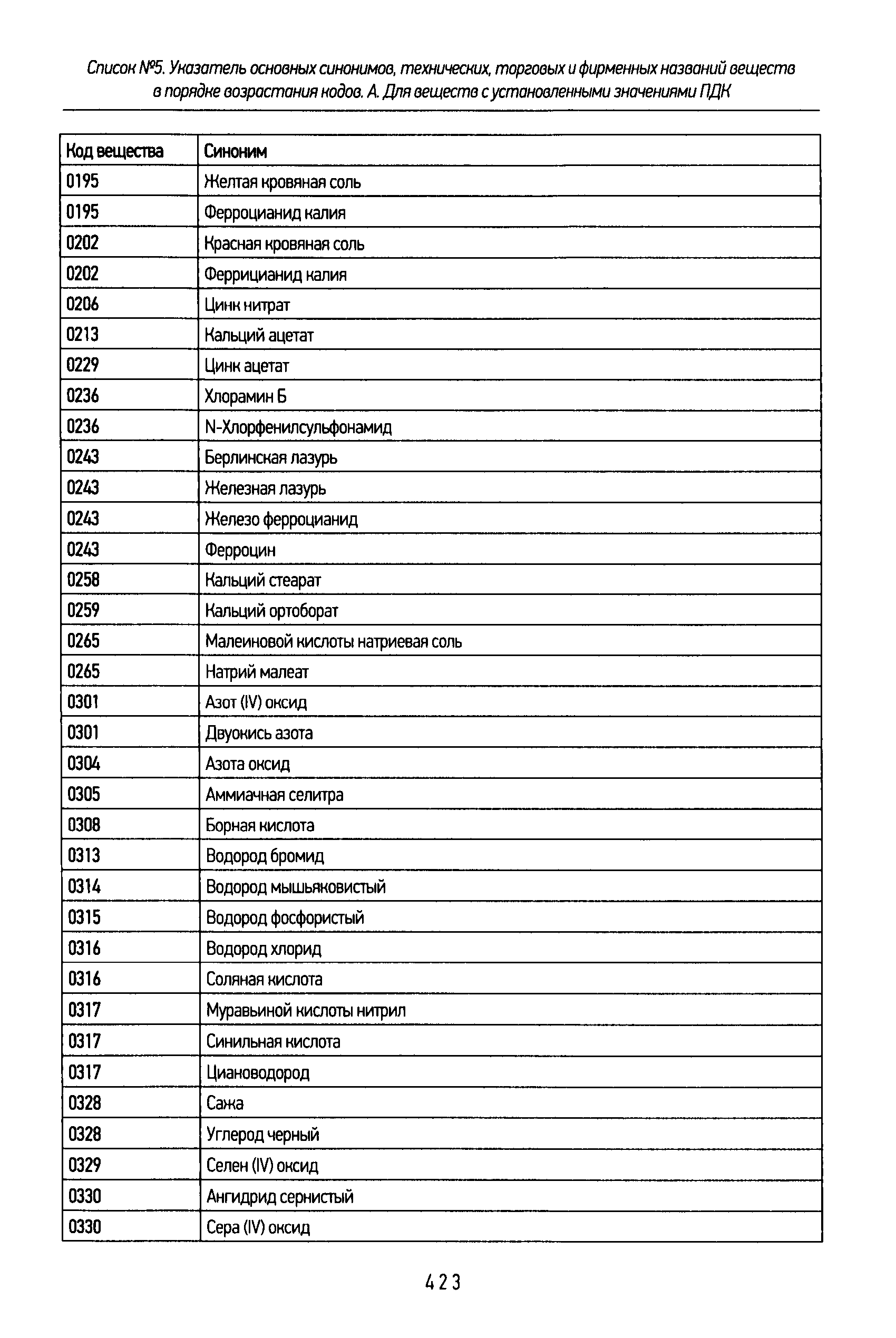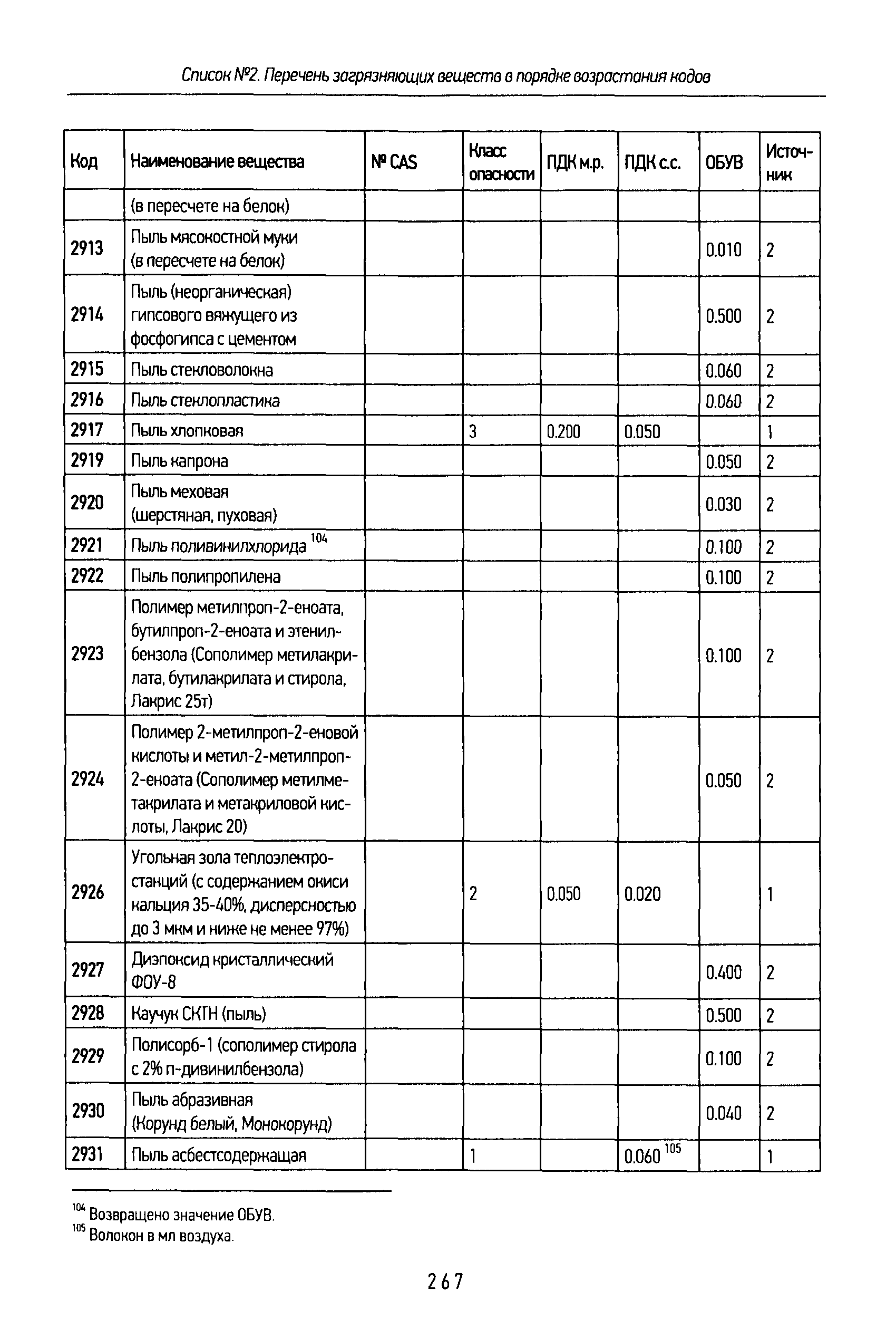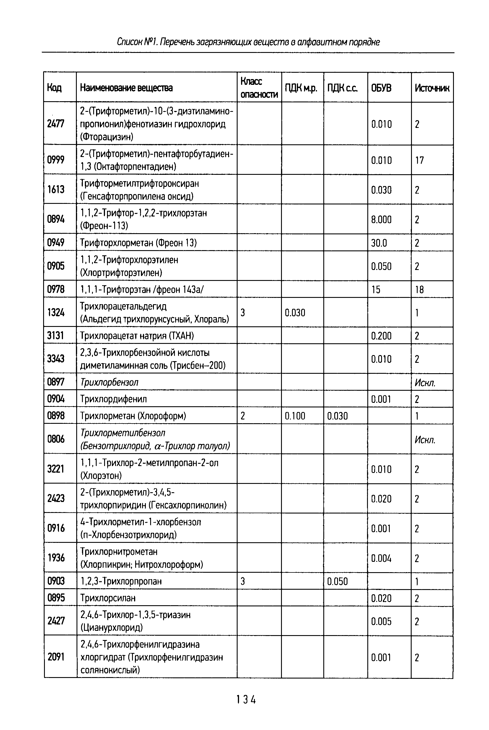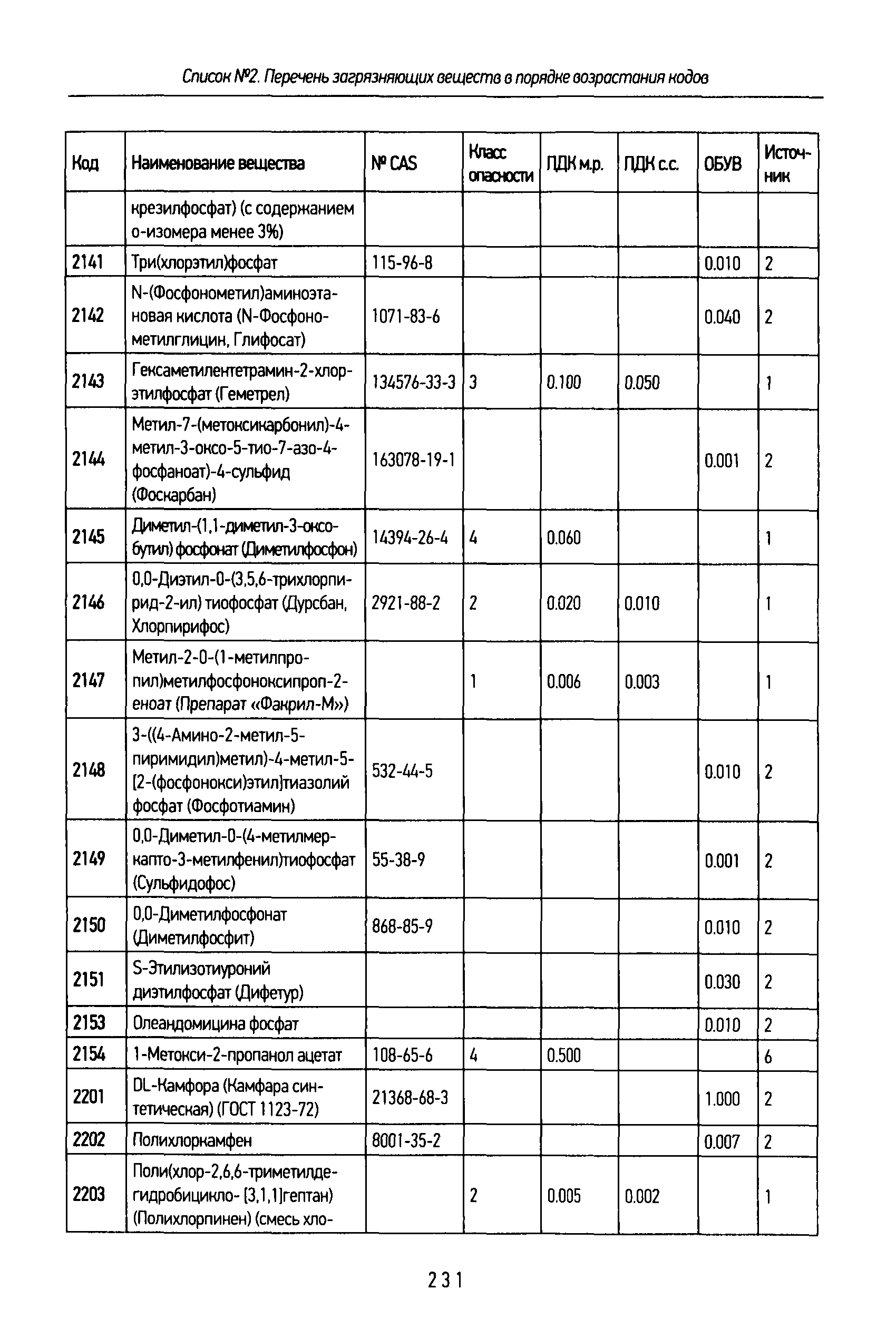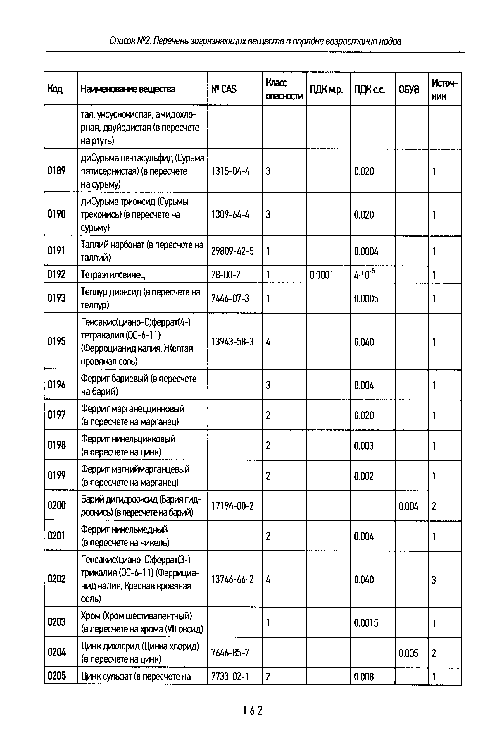 Перечень и коды веществ, загрязняющих атмосферный воздух (8 издание)| Статус: | заменен | | Название рус.: | Перечень и коды веществ, загрязняющих атмосферный воздух (8 издание) | | Дата добавления в базу: | 01.09.2013 | | Дата актуализации: | 01.01.2021 | | Область применения: | Перечень предназначен для территориальных и местных природоохранных органов, органов Роспотребнадзора и Ростехнадзора, предприятий и других организаций, в которых проводятся работы, связанные с охраной окружающей среды | | Оглавление: | 1. Введение 2. Список №1. Перечень загрязняющих веществ в алфавитном порядке 3. Список №2. Перечень загрязняющих веществ в порядке возрастания кодов 4. Список №3. Перечень ЛОС в порядке возрастания кодов 5. Список №4 Указатель основных синонимов, технических, торговых и фирменных названий веществ в алфавитном порядке A. Для веществ с установленными значениями ПДК B. Для веществ с установленными значениями ОБУВ 6. Список №5. Указатель основных синонимов, технических, торговых и фирменных названий веществ в порядке возрастания кодов A. Для веществ с установленными значениями ПДК B. Для веществ с установленными значениями ОБУВ | | Разработан: | НИИ Атмосфера Фирма Интеграл Научно-исследовательский институт экологии человека и окружающей среды им. А.И. Сысина