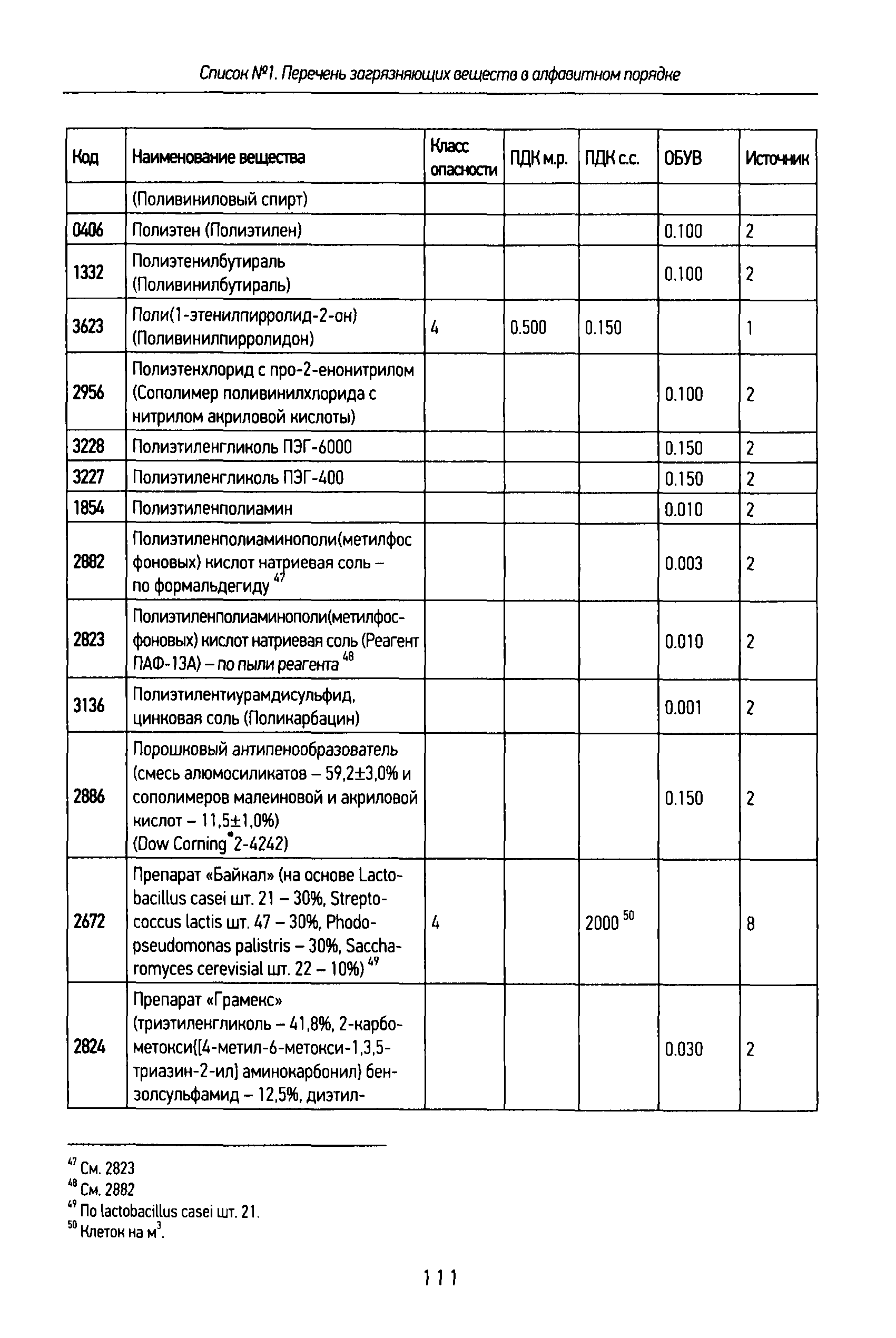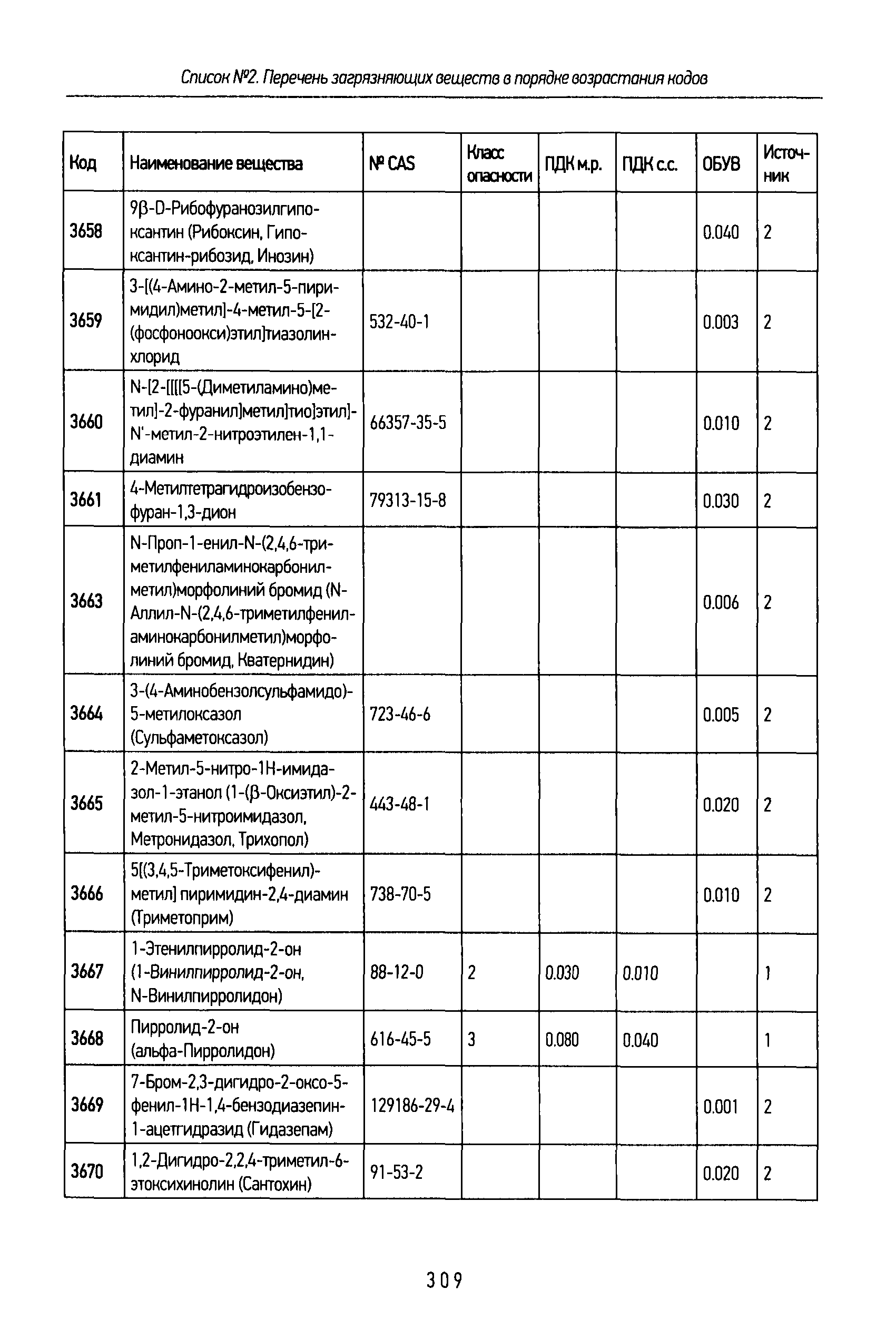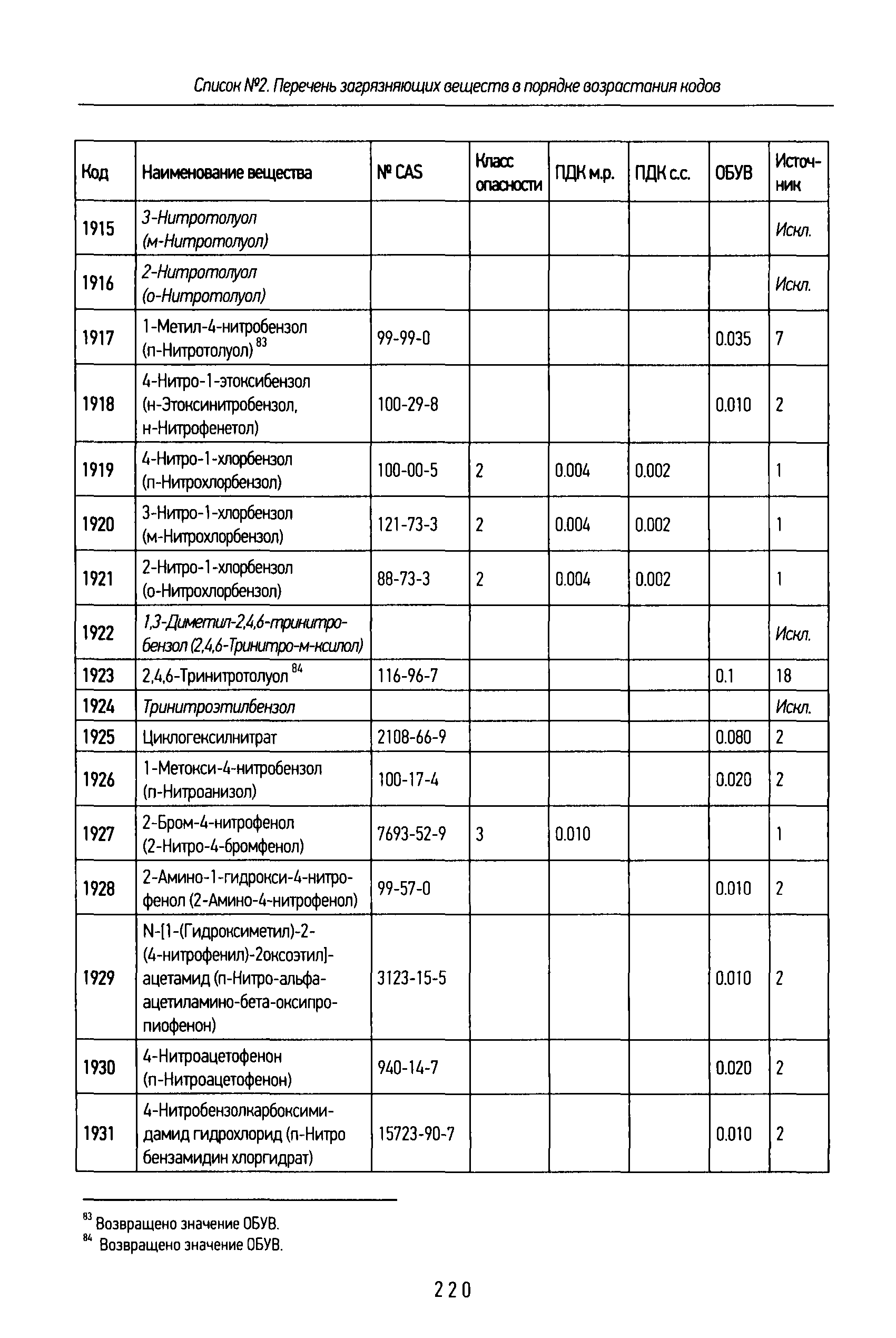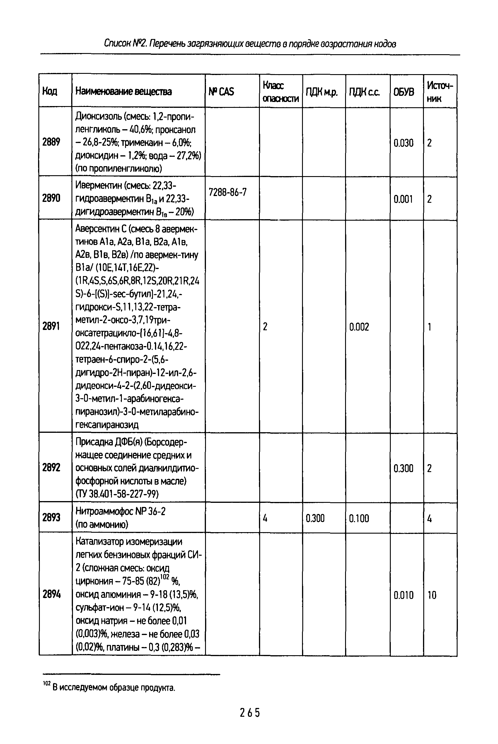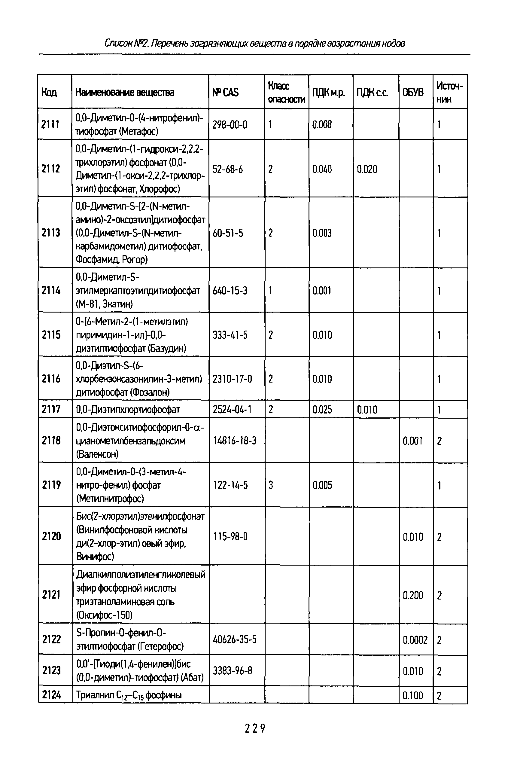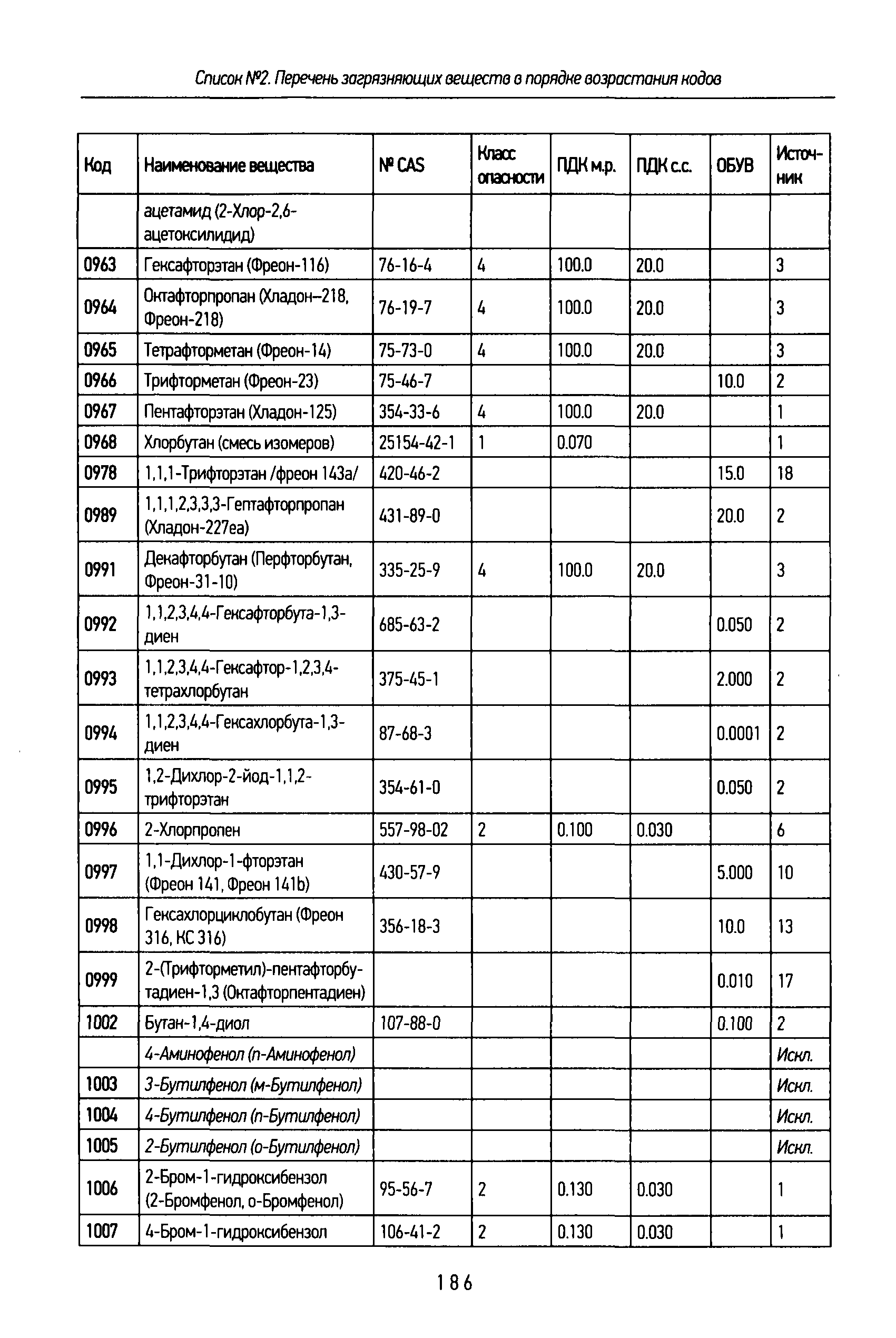 Перечень и коды веществ, загрязняющих атмосферный воздух (8 издание)| Статус: | заменен | | Название рус.: | Перечень и коды веществ, загрязняющих атмосферный воздух (8 издание) | | Дата добавления в базу: | 01.09.2013 | | Дата актуализации: | 01.01.2021 | | Область применения: | Перечень предназначен для территориальных и местных природоохранных органов, органов Роспотребнадзора и Ростехнадзора, предприятий и других организаций, в которых проводятся работы, связанные с охраной окружающей среды | | Оглавление: | 1. Введение 2. Список №1. Перечень загрязняющих веществ в алфавитном порядке 3. Список №2. Перечень загрязняющих веществ в порядке возрастания кодов 4. Список №3. Перечень ЛОС в порядке возрастания кодов 5. Список №4 Указатель основных синонимов, технических, торговых и фирменных названий веществ в алфавитном порядке A. Для веществ с установленными значениями ПДК B. Для веществ с установленными значениями ОБУВ 6. Список №5. Указатель основных синонимов, технических, торговых и фирменных названий веществ в порядке возрастания кодов A. Для веществ с установленными значениями ПДК B. Для веществ с установленными значениями ОБУВ | | Разработан: | НИИ Атмосфера Фирма Интеграл Научно-исследовательский институт экологии человека и окружающей среды им. А.И. Сысина