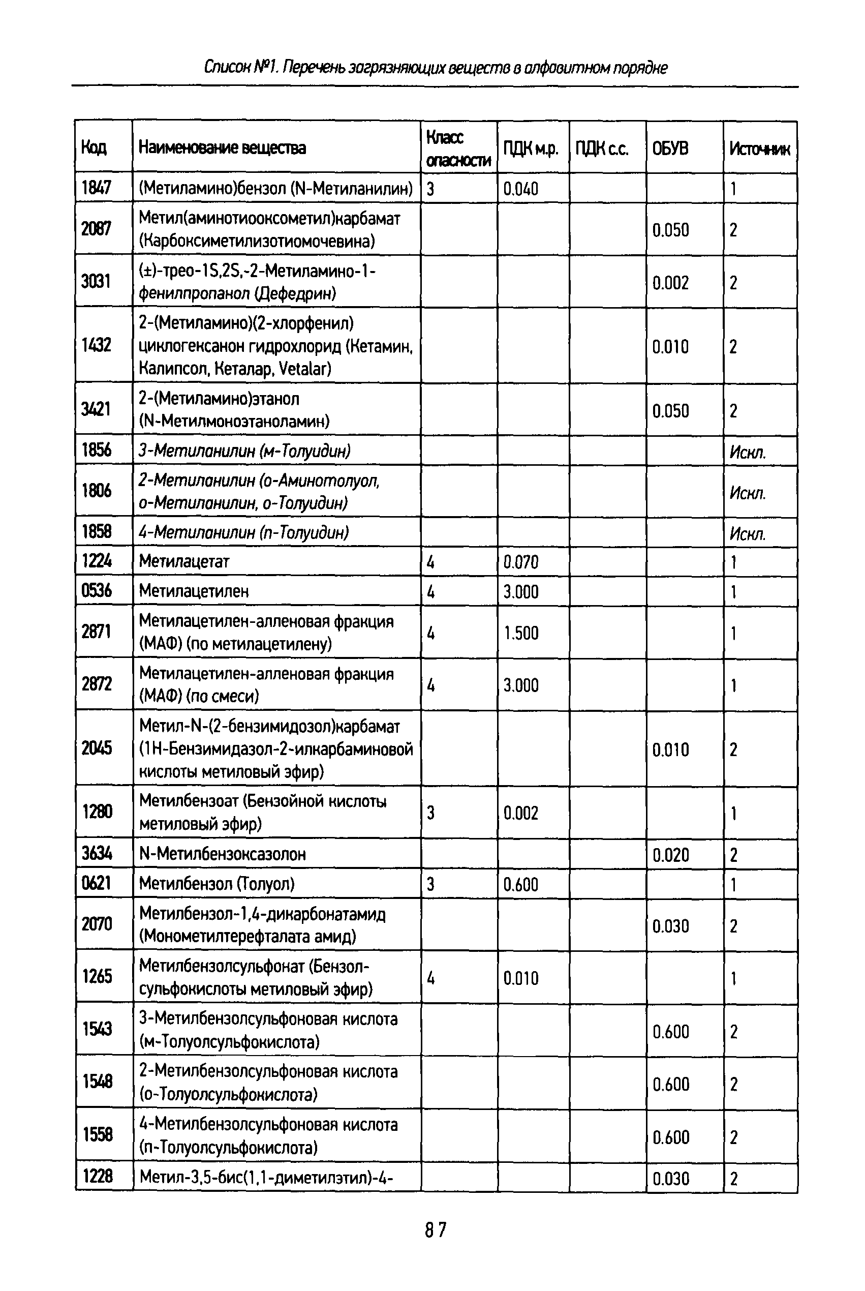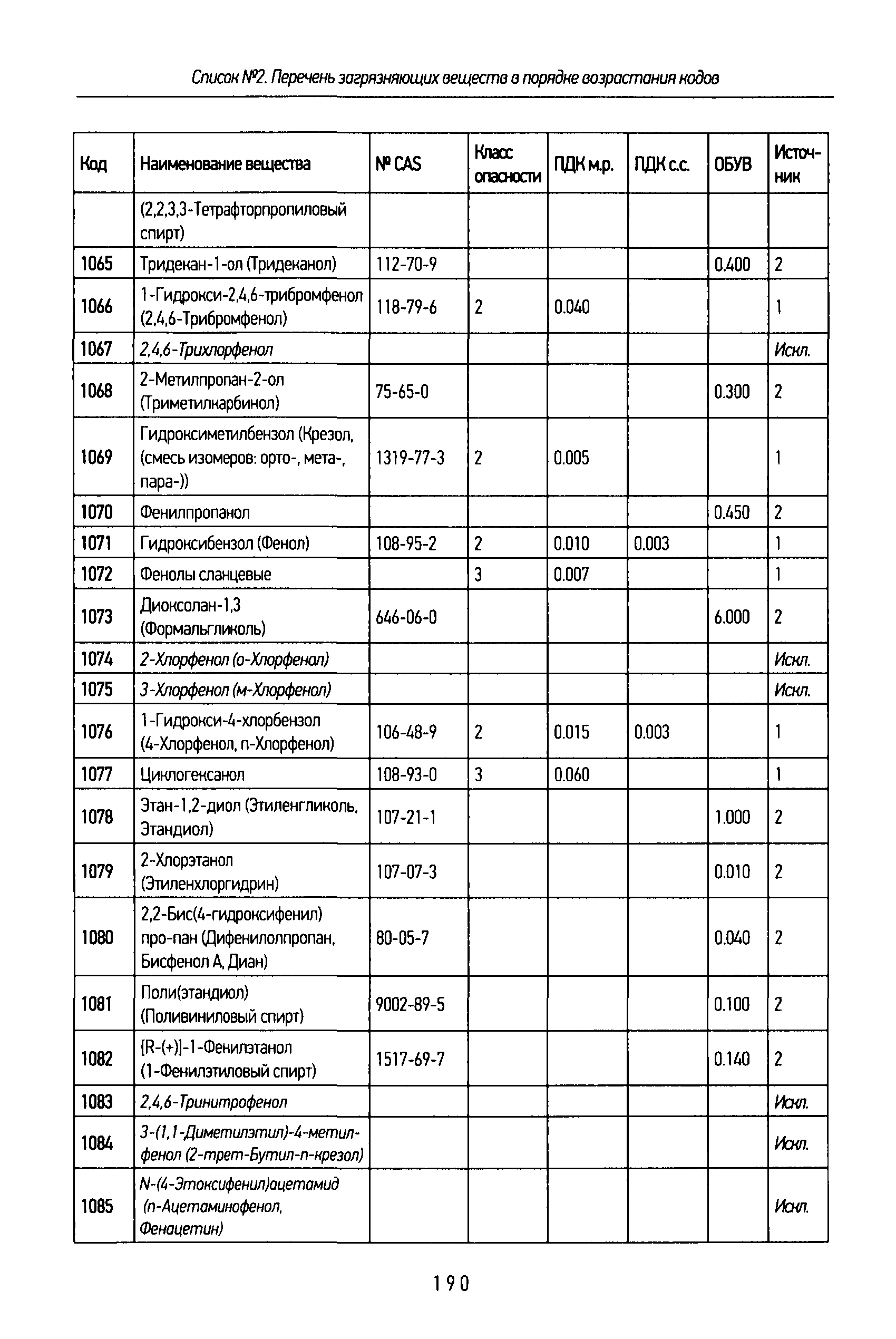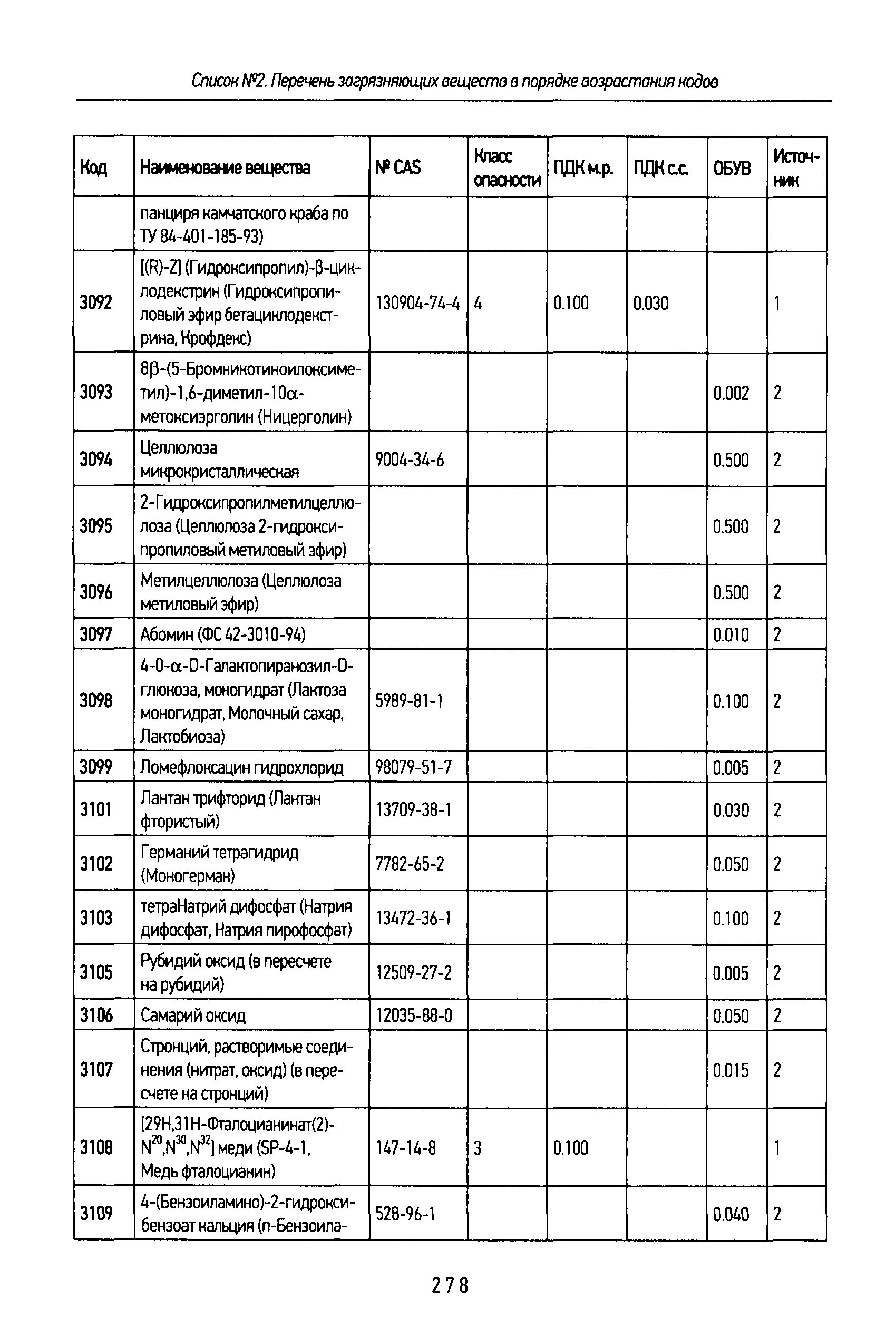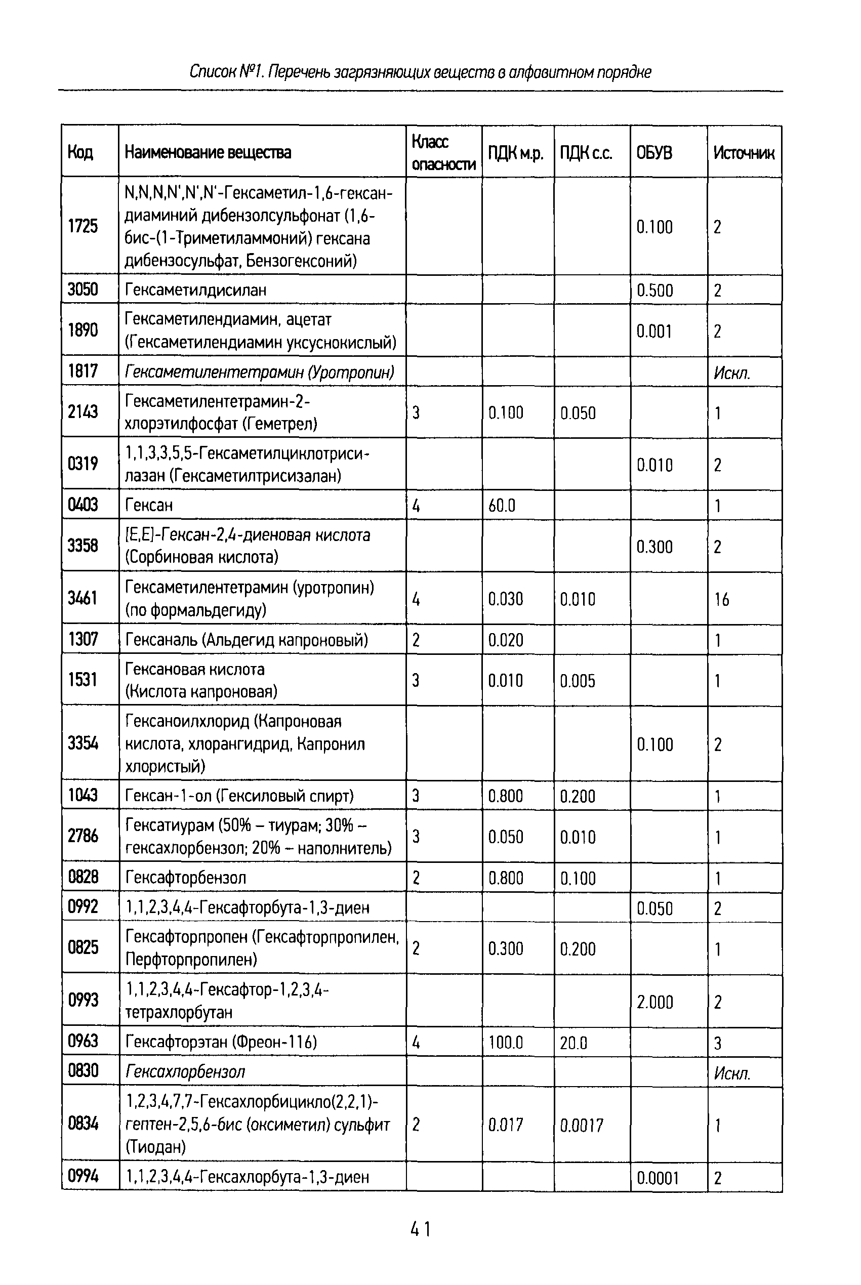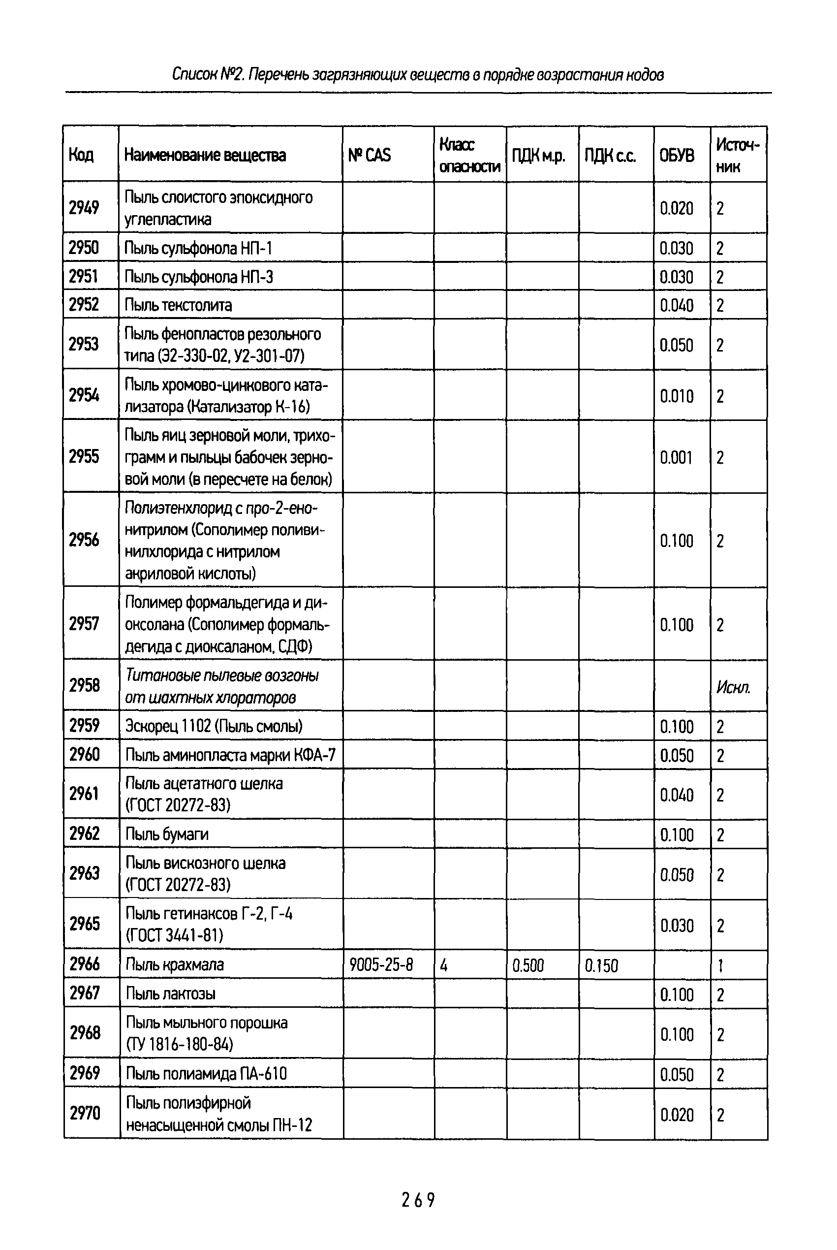 Перечень и коды веществ, загрязняющих атмосферный воздух (8 издание)| Статус: | заменен | | Название рус.: | Перечень и коды веществ, загрязняющих атмосферный воздух (8 издание) | | Дата добавления в базу: | 01.09.2013 | | Дата актуализации: | 01.01.2021 | | Область применения: | Перечень предназначен для территориальных и местных природоохранных органов, органов Роспотребнадзора и Ростехнадзора, предприятий и других организаций, в которых проводятся работы, связанные с охраной окружающей среды | | Оглавление: | 1. Введение 2. Список №1. Перечень загрязняющих веществ в алфавитном порядке 3. Список №2. Перечень загрязняющих веществ в порядке возрастания кодов 4. Список №3. Перечень ЛОС в порядке возрастания кодов 5. Список №4 Указатель основных синонимов, технических, торговых и фирменных названий веществ в алфавитном порядке A. Для веществ с установленными значениями ПДК B. Для веществ с установленными значениями ОБУВ 6. Список №5. Указатель основных синонимов, технических, торговых и фирменных названий веществ в порядке возрастания кодов A. Для веществ с установленными значениями ПДК B. Для веществ с установленными значениями ОБУВ | | Разработан: | НИИ Атмосфера Фирма Интеграл Научно-исследовательский институт экологии человека и окружающей среды им. А.И. Сысина
