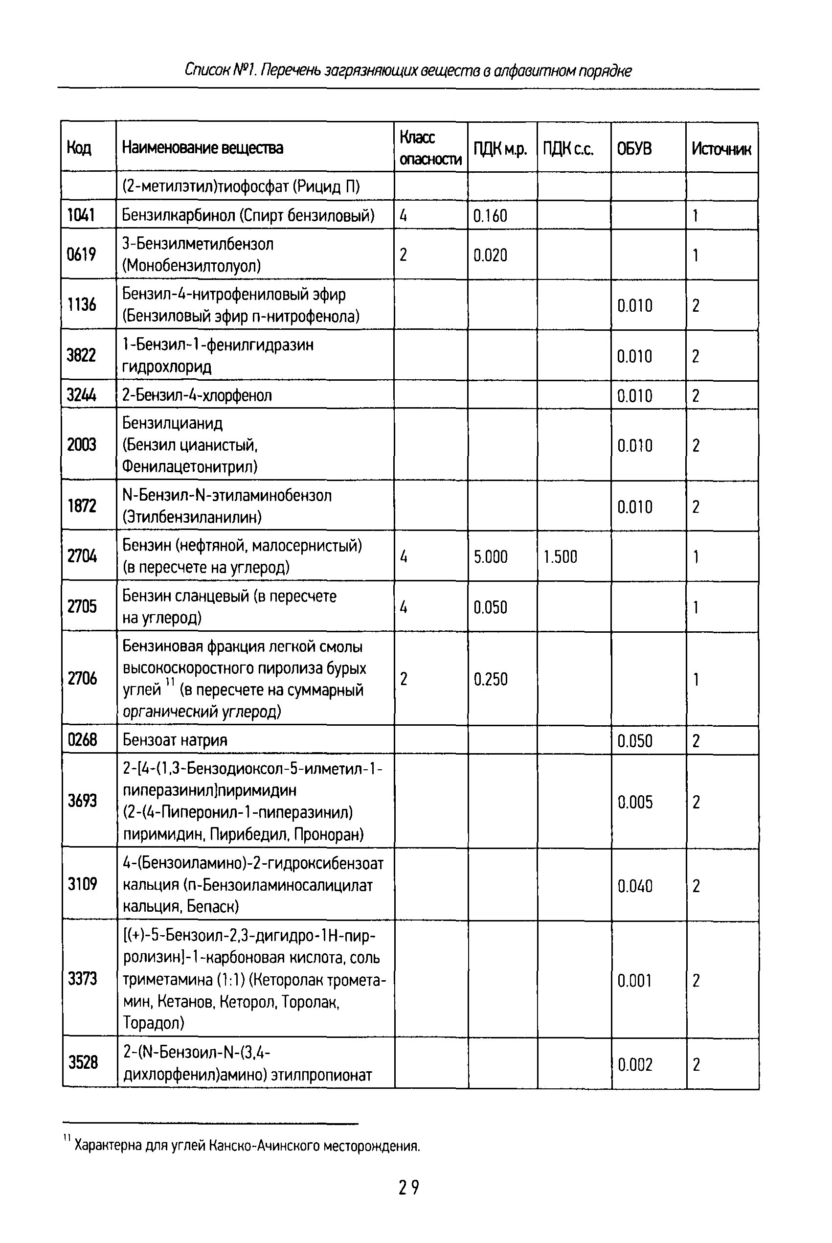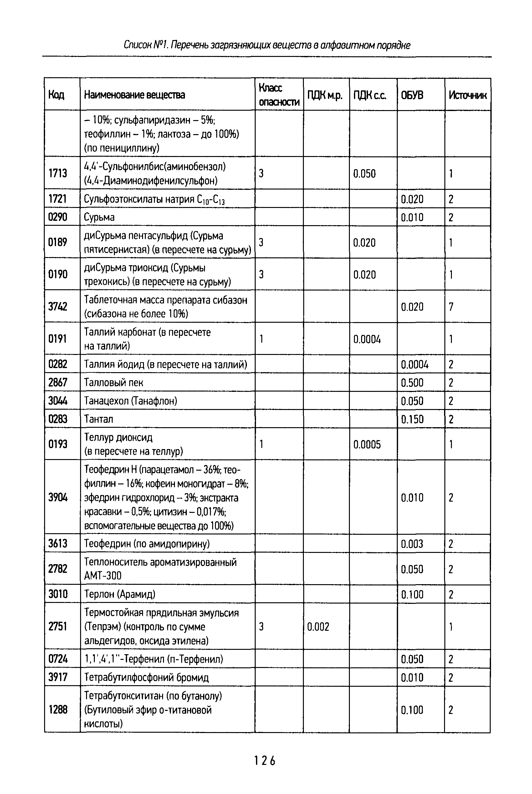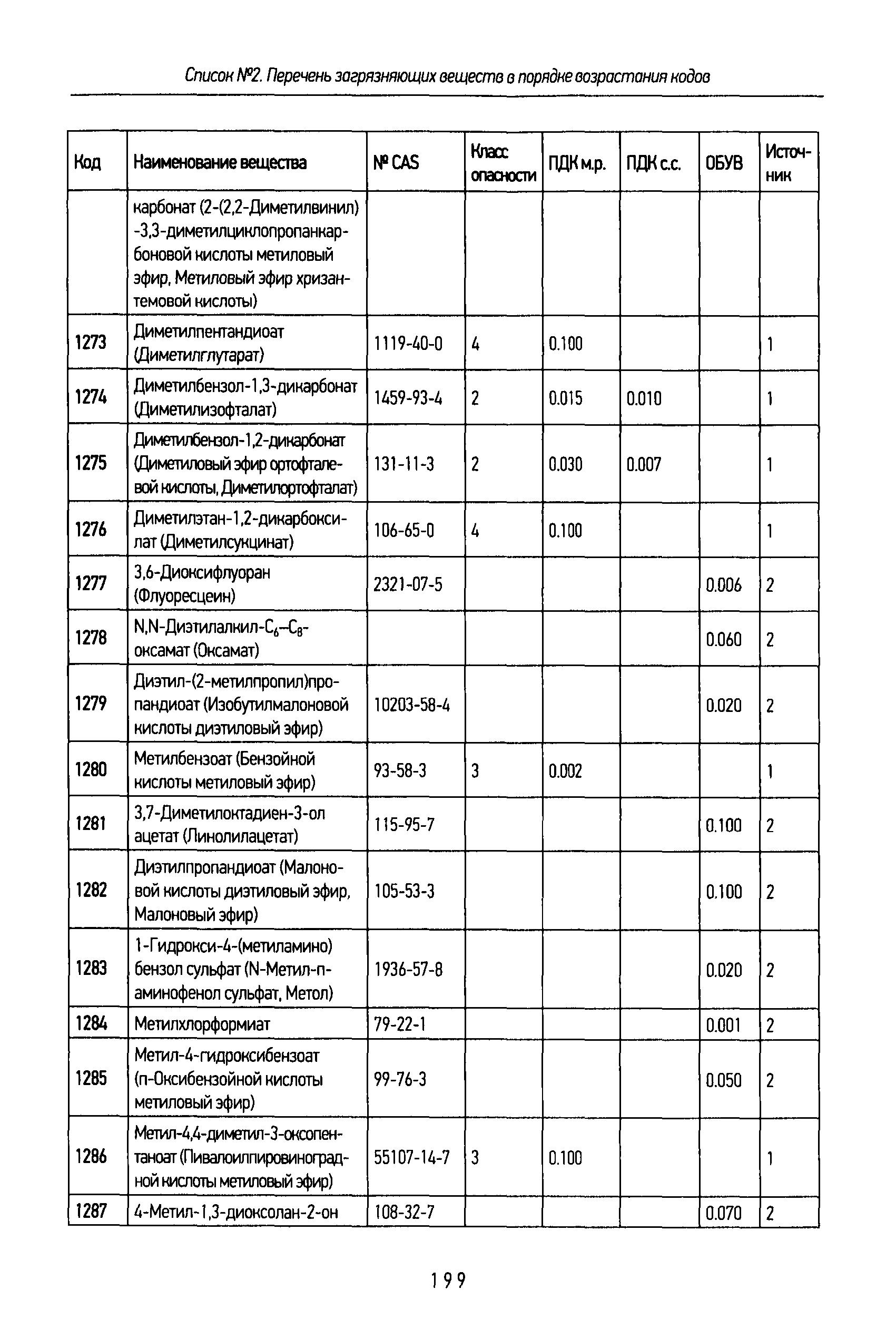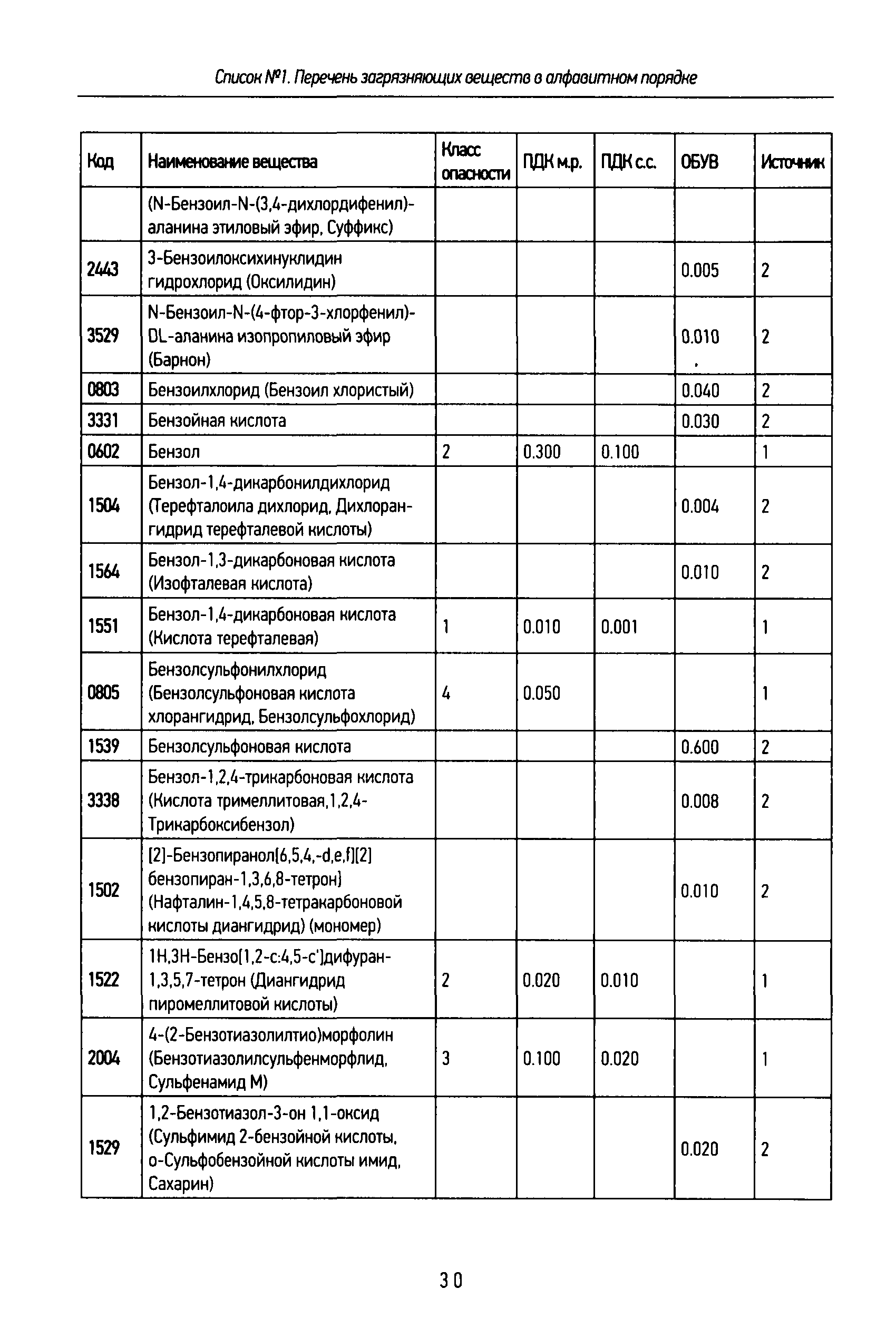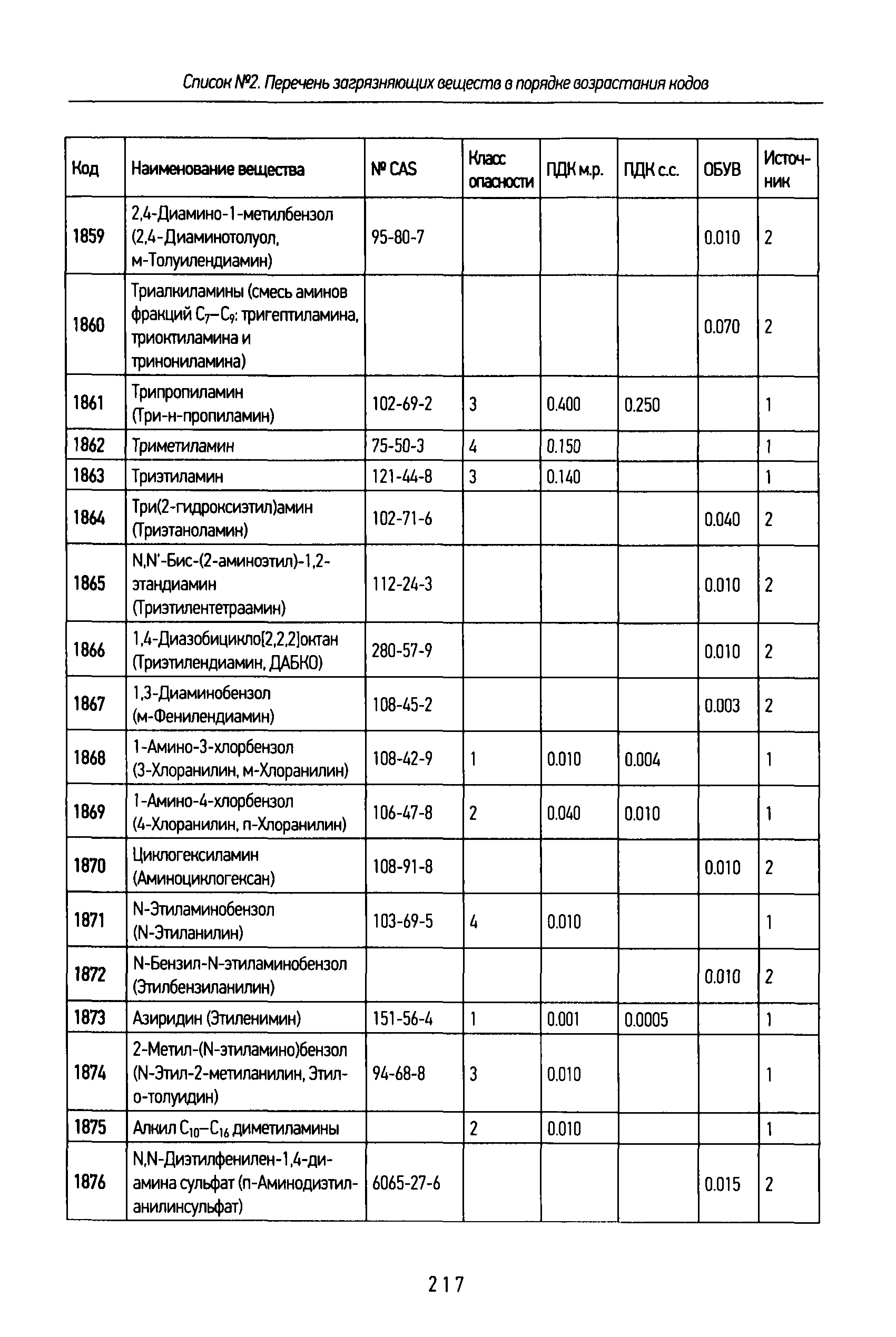 Перечень и коды веществ, загрязняющих атмосферный воздух (8 издание)| Статус: | заменен | | Название рус.: | Перечень и коды веществ, загрязняющих атмосферный воздух (8 издание) | | Дата добавления в базу: | 01.09.2013 | | Дата актуализации: | 01.01.2021 | | Область применения: | Перечень предназначен для территориальных и местных природоохранных органов, органов Роспотребнадзора и Ростехнадзора, предприятий и других организаций, в которых проводятся работы, связанные с охраной окружающей среды | | Оглавление: | 1. Введение 2. Список №1. Перечень загрязняющих веществ в алфавитном порядке 3. Список №2. Перечень загрязняющих веществ в порядке возрастания кодов 4. Список №3. Перечень ЛОС в порядке возрастания кодов 5. Список №4 Указатель основных синонимов, технических, торговых и фирменных названий веществ в алфавитном порядке A. Для веществ с установленными значениями ПДК B. Для веществ с установленными значениями ОБУВ 6. Список №5. Указатель основных синонимов, технических, торговых и фирменных названий веществ в порядке возрастания кодов A. Для веществ с установленными значениями ПДК B. Для веществ с установленными значениями ОБУВ | | Разработан: | НИИ Атмосфера Фирма Интеграл Научно-исследовательский институт экологии человека и окружающей среды им. А.И. Сысина