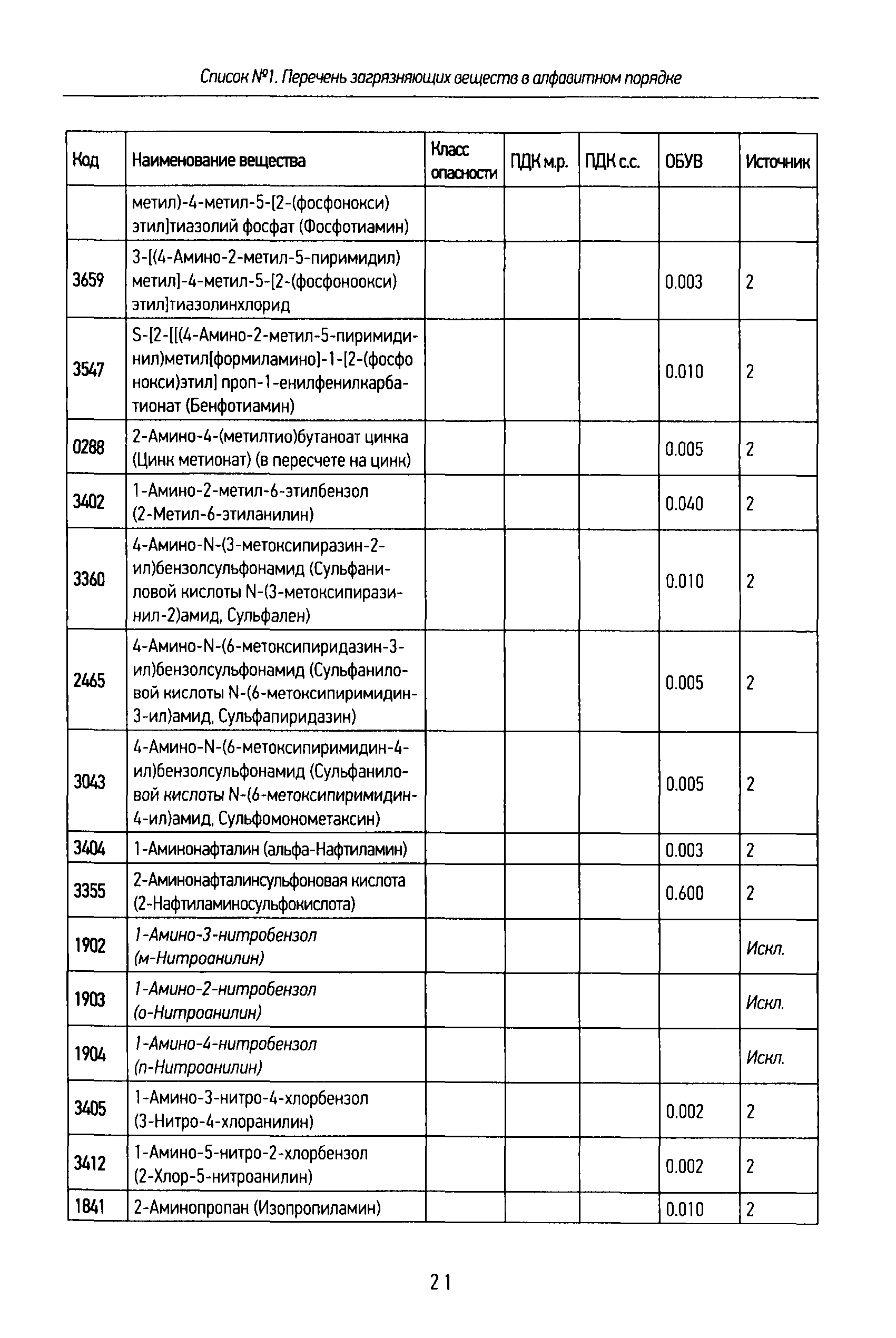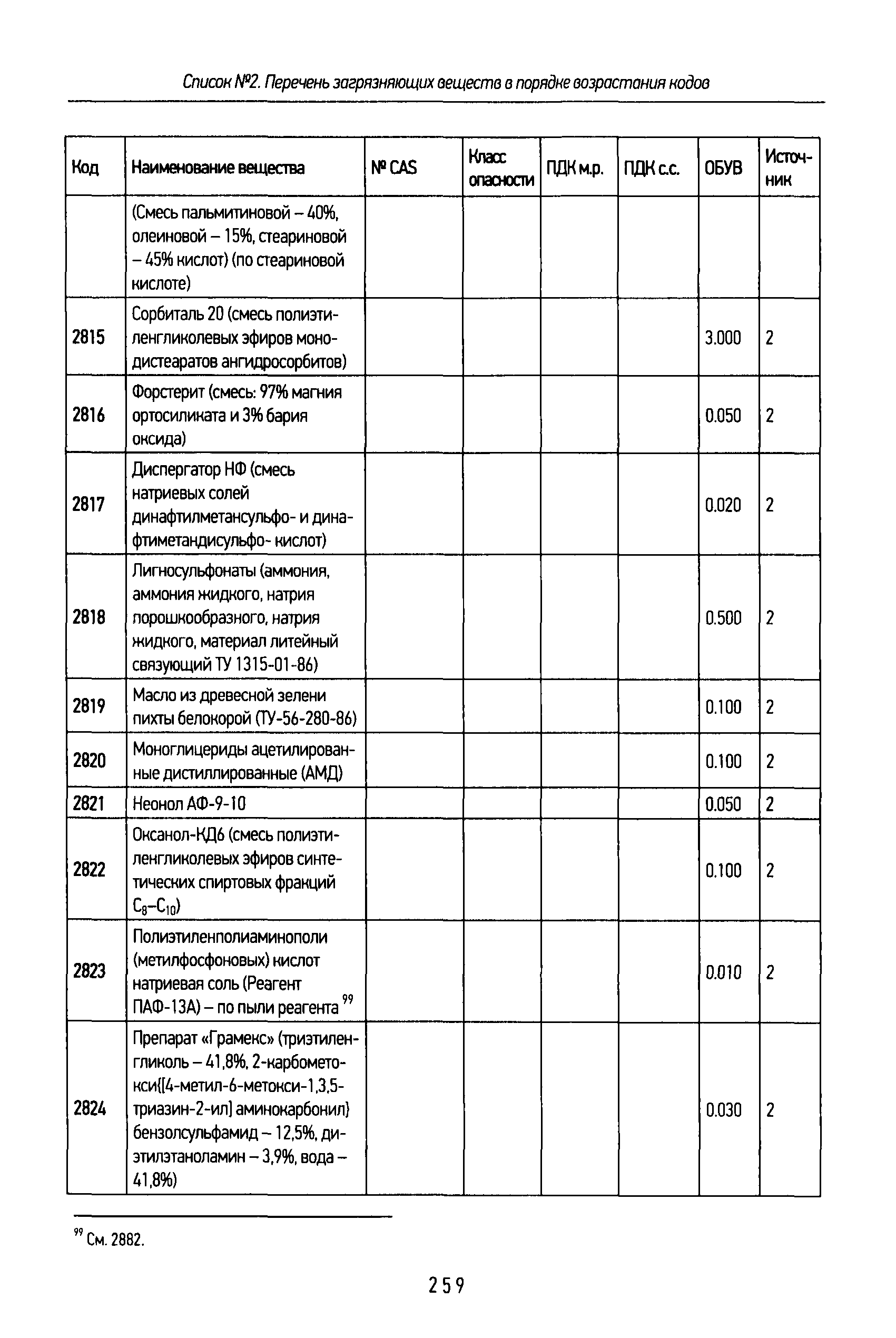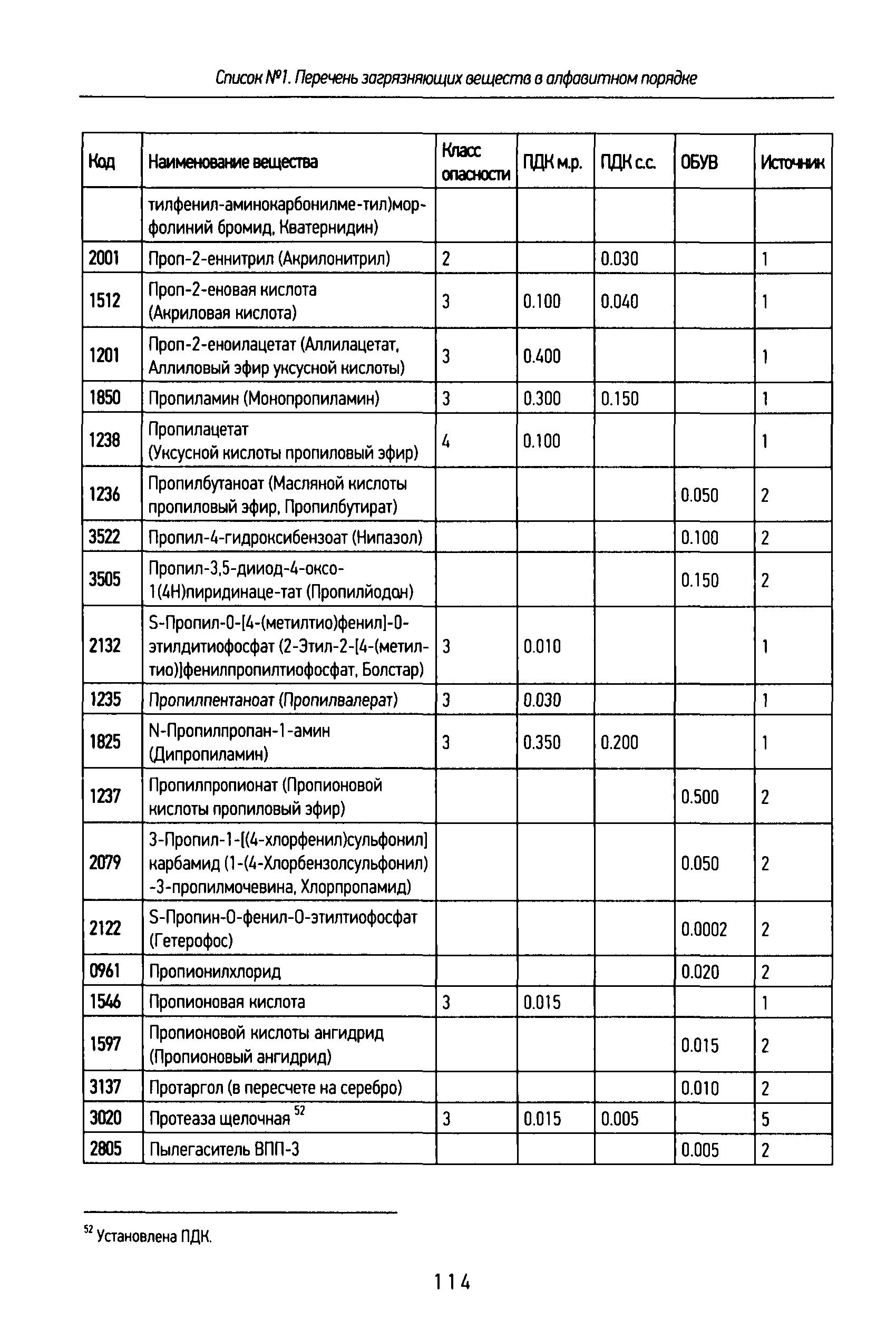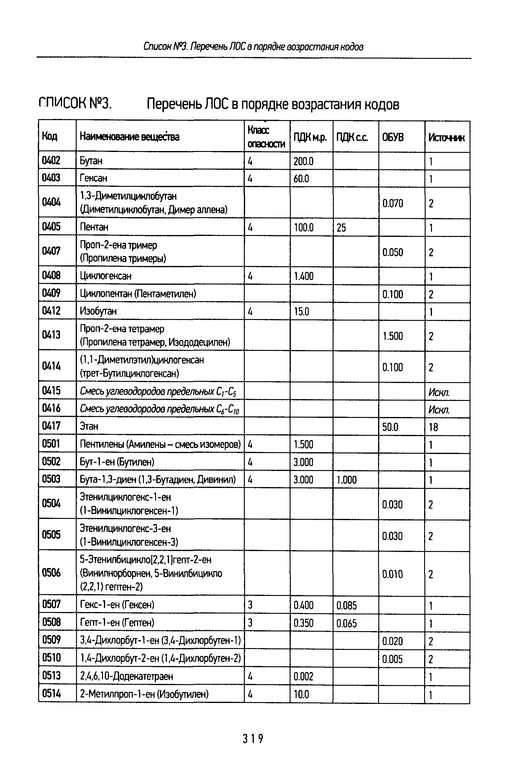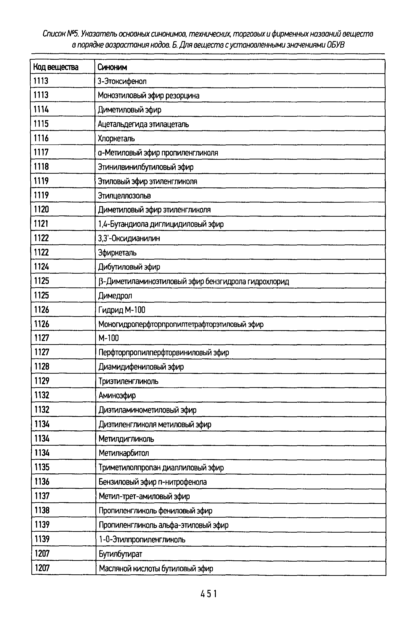 Перечень и коды веществ, загрязняющих атмосферный воздух (8 издание)| Статус: | заменен | | Название рус.: | Перечень и коды веществ, загрязняющих атмосферный воздух (8 издание) | | Дата добавления в базу: | 01.09.2013 | | Дата актуализации: | 01.01.2021 | | Область применения: | Перечень предназначен для территориальных и местных природоохранных органов, органов Роспотребнадзора и Ростехнадзора, предприятий и других организаций, в которых проводятся работы, связанные с охраной окружающей среды | | Оглавление: | 1. Введение 2. Список №1. Перечень загрязняющих веществ в алфавитном порядке 3. Список №2. Перечень загрязняющих веществ в порядке возрастания кодов 4. Список №3. Перечень ЛОС в порядке возрастания кодов 5. Список №4 Указатель основных синонимов, технических, торговых и фирменных названий веществ в алфавитном порядке A. Для веществ с установленными значениями ПДК B. Для веществ с установленными значениями ОБУВ 6. Список №5. Указатель основных синонимов, технических, торговых и фирменных названий веществ в порядке возрастания кодов A. Для веществ с установленными значениями ПДК B. Для веществ с установленными значениями ОБУВ | | Разработан: | НИИ Атмосфера Фирма Интеграл Научно-исследовательский институт экологии человека и окружающей среды им. А.И. Сысина
