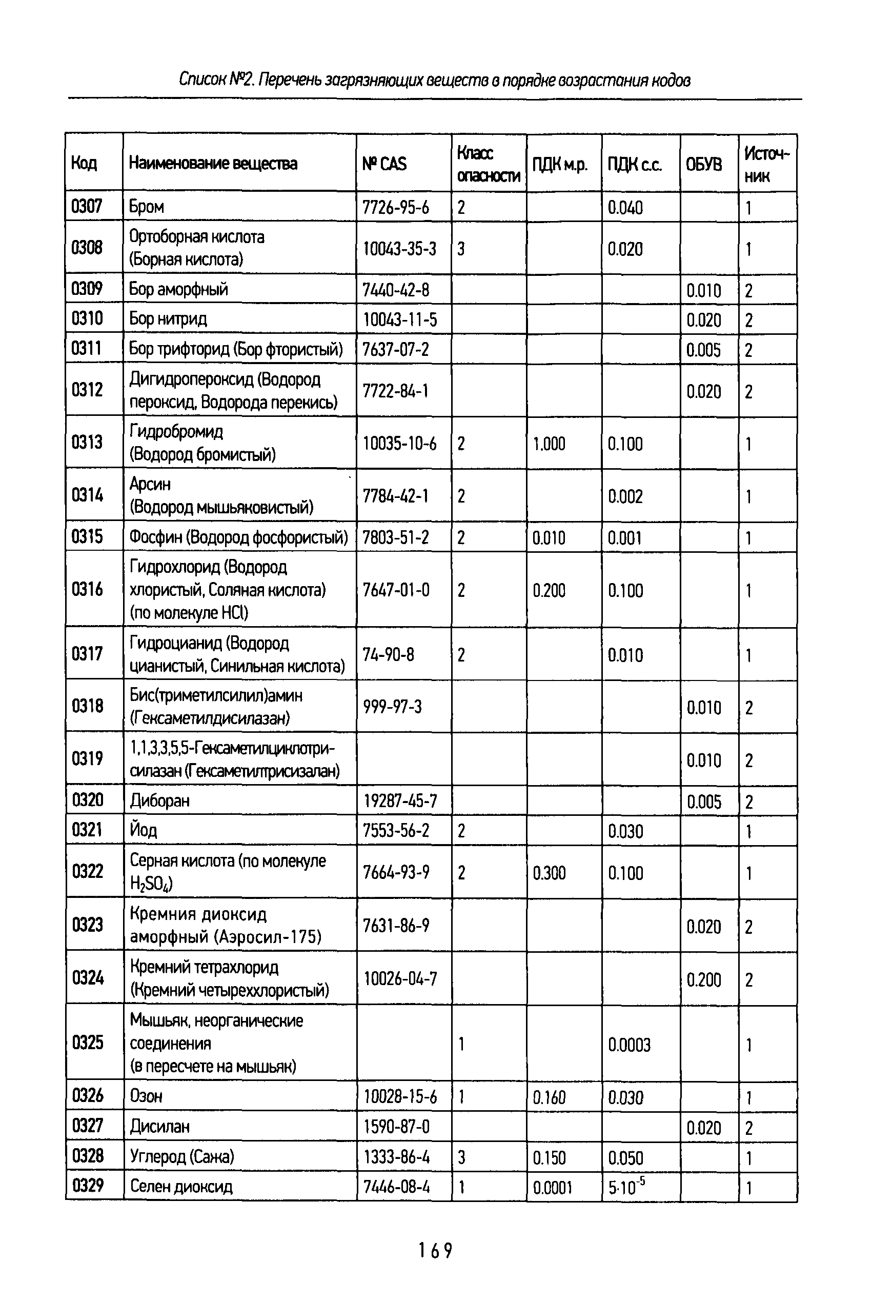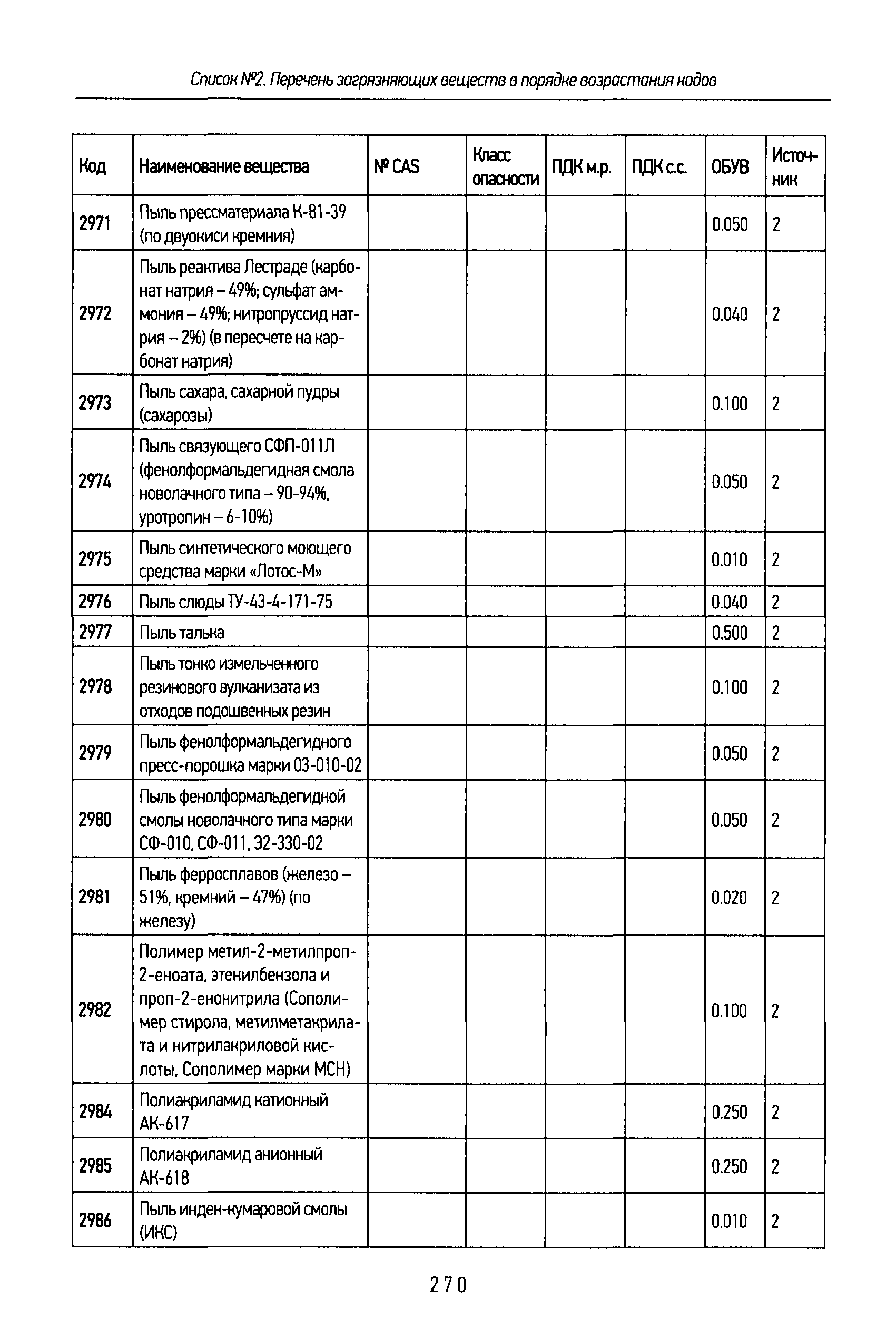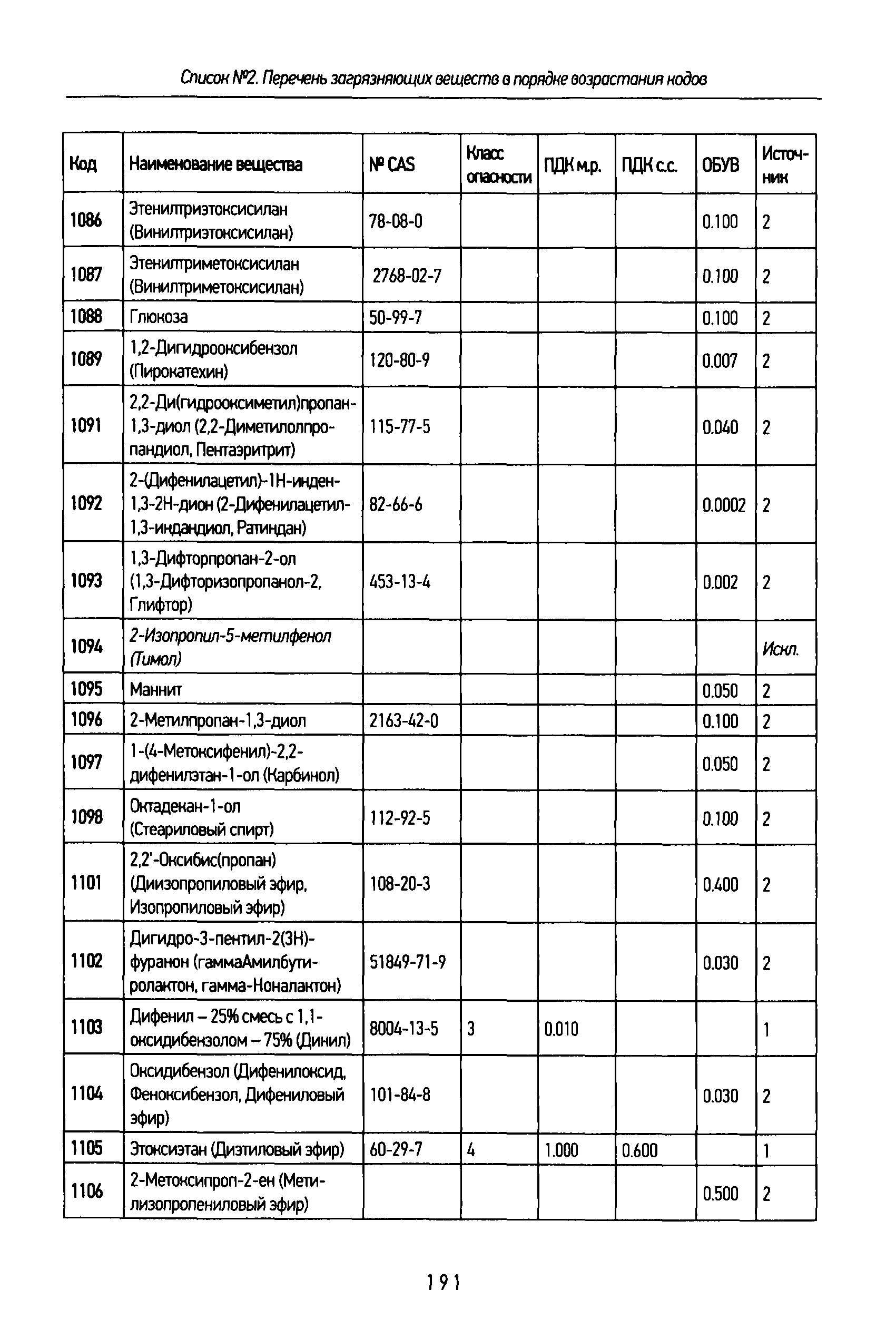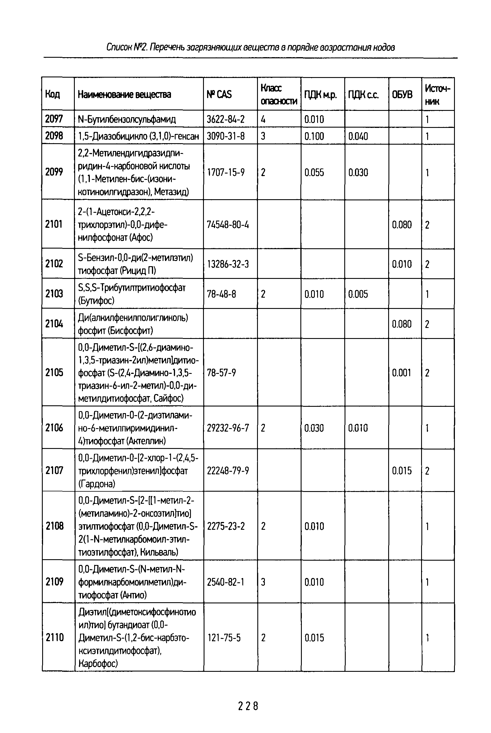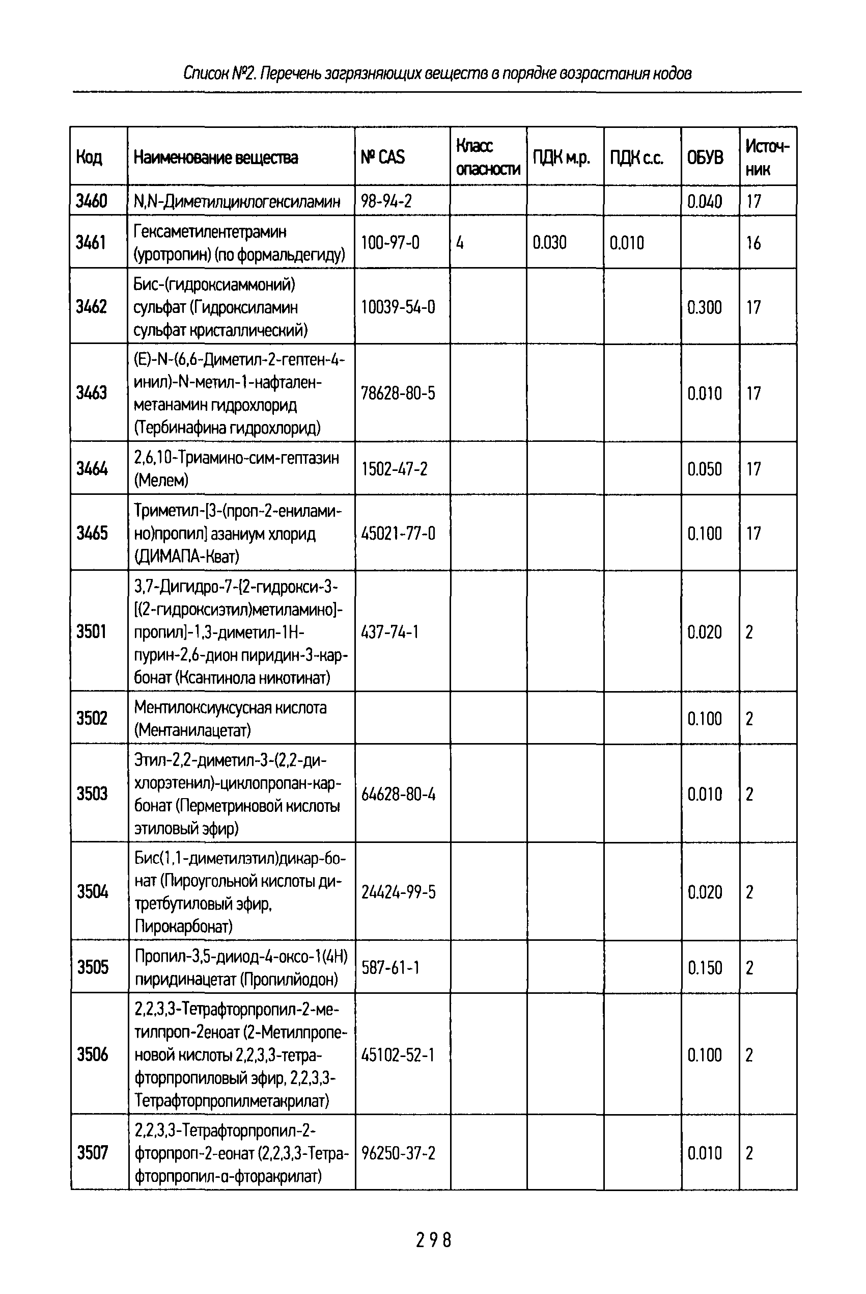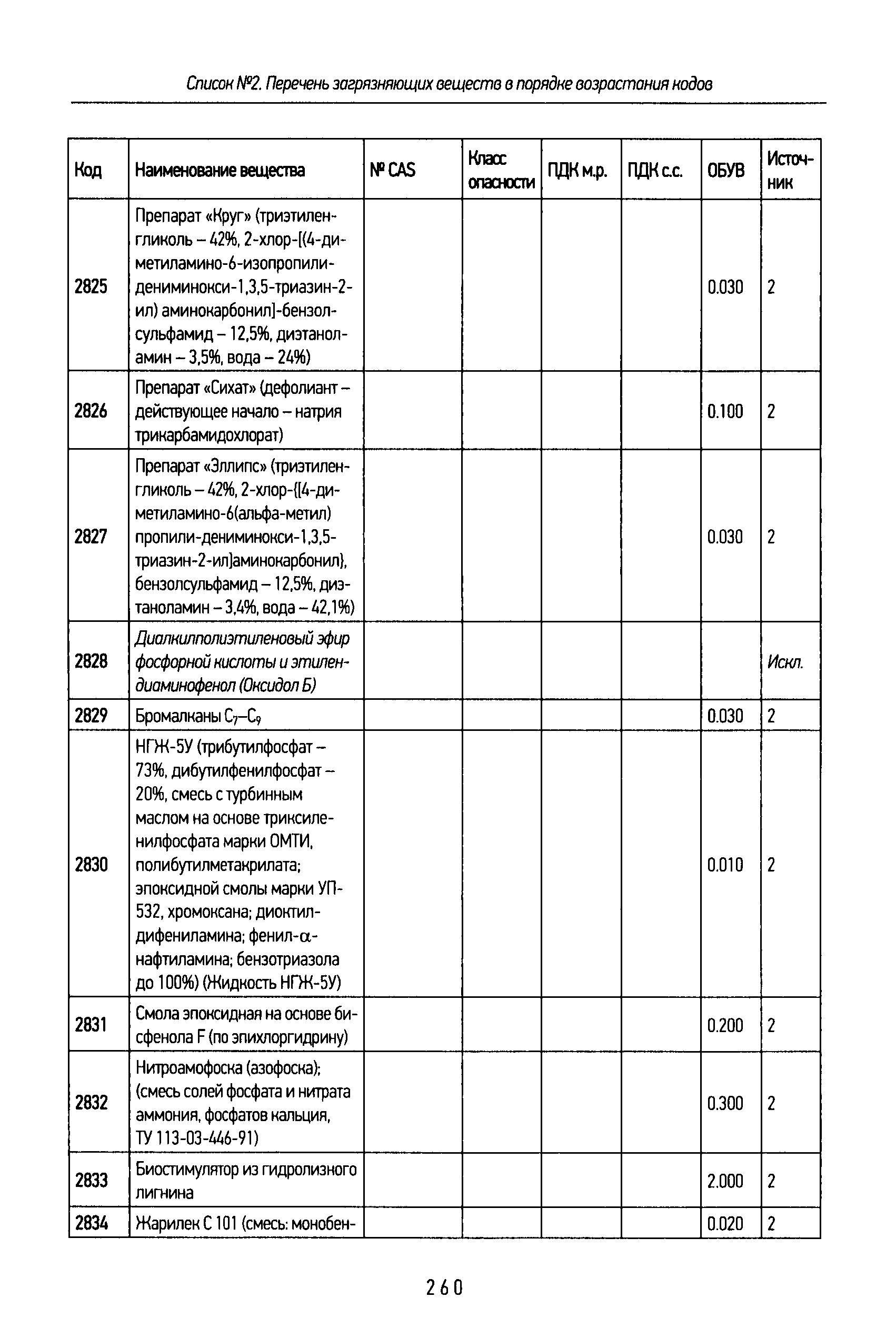 Перечень и коды веществ, загрязняющих атмосферный воздух (8 издание)| Статус: | заменен | | Название рус.: | Перечень и коды веществ, загрязняющих атмосферный воздух (8 издание) | | Дата добавления в базу: | 01.09.2013 | | Дата актуализации: | 01.01.2021 | | Область применения: | Перечень предназначен для территориальных и местных природоохранных органов, органов Роспотребнадзора и Ростехнадзора, предприятий и других организаций, в которых проводятся работы, связанные с охраной окружающей среды | | Оглавление: | 1. Введение 2. Список №1. Перечень загрязняющих веществ в алфавитном порядке 3. Список №2. Перечень загрязняющих веществ в порядке возрастания кодов 4. Список №3. Перечень ЛОС в порядке возрастания кодов 5. Список №4 Указатель основных синонимов, технических, торговых и фирменных названий веществ в алфавитном порядке A. Для веществ с установленными значениями ПДК B. Для веществ с установленными значениями ОБУВ 6. Список №5. Указатель основных синонимов, технических, торговых и фирменных названий веществ в порядке возрастания кодов A. Для веществ с установленными значениями ПДК B. Для веществ с установленными значениями ОБУВ | | Разработан: | НИИ Атмосфера Фирма Интеграл Научно-исследовательский институт экологии человека и окружающей среды им. А.И. Сысина