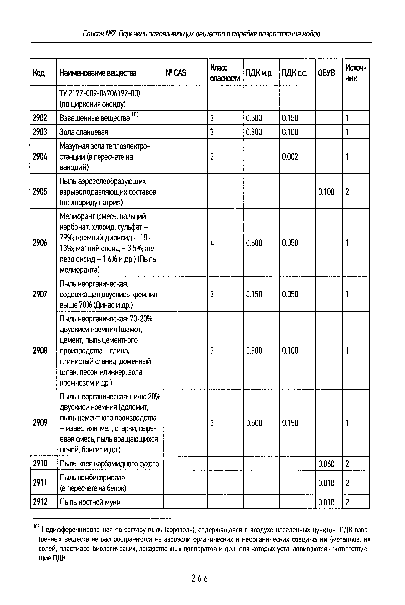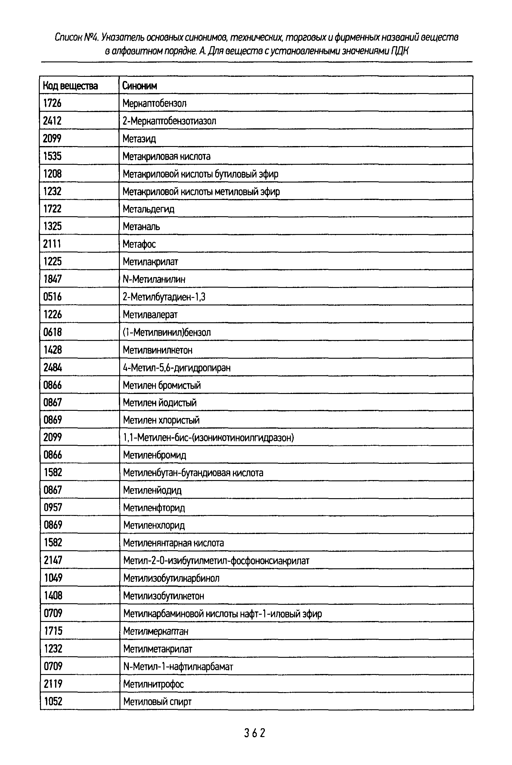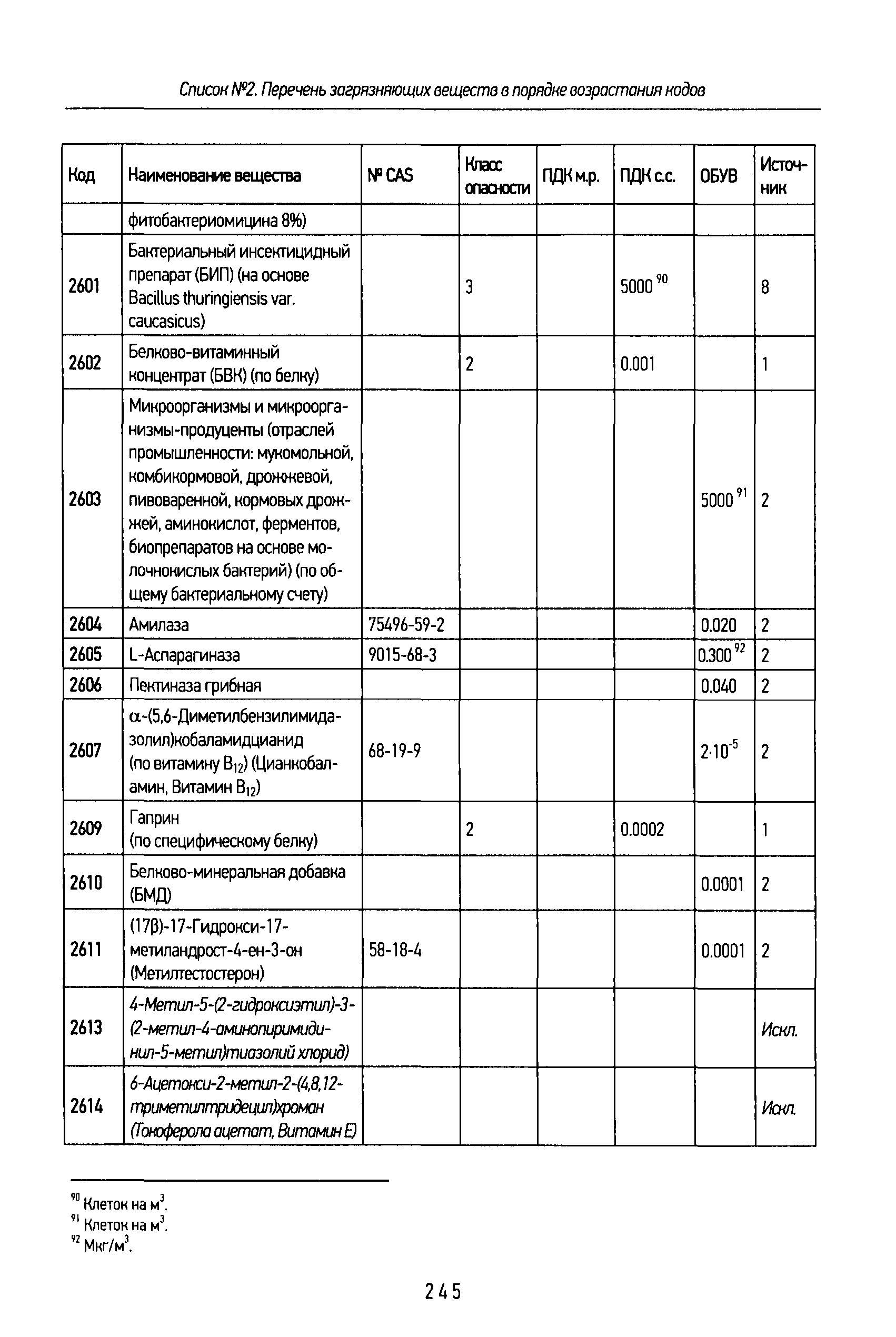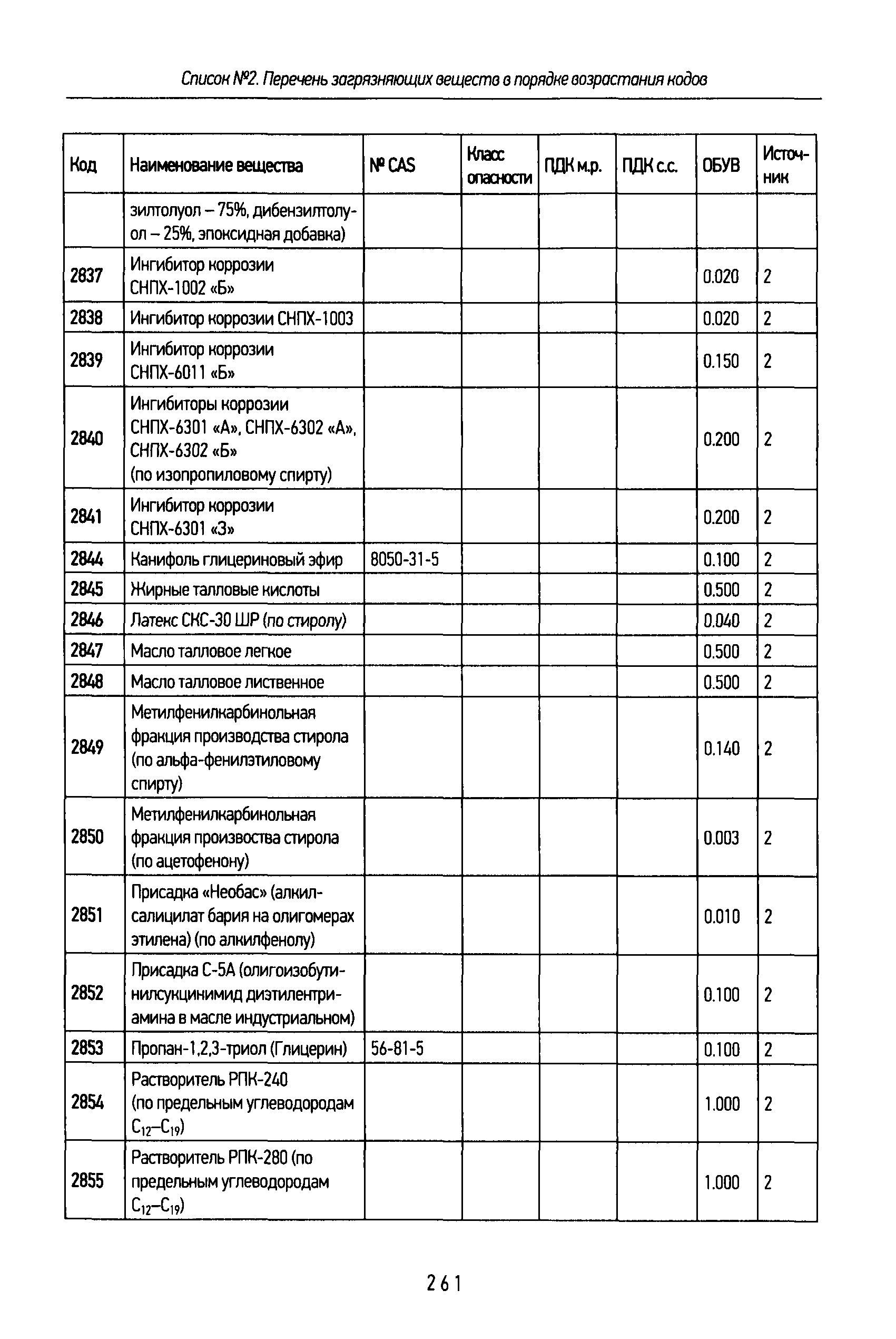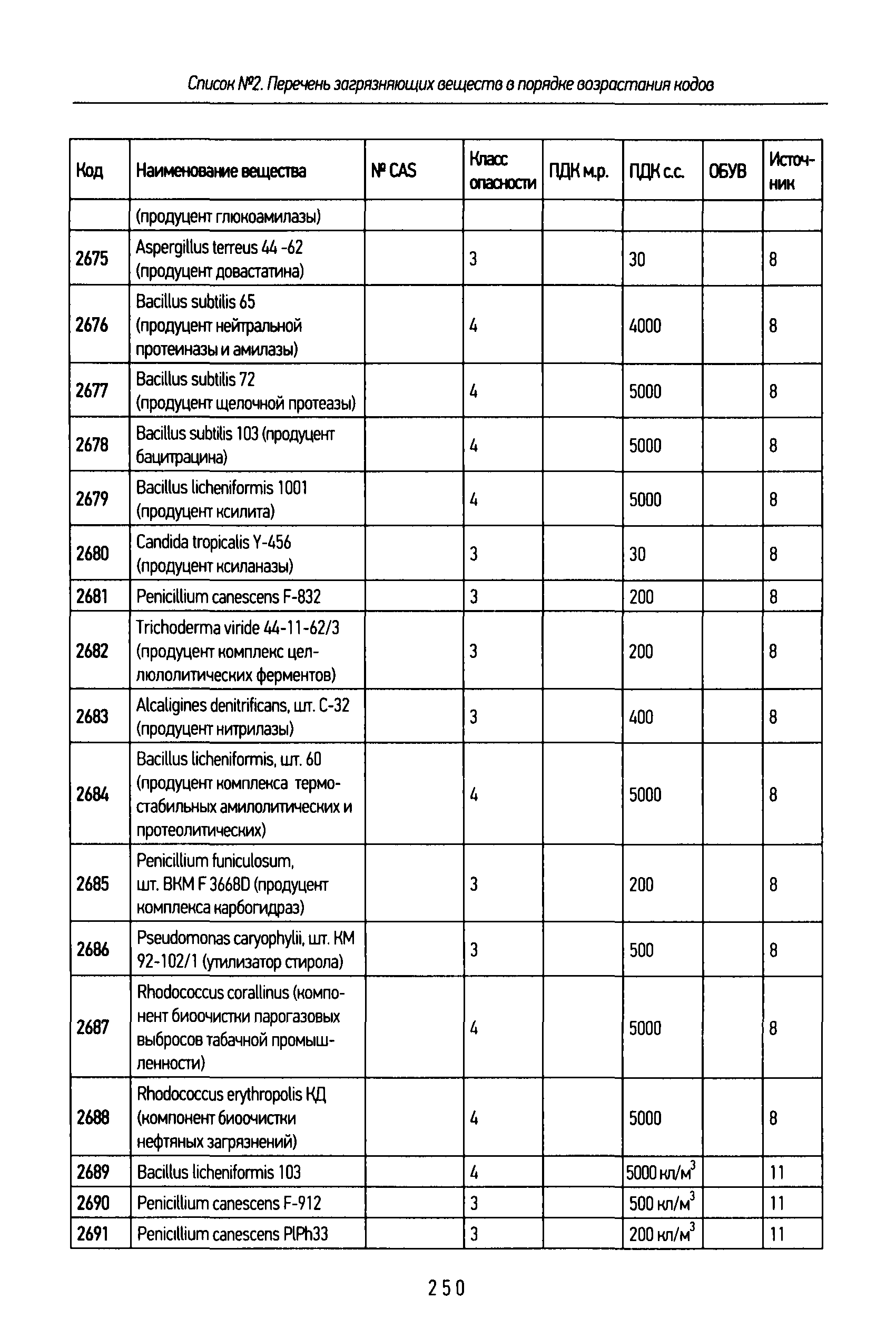 Перечень и коды веществ, загрязняющих атмосферный воздух (8 издание)| Статус: | заменен | | Название рус.: | Перечень и коды веществ, загрязняющих атмосферный воздух (8 издание) | | Дата добавления в базу: | 01.09.2013 | | Дата актуализации: | 01.01.2021 | | Область применения: | Перечень предназначен для территориальных и местных природоохранных органов, органов Роспотребнадзора и Ростехнадзора, предприятий и других организаций, в которых проводятся работы, связанные с охраной окружающей среды | | Оглавление: | 1. Введение 2. Список №1. Перечень загрязняющих веществ в алфавитном порядке 3. Список №2. Перечень загрязняющих веществ в порядке возрастания кодов 4. Список №3. Перечень ЛОС в порядке возрастания кодов 5. Список №4 Указатель основных синонимов, технических, торговых и фирменных названий веществ в алфавитном порядке A. Для веществ с установленными значениями ПДК B. Для веществ с установленными значениями ОБУВ 6. Список №5. Указатель основных синонимов, технических, торговых и фирменных названий веществ в порядке возрастания кодов A. Для веществ с установленными значениями ПДК B. Для веществ с установленными значениями ОБУВ | | Разработан: | НИИ Атмосфера Фирма Интеграл Научно-исследовательский институт экологии человека и окружающей среды им. А.И. Сысина
