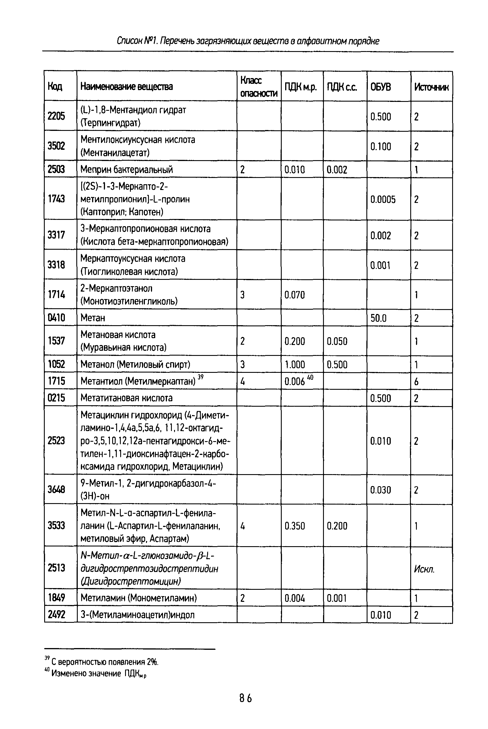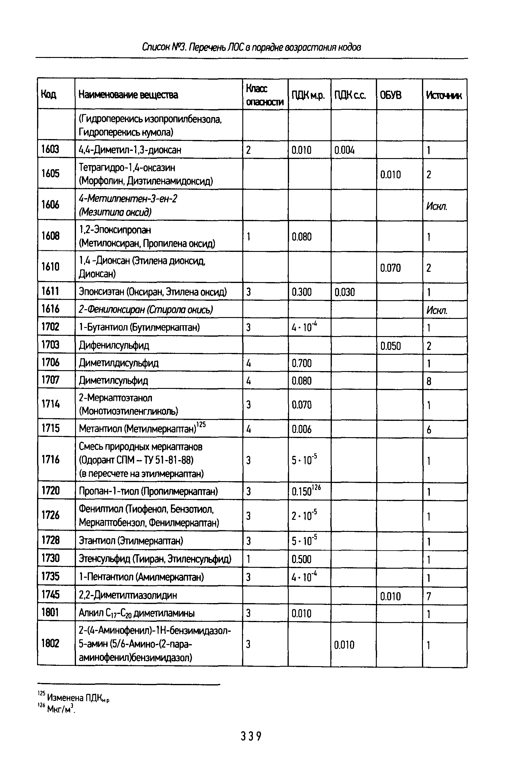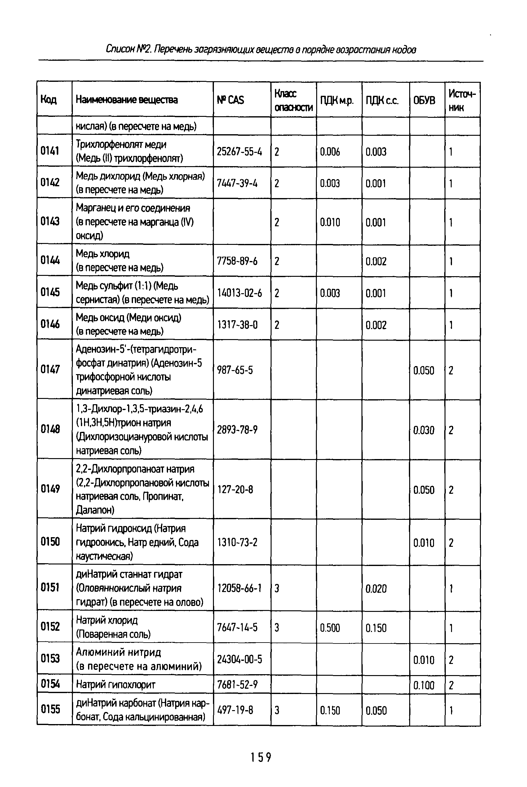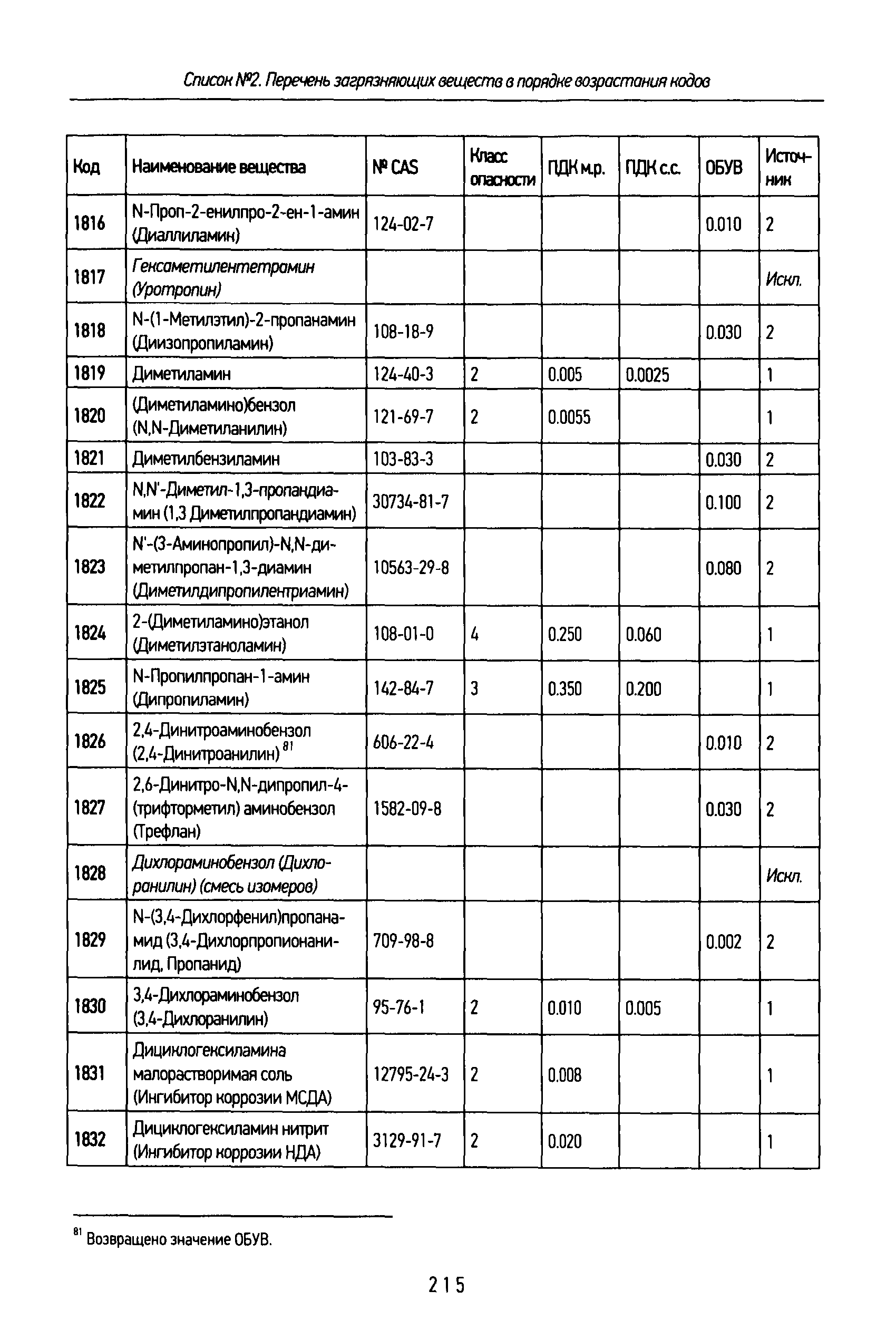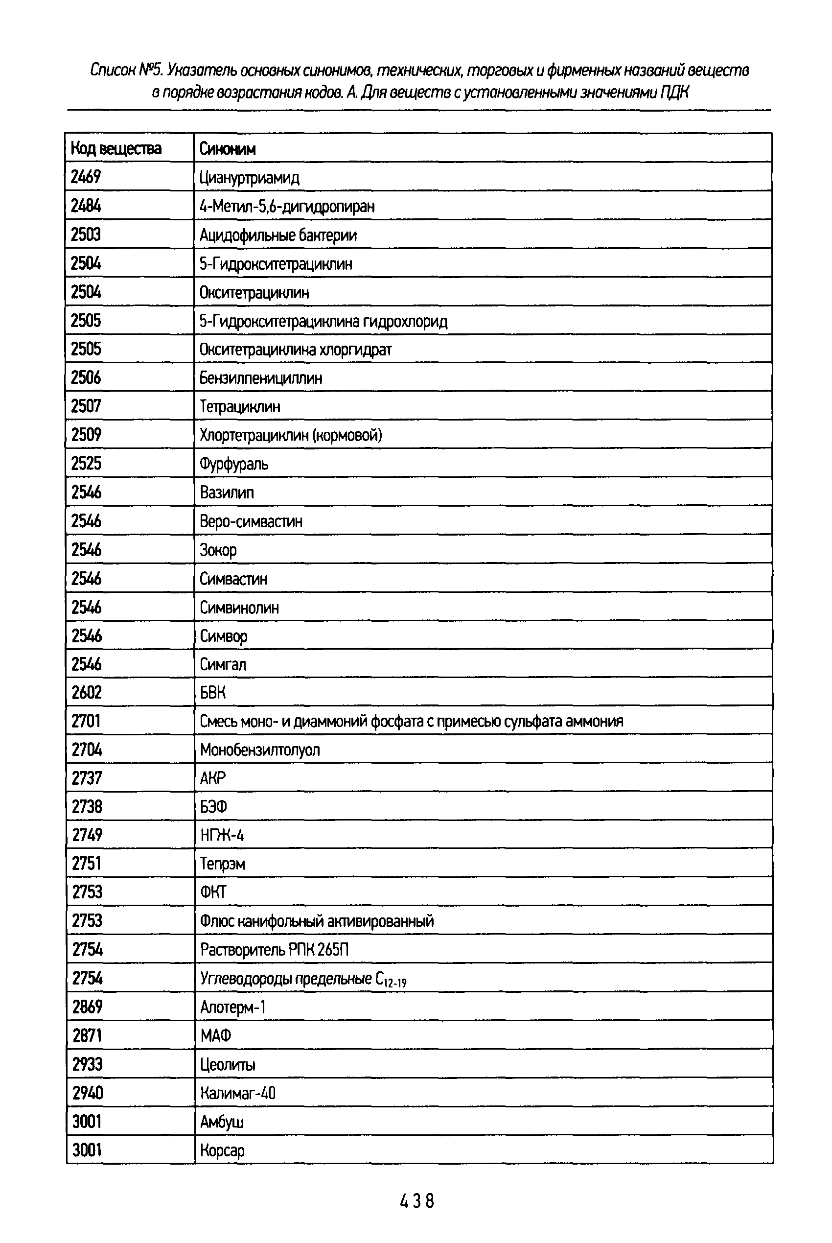 Перечень и коды веществ, загрязняющих атмосферный воздух (8 издание)| Статус: | заменен | | Название рус.: | Перечень и коды веществ, загрязняющих атмосферный воздух (8 издание) | | Дата добавления в базу: | 01.09.2013 | | Дата актуализации: | 01.01.2021 | | Область применения: | Перечень предназначен для территориальных и местных природоохранных органов, органов Роспотребнадзора и Ростехнадзора, предприятий и других организаций, в которых проводятся работы, связанные с охраной окружающей среды | | Оглавление: | 1. Введение 2. Список №1. Перечень загрязняющих веществ в алфавитном порядке 3. Список №2. Перечень загрязняющих веществ в порядке возрастания кодов 4. Список №3. Перечень ЛОС в порядке возрастания кодов 5. Список №4 Указатель основных синонимов, технических, торговых и фирменных названий веществ в алфавитном порядке A. Для веществ с установленными значениями ПДК B. Для веществ с установленными значениями ОБУВ 6. Список №5. Указатель основных синонимов, технических, торговых и фирменных названий веществ в порядке возрастания кодов A. Для веществ с установленными значениями ПДК B. Для веществ с установленными значениями ОБУВ | | Разработан: | НИИ Атмосфера Фирма Интеграл Научно-исследовательский институт экологии человека и окружающей среды им. А.И. Сысина