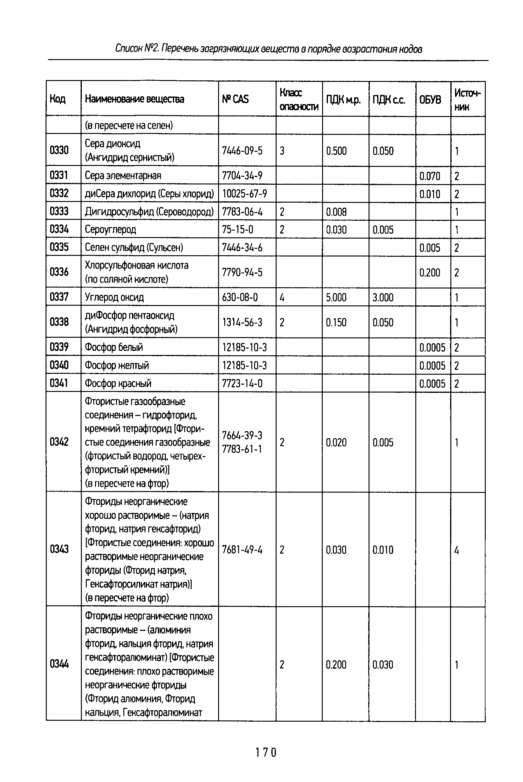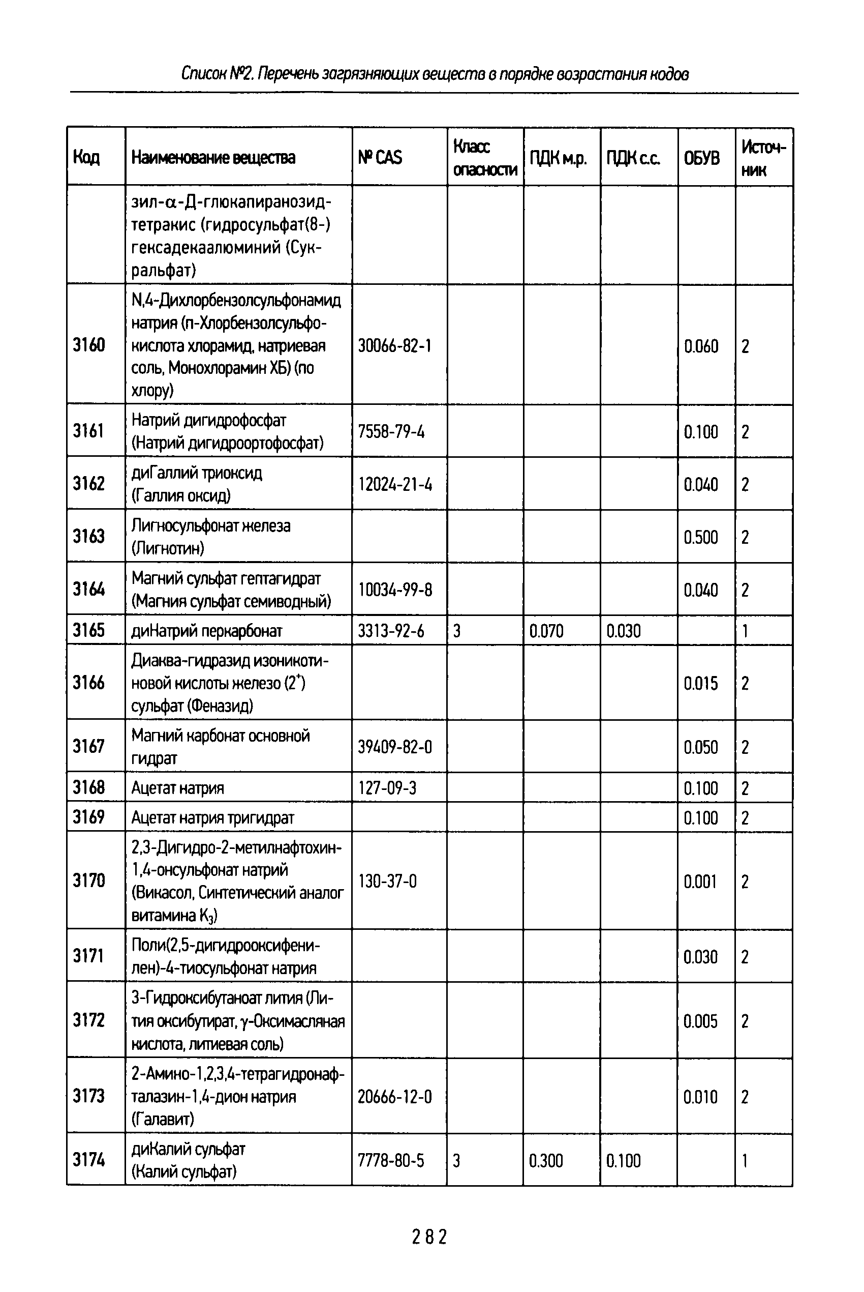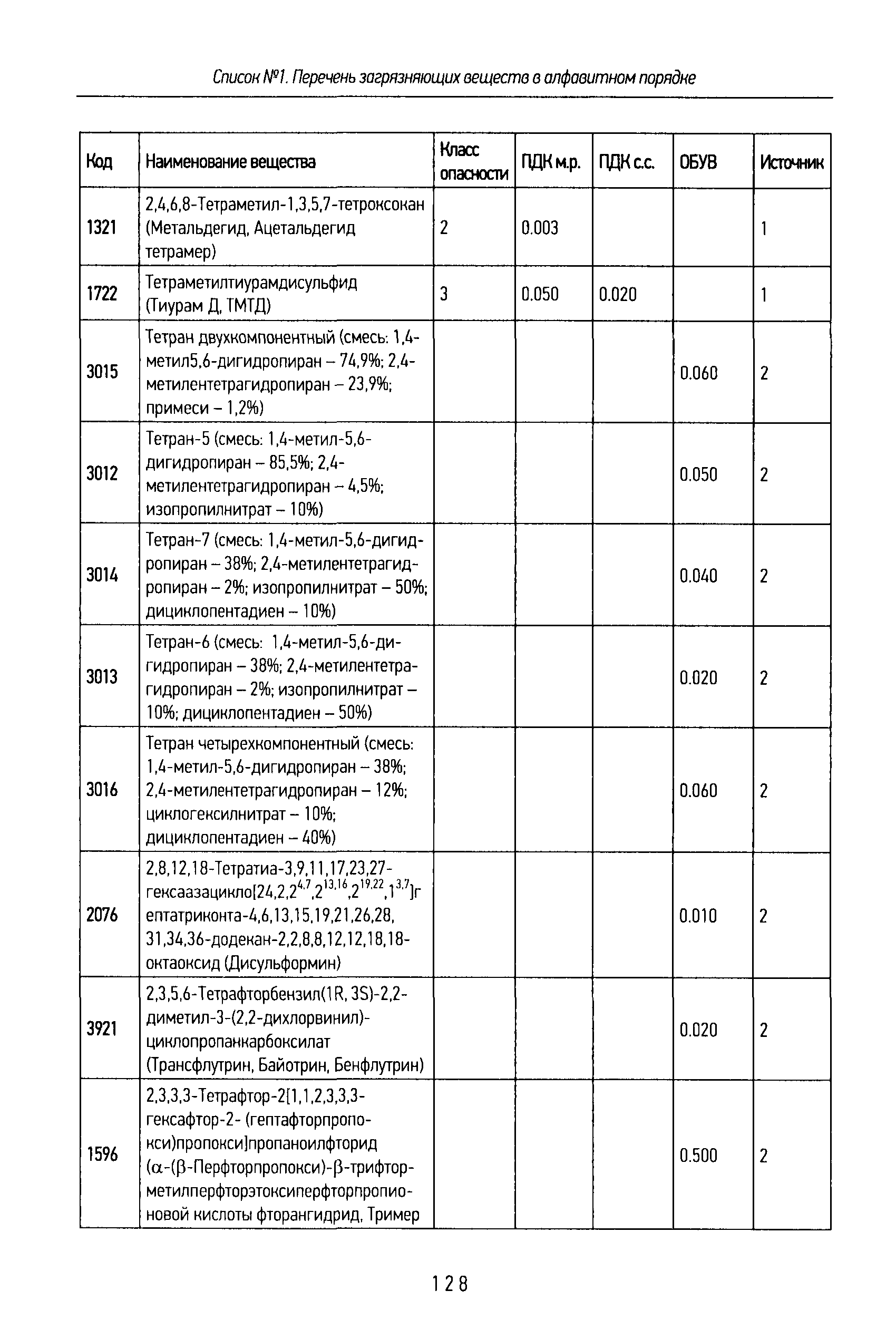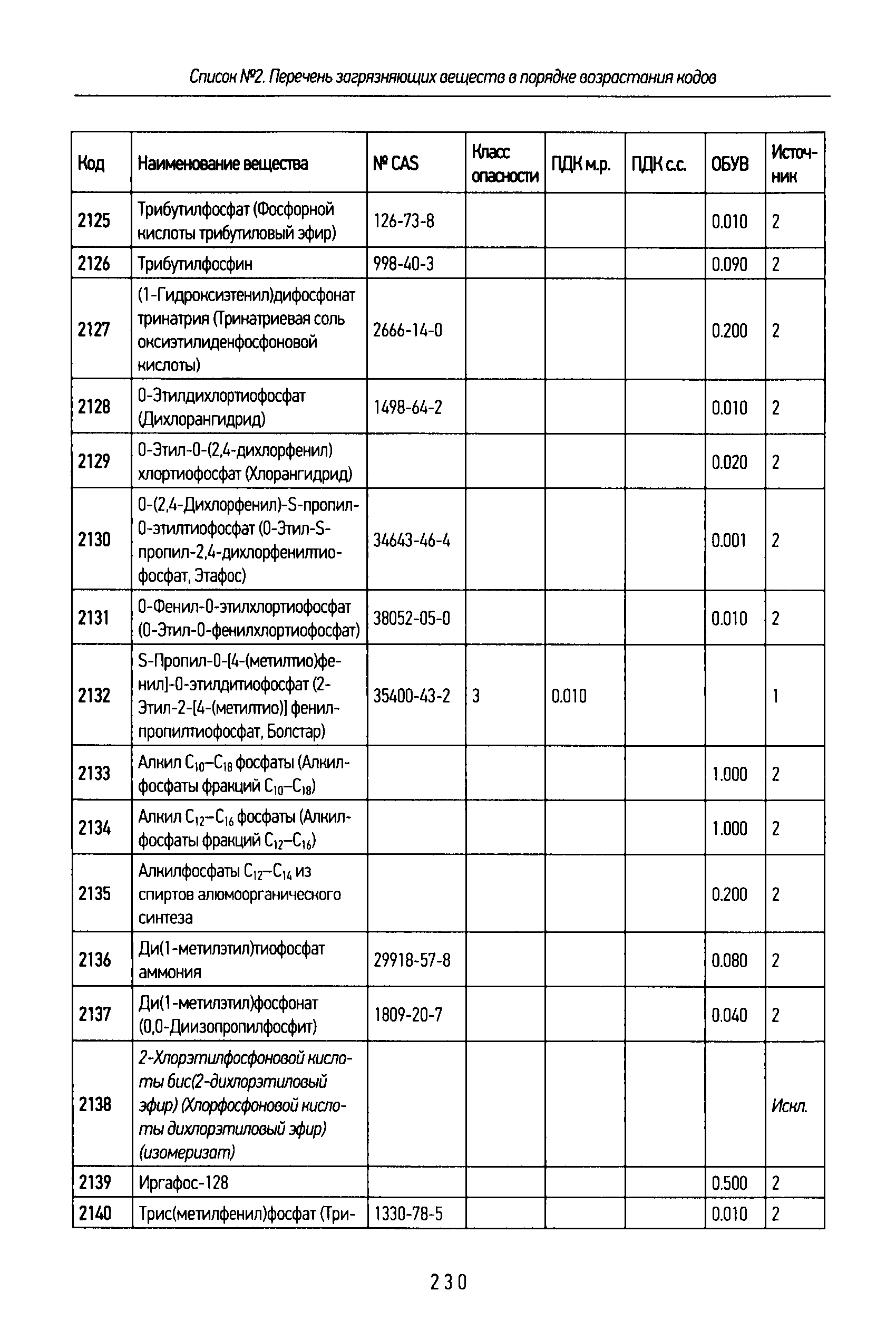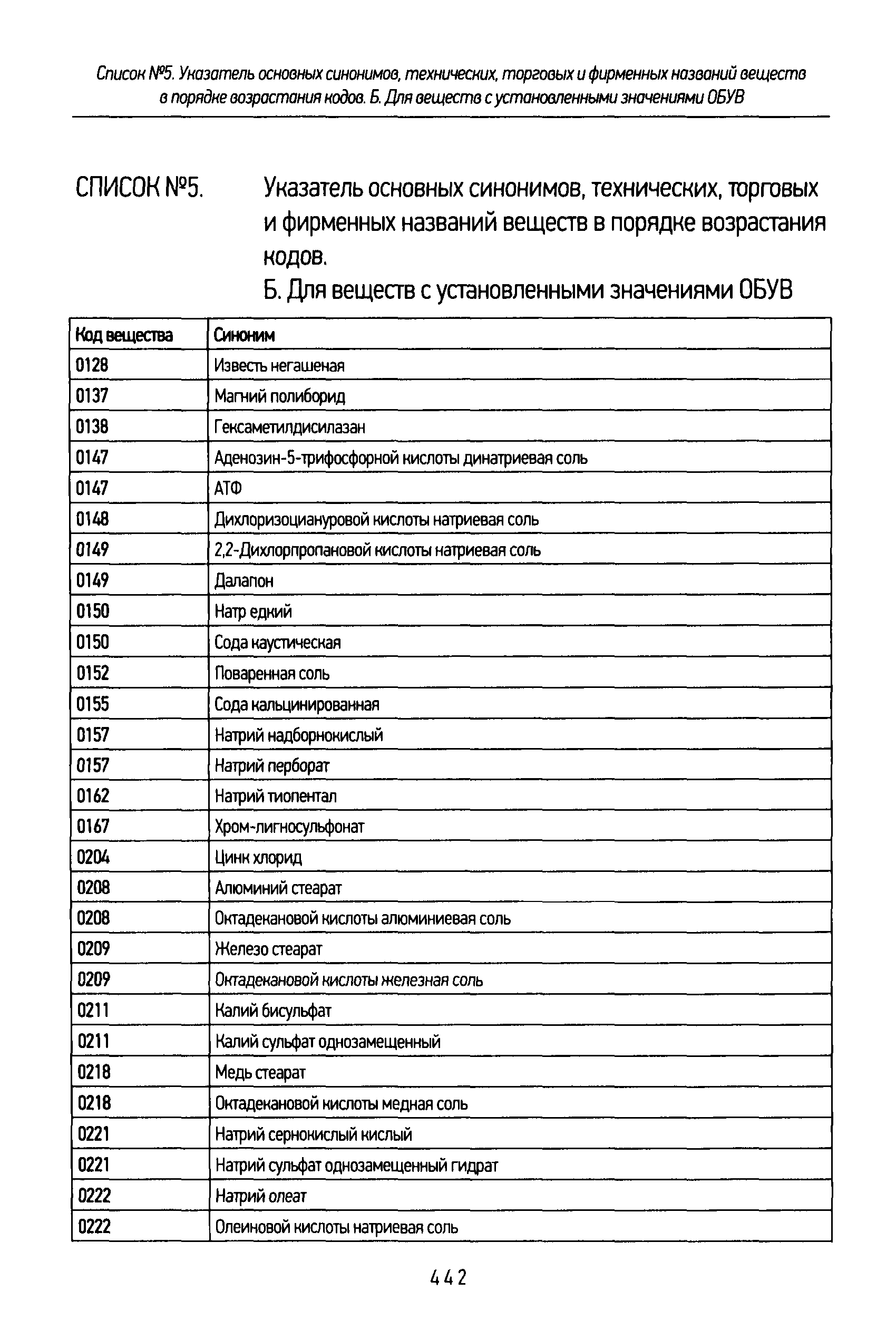 Перечень и коды веществ, загрязняющих атмосферный воздух (8 издание)| Статус: | заменен | | Название рус.: | Перечень и коды веществ, загрязняющих атмосферный воздух (8 издание) | | Дата добавления в базу: | 01.09.2013 | | Дата актуализации: | 01.01.2021 | | Область применения: | Перечень предназначен для территориальных и местных природоохранных органов, органов Роспотребнадзора и Ростехнадзора, предприятий и других организаций, в которых проводятся работы, связанные с охраной окружающей среды | | Оглавление: | 1. Введение 2. Список №1. Перечень загрязняющих веществ в алфавитном порядке 3. Список №2. Перечень загрязняющих веществ в порядке возрастания кодов 4. Список №3. Перечень ЛОС в порядке возрастания кодов 5. Список №4 Указатель основных синонимов, технических, торговых и фирменных названий веществ в алфавитном порядке A. Для веществ с установленными значениями ПДК B. Для веществ с установленными значениями ОБУВ 6. Список №5. Указатель основных синонимов, технических, торговых и фирменных названий веществ в порядке возрастания кодов A. Для веществ с установленными значениями ПДК B. Для веществ с установленными значениями ОБУВ | | Разработан: | НИИ Атмосфера Фирма Интеграл Научно-исследовательский институт экологии человека и окружающей среды им. А.И. Сысина