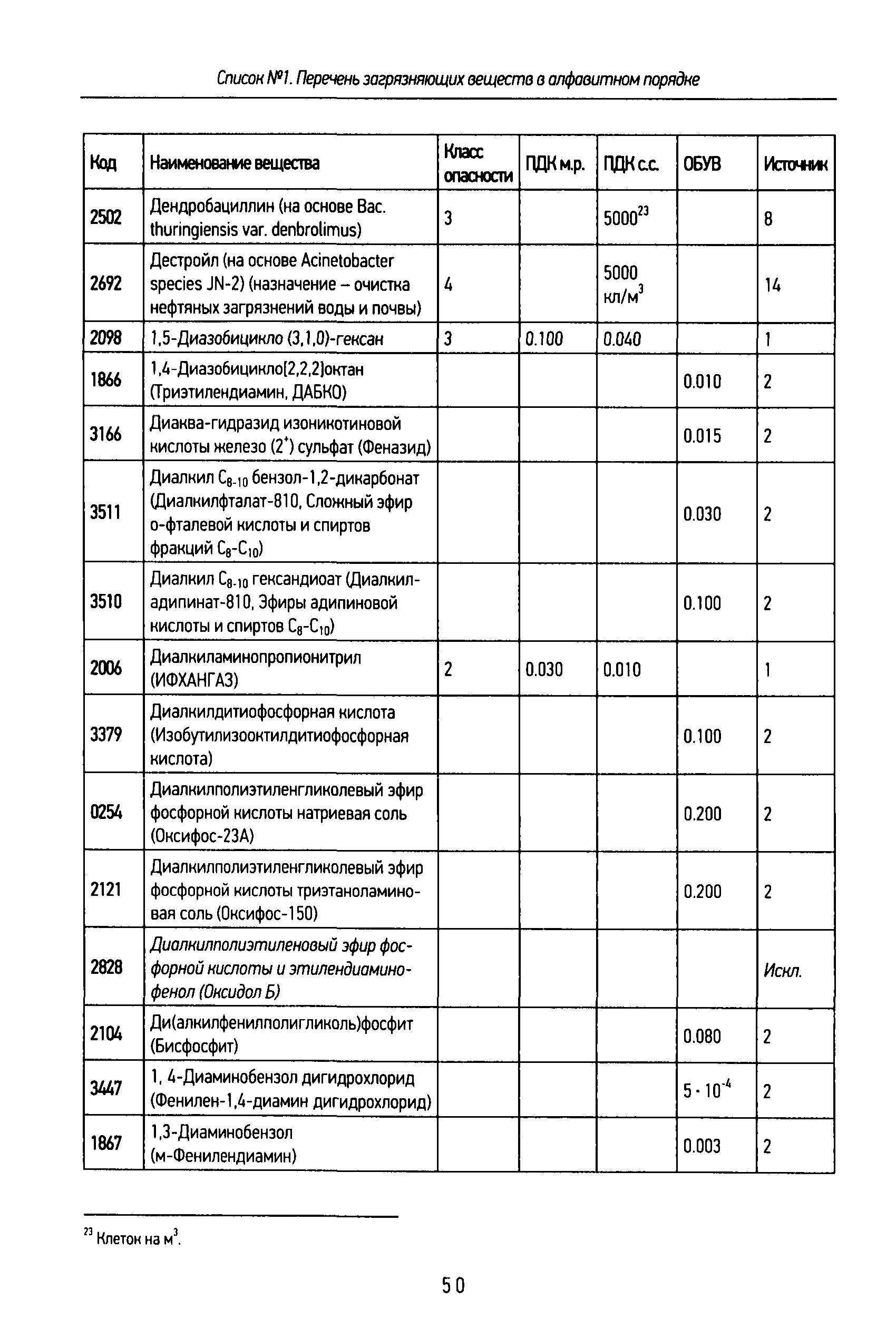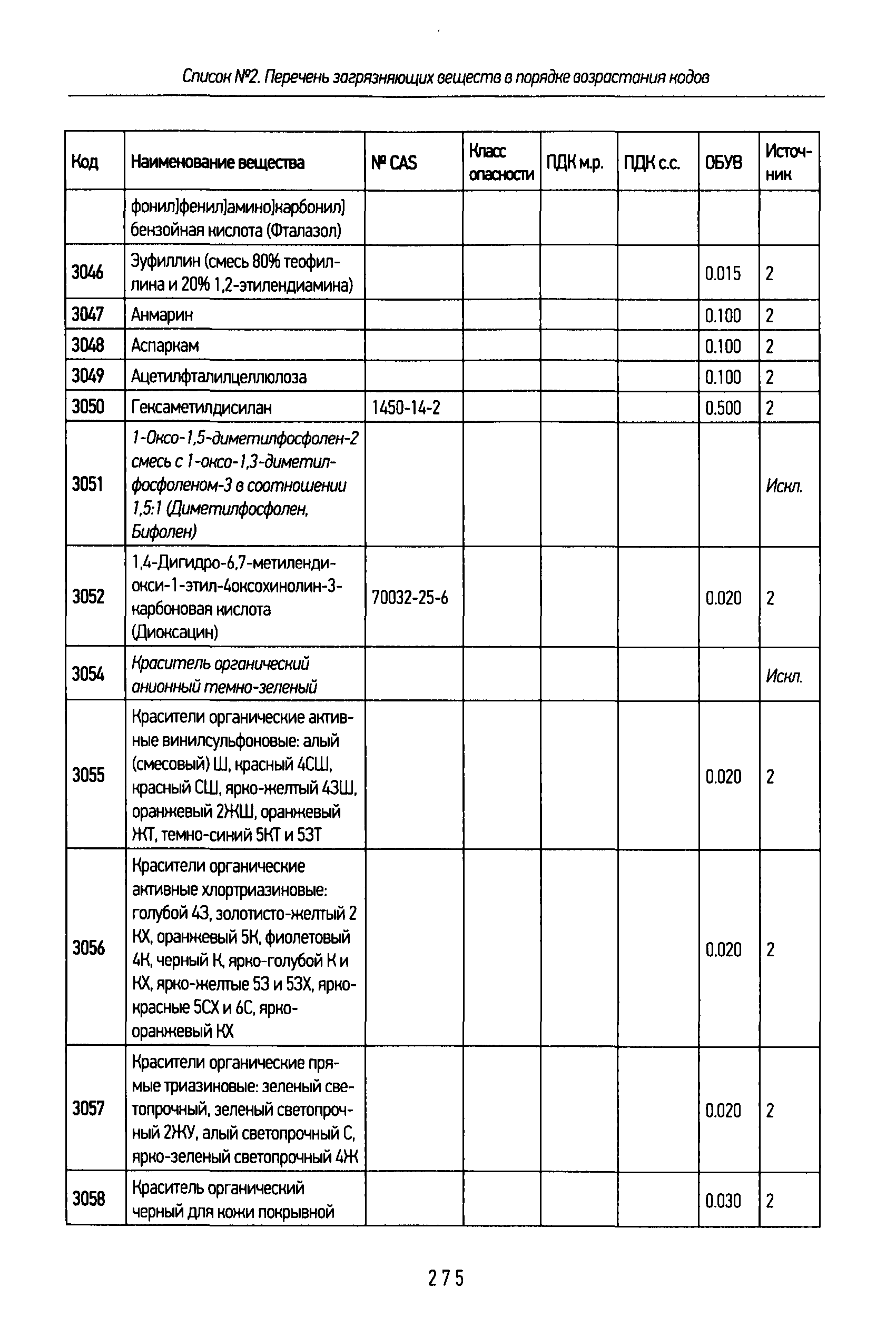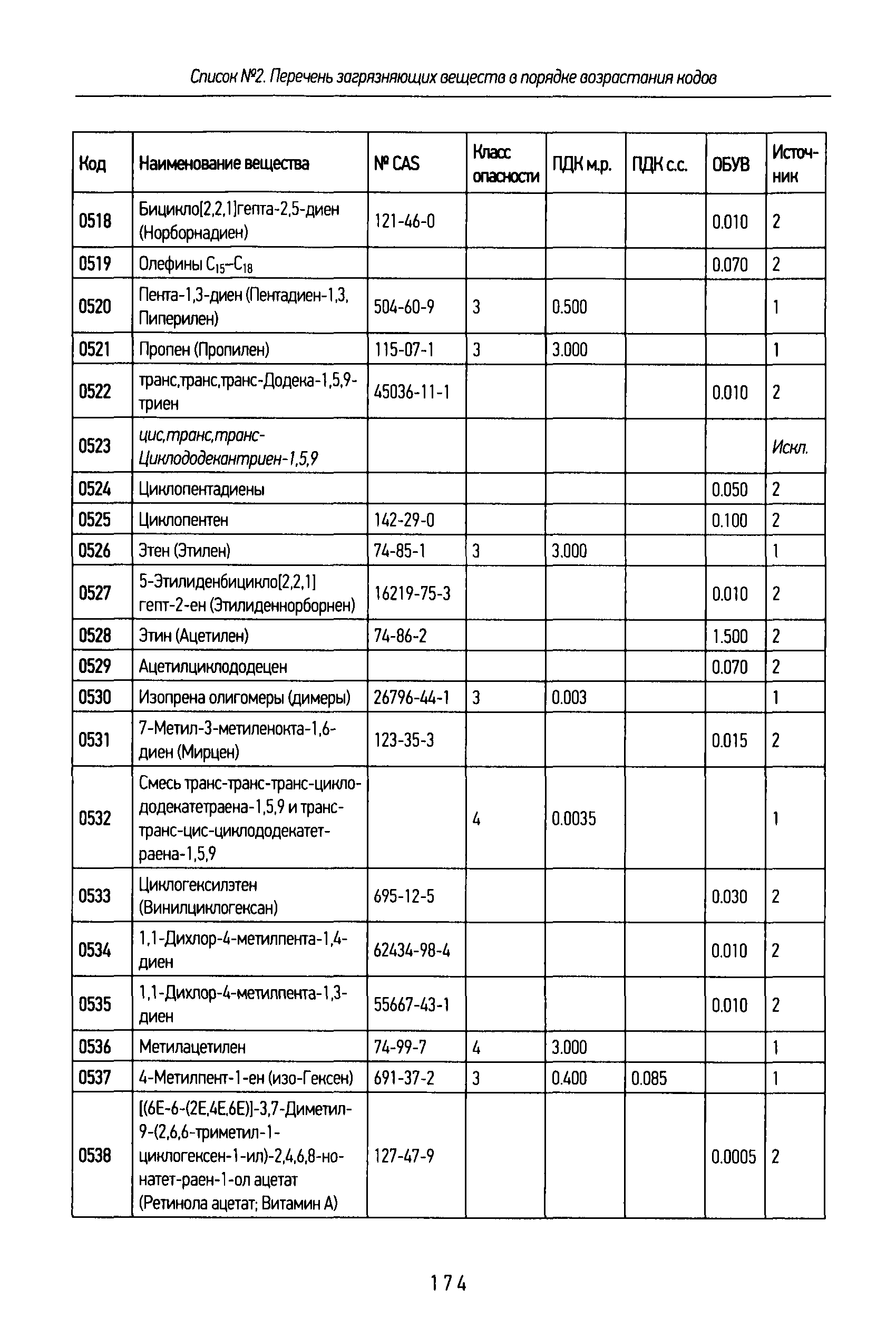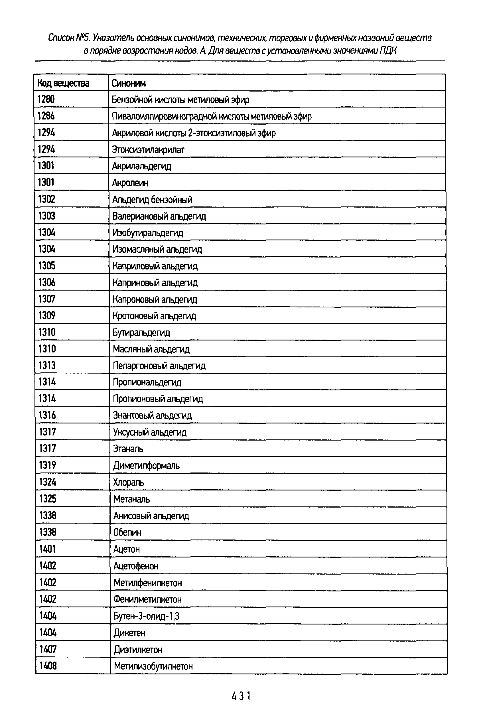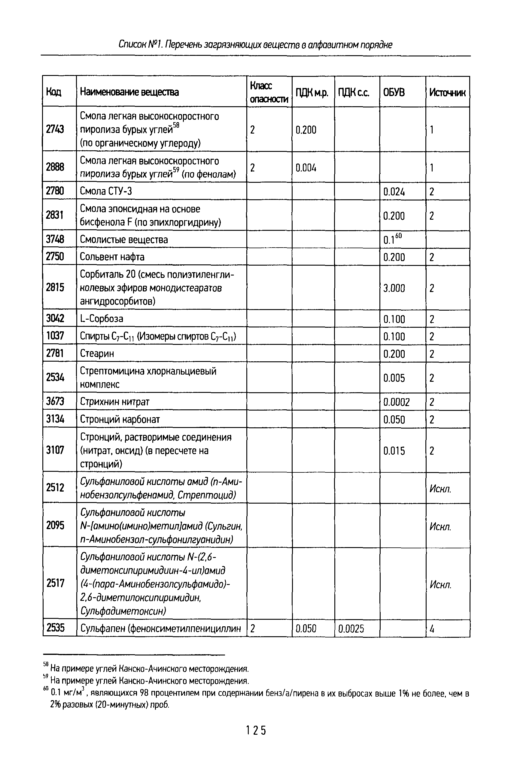 Перечень и коды веществ, загрязняющих атмосферный воздух (8 издание)| Статус: | заменен | | Название рус.: | Перечень и коды веществ, загрязняющих атмосферный воздух (8 издание) | | Дата добавления в базу: | 01.09.2013 | | Дата актуализации: | 01.01.2021 | | Область применения: | Перечень предназначен для территориальных и местных природоохранных органов, органов Роспотребнадзора и Ростехнадзора, предприятий и других организаций, в которых проводятся работы, связанные с охраной окружающей среды | | Оглавление: | 1. Введение 2. Список №1. Перечень загрязняющих веществ в алфавитном порядке 3. Список №2. Перечень загрязняющих веществ в порядке возрастания кодов 4. Список №3. Перечень ЛОС в порядке возрастания кодов 5. Список №4 Указатель основных синонимов, технических, торговых и фирменных названий веществ в алфавитном порядке A. Для веществ с установленными значениями ПДК B. Для веществ с установленными значениями ОБУВ 6. Список №5. Указатель основных синонимов, технических, торговых и фирменных названий веществ в порядке возрастания кодов A. Для веществ с установленными значениями ПДК B. Для веществ с установленными значениями ОБУВ | | Разработан: | НИИ Атмосфера Фирма Интеграл Научно-исследовательский институт экологии человека и окружающей среды им. А.И. Сысина