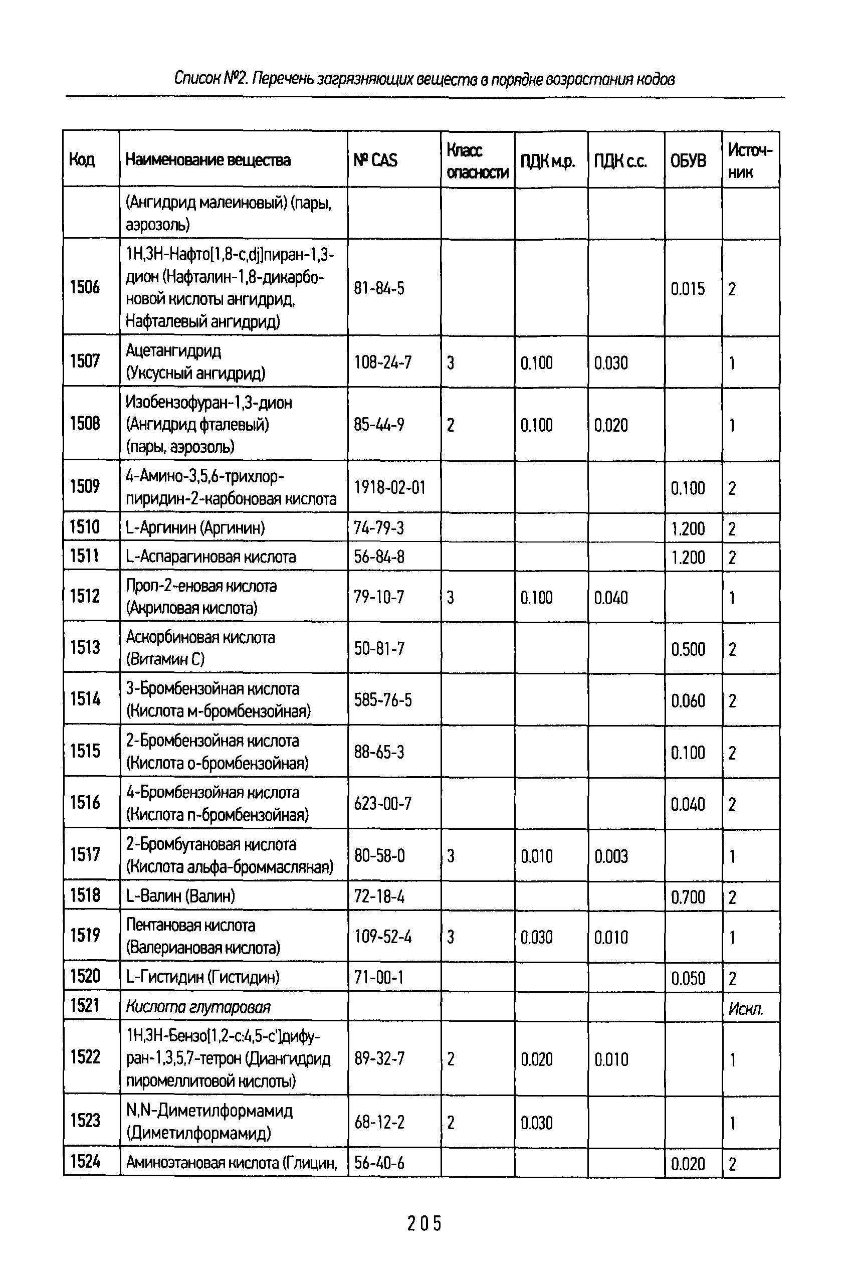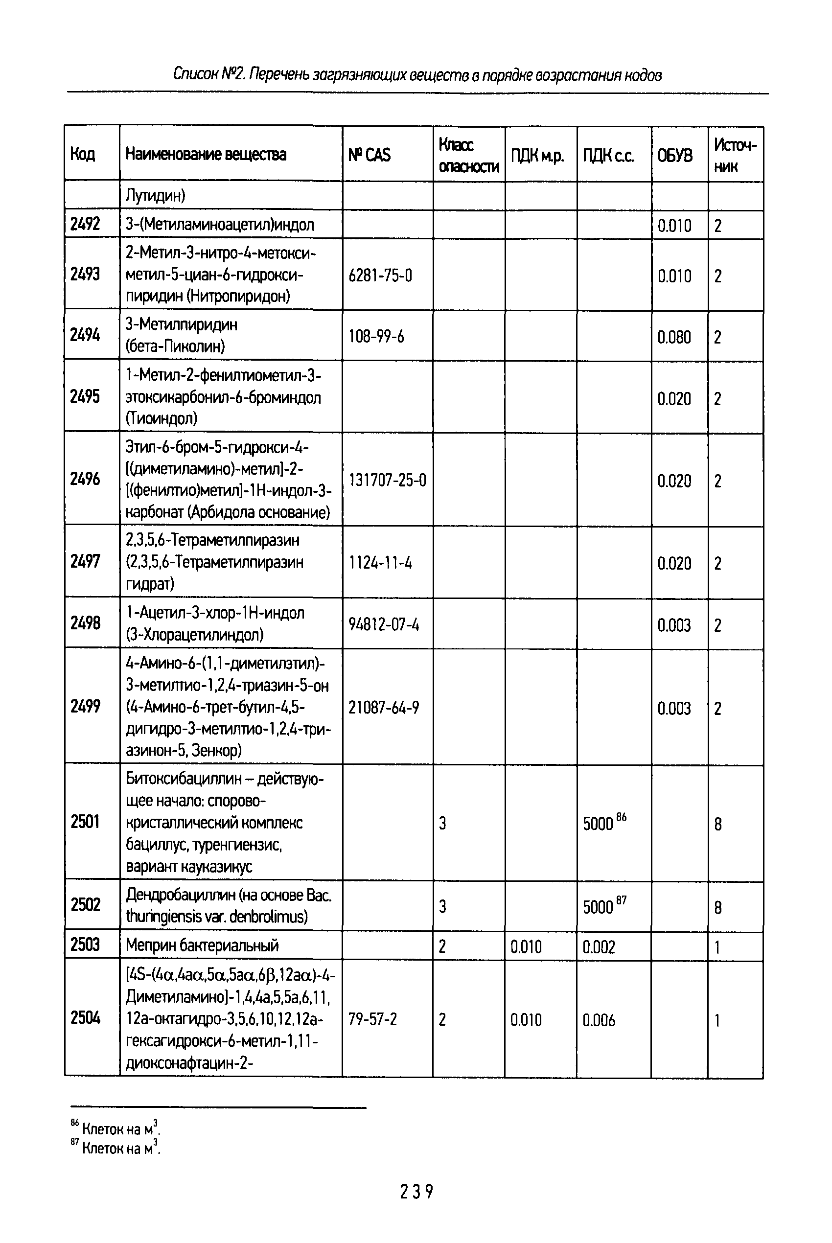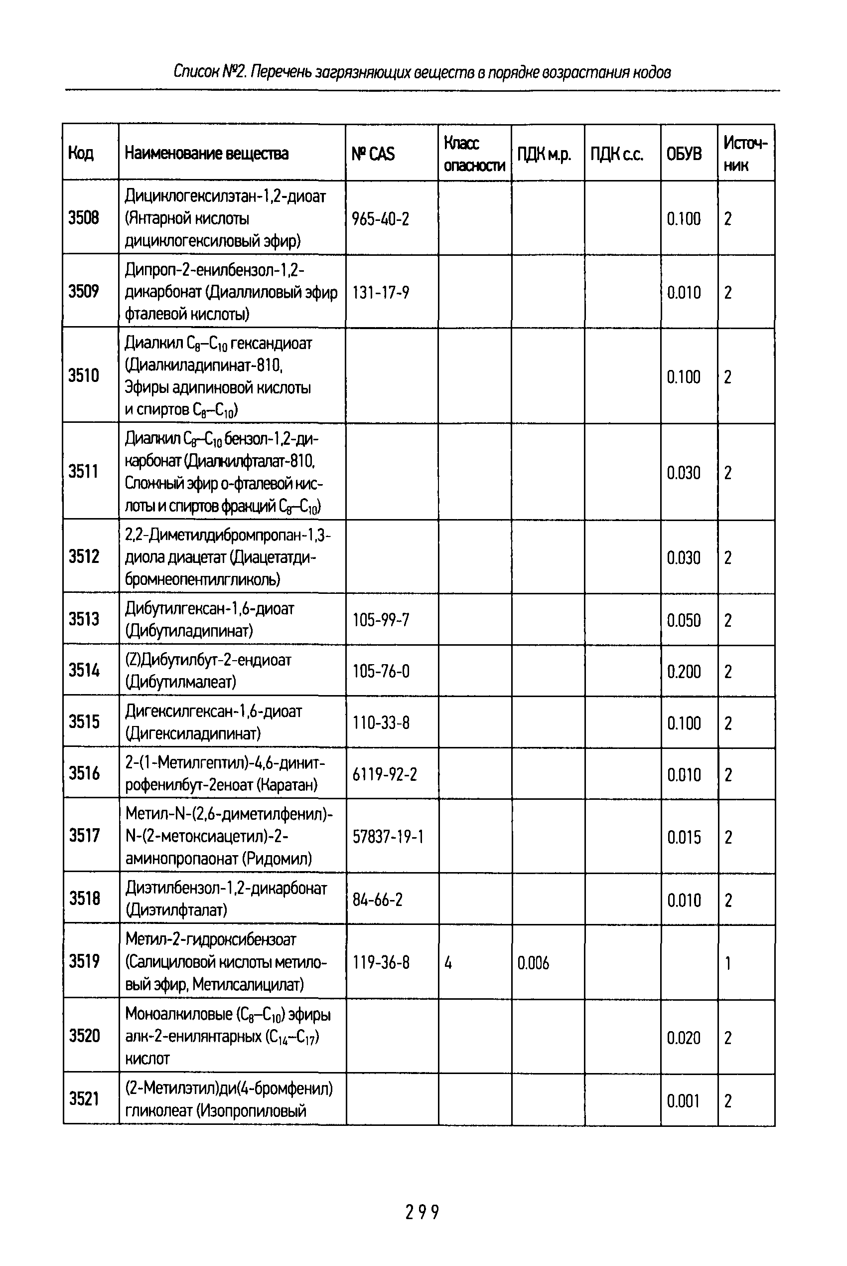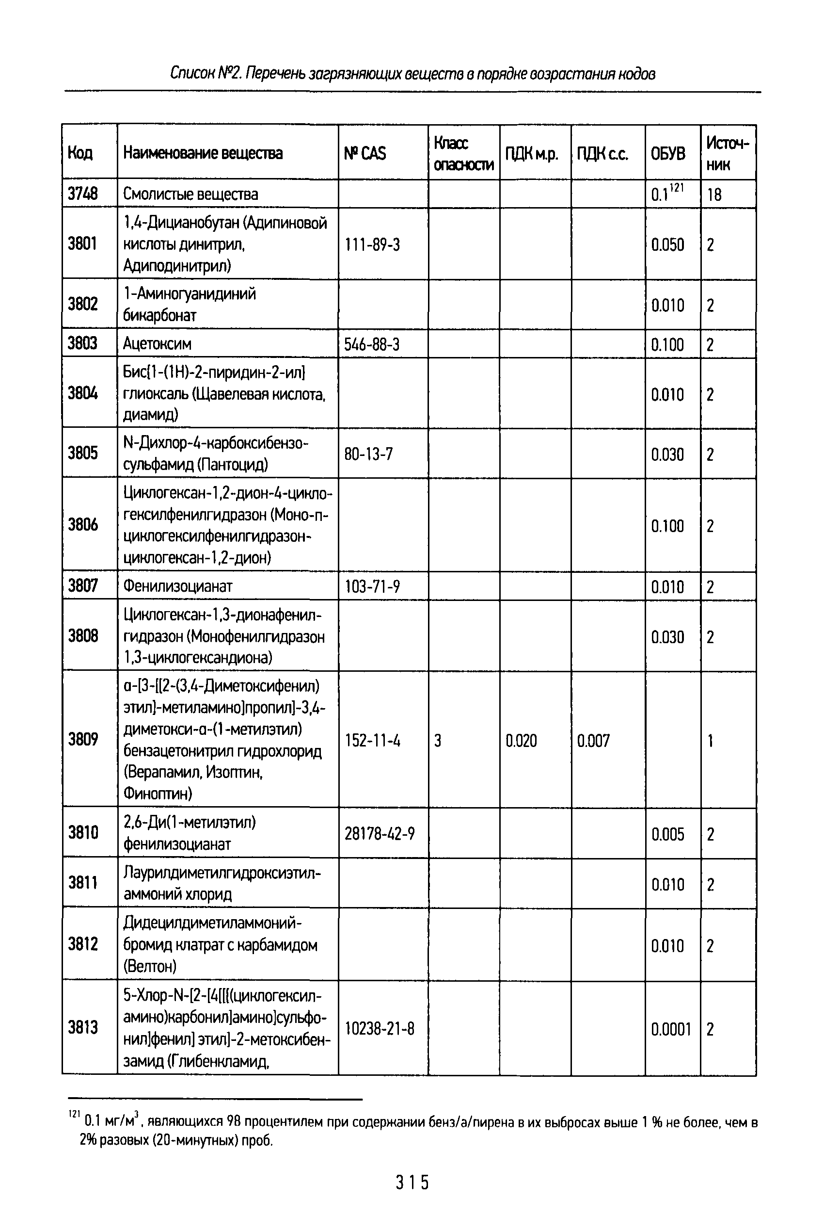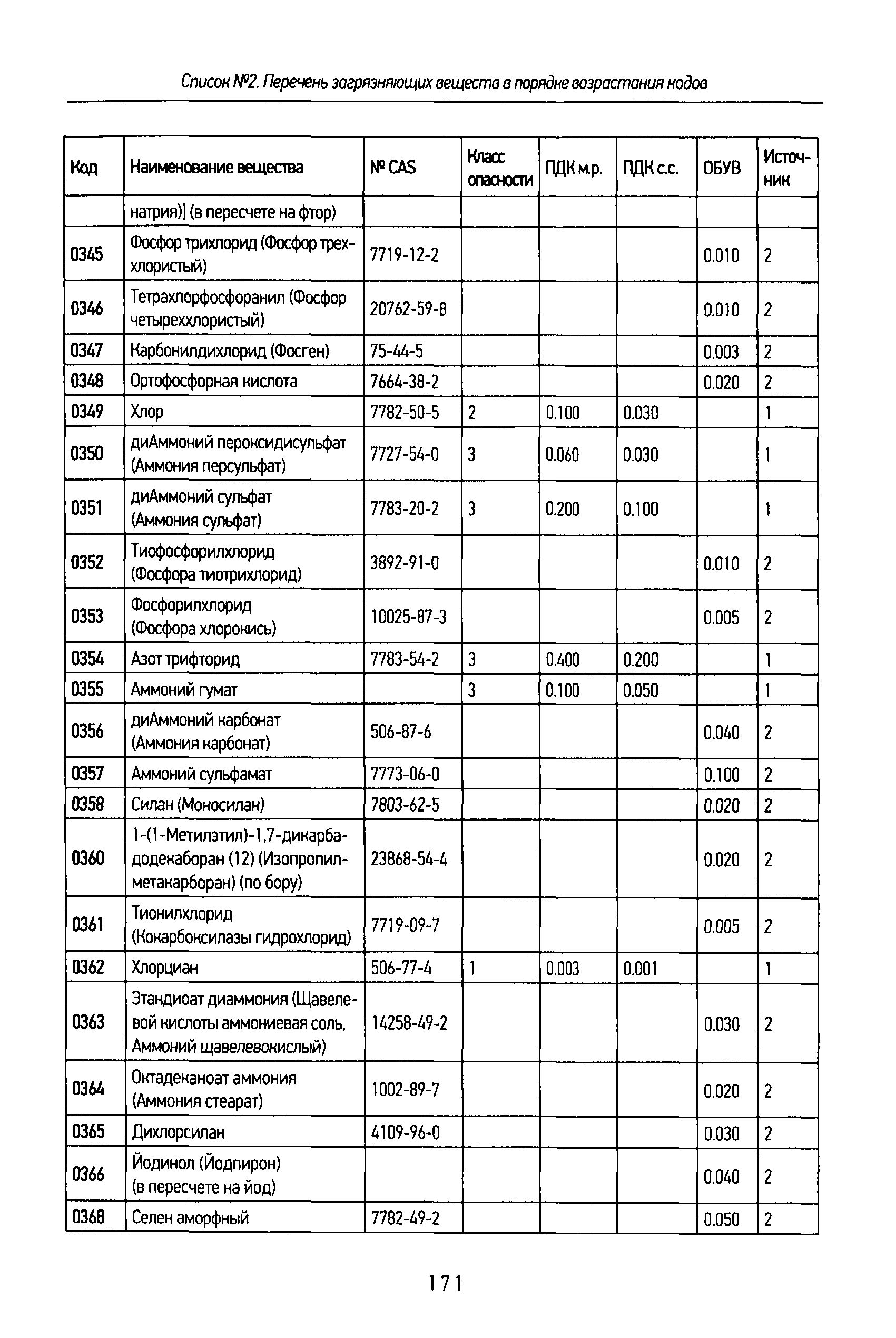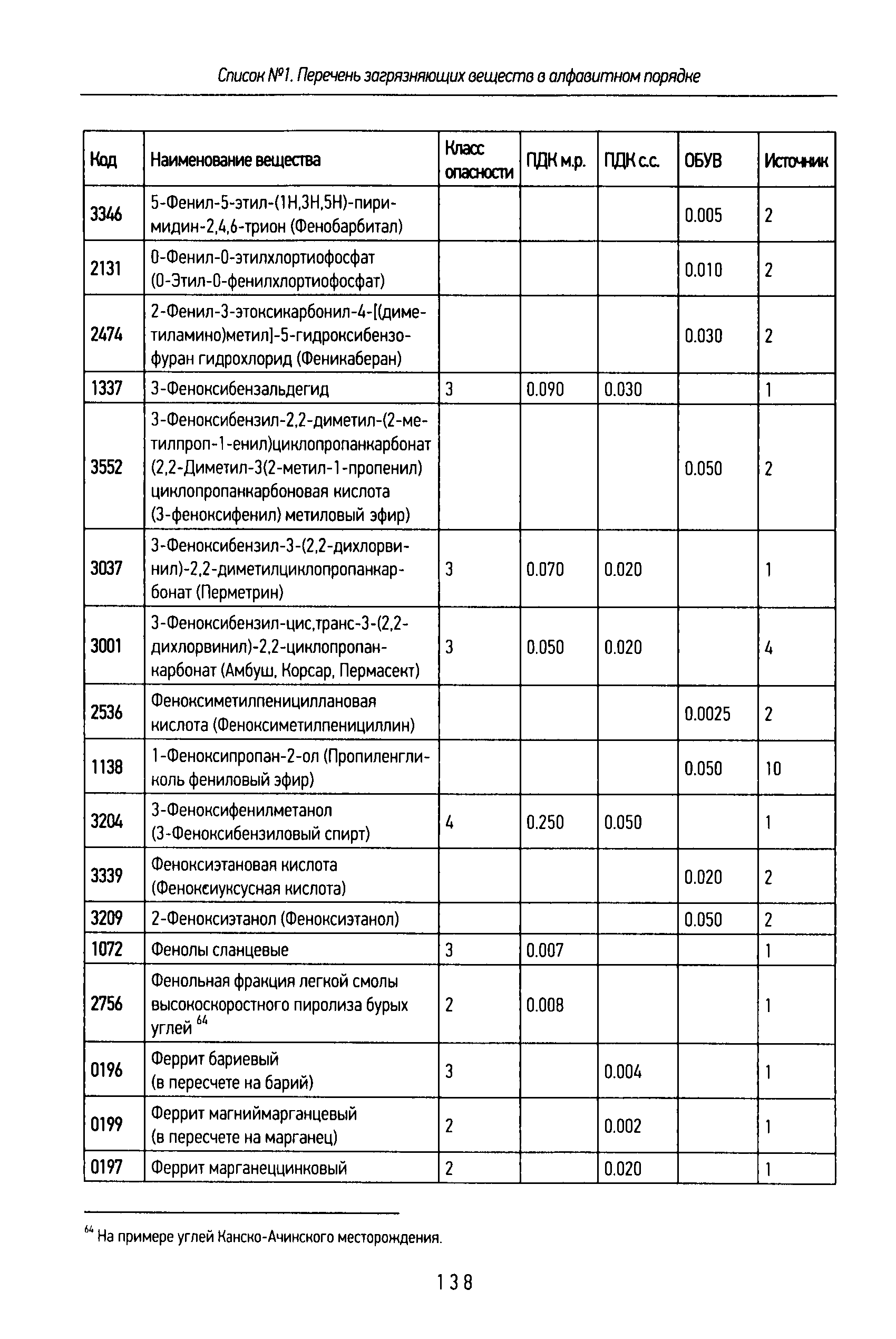 Перечень и коды веществ, загрязняющих атмосферный воздух (8 издание)| Статус: | заменен | | Название рус.: | Перечень и коды веществ, загрязняющих атмосферный воздух (8 издание) | | Дата добавления в базу: | 01.09.2013 | | Дата актуализации: | 01.01.2021 | | Область применения: | Перечень предназначен для территориальных и местных природоохранных органов, органов Роспотребнадзора и Ростехнадзора, предприятий и других организаций, в которых проводятся работы, связанные с охраной окружающей среды | | Оглавление: | 1. Введение 2. Список №1. Перечень загрязняющих веществ в алфавитном порядке 3. Список №2. Перечень загрязняющих веществ в порядке возрастания кодов 4. Список №3. Перечень ЛОС в порядке возрастания кодов 5. Список №4 Указатель основных синонимов, технических, торговых и фирменных названий веществ в алфавитном порядке A. Для веществ с установленными значениями ПДК B. Для веществ с установленными значениями ОБУВ 6. Список №5. Указатель основных синонимов, технических, торговых и фирменных названий веществ в порядке возрастания кодов A. Для веществ с установленными значениями ПДК B. Для веществ с установленными значениями ОБУВ | | Разработан: | НИИ Атмосфера Фирма Интеграл Научно-исследовательский институт экологии человека и окружающей среды им. А.И. Сысина