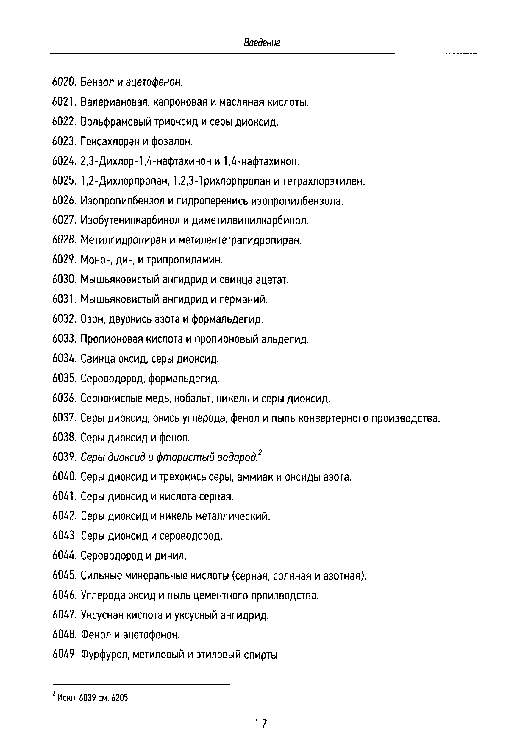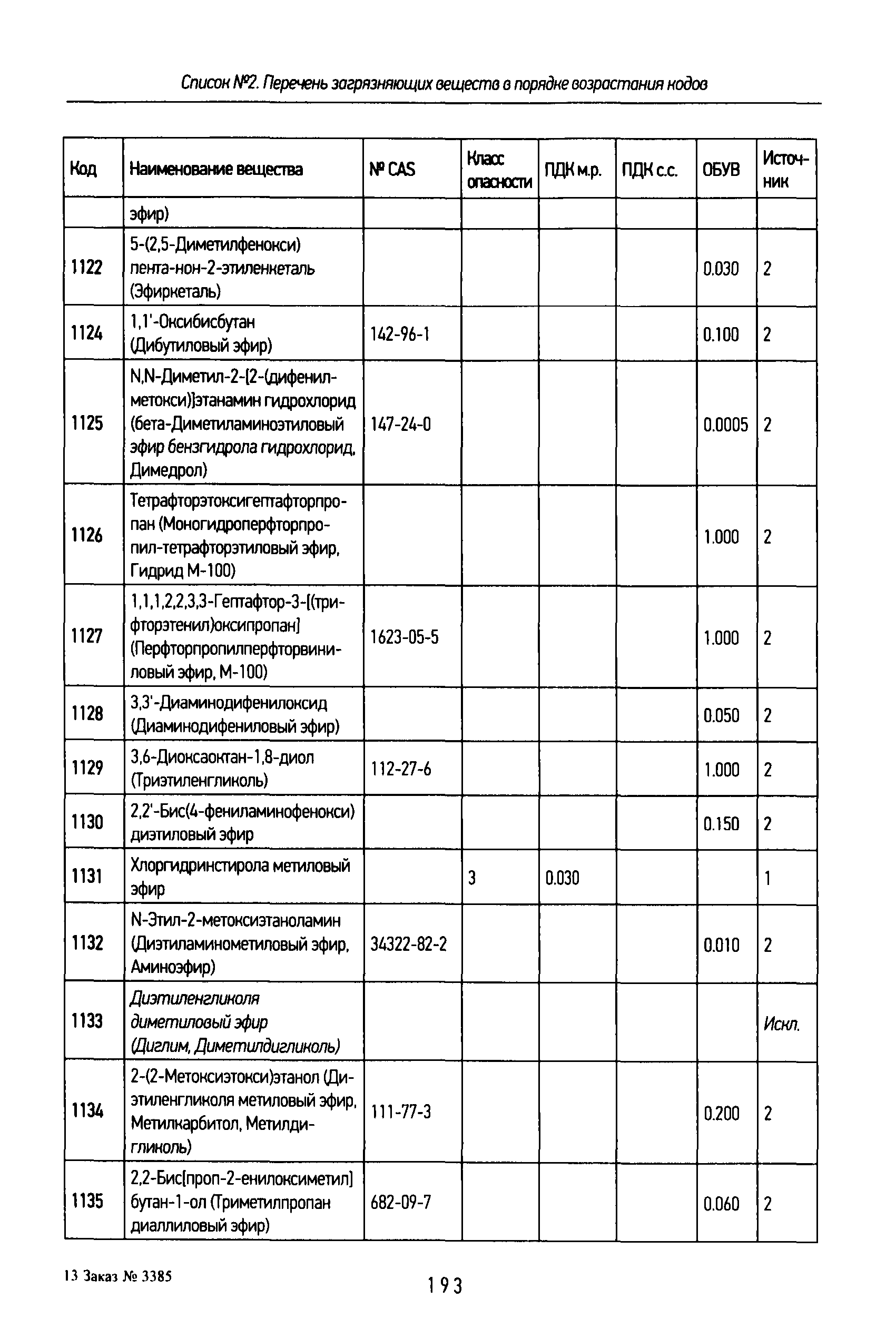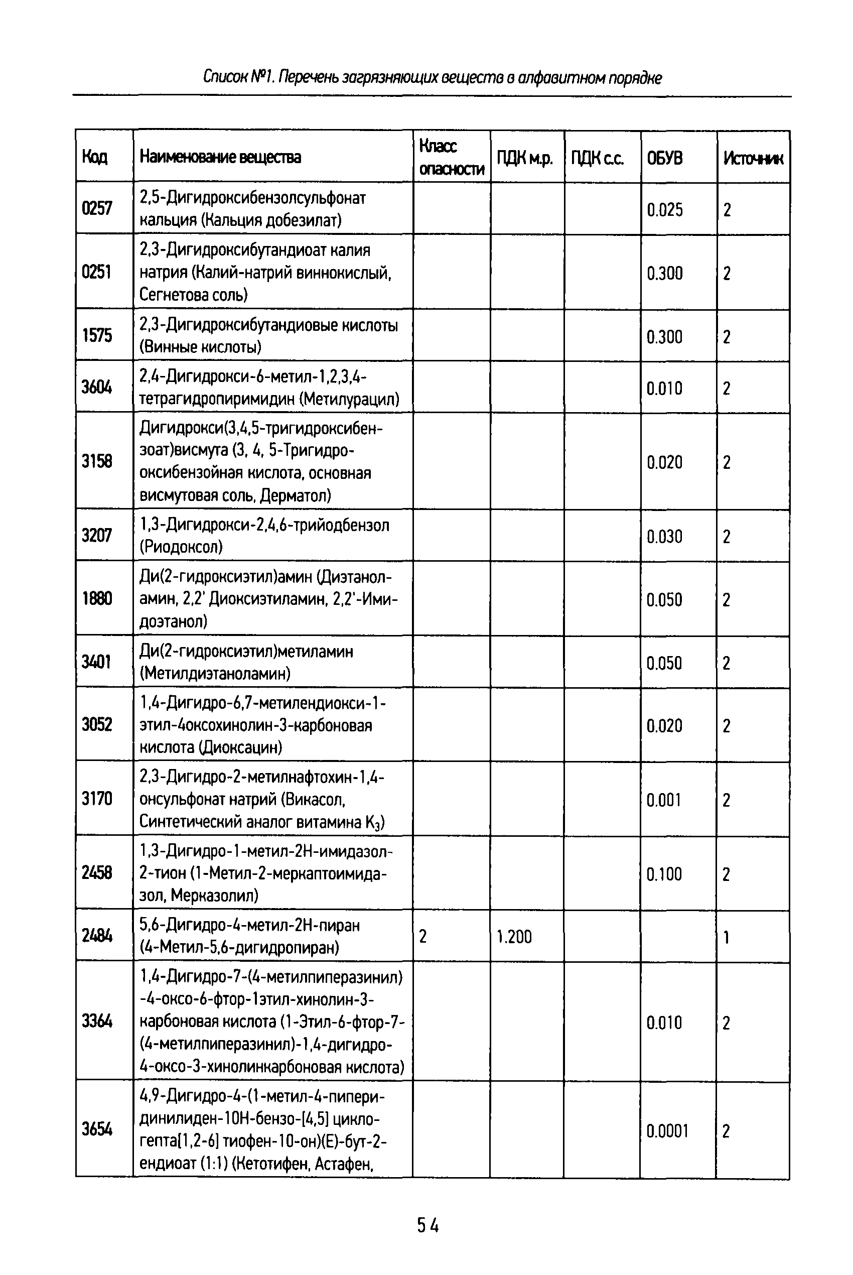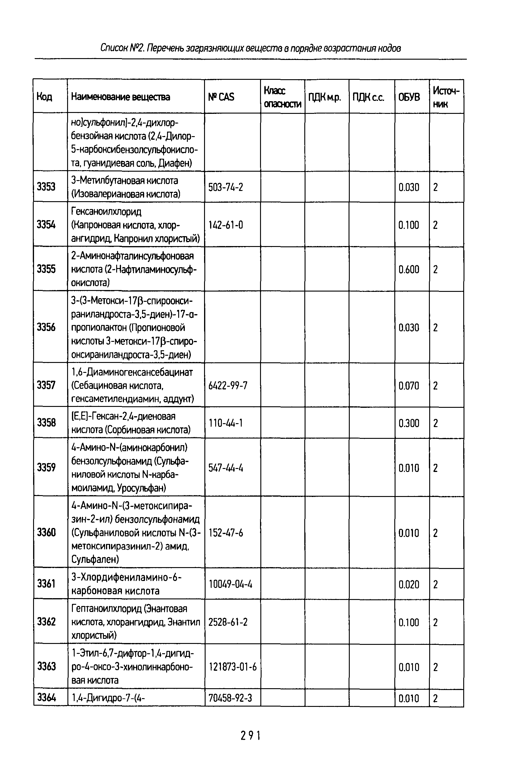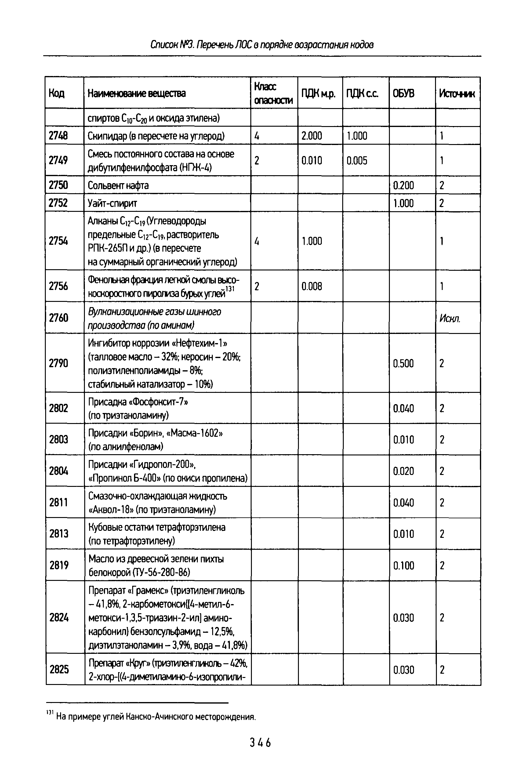 Перечень и коды веществ, загрязняющих атмосферный воздух (8 издание)| Статус: | заменен | | Название рус.: | Перечень и коды веществ, загрязняющих атмосферный воздух (8 издание) | | Дата добавления в базу: | 01.09.2013 | | Дата актуализации: | 01.01.2021 | | Область применения: | Перечень предназначен для территориальных и местных природоохранных органов, органов Роспотребнадзора и Ростехнадзора, предприятий и других организаций, в которых проводятся работы, связанные с охраной окружающей среды | | Оглавление: | 1. Введение 2. Список №1. Перечень загрязняющих веществ в алфавитном порядке 3. Список №2. Перечень загрязняющих веществ в порядке возрастания кодов 4. Список №3. Перечень ЛОС в порядке возрастания кодов 5. Список №4 Указатель основных синонимов, технических, торговых и фирменных названий веществ в алфавитном порядке A. Для веществ с установленными значениями ПДК B. Для веществ с установленными значениями ОБУВ 6. Список №5. Указатель основных синонимов, технических, торговых и фирменных названий веществ в порядке возрастания кодов A. Для веществ с установленными значениями ПДК B. Для веществ с установленными значениями ОБУВ | | Разработан: | НИИ Атмосфера Фирма Интеграл Научно-исследовательский институт экологии человека и окружающей среды им. А.И. Сысина