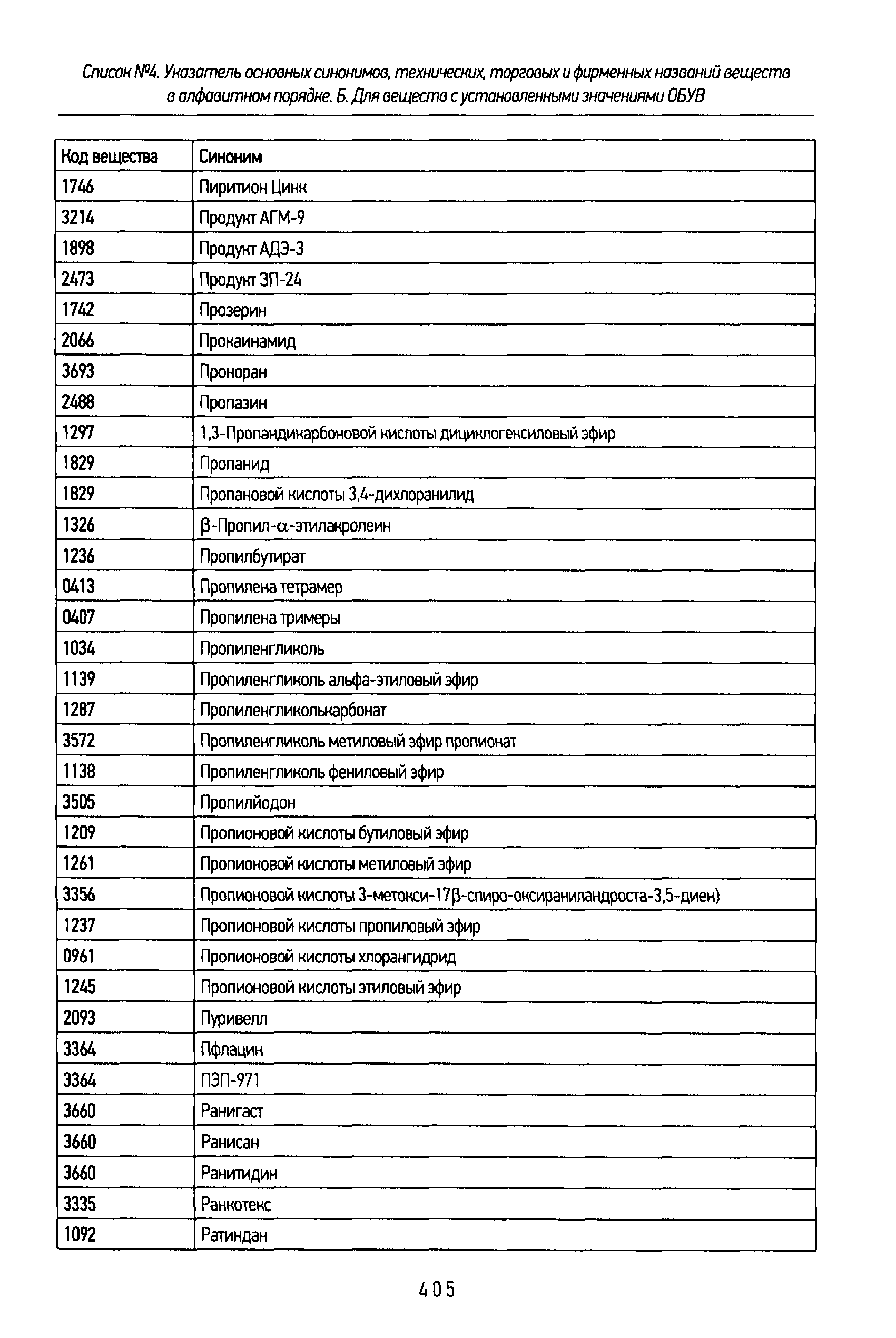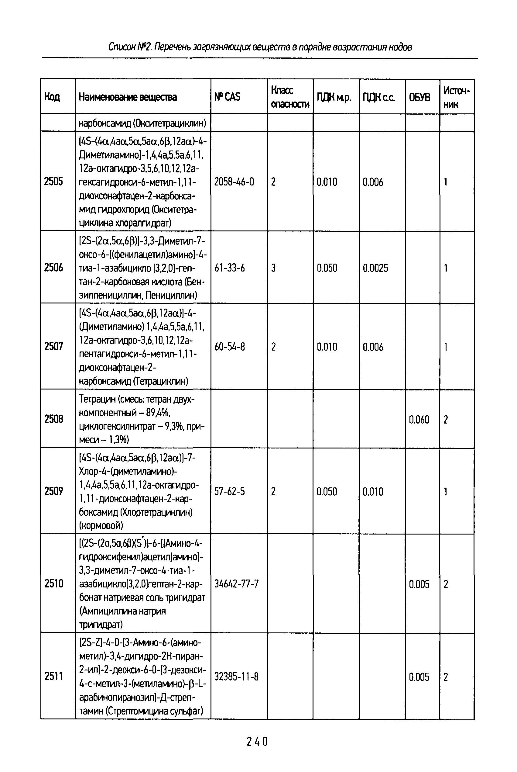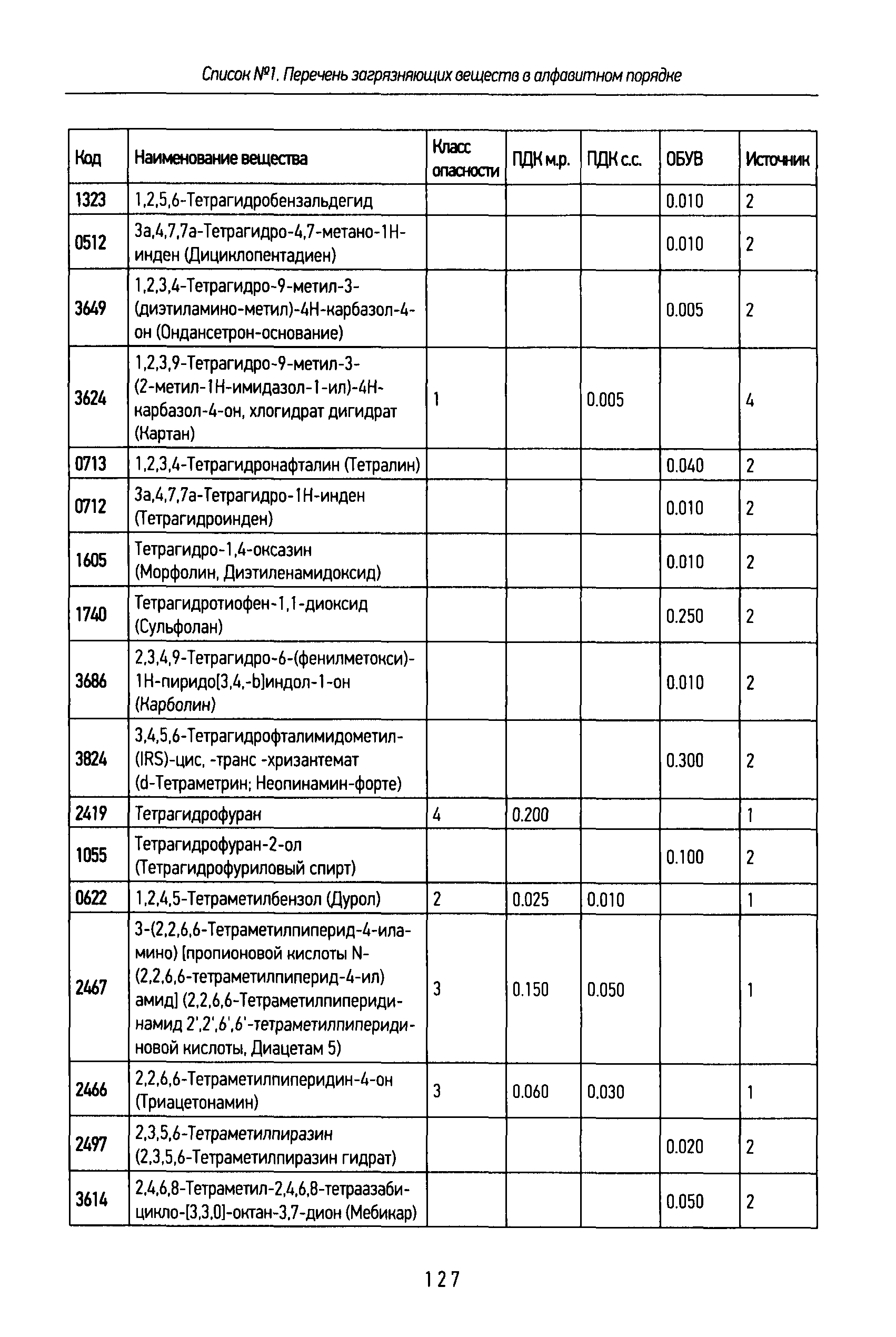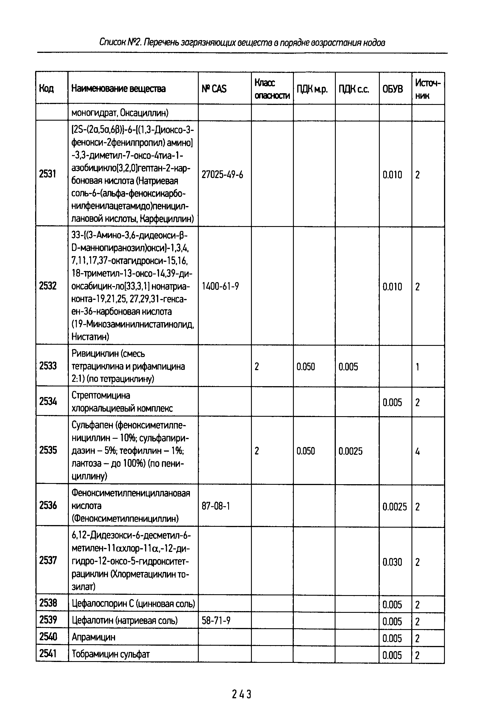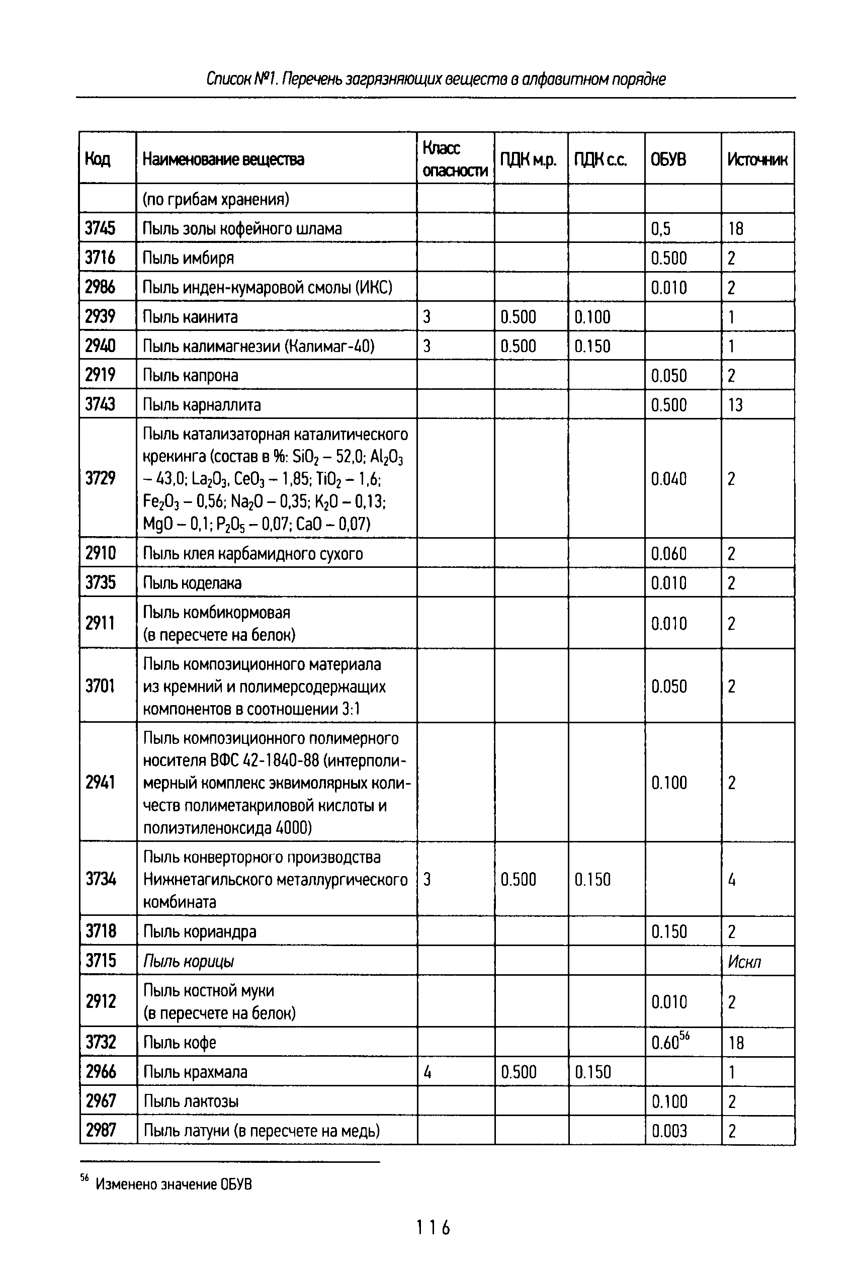 Перечень и коды веществ, загрязняющих атмосферный воздух (8 издание)| Статус: | заменен | | Название рус.: | Перечень и коды веществ, загрязняющих атмосферный воздух (8 издание) | | Дата добавления в базу: | 01.09.2013 | | Дата актуализации: | 01.01.2021 | | Область применения: | Перечень предназначен для территориальных и местных природоохранных органов, органов Роспотребнадзора и Ростехнадзора, предприятий и других организаций, в которых проводятся работы, связанные с охраной окружающей среды | | Оглавление: | 1. Введение 2. Список №1. Перечень загрязняющих веществ в алфавитном порядке 3. Список №2. Перечень загрязняющих веществ в порядке возрастания кодов 4. Список №3. Перечень ЛОС в порядке возрастания кодов 5. Список №4 Указатель основных синонимов, технических, торговых и фирменных названий веществ в алфавитном порядке A. Для веществ с установленными значениями ПДК B. Для веществ с установленными значениями ОБУВ 6. Список №5. Указатель основных синонимов, технических, торговых и фирменных названий веществ в порядке возрастания кодов A. Для веществ с установленными значениями ПДК B. Для веществ с установленными значениями ОБУВ | | Разработан: | НИИ Атмосфера Фирма Интеграл Научно-исследовательский институт экологии человека и окружающей среды им. А.И. Сысина