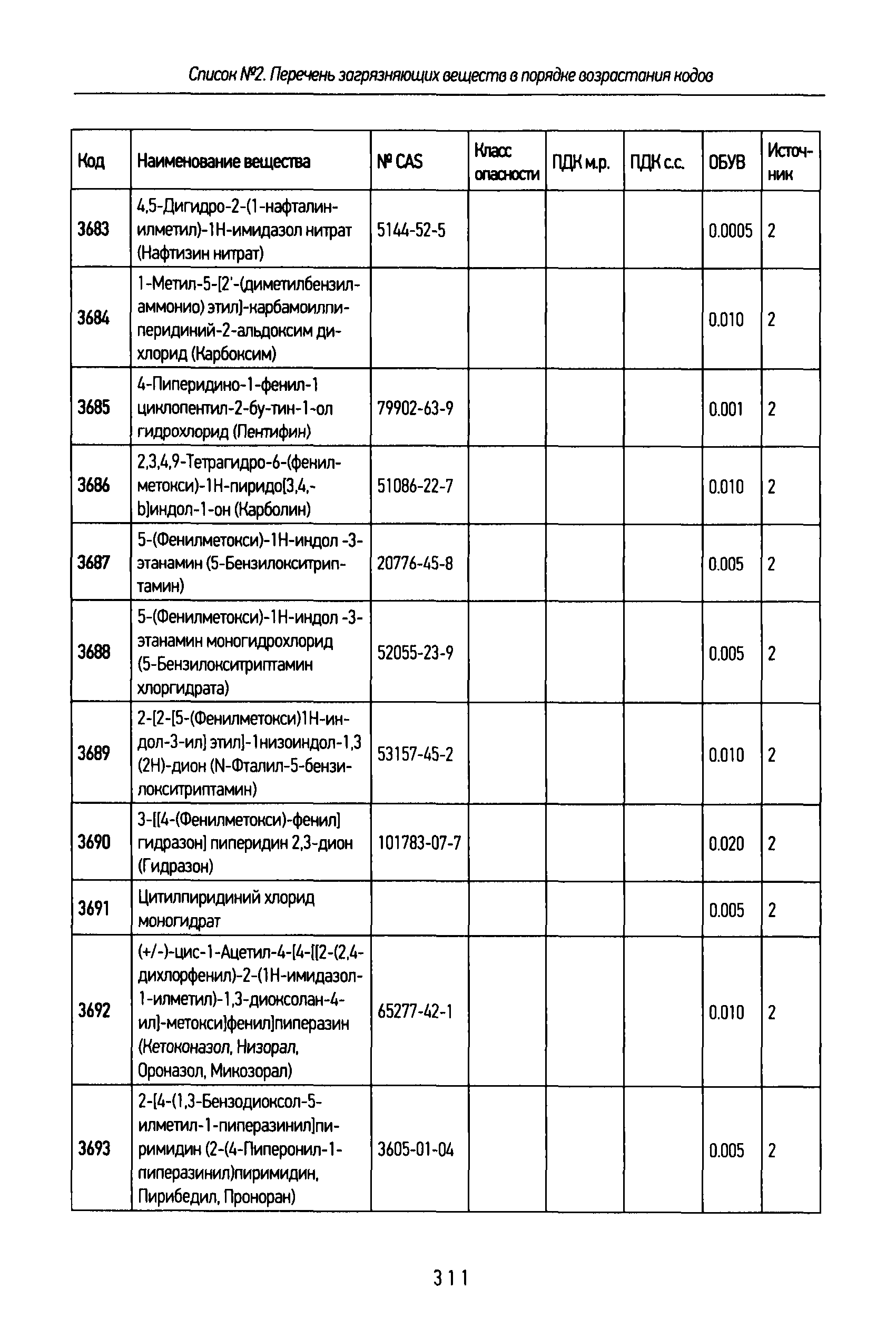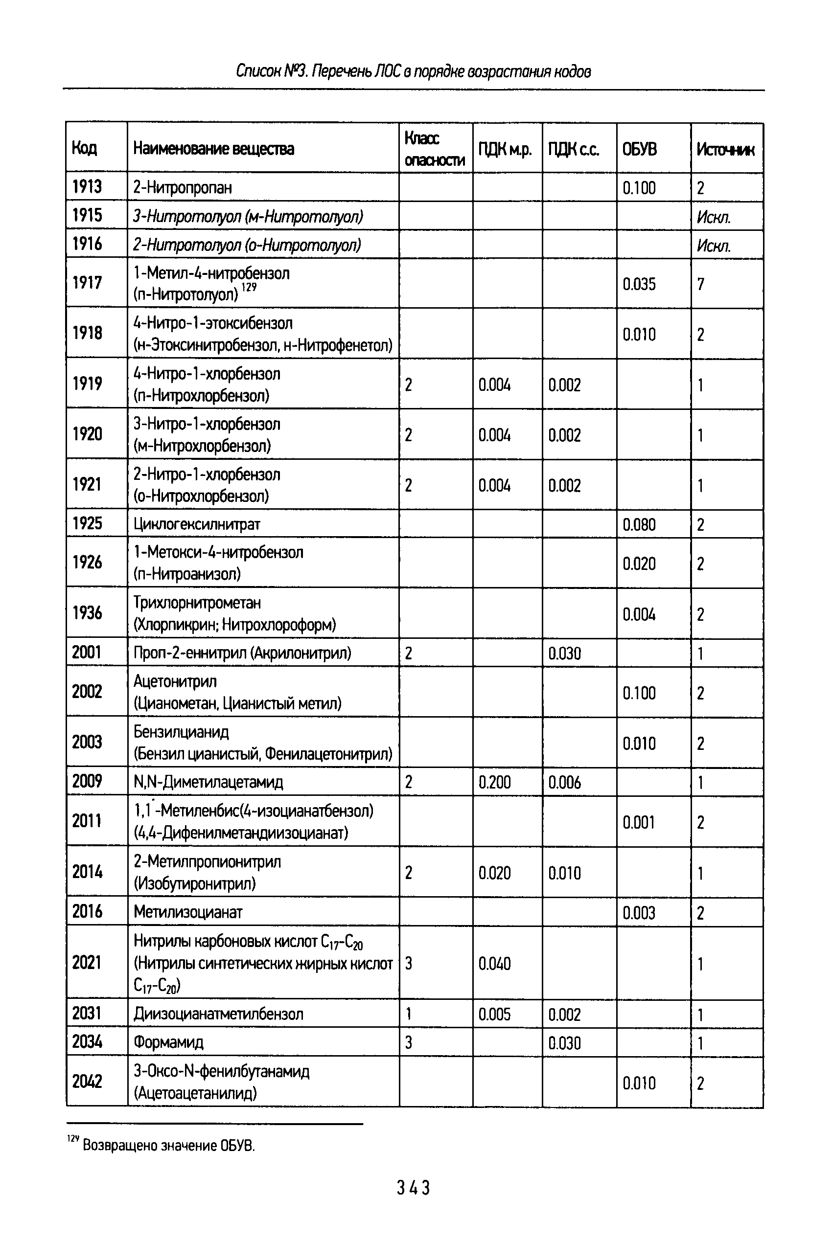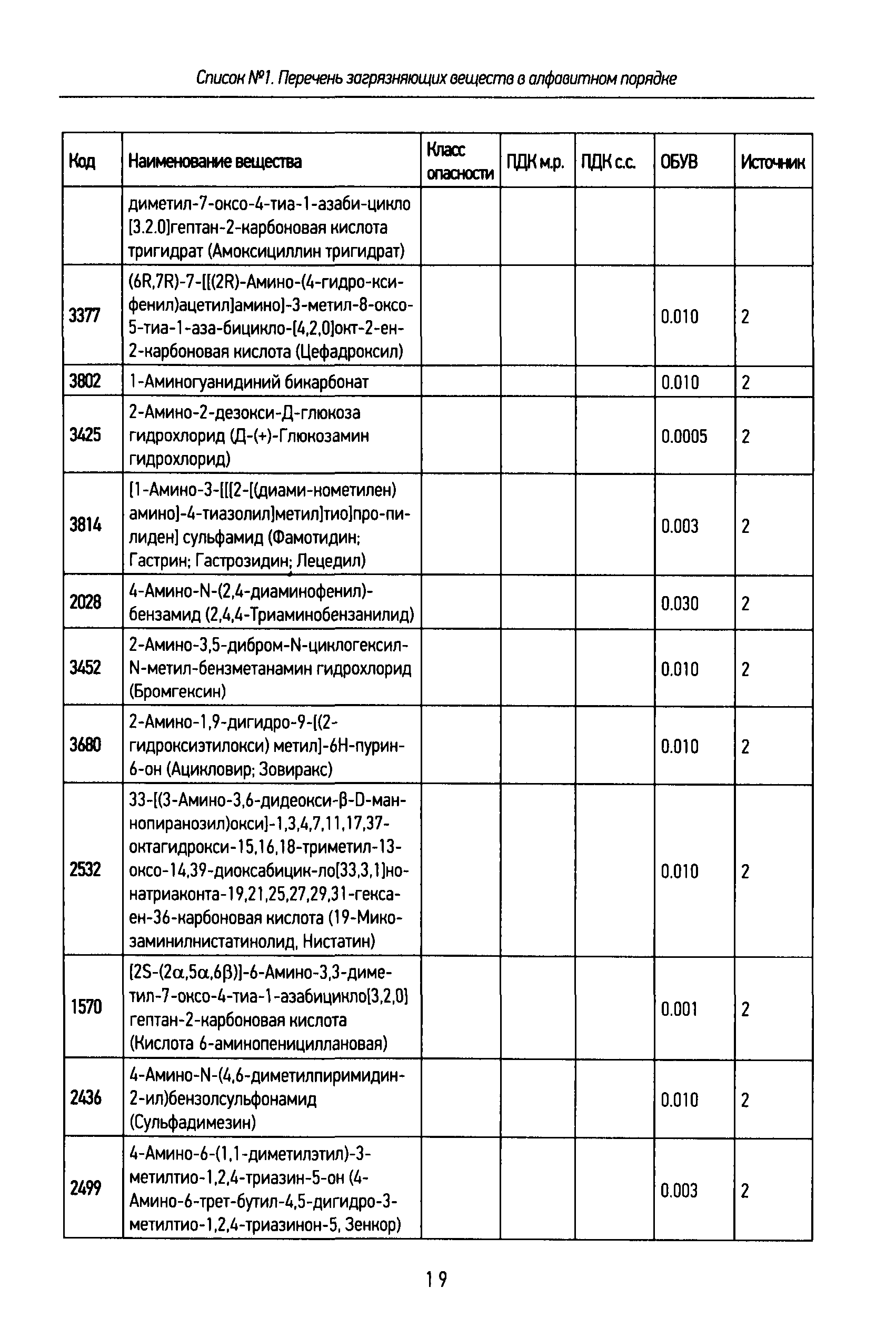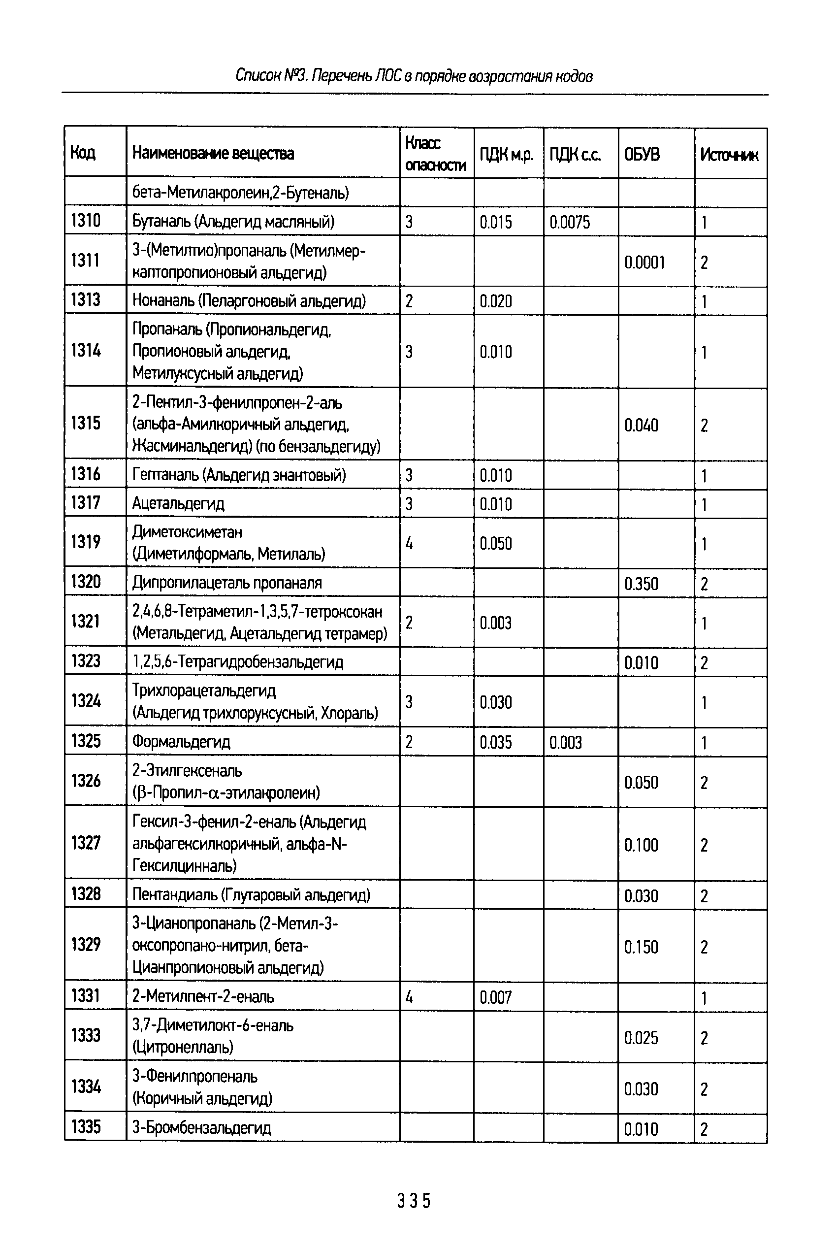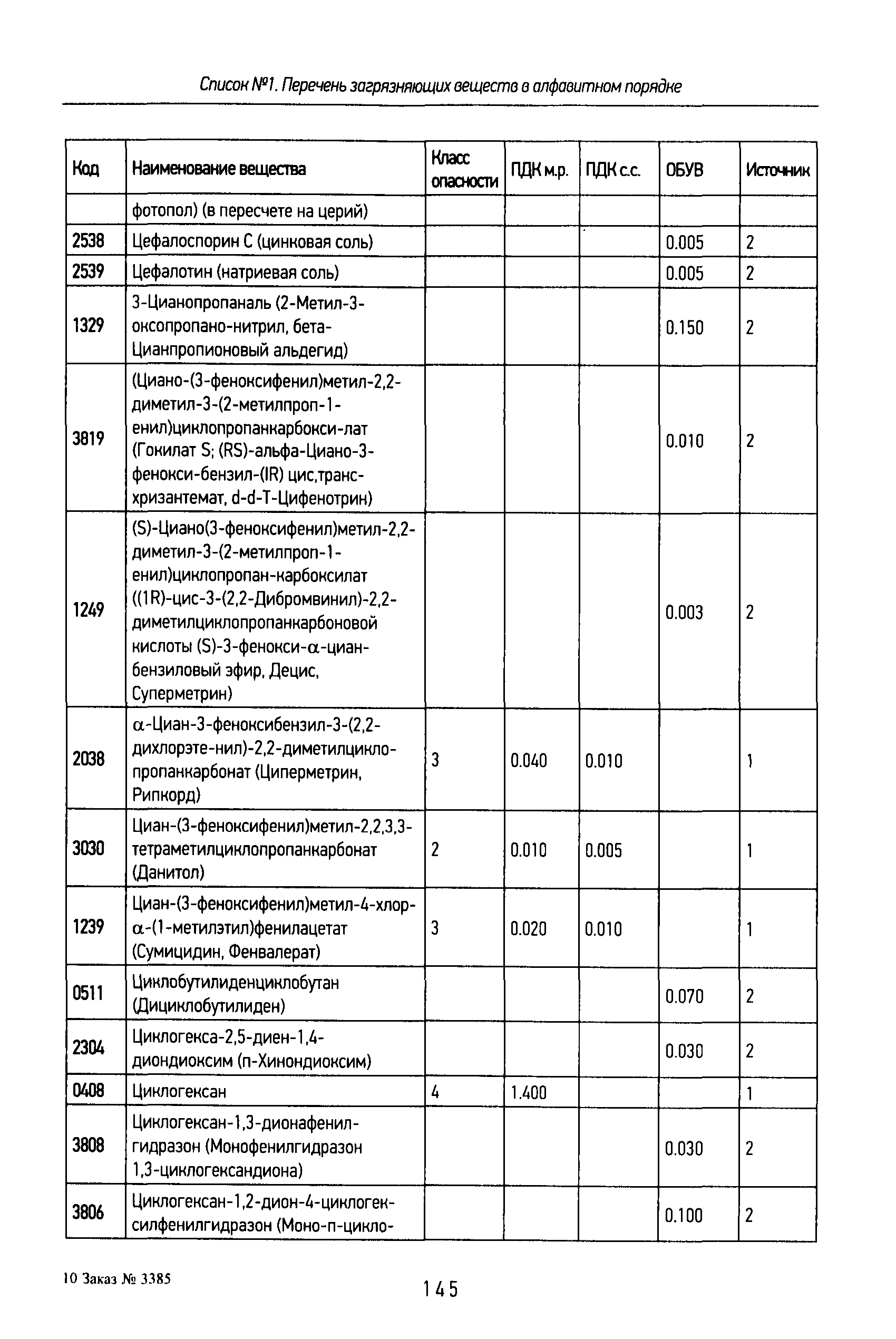 Перечень и коды веществ, загрязняющих атмосферный воздух (8 издание)| Статус: | заменен | | Название рус.: | Перечень и коды веществ, загрязняющих атмосферный воздух (8 издание) | | Дата добавления в базу: | 01.09.2013 | | Дата актуализации: | 01.01.2021 | | Область применения: | Перечень предназначен для территориальных и местных природоохранных органов, органов Роспотребнадзора и Ростехнадзора, предприятий и других организаций, в которых проводятся работы, связанные с охраной окружающей среды | | Оглавление: | 1. Введение 2. Список №1. Перечень загрязняющих веществ в алфавитном порядке 3. Список №2. Перечень загрязняющих веществ в порядке возрастания кодов 4. Список №3. Перечень ЛОС в порядке возрастания кодов 5. Список №4 Указатель основных синонимов, технических, торговых и фирменных названий веществ в алфавитном порядке A. Для веществ с установленными значениями ПДК B. Для веществ с установленными значениями ОБУВ 6. Список №5. Указатель основных синонимов, технических, торговых и фирменных названий веществ в порядке возрастания кодов A. Для веществ с установленными значениями ПДК B. Для веществ с установленными значениями ОБУВ | | Разработан: | НИИ Атмосфера Фирма Интеграл Научно-исследовательский институт экологии человека и окружающей среды им. А.И. Сысина