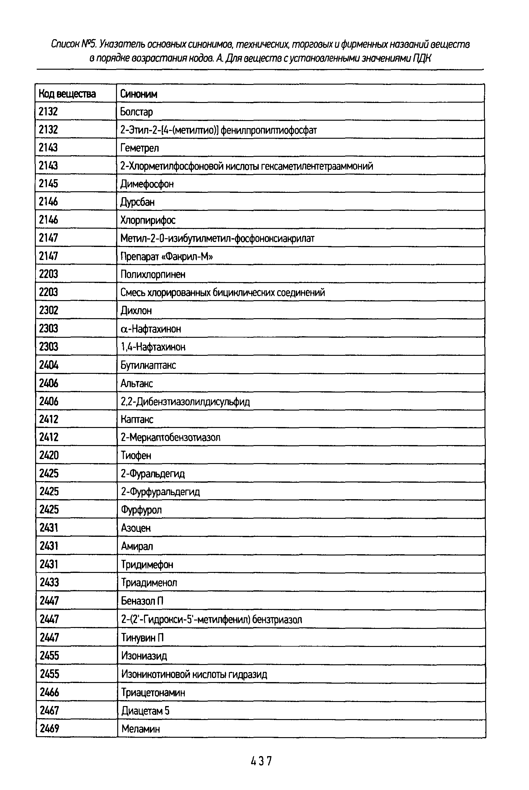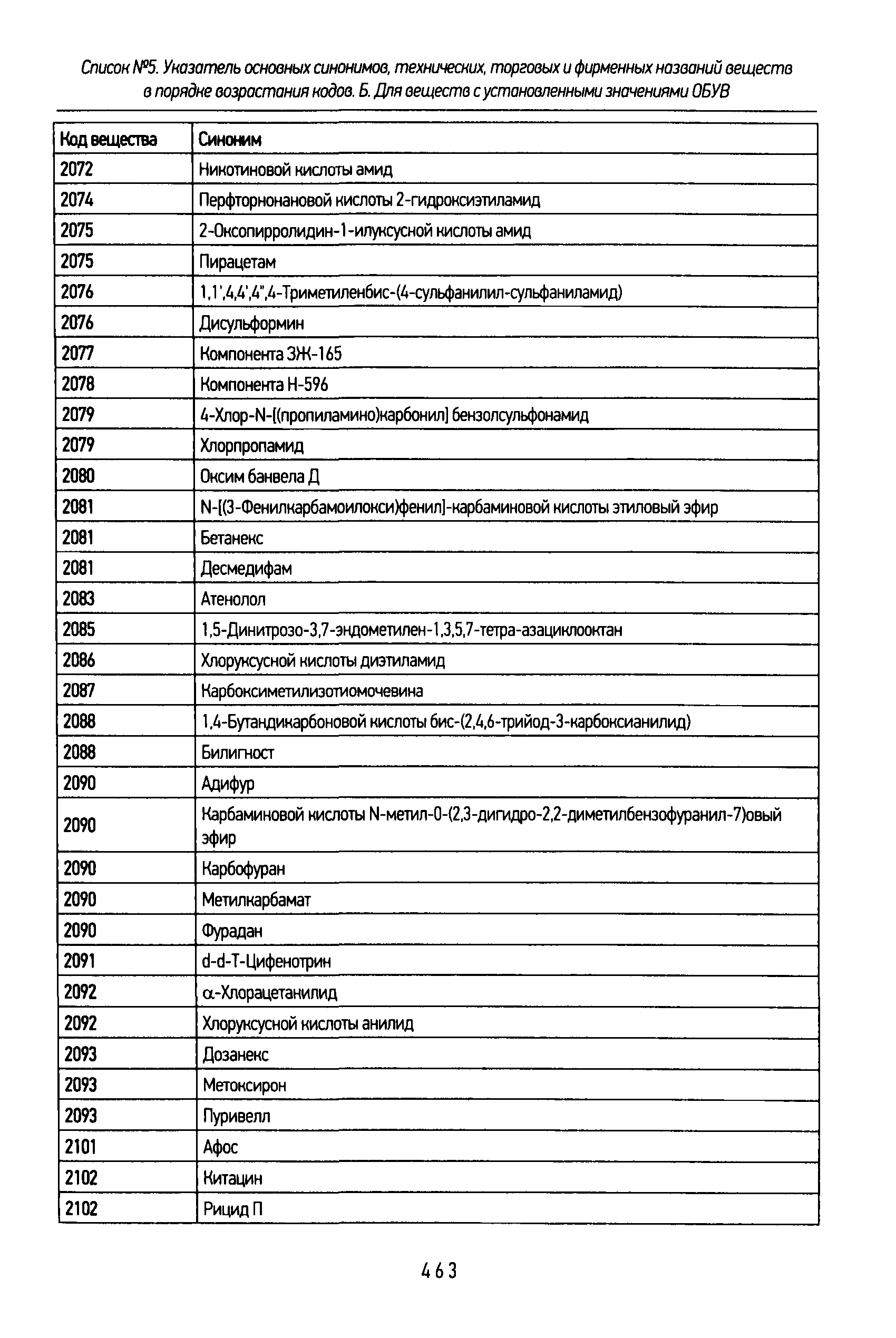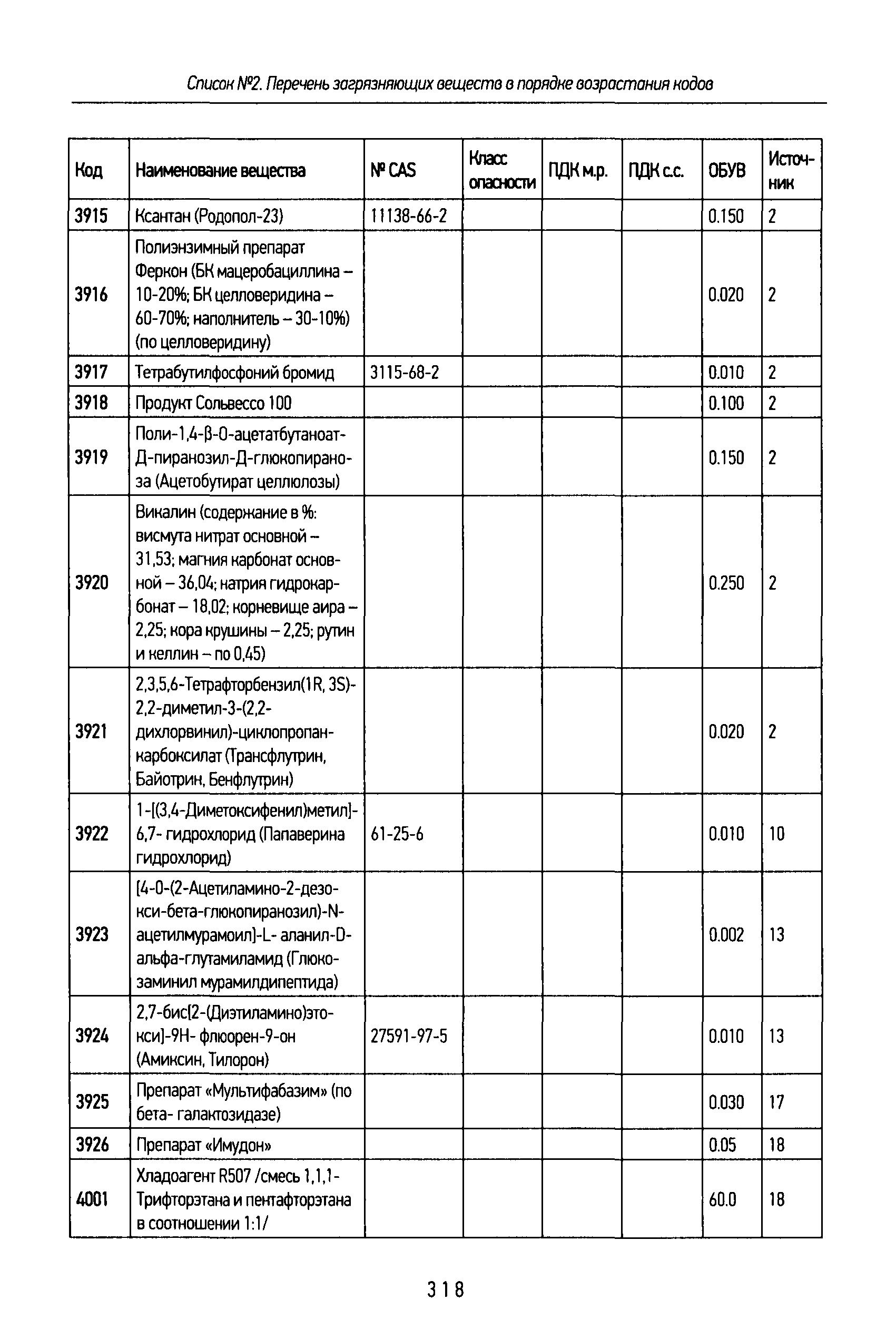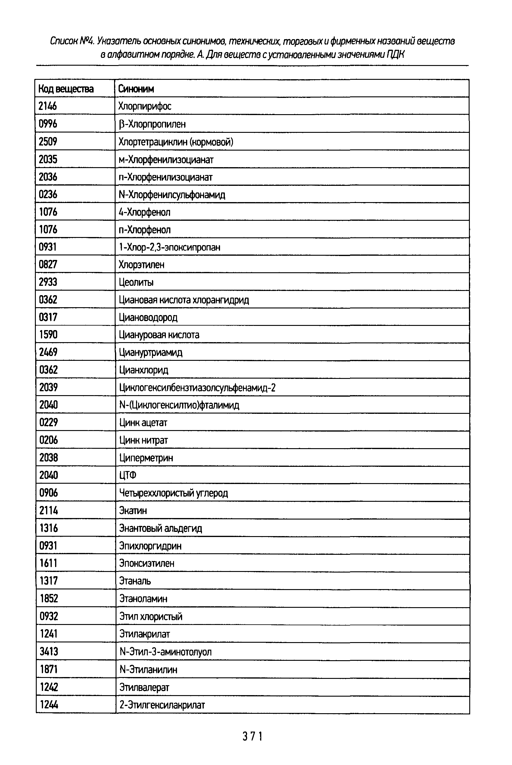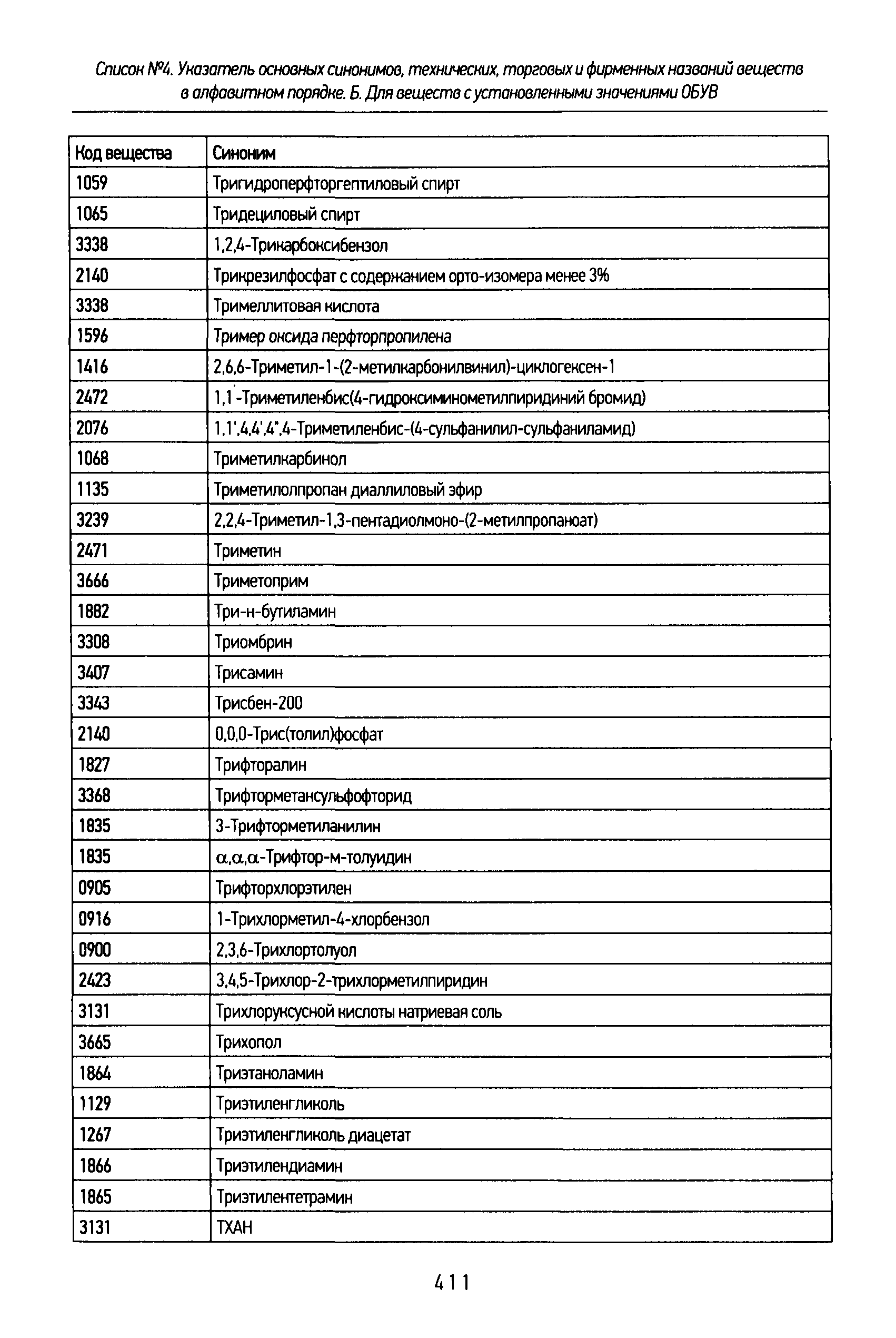 Перечень и коды веществ, загрязняющих атмосферный воздух (8 издание)| Статус: | заменен | | Название рус.: | Перечень и коды веществ, загрязняющих атмосферный воздух (8 издание) | | Дата добавления в базу: | 01.09.2013 | | Дата актуализации: | 01.01.2021 | | Область применения: | Перечень предназначен для территориальных и местных природоохранных органов, органов Роспотребнадзора и Ростехнадзора, предприятий и других организаций, в которых проводятся работы, связанные с охраной окружающей среды | | Оглавление: | 1. Введение 2. Список №1. Перечень загрязняющих веществ в алфавитном порядке 3. Список №2. Перечень загрязняющих веществ в порядке возрастания кодов 4. Список №3. Перечень ЛОС в порядке возрастания кодов 5. Список №4 Указатель основных синонимов, технических, торговых и фирменных названий веществ в алфавитном порядке A. Для веществ с установленными значениями ПДК B. Для веществ с установленными значениями ОБУВ 6. Список №5. Указатель основных синонимов, технических, торговых и фирменных названий веществ в порядке возрастания кодов A. Для веществ с установленными значениями ПДК B. Для веществ с установленными значениями ОБУВ | | Разработан: | НИИ Атмосфера Фирма Интеграл Научно-исследовательский институт экологии человека и окружающей среды им. А.И. Сысина