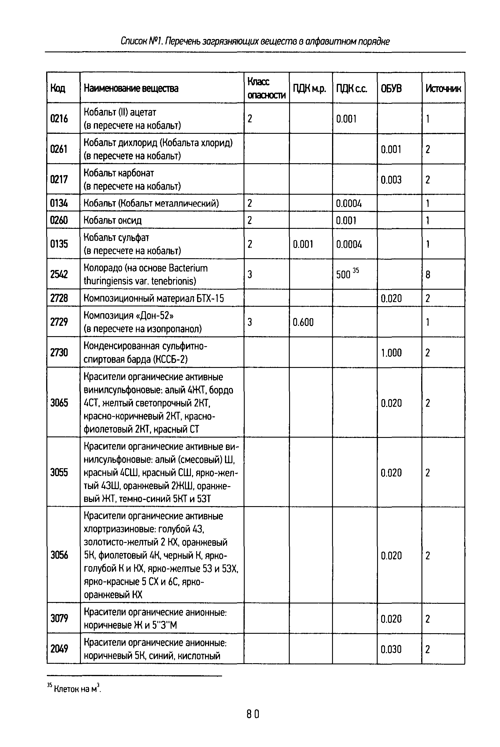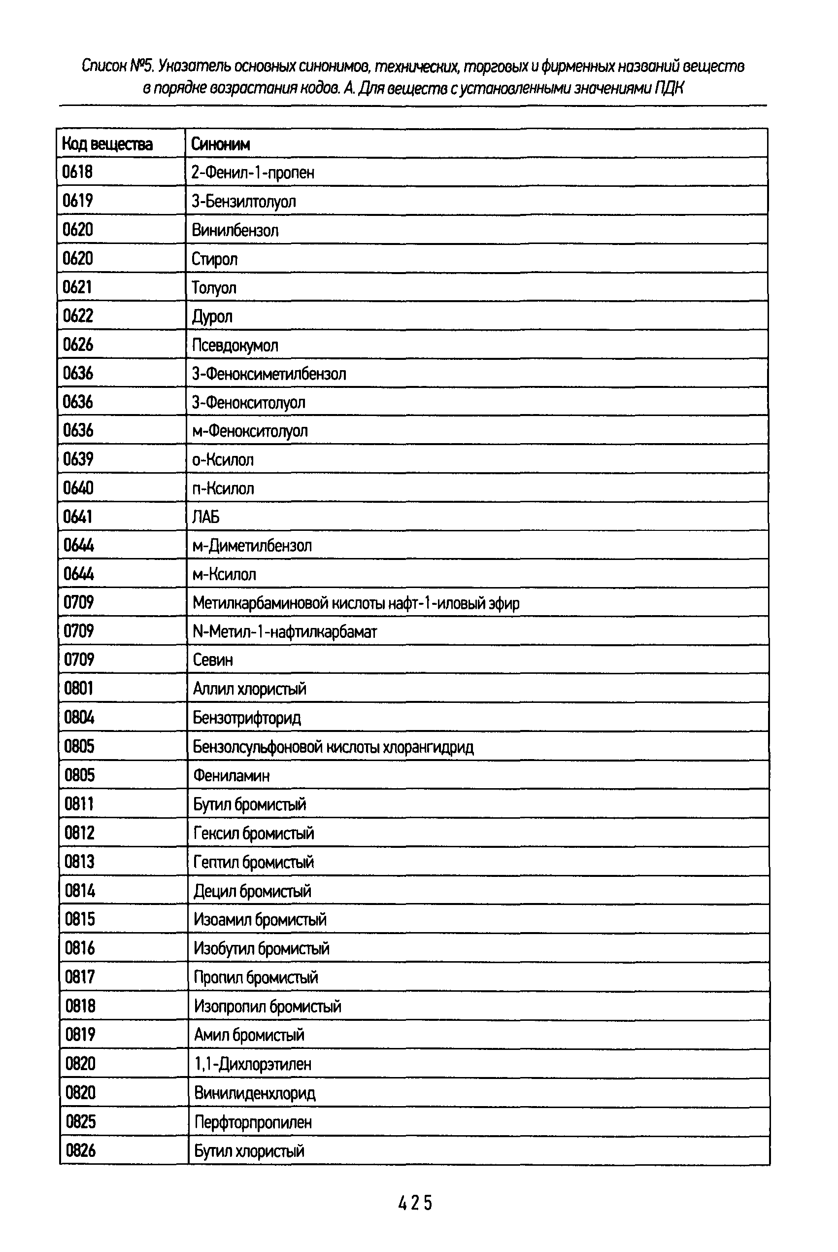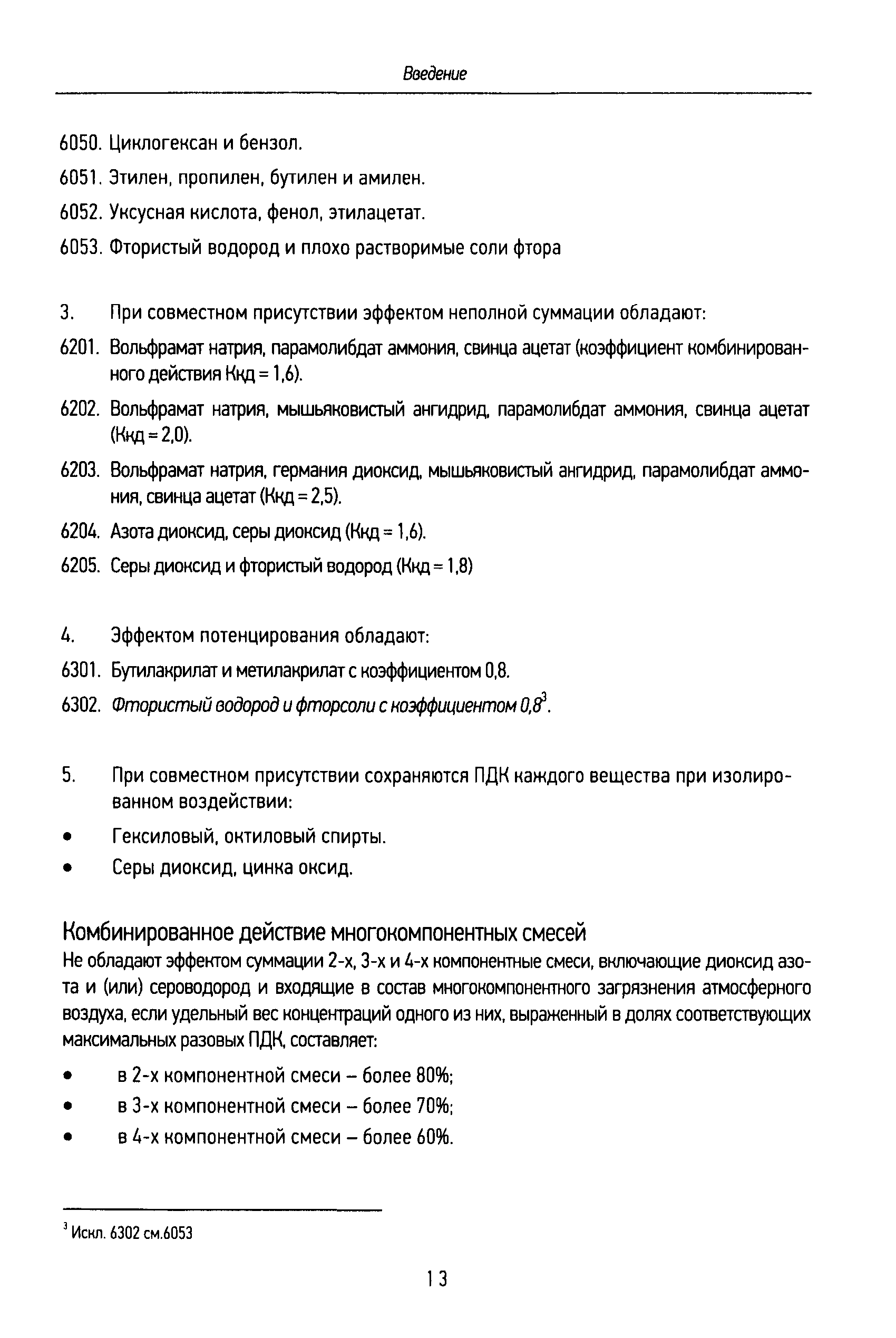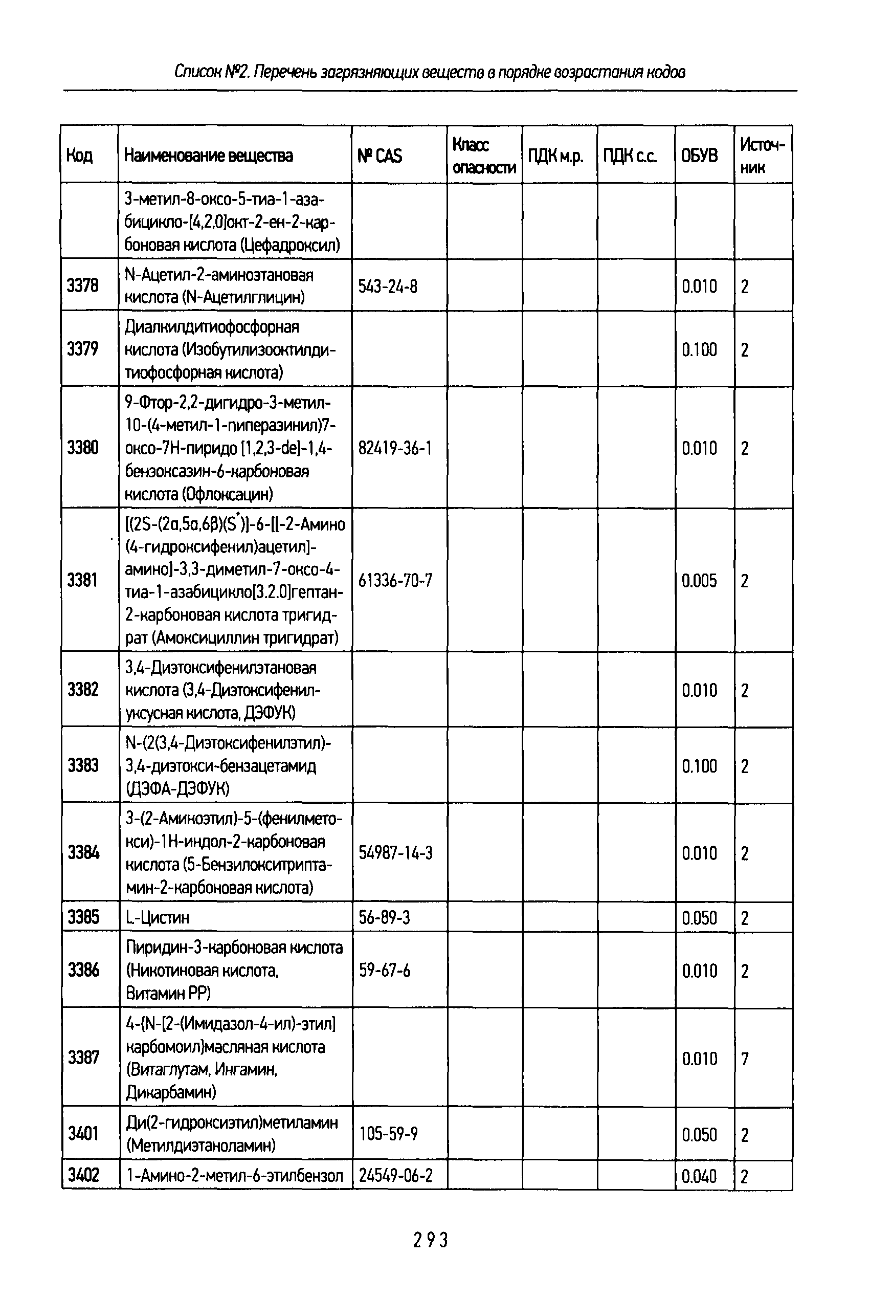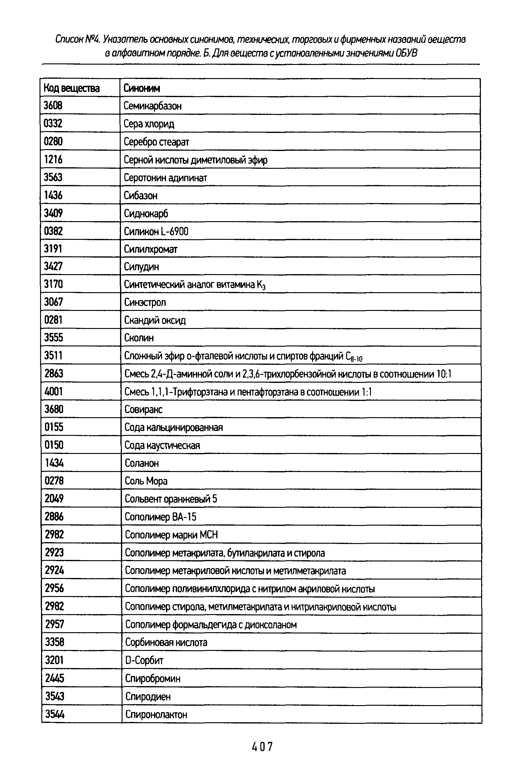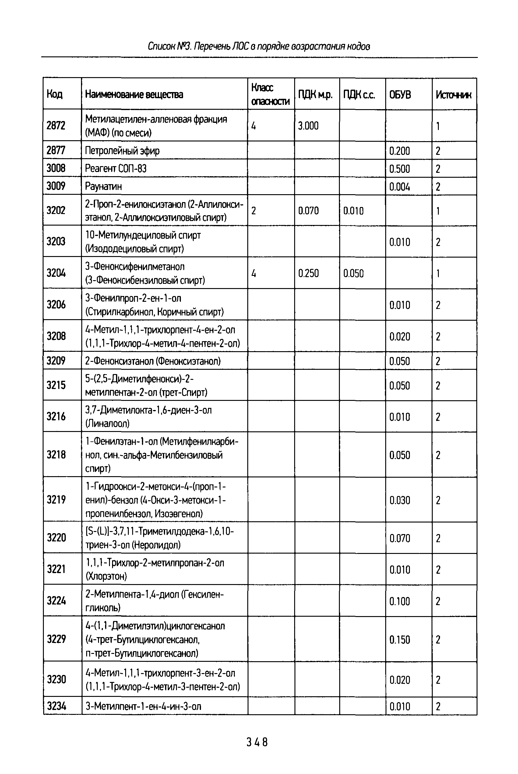 Перечень и коды веществ, загрязняющих атмосферный воздух (8 издание)| Статус: | заменен | | Название рус.: | Перечень и коды веществ, загрязняющих атмосферный воздух (8 издание) | | Дата добавления в базу: | 01.09.2013 | | Дата актуализации: | 01.01.2021 | | Область применения: | Перечень предназначен для территориальных и местных природоохранных органов, органов Роспотребнадзора и Ростехнадзора, предприятий и других организаций, в которых проводятся работы, связанные с охраной окружающей среды | | Оглавление: | 1. Введение 2. Список №1. Перечень загрязняющих веществ в алфавитном порядке 3. Список №2. Перечень загрязняющих веществ в порядке возрастания кодов 4. Список №3. Перечень ЛОС в порядке возрастания кодов 5. Список №4 Указатель основных синонимов, технических, торговых и фирменных названий веществ в алфавитном порядке A. Для веществ с установленными значениями ПДК B. Для веществ с установленными значениями ОБУВ 6. Список №5. Указатель основных синонимов, технических, торговых и фирменных названий веществ в порядке возрастания кодов A. Для веществ с установленными значениями ПДК B. Для веществ с установленными значениями ОБУВ | | Разработан: | НИИ Атмосфера Фирма Интеграл Научно-исследовательский институт экологии человека и окружающей среды им. А.И. Сысина
