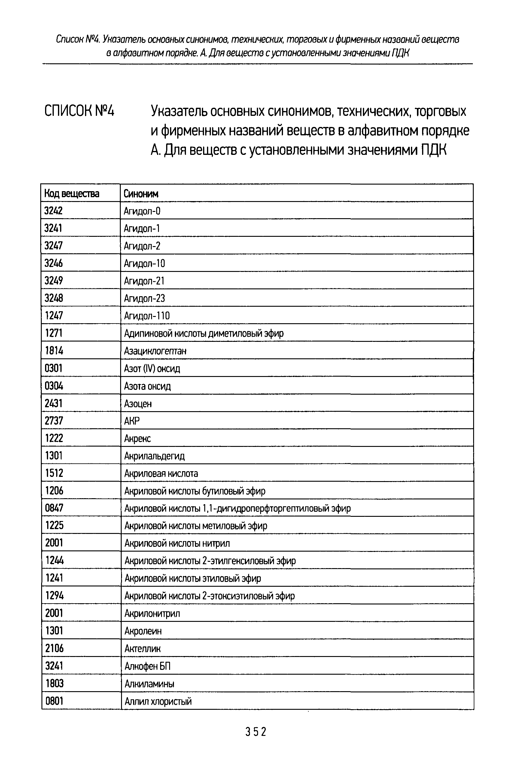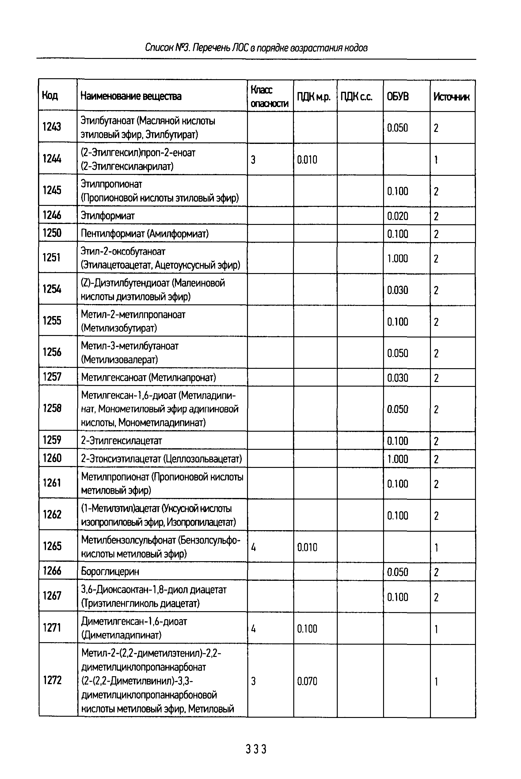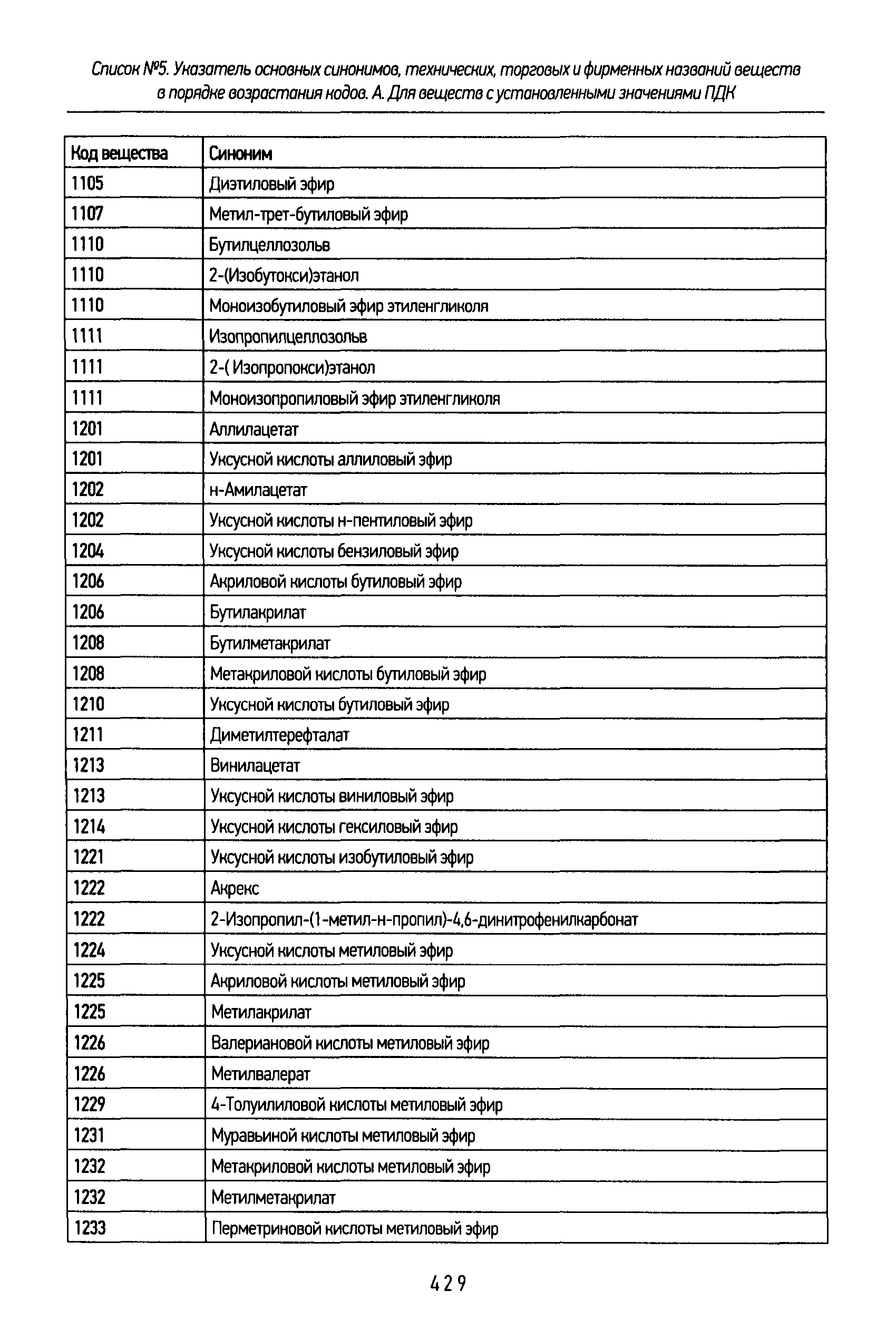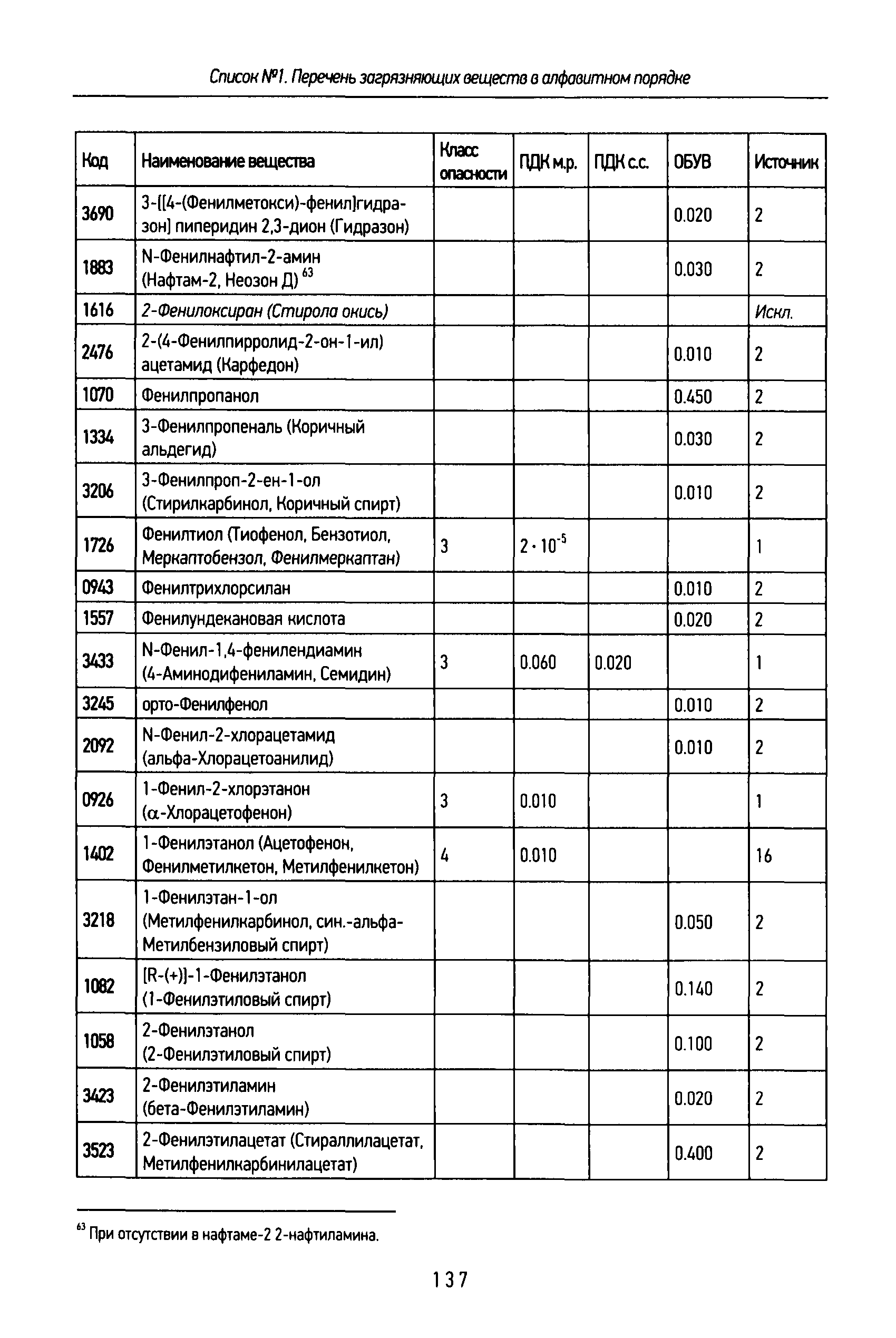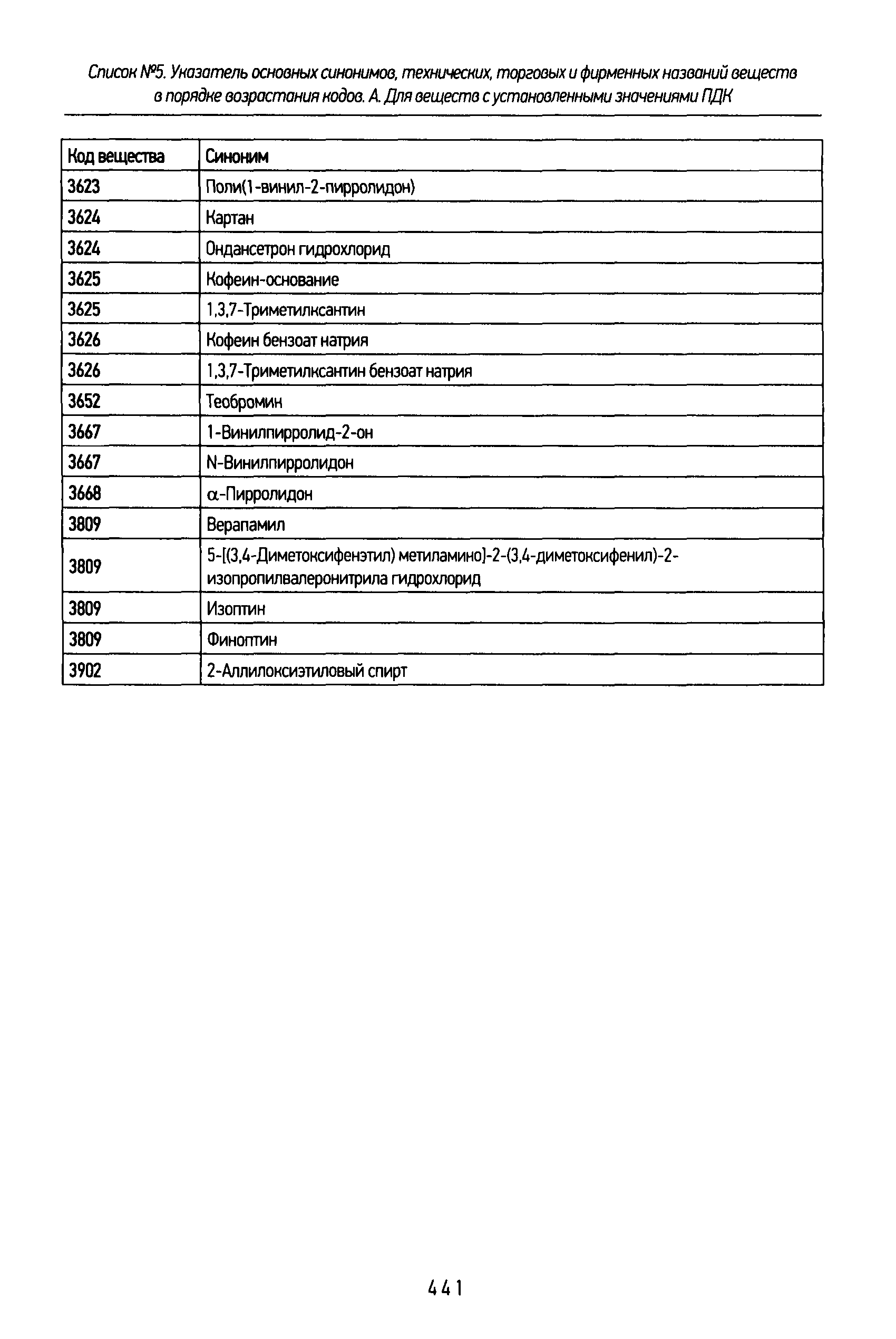 Перечень и коды веществ, загрязняющих атмосферный воздух (8 издание)| Статус: | заменен | | Название рус.: | Перечень и коды веществ, загрязняющих атмосферный воздух (8 издание) | | Дата добавления в базу: | 01.09.2013 | | Дата актуализации: | 01.01.2021 | | Область применения: | Перечень предназначен для территориальных и местных природоохранных органов, органов Роспотребнадзора и Ростехнадзора, предприятий и других организаций, в которых проводятся работы, связанные с охраной окружающей среды | | Оглавление: | 1. Введение 2. Список №1. Перечень загрязняющих веществ в алфавитном порядке 3. Список №2. Перечень загрязняющих веществ в порядке возрастания кодов 4. Список №3. Перечень ЛОС в порядке возрастания кодов 5. Список №4 Указатель основных синонимов, технических, торговых и фирменных названий веществ в алфавитном порядке A. Для веществ с установленными значениями ПДК B. Для веществ с установленными значениями ОБУВ 6. Список №5. Указатель основных синонимов, технических, торговых и фирменных названий веществ в порядке возрастания кодов A. Для веществ с установленными значениями ПДК B. Для веществ с установленными значениями ОБУВ | | Разработан: | НИИ Атмосфера Фирма Интеграл Научно-исследовательский институт экологии человека и окружающей среды им. А.И. Сысина