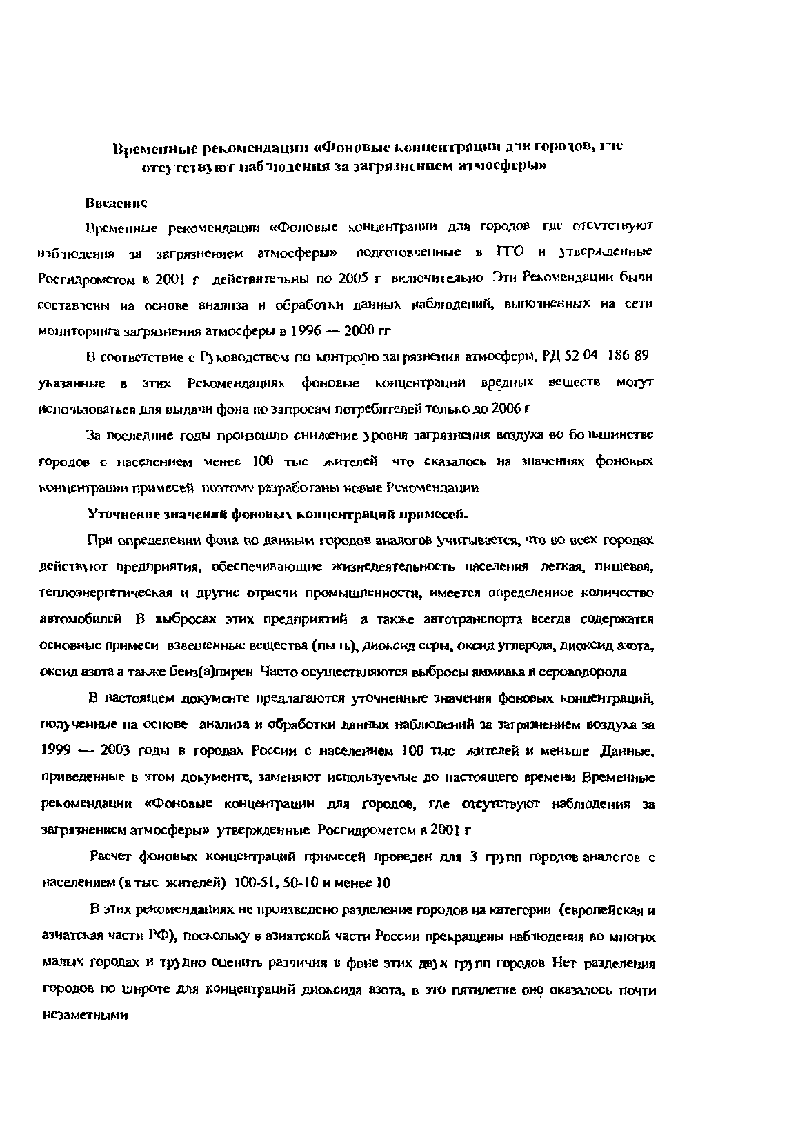 Временные рекомендации. Фоновые концентрации для городов и поселков, где отсутствуют наблюдения за загрязнением атмосферы на период 2005-2009 гг| Статус: | действует | | Название рус.: | Временные рекомендации. Фоновые концентрации для городов и поселков, где отсутствуют наблюдения за загрязнением атмосферы на период 2005-2009 гг | | Дата добавления в базу: | 01.09.2013 | | Дата актуализации: | 01.01.2021 | | Оглавление: | Введениее Уточнение значений фоновых концентраций примесей Новые значения фоновых концентраций примесей | | Утверждён: | 28.01.2005 Росгидромет (Rosgidromet )