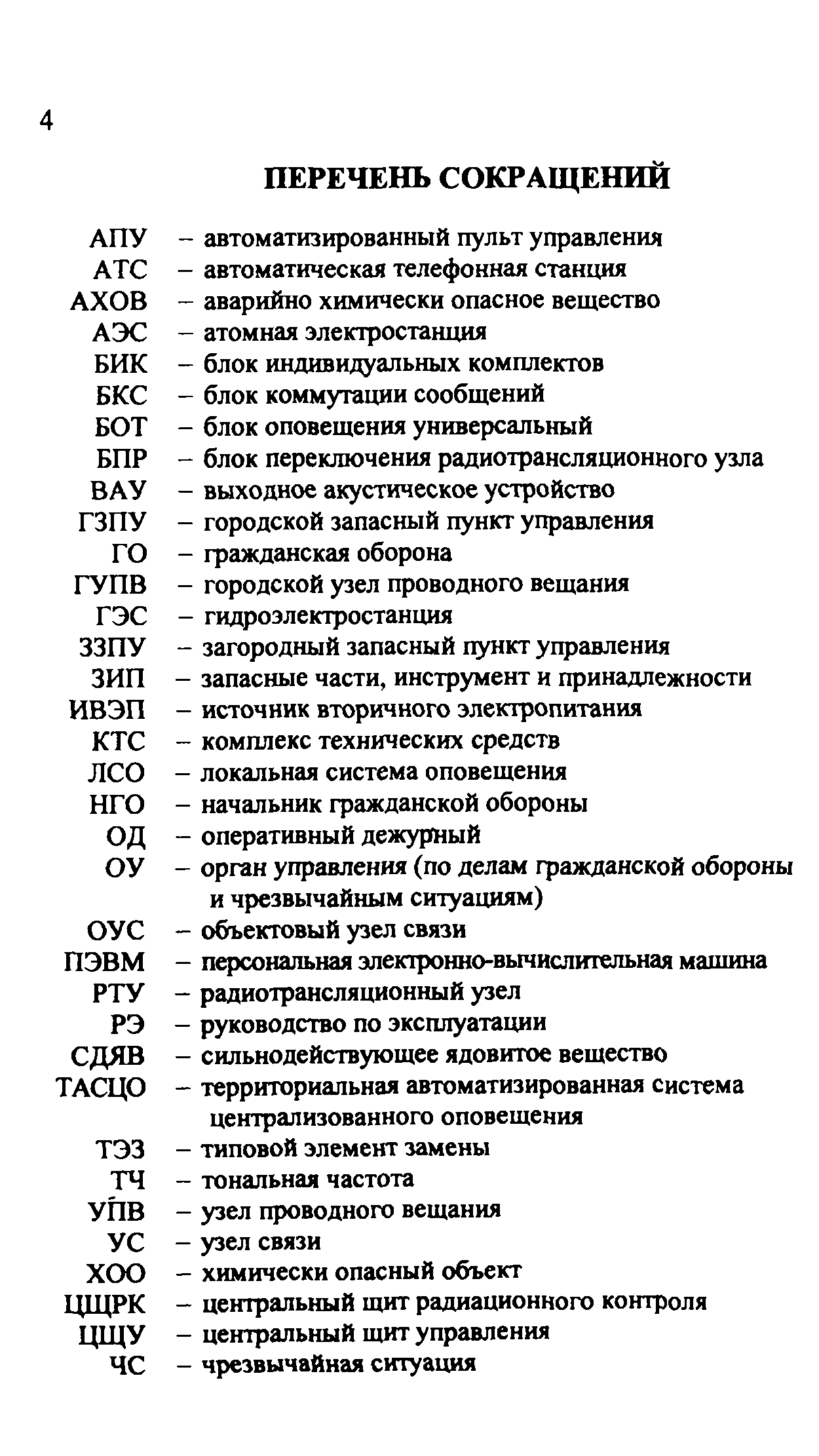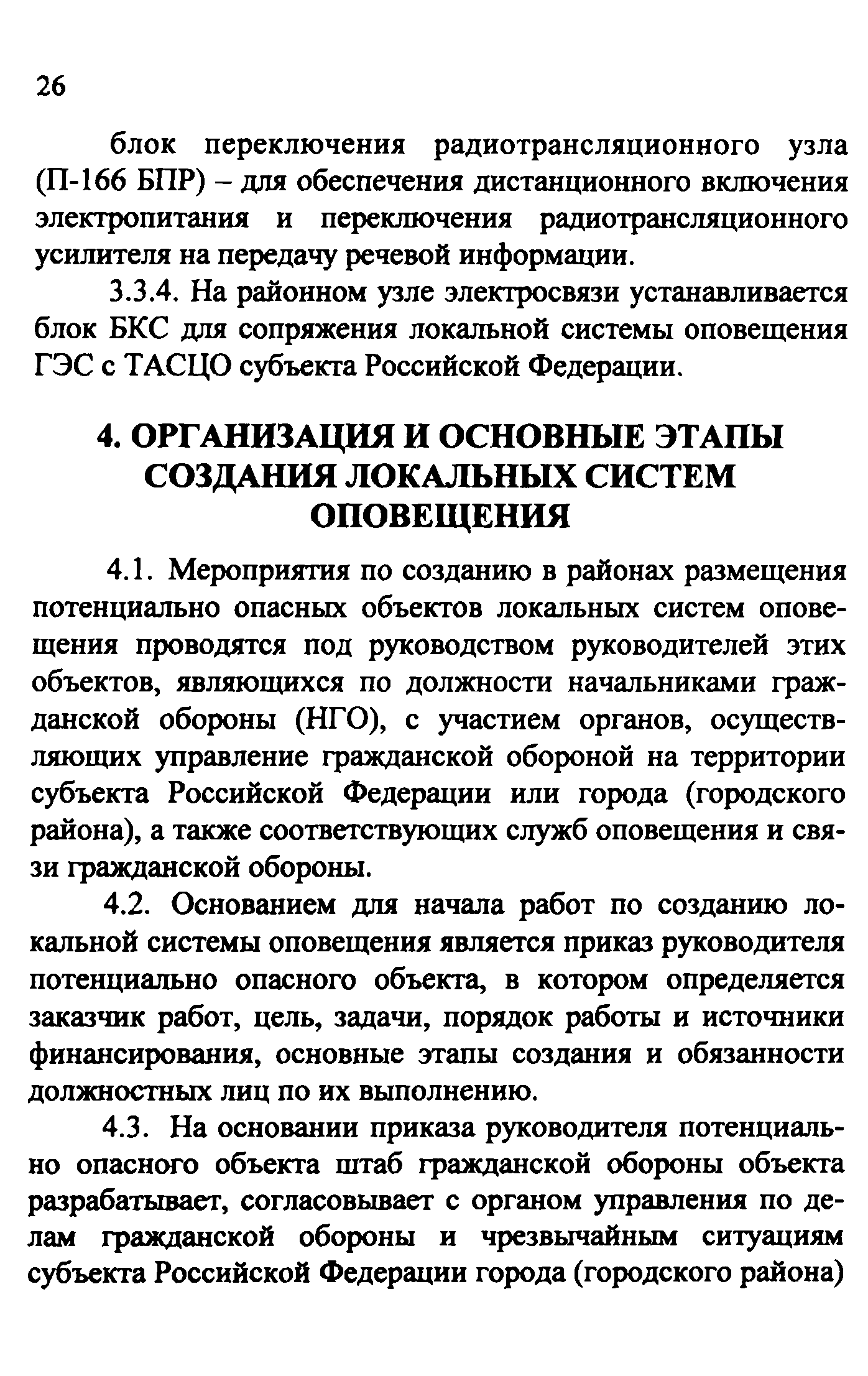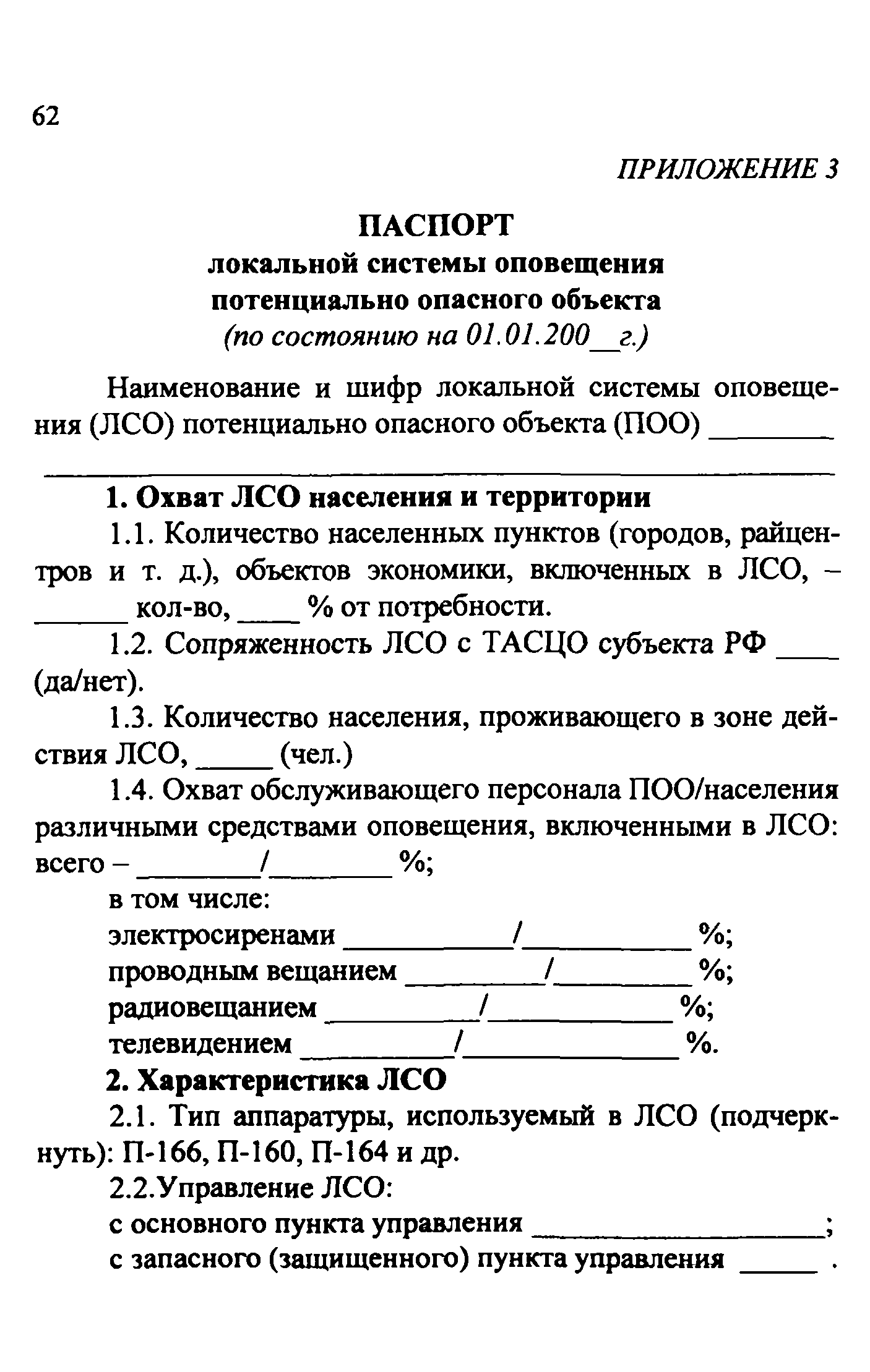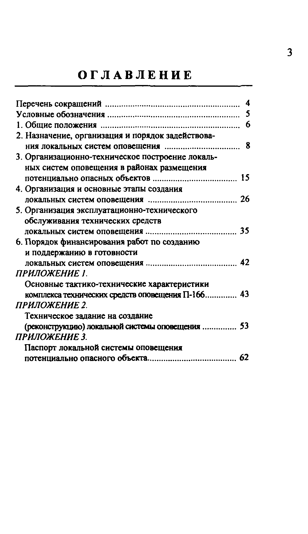 | Оглавление: | Перечень сокращений Условные обозначения 1. Общие положения 2. Назначение, организация и порядок задействования локальных систем оповещения 3. Организационно-техническое построение локальных систем оповещения в районах размещения потенциально опасных объектов 4. Организация и основные этапы создания локальных систем оповещения 5. Организация эксплуатационно-технического обслуживания технических средств локальных систем оповещения 6. Порядок финансирования работ по созданию и поддержанию в готовности локальных систем оповещения Приложение 1. Основные тактико-технические характеристики комплекса технических средств оповещения П-166 Приложение 2. Техническое задание на создание (реконструкцию) локальной системы оповещения Приложение 3. Паспорт локальной системы оповещения потенциально опасного объекта |