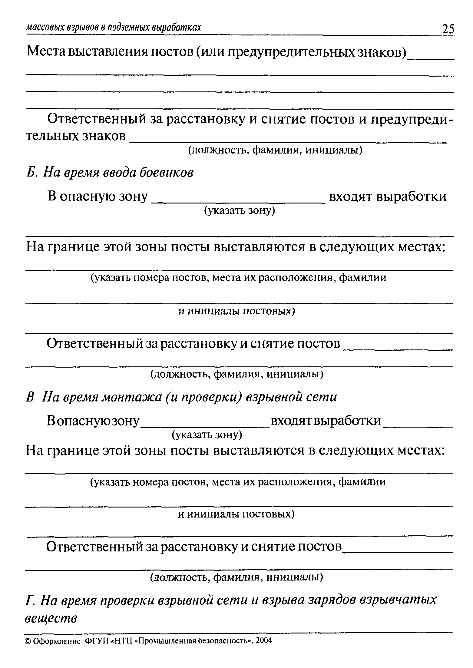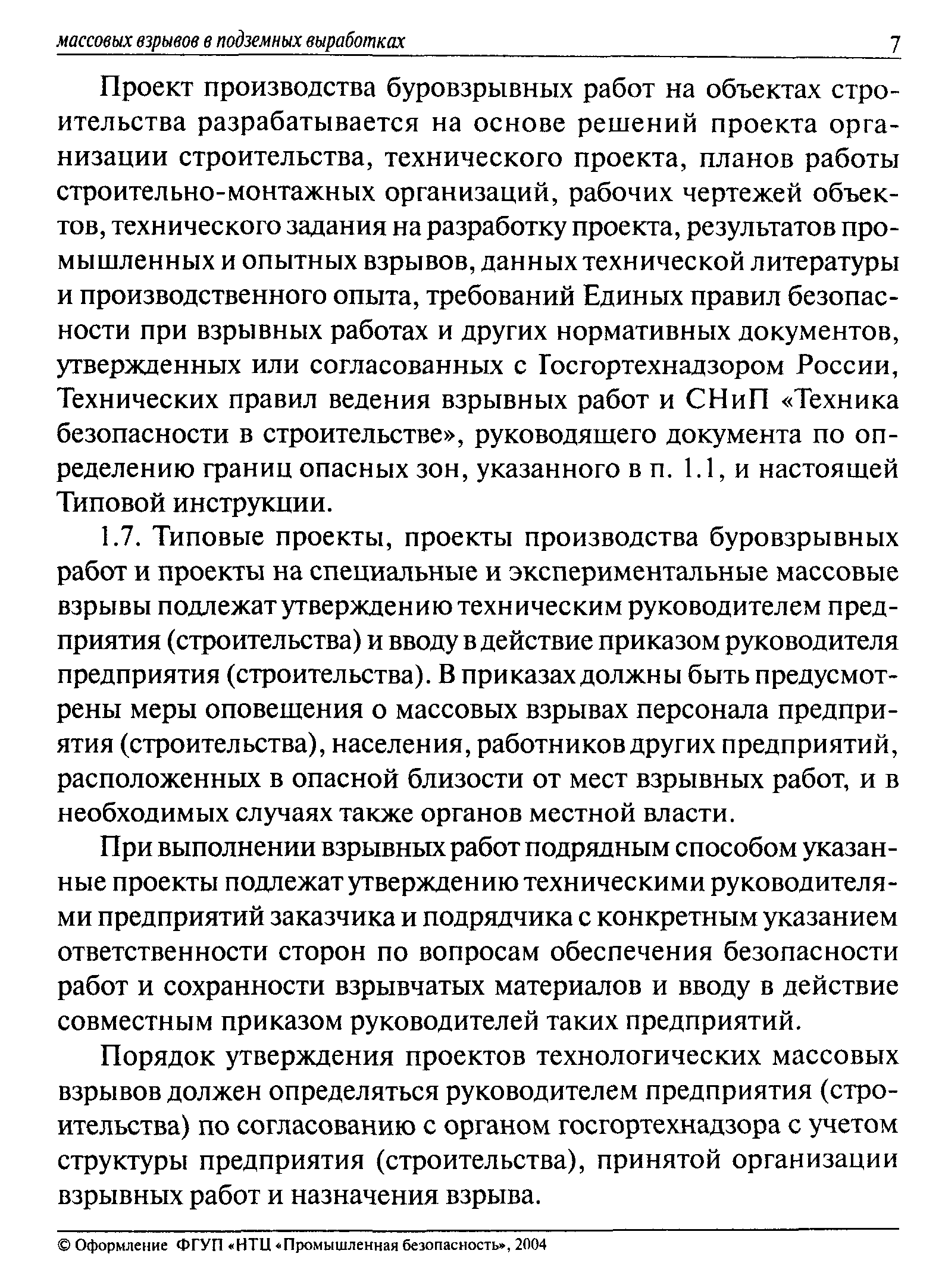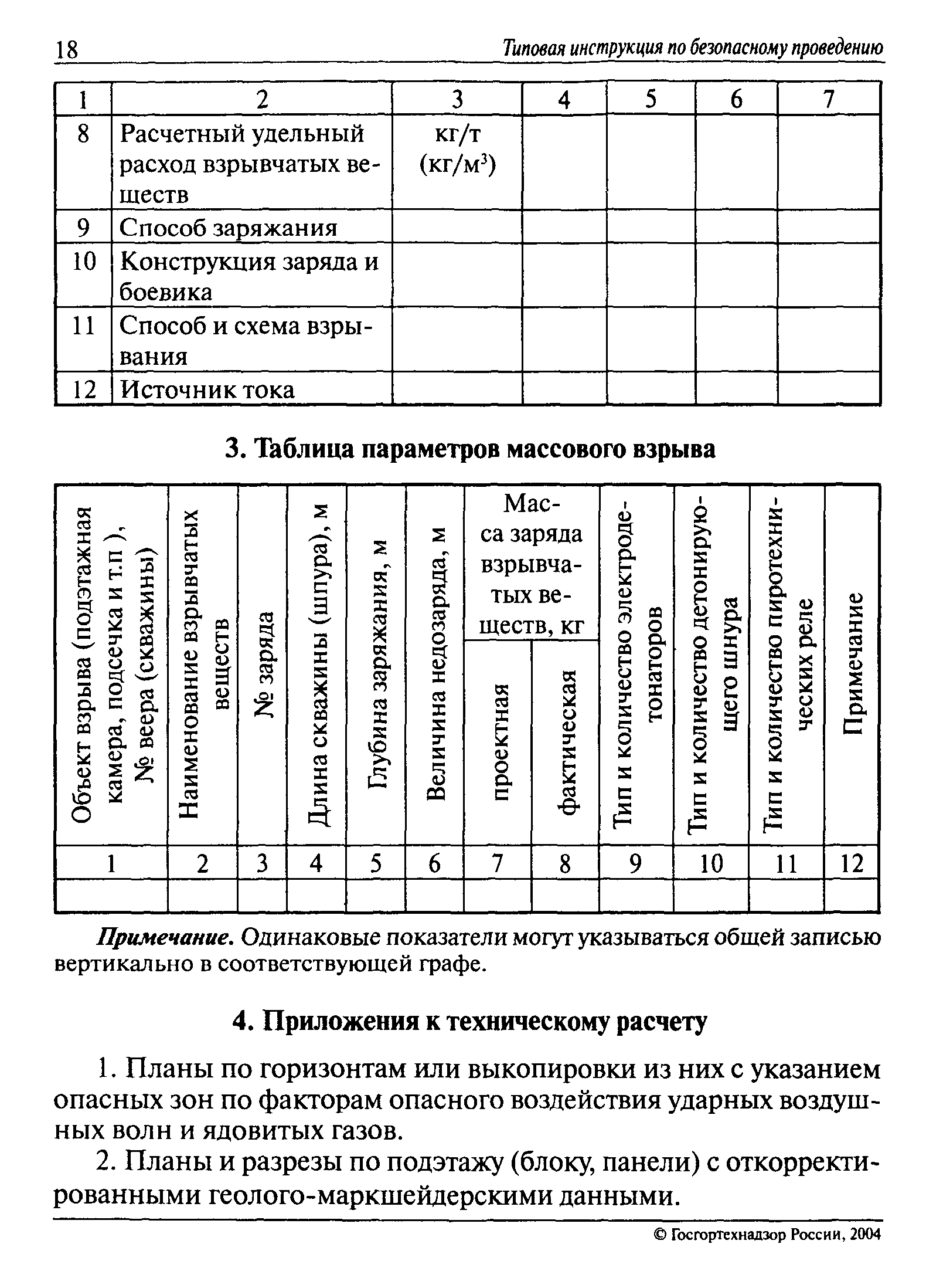 | Оглавление: | 1. Общие положения 2. Проектирование массовых взрывов 3. Организация проведения массового взрыва Приложение 1 Технический расчет массового взрыва Приложение 2 Распорядок проведения массового взрыва Приложение 3 Форма акта о готовности к проведению массового взрыва подэтажа (блока, панели) |