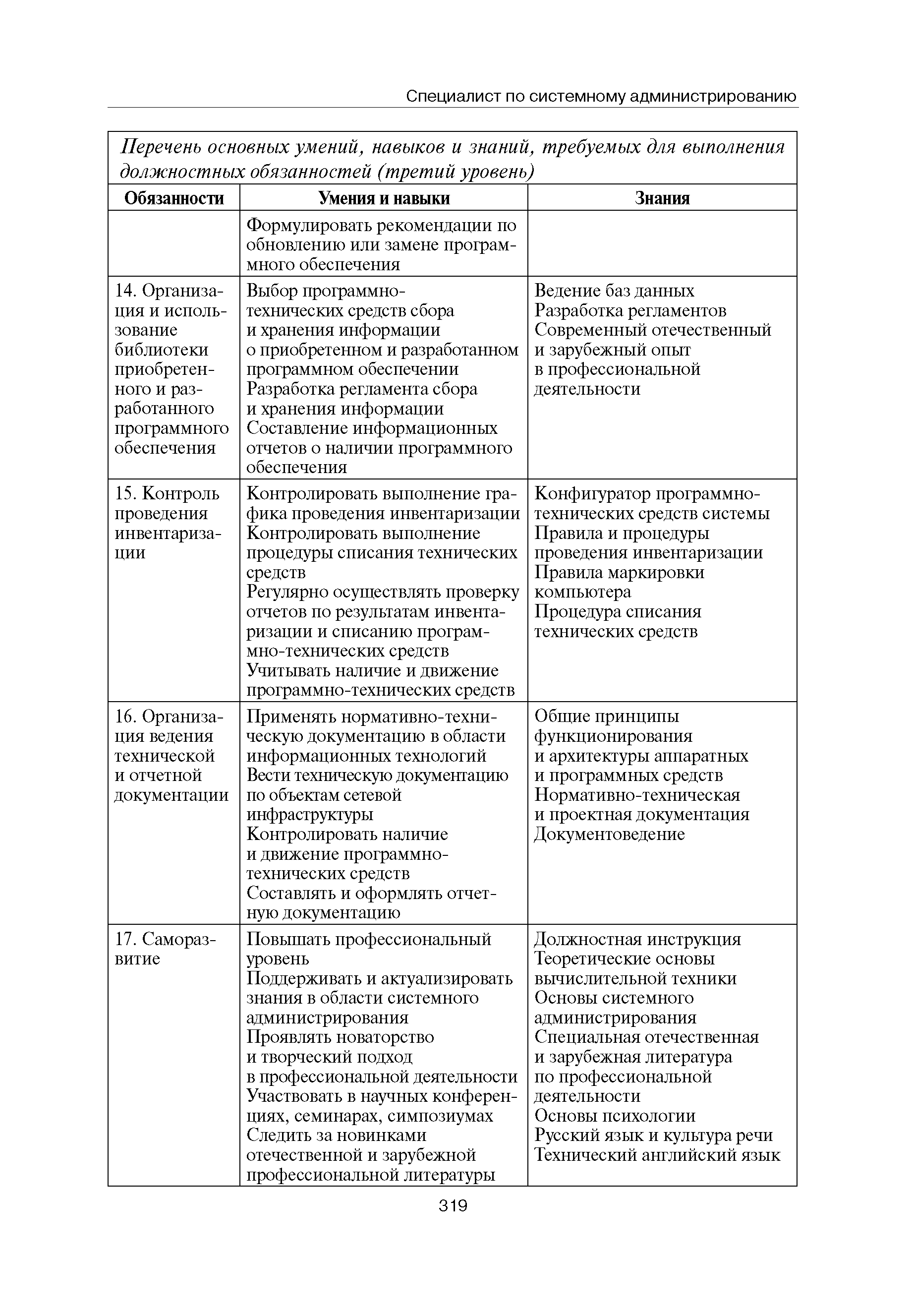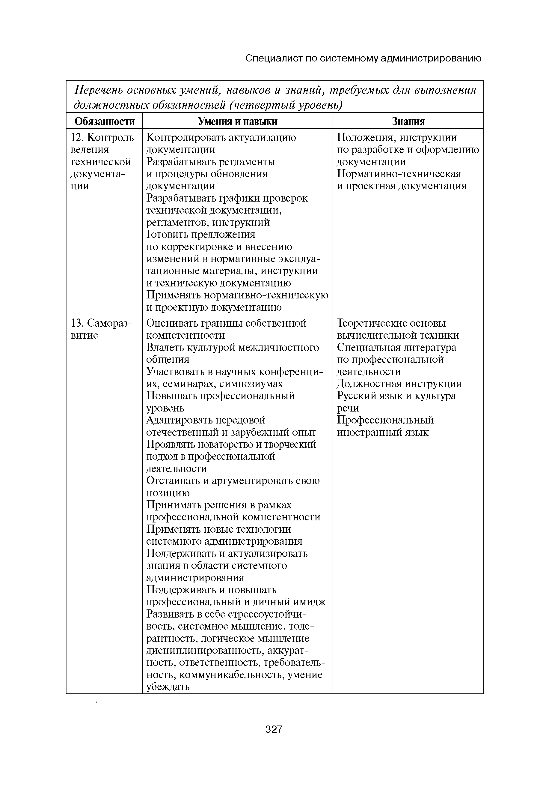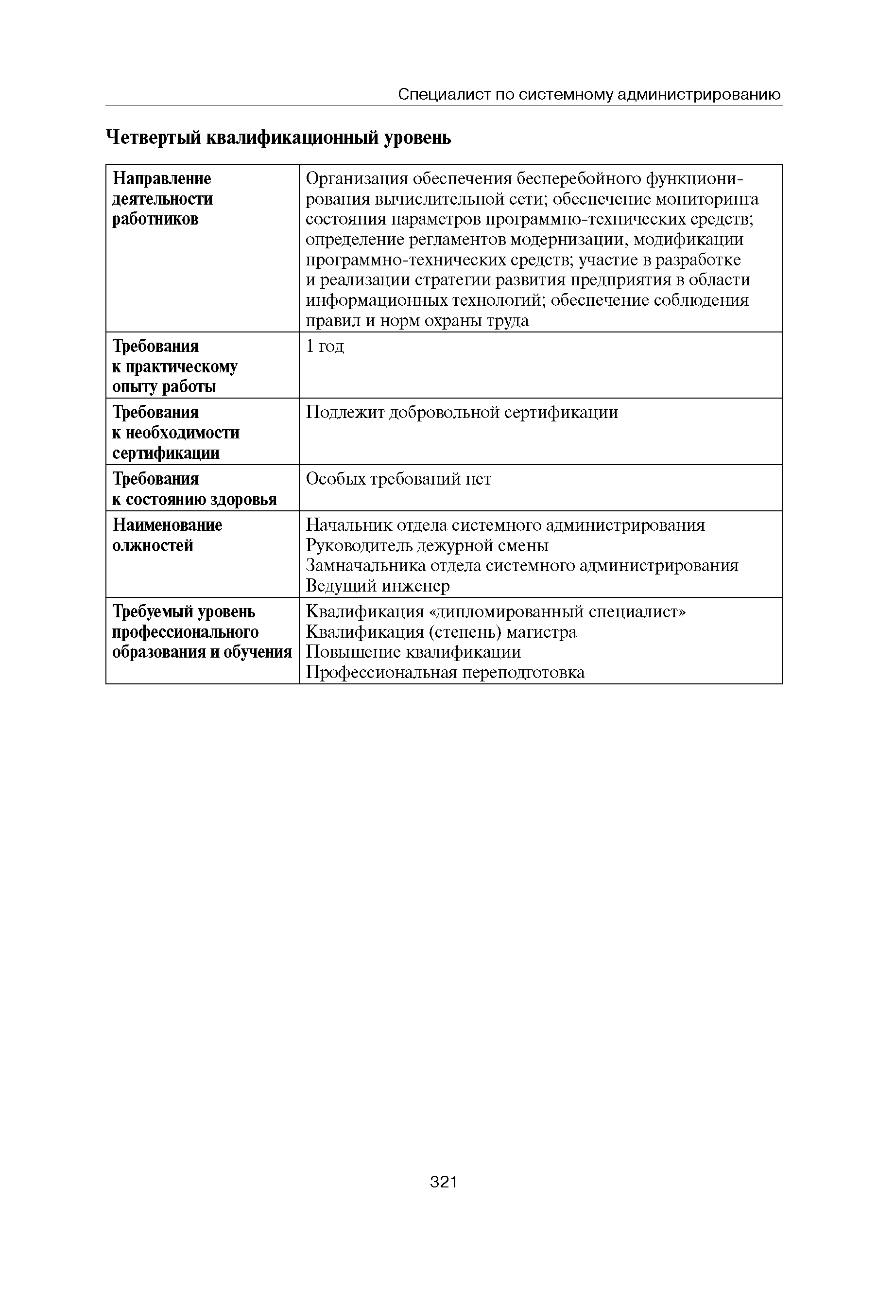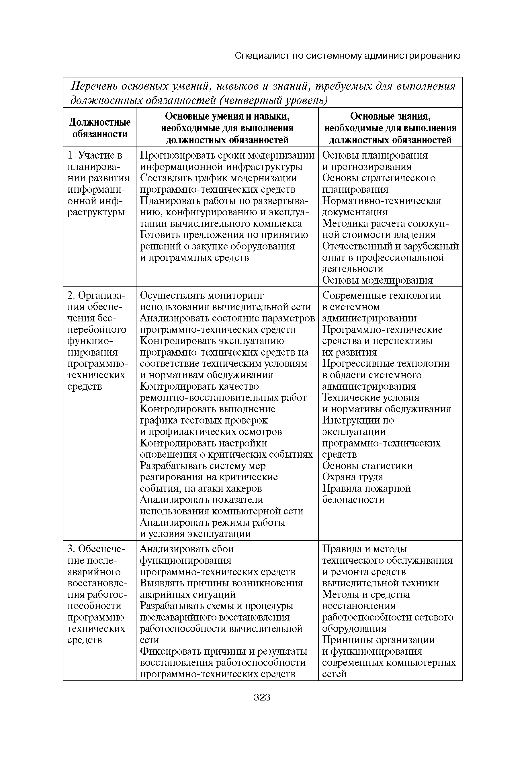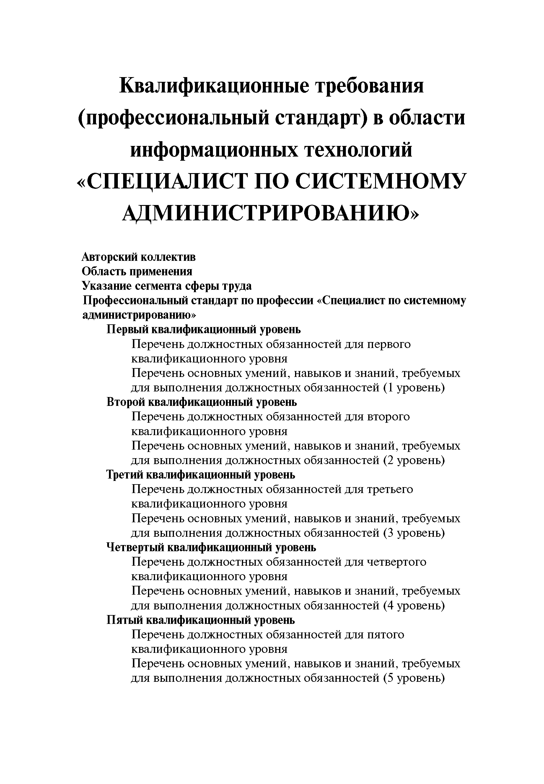 Квалификационные требования (профессиональный стандарт) в области информационных технологий "СПЕЦИАЛИСТ ПО СИСТЕМНОМУ АДМИНИСТРИРОВАНИЮ"| Статус: | действует | | Название рус.: | Квалификационные требования (профессиональный стандарт) в области информационных технологий "СПЕЦИАЛИСТ ПО СИСТЕМНОМУ АДМИНИСТРИРОВАНИЮ" | | Дата добавления в базу: | 01.09.2013 | | Дата актуализации: | 01.01.2021 | | Область применения: | Стандарт устанавливает требования к профессиональным компетенциям по квалификационным уровням. Рекомендован для применения в организациях всех форм собственности; для организаций крупного, среднего и малого бизнеса. Стандарт применяется в качестве нормативного документа, применяемого для подбора и расстановки кадров; планирования и нормирования труда; развития систем управления персоналом; для решения задач по профессиональной ориентации; для создания системы добровольной сертификации персонала и оценки уровня компетентности работников; для разработки образовательных стандартов и программ обучения в соответствии с требованиями работодателей; для проведения профессиональной подготовки, переподготовки и повышения квалификации персонала. | | Оглавление: | Авторский коллектив Область применения Указание сегмента сферы труда Профессиональный стандарт по профессии "Специалист по системному администрированию" Первый квалификационный уровень Перечень должностных обязанностей для первого квалификационного уровня Перечень основных умений, навыков и знаний, требуемых для выполнения должностных обязанностей (1 уровень) Второй квалификационный уровень Перечень должностных обязанностей для второго квалификационного уровня Перечень основных умений, навыков и знаний, требуемых для выполнения должностных обязанностей (2 уровень) Третий квалификационный уровень Перечень должностных обязанностей для третьего квалификационного уровня Перечень основных умений, навыков и знаний, требуемых для выполнения должностных обязанностей (3 уровень) Четвертый квалификационный уровень Перечень должностных обязанностей для четвертого квалификационного уровня Перечень основных умений, навыков и знаний, требуемых для выполнения должностных обязанностей (4 уровень) Пятый квалификационный уровень Перечень должностных обязанностей для пятого квалификационного уровня Перечень основных умений, навыков и знаний, требуемых для выполнения должностных обязанностей (5 уровень) | | Разработан: | Государственный университет - Высшая школа экономики ФГУП Рособоронэкспорт НИИ Министерства обороны РФ Проктер Энд Гэмбл ООО МОСТ-1