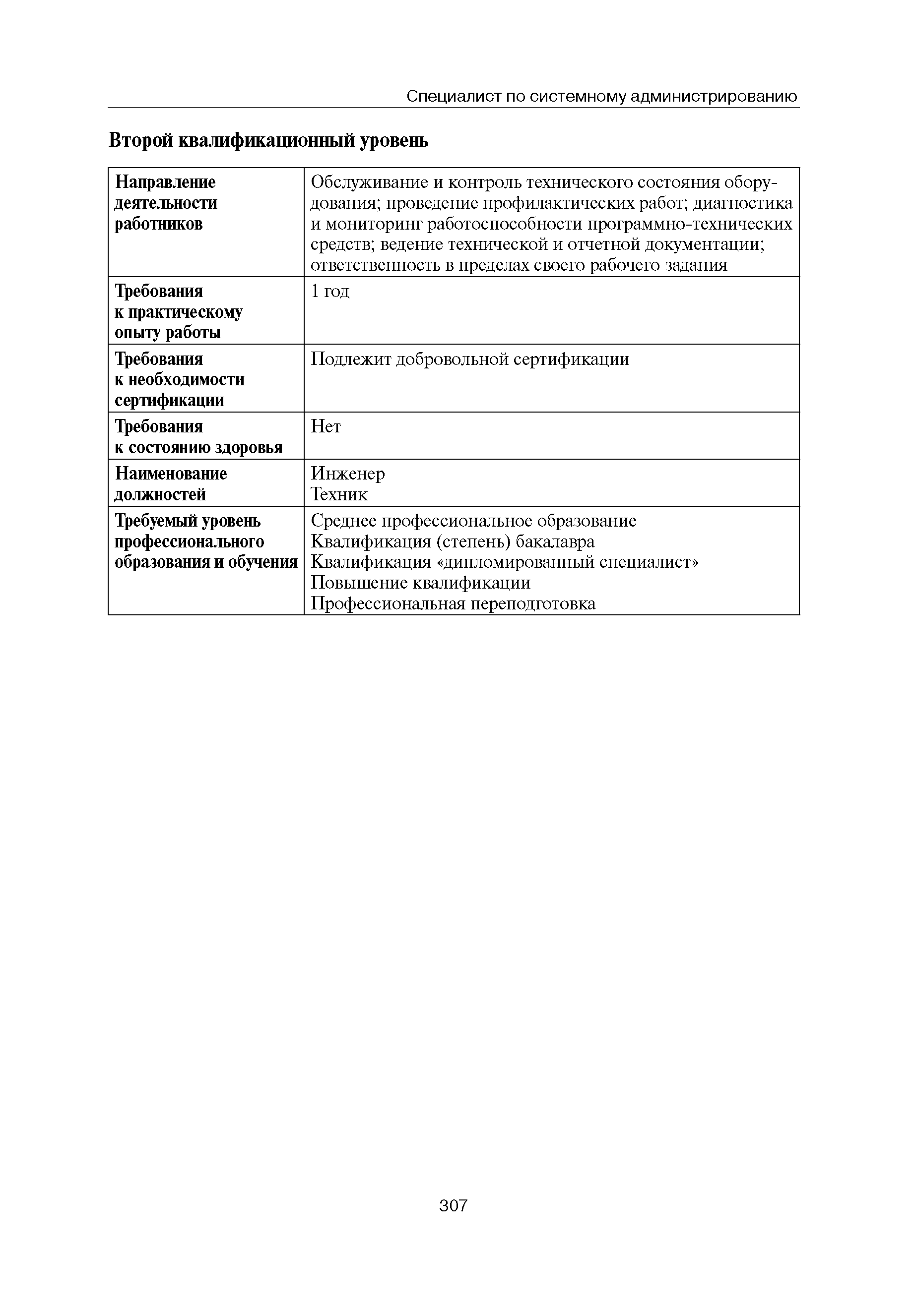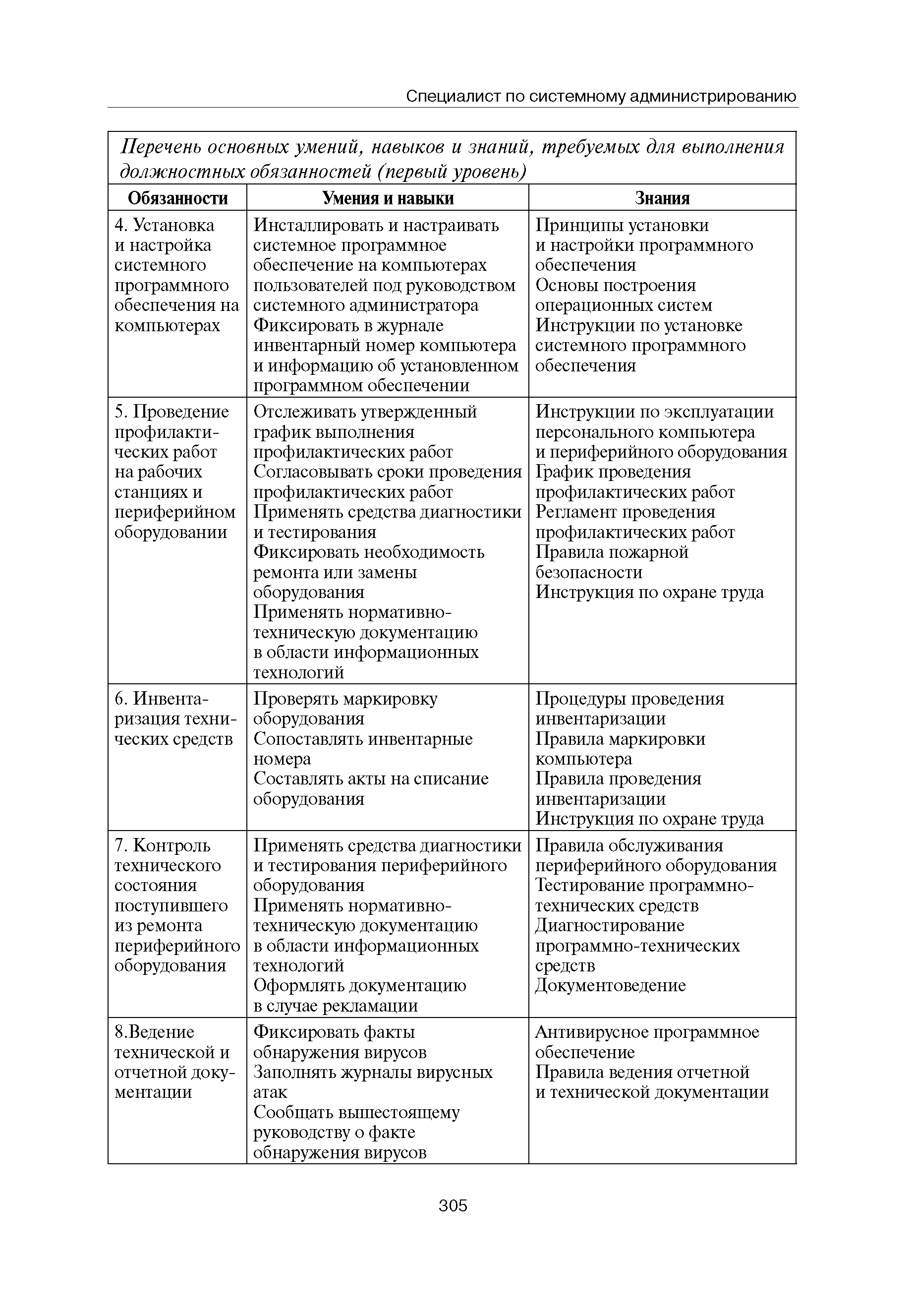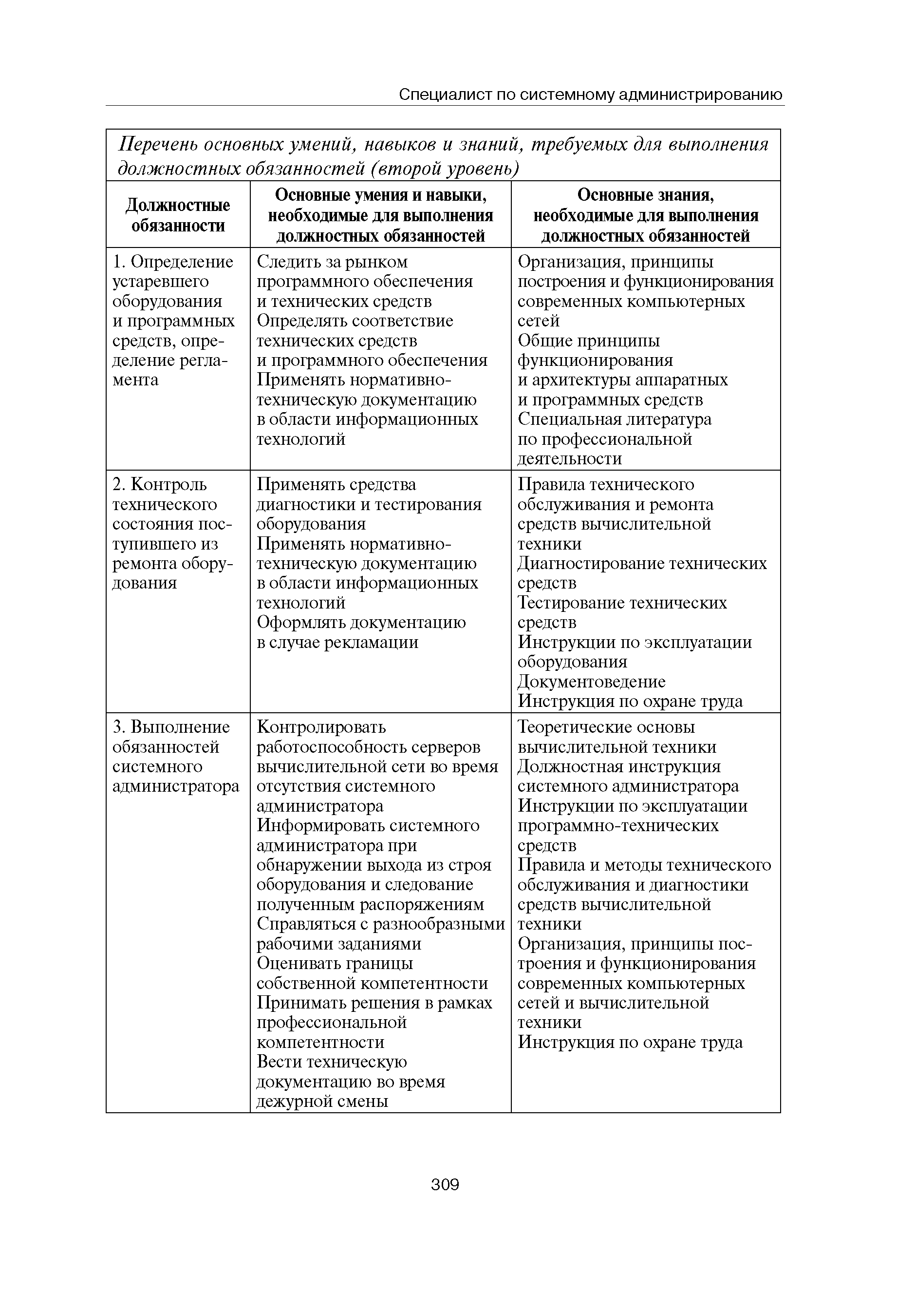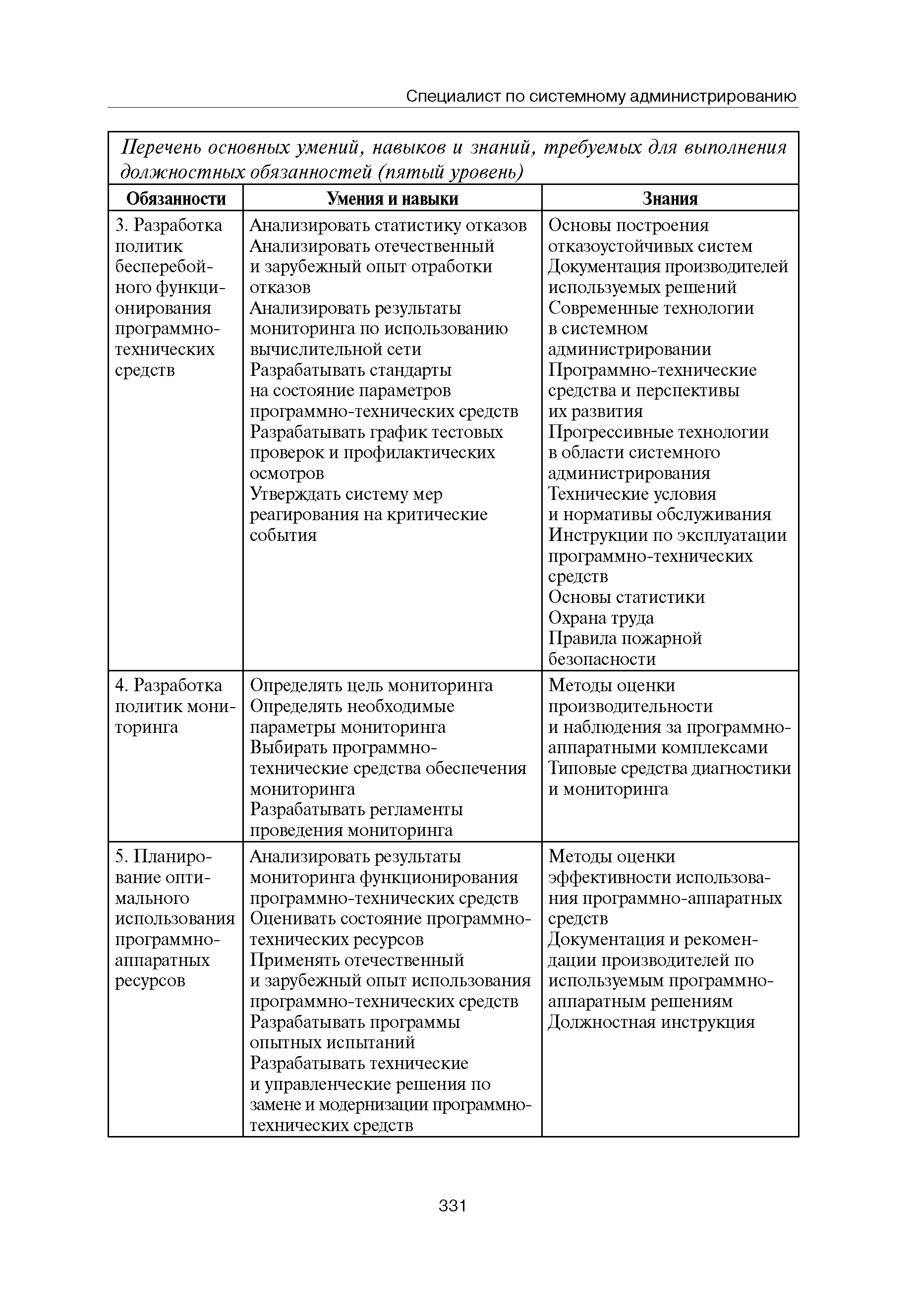 Квалификационные требования (профессиональный стандарт) в области информационных технологий "СПЕЦИАЛИСТ ПО СИСТЕМНОМУ АДМИНИСТРИРОВАНИЮ"| Статус: | действует | | Название рус.: | Квалификационные требования (профессиональный стандарт) в области информационных технологий "СПЕЦИАЛИСТ ПО СИСТЕМНОМУ АДМИНИСТРИРОВАНИЮ" | | Дата добавления в базу: | 01.09.2013 | | Дата актуализации: | 01.01.2021 | | Область применения: | Стандарт устанавливает требования к профессиональным компетенциям по квалификационным уровням. Рекомендован для применения в организациях всех форм собственности; для организаций крупного, среднего и малого бизнеса. Стандарт применяется в качестве нормативного документа, применяемого для подбора и расстановки кадров; планирования и нормирования труда; развития систем управления персоналом; для решения задач по профессиональной ориентации; для создания системы добровольной сертификации персонала и оценки уровня компетентности работников; для разработки образовательных стандартов и программ обучения в соответствии с требованиями работодателей; для проведения профессиональной подготовки, переподготовки и повышения квалификации персонала. | | Оглавление: | Авторский коллектив Область применения Указание сегмента сферы труда Профессиональный стандарт по профессии "Специалист по системному администрированию" Первый квалификационный уровень Перечень должностных обязанностей для первого квалификационного уровня Перечень основных умений, навыков и знаний, требуемых для выполнения должностных обязанностей (1 уровень) Второй квалификационный уровень Перечень должностных обязанностей для второго квалификационного уровня Перечень основных умений, навыков и знаний, требуемых для выполнения должностных обязанностей (2 уровень) Третий квалификационный уровень Перечень должностных обязанностей для третьего квалификационного уровня Перечень основных умений, навыков и знаний, требуемых для выполнения должностных обязанностей (3 уровень) Четвертый квалификационный уровень Перечень должностных обязанностей для четвертого квалификационного уровня Перечень основных умений, навыков и знаний, требуемых для выполнения должностных обязанностей (4 уровень) Пятый квалификационный уровень Перечень должностных обязанностей для пятого квалификационного уровня Перечень основных умений, навыков и знаний, требуемых для выполнения должностных обязанностей (5 уровень) | | Разработан: | Государственный университет - Высшая школа экономики ФГУП Рособоронэкспорт НИИ Министерства обороны РФ Проктер Энд Гэмбл ООО МОСТ-1