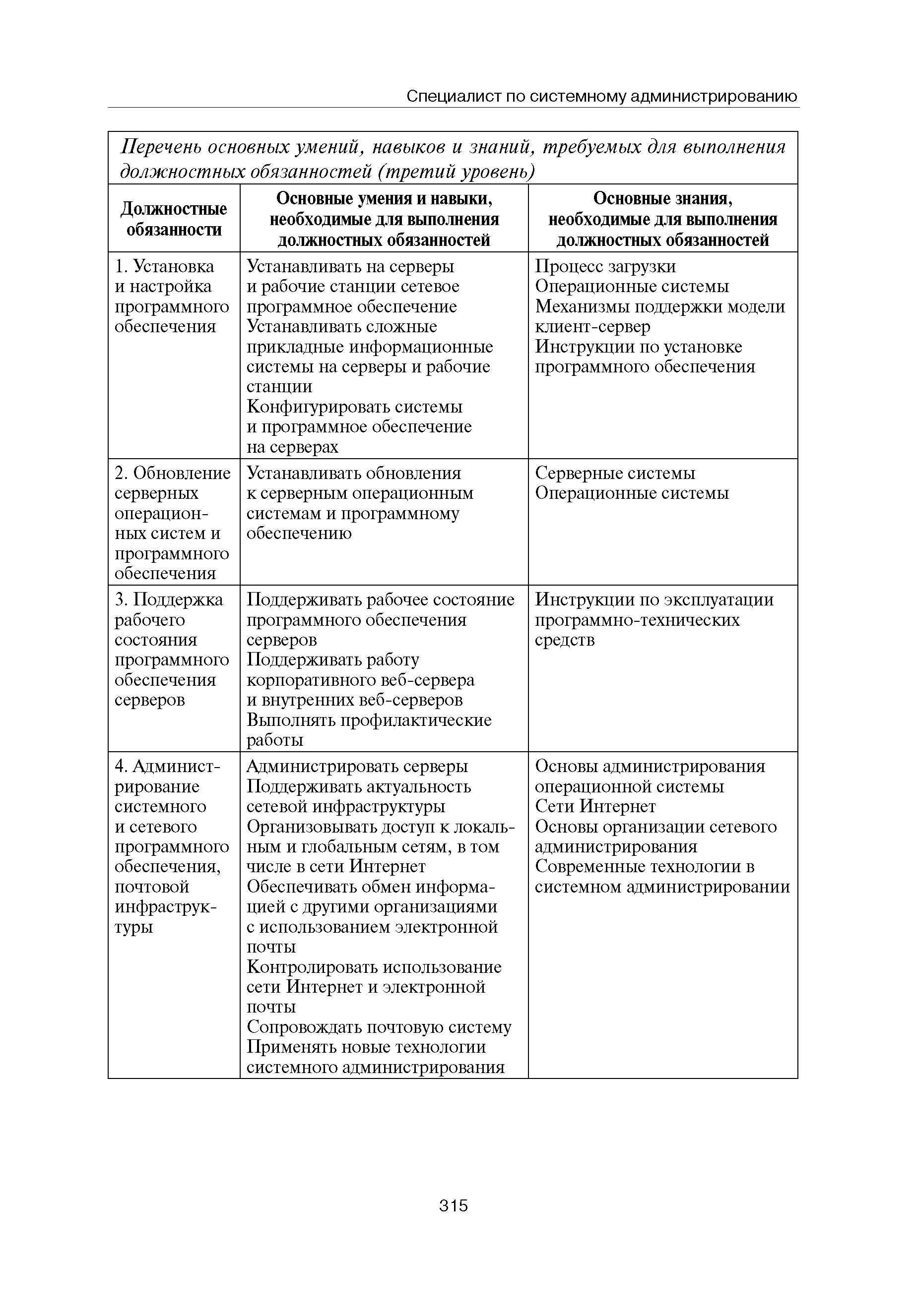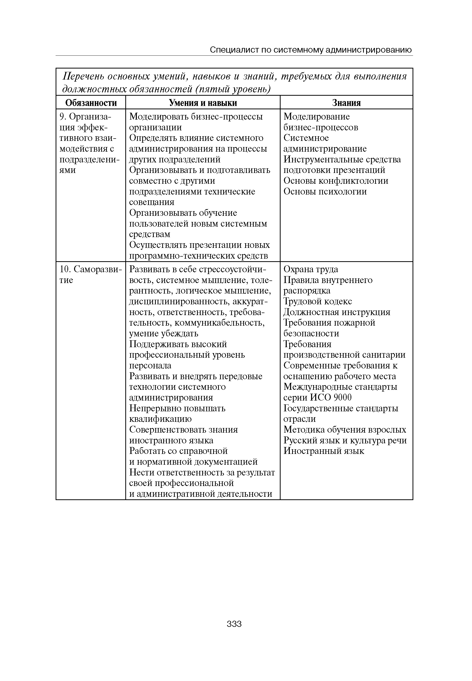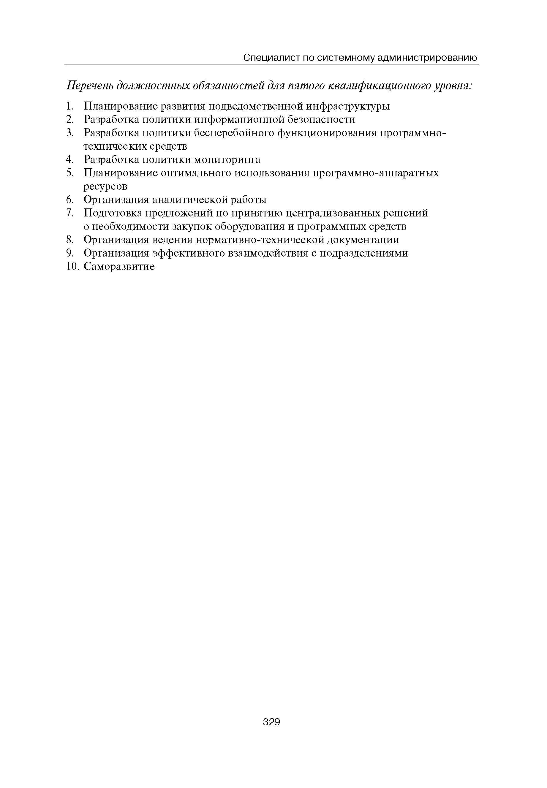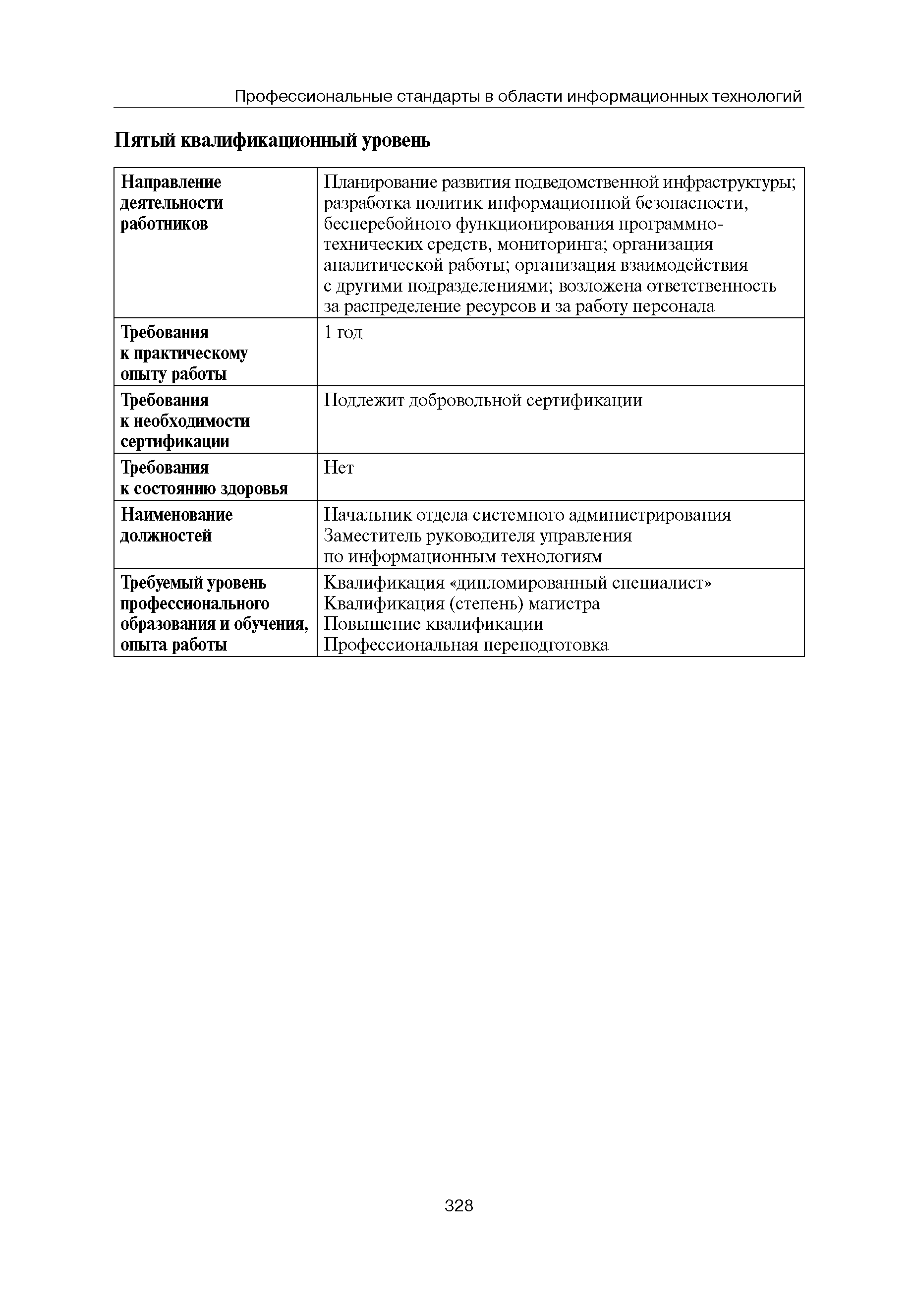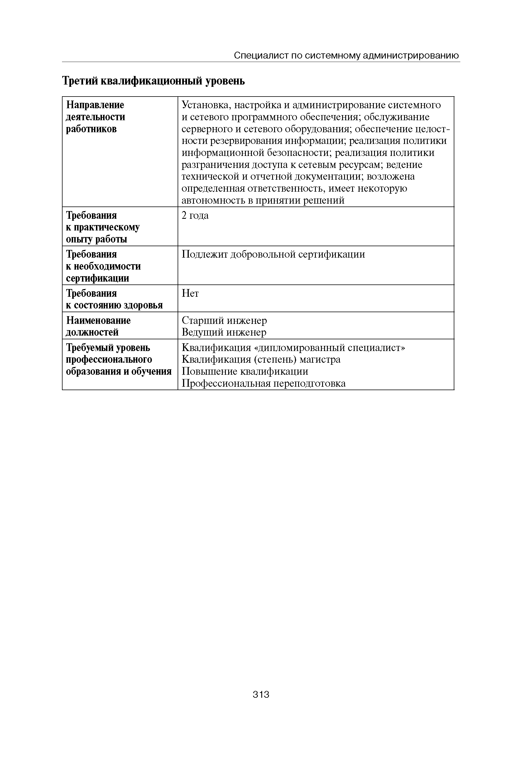 Квалификационные требования (профессиональный стандарт) в области информационных технологий "СПЕЦИАЛИСТ ПО СИСТЕМНОМУ АДМИНИСТРИРОВАНИЮ"| Статус: | действует | | Название рус.: | Квалификационные требования (профессиональный стандарт) в области информационных технологий "СПЕЦИАЛИСТ ПО СИСТЕМНОМУ АДМИНИСТРИРОВАНИЮ" | | Дата добавления в базу: | 01.09.2013 | | Дата актуализации: | 01.01.2021 | | Область применения: | Стандарт устанавливает требования к профессиональным компетенциям по квалификационным уровням. Рекомендован для применения в организациях всех форм собственности; для организаций крупного, среднего и малого бизнеса. Стандарт применяется в качестве нормативного документа, применяемого для подбора и расстановки кадров; планирования и нормирования труда; развития систем управления персоналом; для решения задач по профессиональной ориентации; для создания системы добровольной сертификации персонала и оценки уровня компетентности работников; для разработки образовательных стандартов и программ обучения в соответствии с требованиями работодателей; для проведения профессиональной подготовки, переподготовки и повышения квалификации персонала. | | Оглавление: | Авторский коллектив Область применения Указание сегмента сферы труда Профессиональный стандарт по профессии "Специалист по системному администрированию" Первый квалификационный уровень Перечень должностных обязанностей для первого квалификационного уровня Перечень основных умений, навыков и знаний, требуемых для выполнения должностных обязанностей (1 уровень) Второй квалификационный уровень Перечень должностных обязанностей для второго квалификационного уровня Перечень основных умений, навыков и знаний, требуемых для выполнения должностных обязанностей (2 уровень) Третий квалификационный уровень Перечень должностных обязанностей для третьего квалификационного уровня Перечень основных умений, навыков и знаний, требуемых для выполнения должностных обязанностей (3 уровень) Четвертый квалификационный уровень Перечень должностных обязанностей для четвертого квалификационного уровня Перечень основных умений, навыков и знаний, требуемых для выполнения должностных обязанностей (4 уровень) Пятый квалификационный уровень Перечень должностных обязанностей для пятого квалификационного уровня Перечень основных умений, навыков и знаний, требуемых для выполнения должностных обязанностей (5 уровень) | | Разработан: | Государственный университет - Высшая школа экономики ФГУП Рособоронэкспорт НИИ Министерства обороны РФ Проктер Энд Гэмбл ООО МОСТ-1
