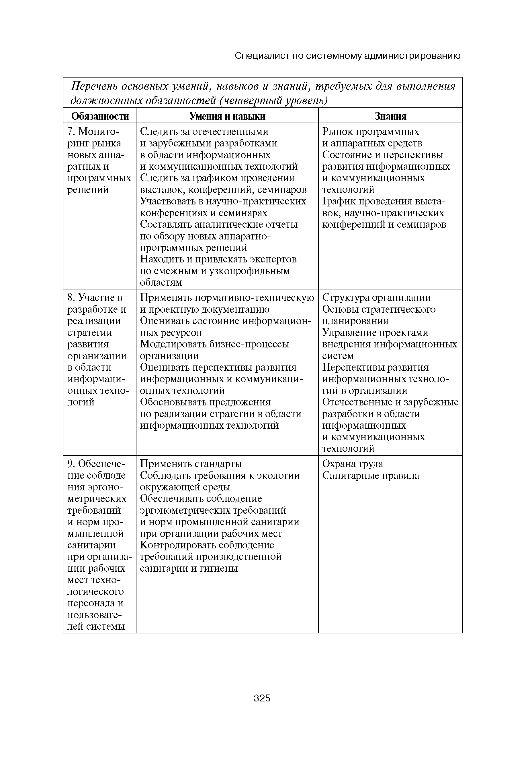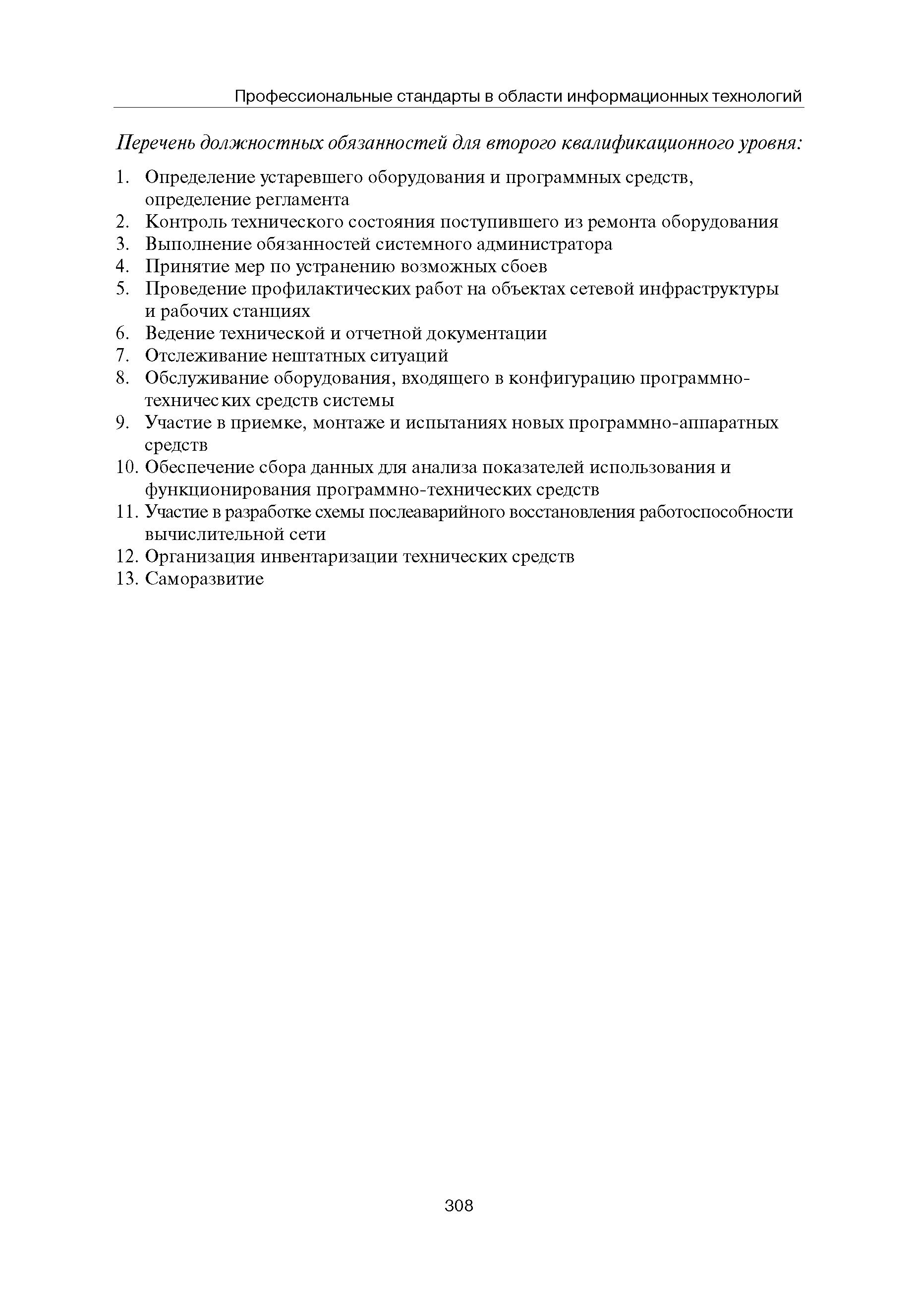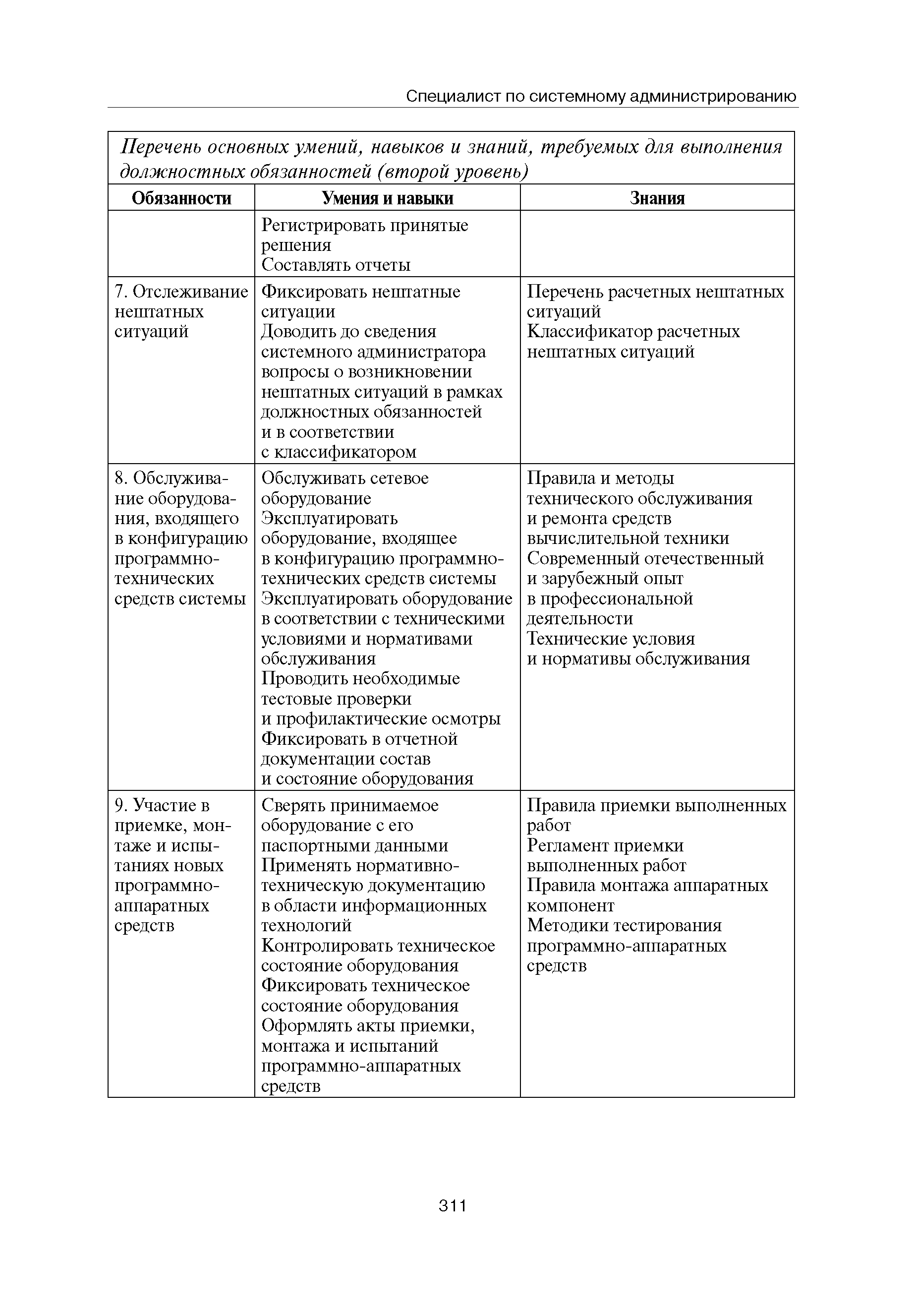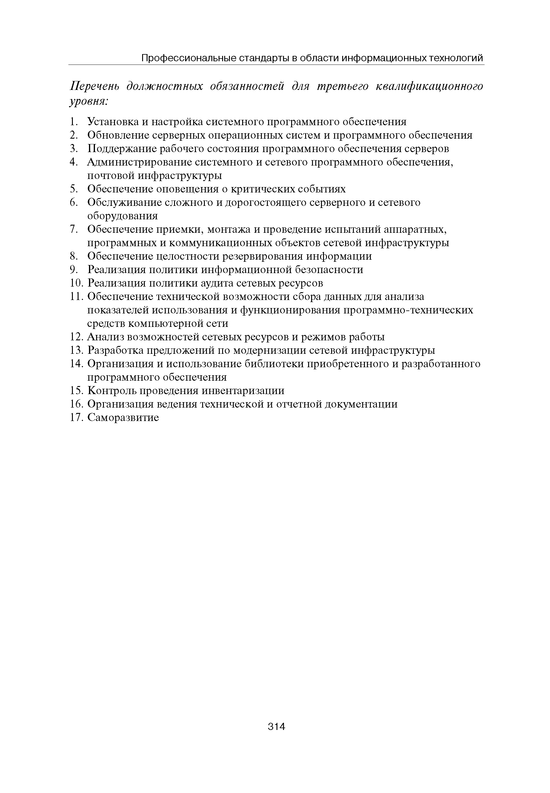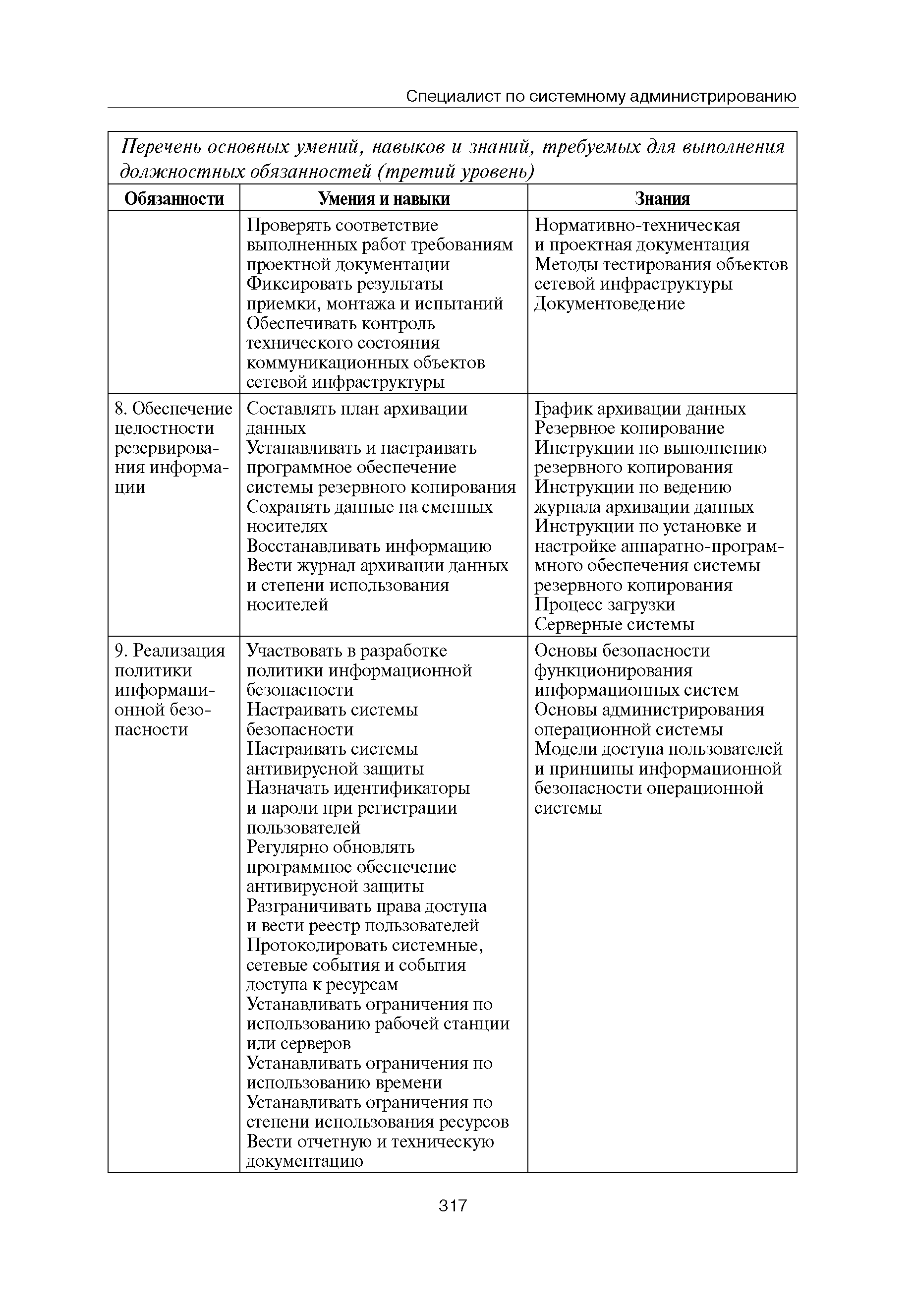 Квалификационные требования (профессиональный стандарт) в области информационных технологий "СПЕЦИАЛИСТ ПО СИСТЕМНОМУ АДМИНИСТРИРОВАНИЮ"| Статус: | действует | | Название рус.: | Квалификационные требования (профессиональный стандарт) в области информационных технологий "СПЕЦИАЛИСТ ПО СИСТЕМНОМУ АДМИНИСТРИРОВАНИЮ" | | Дата добавления в базу: | 01.09.2013 | | Дата актуализации: | 01.01.2021 | | Область применения: | Стандарт устанавливает требования к профессиональным компетенциям по квалификационным уровням. Рекомендован для применения в организациях всех форм собственности; для организаций крупного, среднего и малого бизнеса. Стандарт применяется в качестве нормативного документа, применяемого для подбора и расстановки кадров; планирования и нормирования труда; развития систем управления персоналом; для решения задач по профессиональной ориентации; для создания системы добровольной сертификации персонала и оценки уровня компетентности работников; для разработки образовательных стандартов и программ обучения в соответствии с требованиями работодателей; для проведения профессиональной подготовки, переподготовки и повышения квалификации персонала. | | Оглавление: | Авторский коллектив Область применения Указание сегмента сферы труда Профессиональный стандарт по профессии "Специалист по системному администрированию" Первый квалификационный уровень Перечень должностных обязанностей для первого квалификационного уровня Перечень основных умений, навыков и знаний, требуемых для выполнения должностных обязанностей (1 уровень) Второй квалификационный уровень Перечень должностных обязанностей для второго квалификационного уровня Перечень основных умений, навыков и знаний, требуемых для выполнения должностных обязанностей (2 уровень) Третий квалификационный уровень Перечень должностных обязанностей для третьего квалификационного уровня Перечень основных умений, навыков и знаний, требуемых для выполнения должностных обязанностей (3 уровень) Четвертый квалификационный уровень Перечень должностных обязанностей для четвертого квалификационного уровня Перечень основных умений, навыков и знаний, требуемых для выполнения должностных обязанностей (4 уровень) Пятый квалификационный уровень Перечень должностных обязанностей для пятого квалификационного уровня Перечень основных умений, навыков и знаний, требуемых для выполнения должностных обязанностей (5 уровень) | | Разработан: | Государственный университет - Высшая школа экономики ФГУП Рособоронэкспорт НИИ Министерства обороны РФ Проктер Энд Гэмбл ООО МОСТ-1
