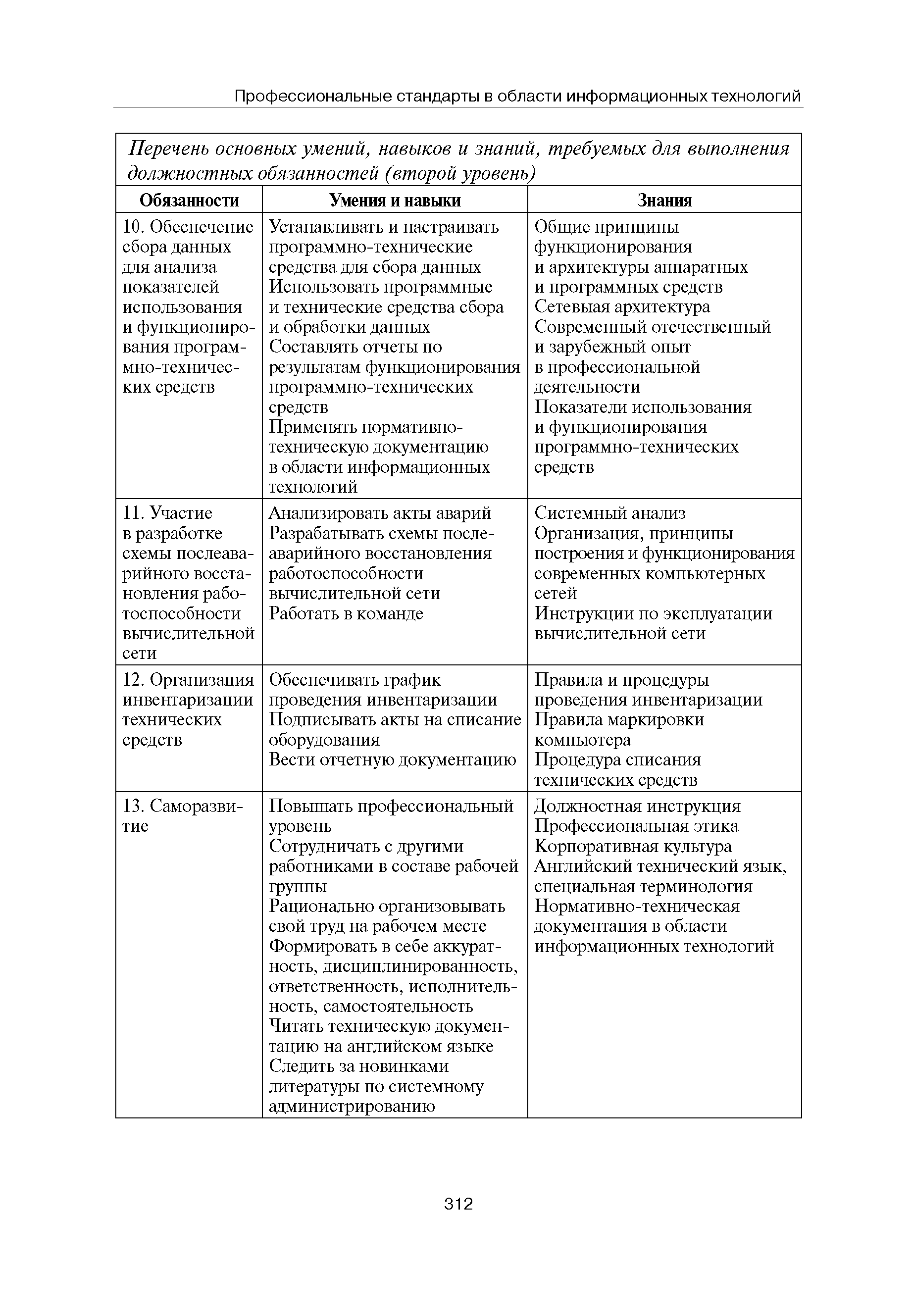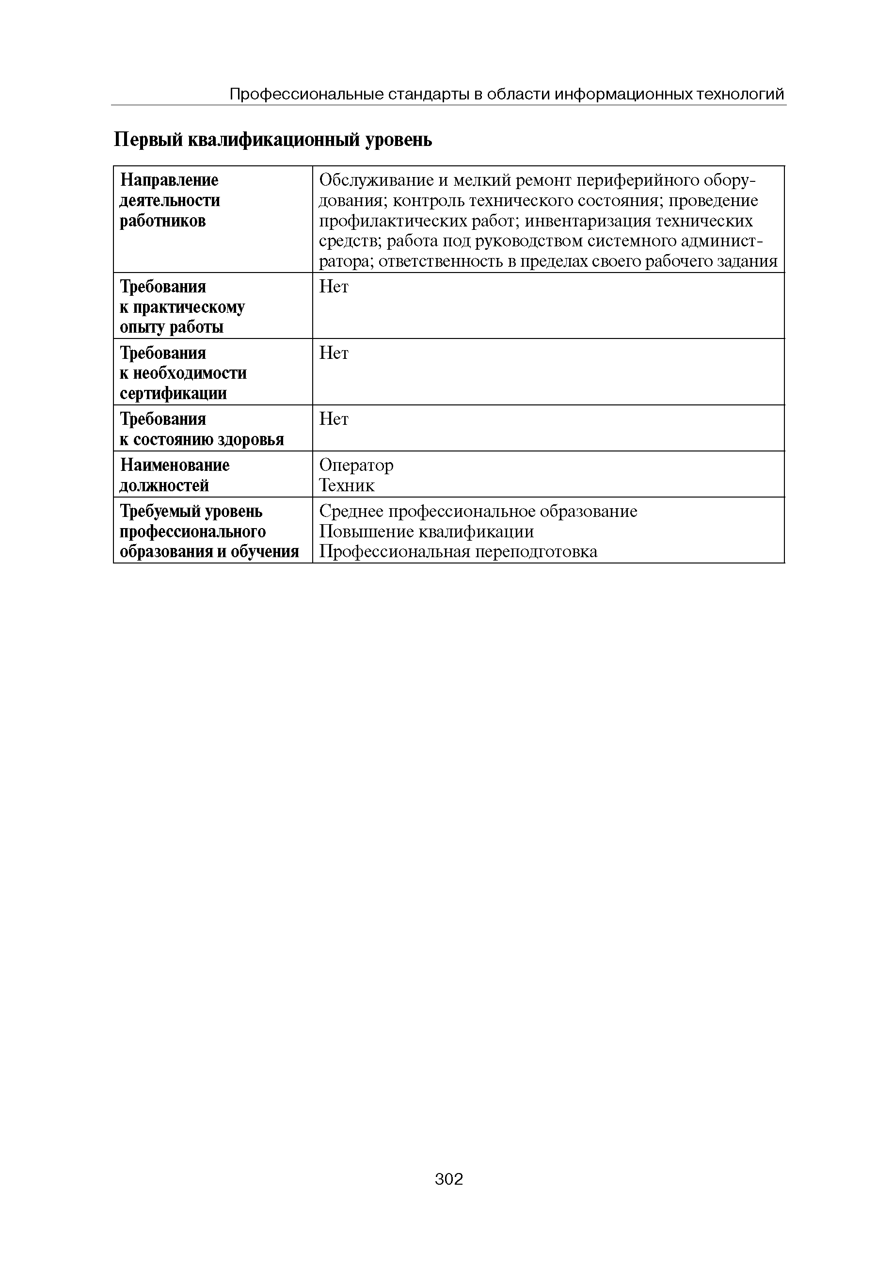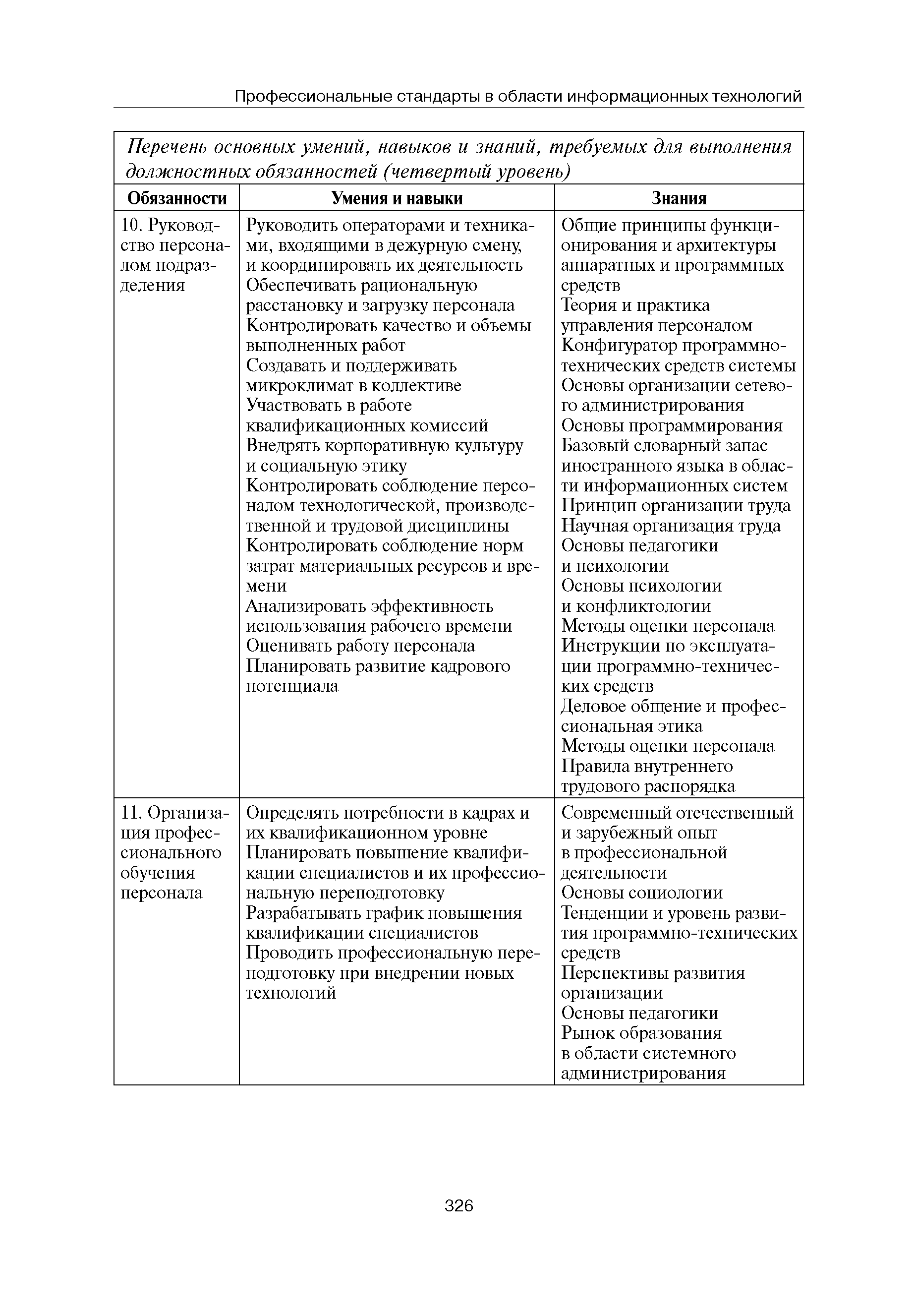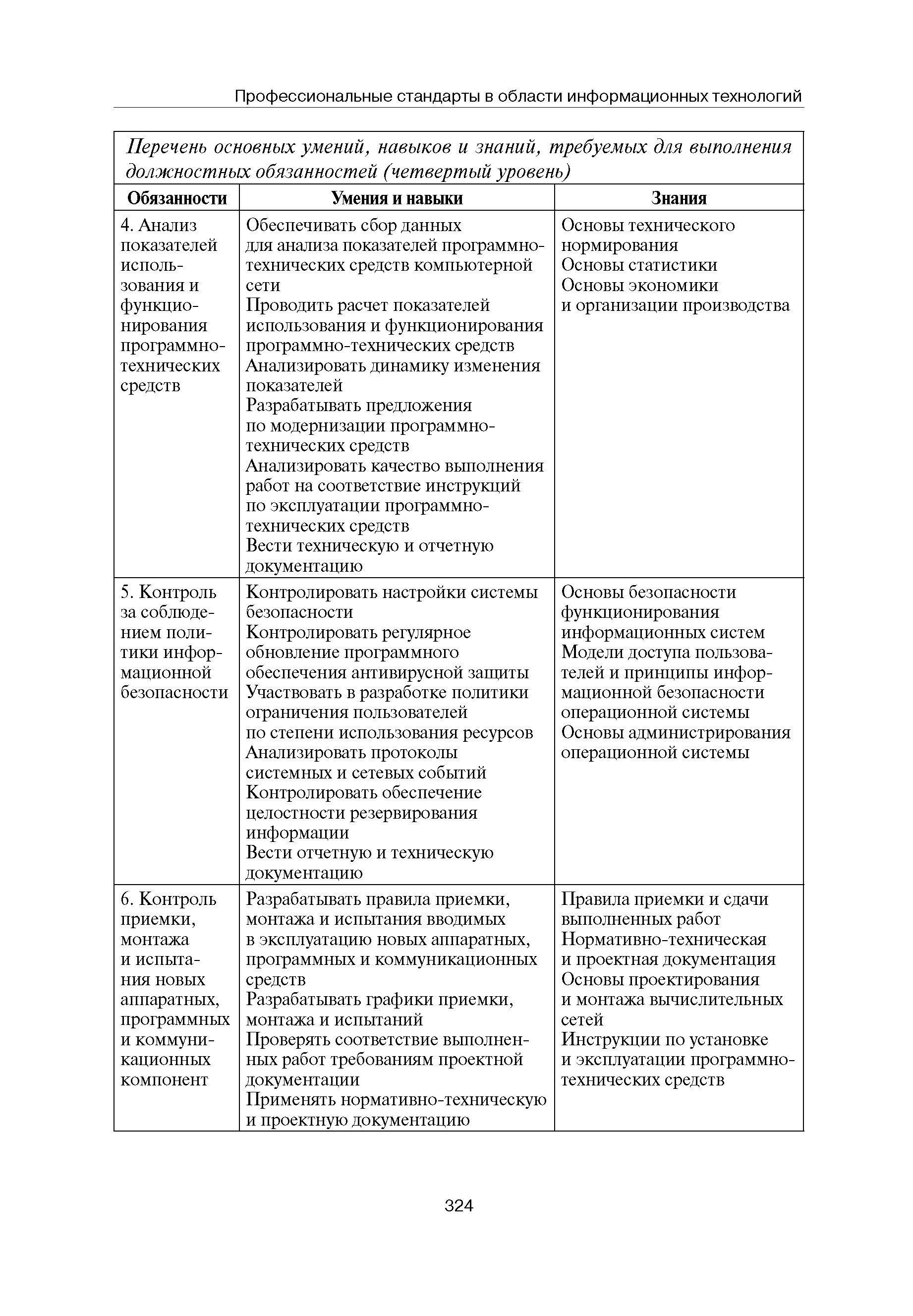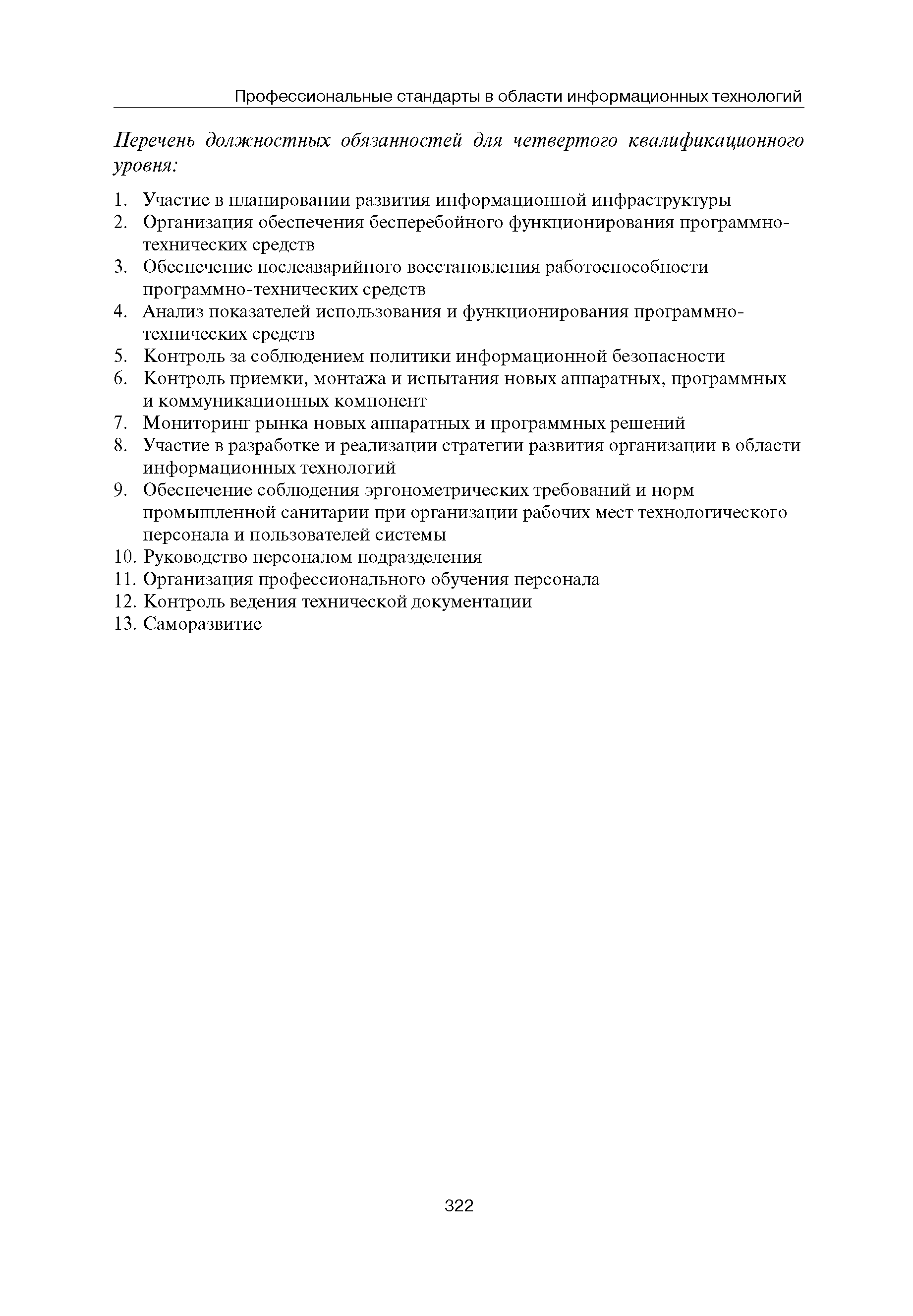 Квалификационные требования (профессиональный стандарт) в области информационных технологий "СПЕЦИАЛИСТ ПО СИСТЕМНОМУ АДМИНИСТРИРОВАНИЮ"| Статус: | действует | | Название рус.: | Квалификационные требования (профессиональный стандарт) в области информационных технологий "СПЕЦИАЛИСТ ПО СИСТЕМНОМУ АДМИНИСТРИРОВАНИЮ" | | Дата добавления в базу: | 01.09.2013 | | Дата актуализации: | 01.01.2021 | | Область применения: | Стандарт устанавливает требования к профессиональным компетенциям по квалификационным уровням. Рекомендован для применения в организациях всех форм собственности; для организаций крупного, среднего и малого бизнеса. Стандарт применяется в качестве нормативного документа, применяемого для подбора и расстановки кадров; планирования и нормирования труда; развития систем управления персоналом; для решения задач по профессиональной ориентации; для создания системы добровольной сертификации персонала и оценки уровня компетентности работников; для разработки образовательных стандартов и программ обучения в соответствии с требованиями работодателей; для проведения профессиональной подготовки, переподготовки и повышения квалификации персонала. | | Оглавление: | Авторский коллектив Область применения Указание сегмента сферы труда Профессиональный стандарт по профессии "Специалист по системному администрированию" Первый квалификационный уровень Перечень должностных обязанностей для первого квалификационного уровня Перечень основных умений, навыков и знаний, требуемых для выполнения должностных обязанностей (1 уровень) Второй квалификационный уровень Перечень должностных обязанностей для второго квалификационного уровня Перечень основных умений, навыков и знаний, требуемых для выполнения должностных обязанностей (2 уровень) Третий квалификационный уровень Перечень должностных обязанностей для третьего квалификационного уровня Перечень основных умений, навыков и знаний, требуемых для выполнения должностных обязанностей (3 уровень) Четвертый квалификационный уровень Перечень должностных обязанностей для четвертого квалификационного уровня Перечень основных умений, навыков и знаний, требуемых для выполнения должностных обязанностей (4 уровень) Пятый квалификационный уровень Перечень должностных обязанностей для пятого квалификационного уровня Перечень основных умений, навыков и знаний, требуемых для выполнения должностных обязанностей (5 уровень) | | Разработан: | Государственный университет - Высшая школа экономики ФГУП Рособоронэкспорт НИИ Министерства обороны РФ Проктер Энд Гэмбл ООО МОСТ-1