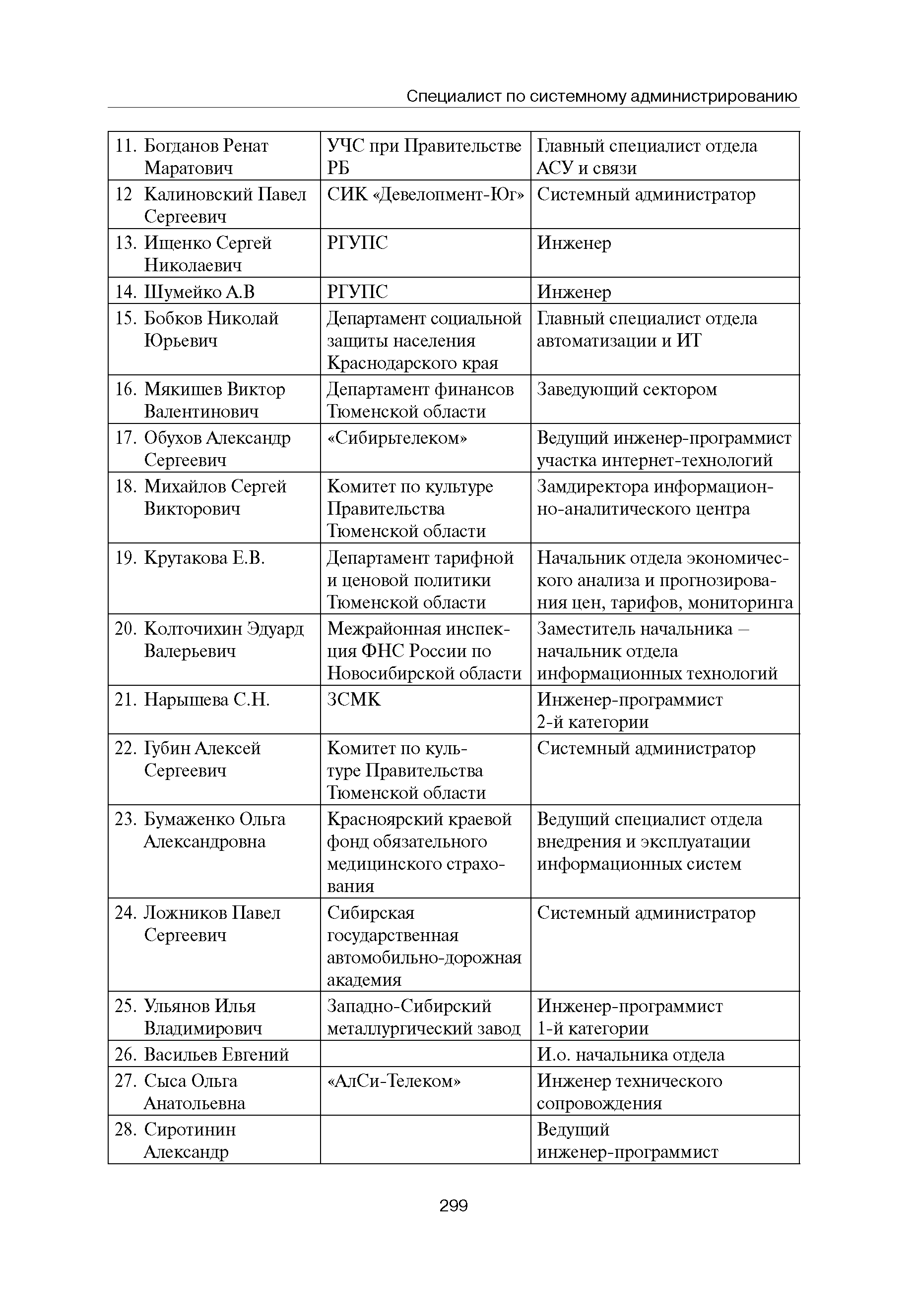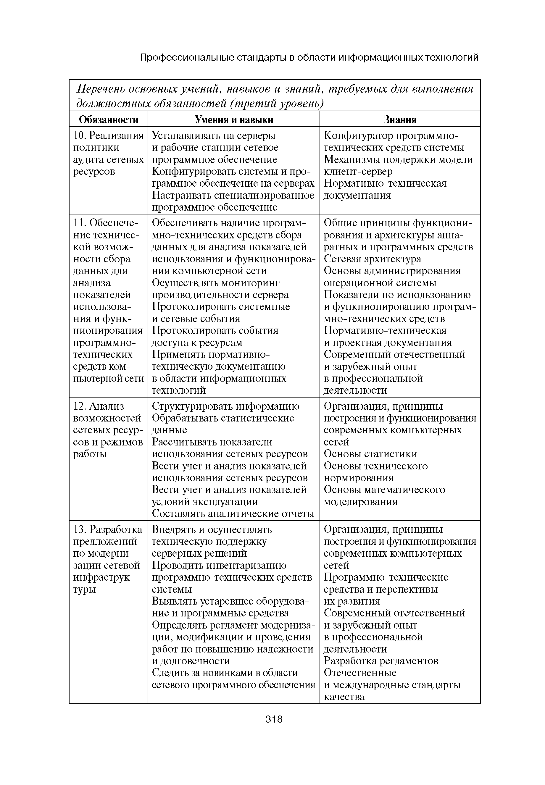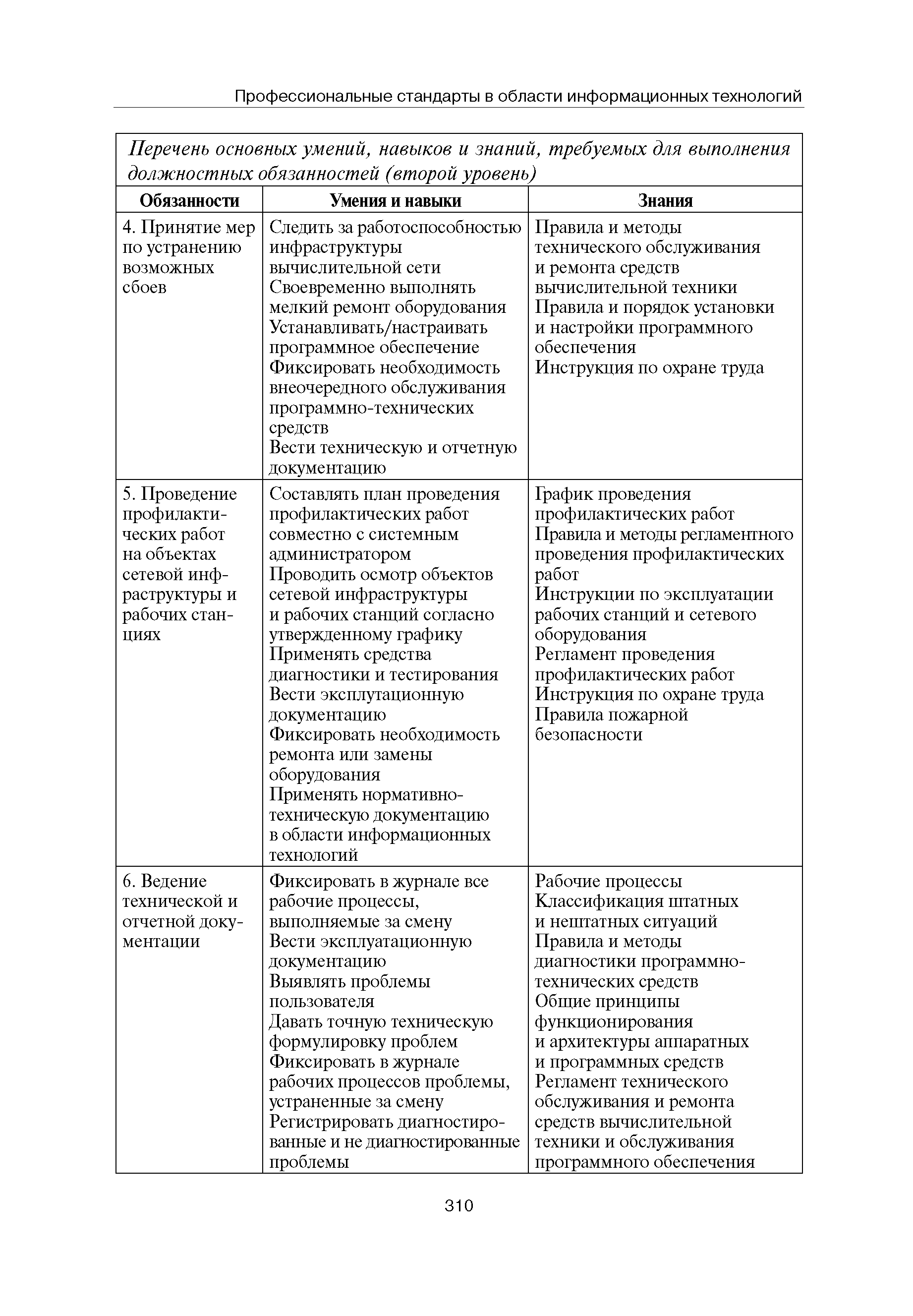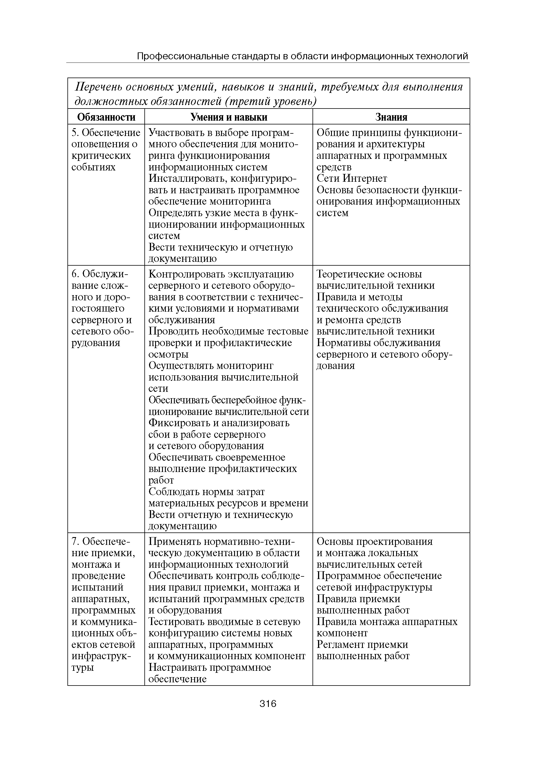 Квалификационные требования (профессиональный стандарт) в области информационных технологий "СПЕЦИАЛИСТ ПО СИСТЕМНОМУ АДМИНИСТРИРОВАНИЮ"| Статус: | действует | | Название рус.: | Квалификационные требования (профессиональный стандарт) в области информационных технологий "СПЕЦИАЛИСТ ПО СИСТЕМНОМУ АДМИНИСТРИРОВАНИЮ" | | Дата добавления в базу: | 01.09.2013 | | Дата актуализации: | 01.01.2021 | | Область применения: | Стандарт устанавливает требования к профессиональным компетенциям по квалификационным уровням. Рекомендован для применения в организациях всех форм собственности; для организаций крупного, среднего и малого бизнеса. Стандарт применяется в качестве нормативного документа, применяемого для подбора и расстановки кадров; планирования и нормирования труда; развития систем управления персоналом; для решения задач по профессиональной ориентации; для создания системы добровольной сертификации персонала и оценки уровня компетентности работников; для разработки образовательных стандартов и программ обучения в соответствии с требованиями работодателей; для проведения профессиональной подготовки, переподготовки и повышения квалификации персонала. | | Оглавление: | Авторский коллектив Область применения Указание сегмента сферы труда Профессиональный стандарт по профессии "Специалист по системному администрированию" Первый квалификационный уровень Перечень должностных обязанностей для первого квалификационного уровня Перечень основных умений, навыков и знаний, требуемых для выполнения должностных обязанностей (1 уровень) Второй квалификационный уровень Перечень должностных обязанностей для второго квалификационного уровня Перечень основных умений, навыков и знаний, требуемых для выполнения должностных обязанностей (2 уровень) Третий квалификационный уровень Перечень должностных обязанностей для третьего квалификационного уровня Перечень основных умений, навыков и знаний, требуемых для выполнения должностных обязанностей (3 уровень) Четвертый квалификационный уровень Перечень должностных обязанностей для четвертого квалификационного уровня Перечень основных умений, навыков и знаний, требуемых для выполнения должностных обязанностей (4 уровень) Пятый квалификационный уровень Перечень должностных обязанностей для пятого квалификационного уровня Перечень основных умений, навыков и знаний, требуемых для выполнения должностных обязанностей (5 уровень) | | Разработан: | Государственный университет - Высшая школа экономики ФГУП Рособоронэкспорт НИИ Министерства обороны РФ Проктер Энд Гэмбл ООО МОСТ-1